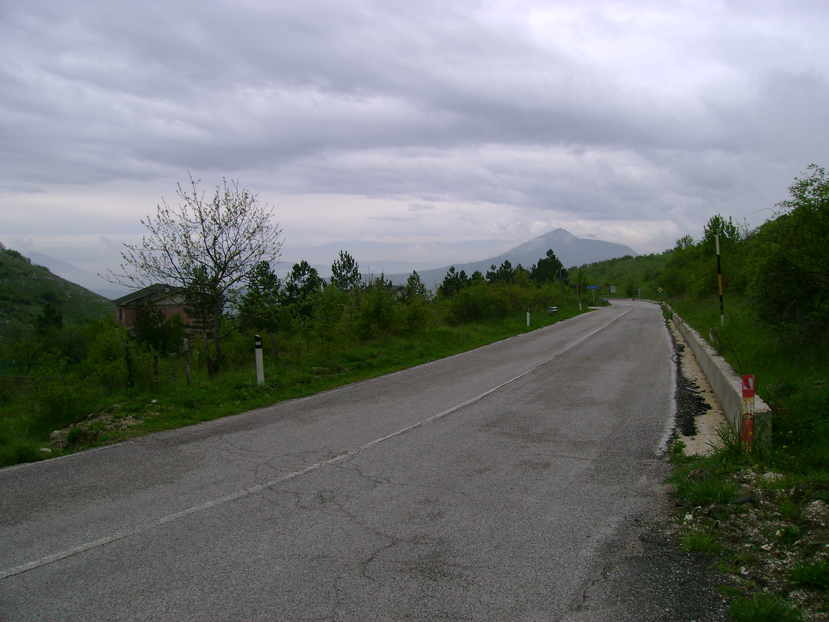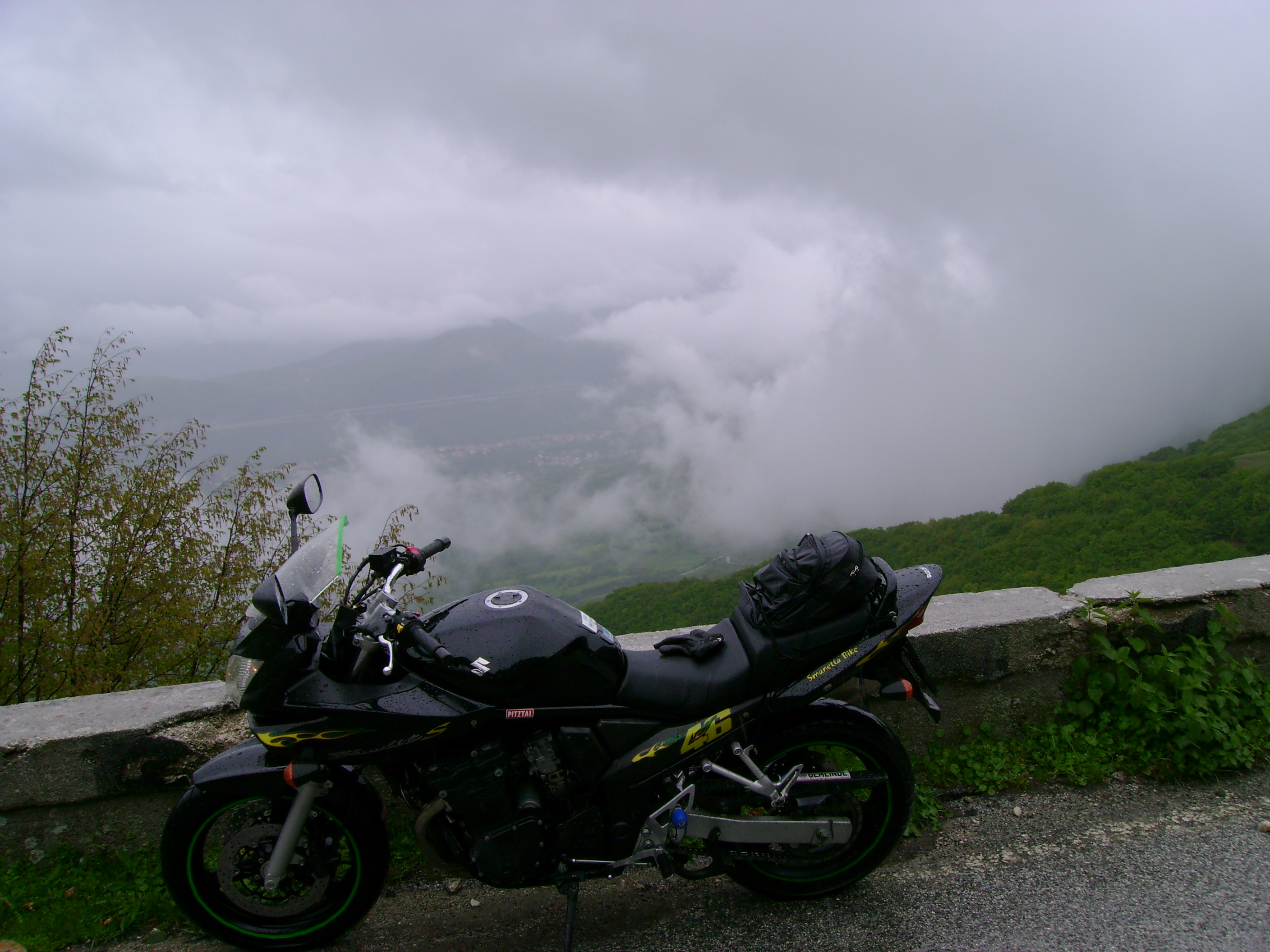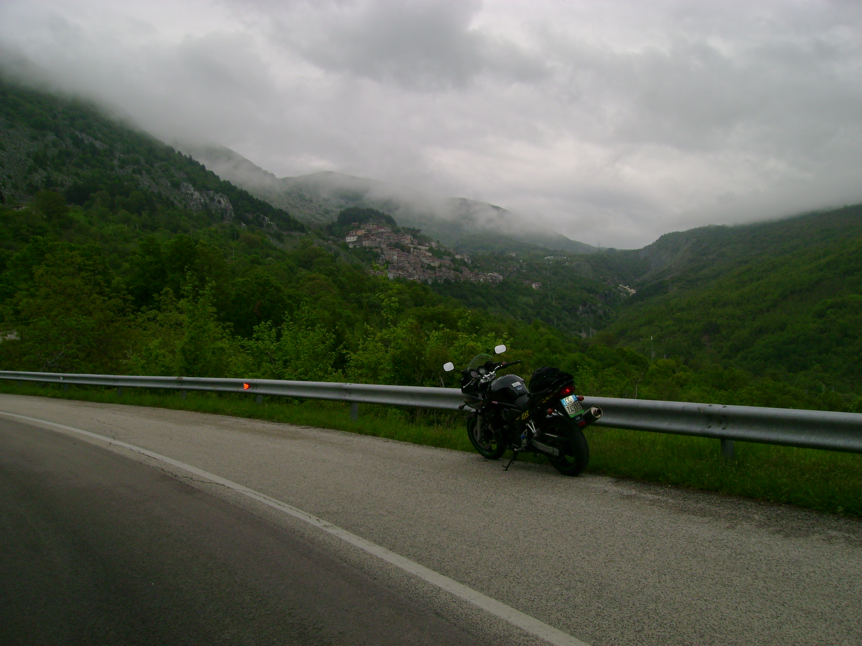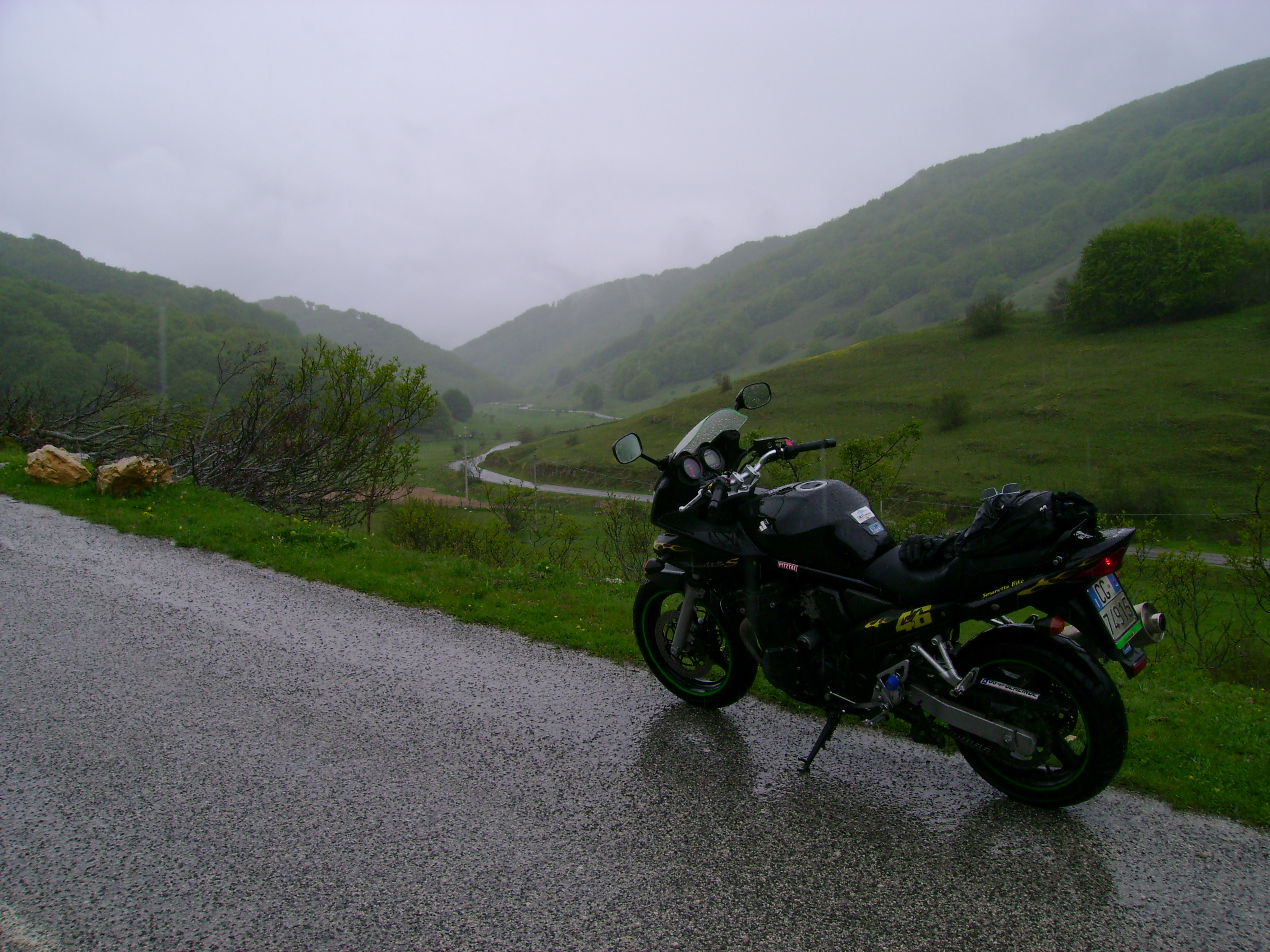 Ho scoperto poi, tanto per gradire, che la mia moto soffre in qualche modo un eccesso d’umidità perché ha preso ad andare a singhiozzi, a tre cilindri o roba simile fino ai 3-4000 giri e poi si riprende. E così a scartamento ridotto impavido ho continuato a salire perché sembrava dovesse smettere. E così lentamente è stato ma non prima d’aver passato il valico ed iniziata la discesa verso Tornimparte.