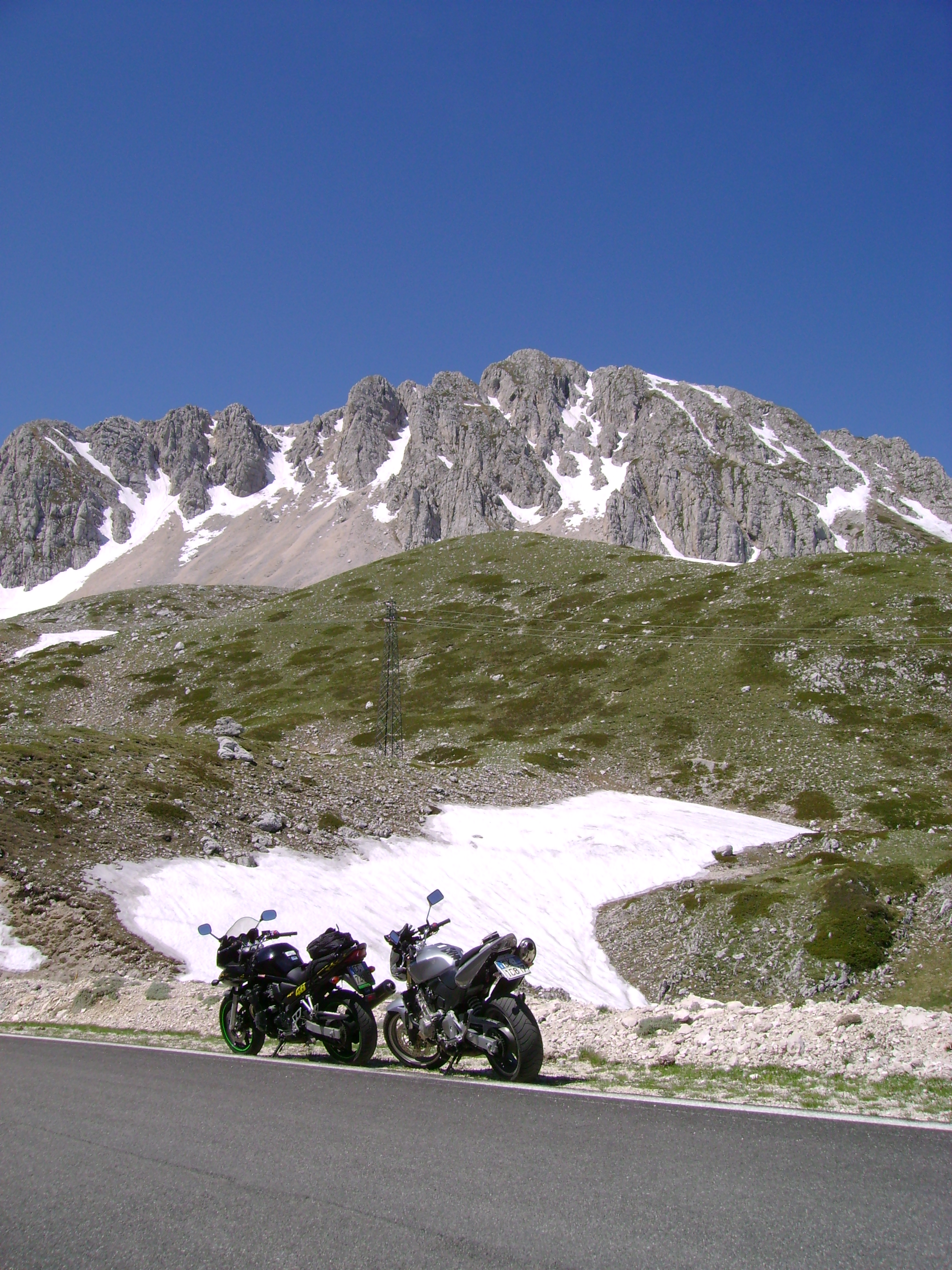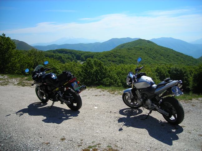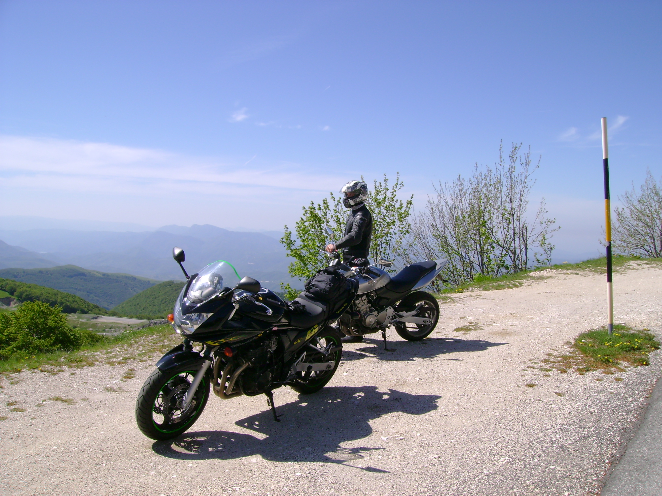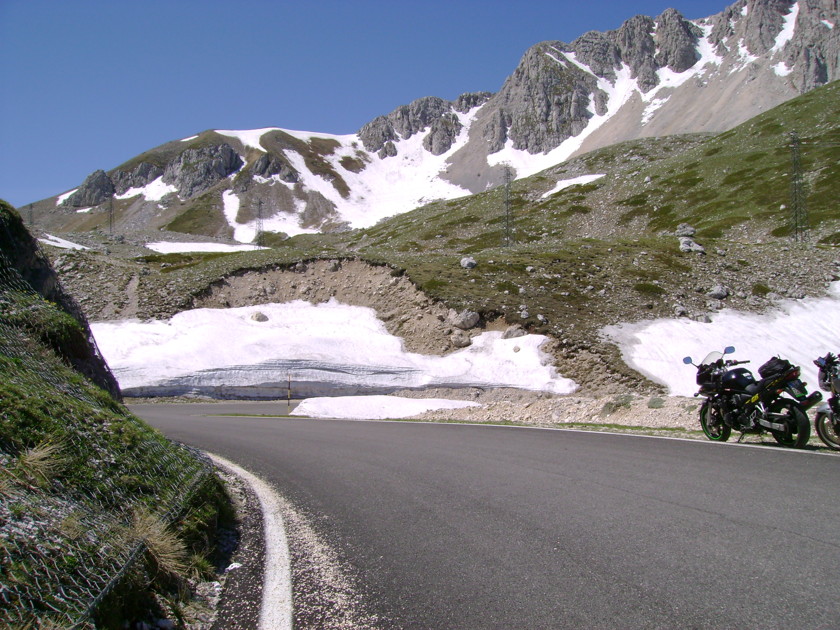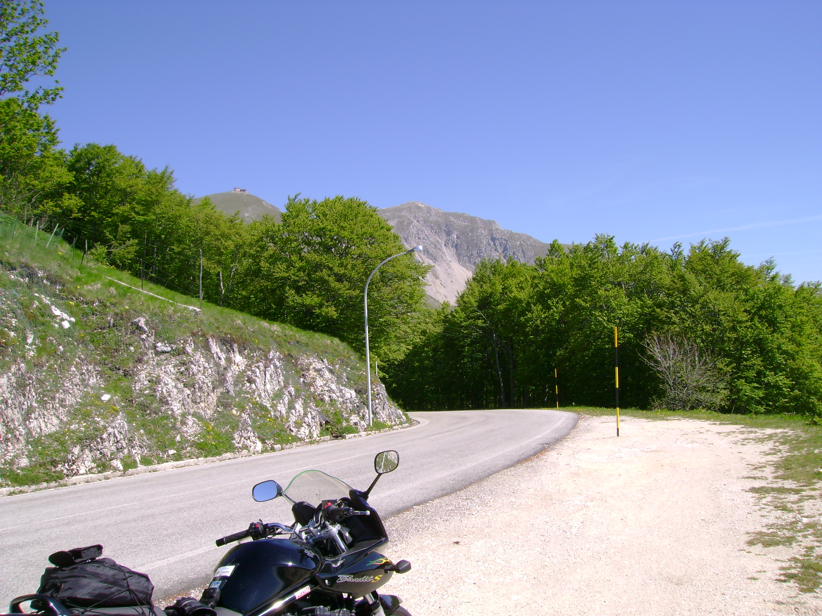 La salita al Terminillo da Rieti è sempre molto bella e devo dire che stavolta me la sto godendo molto meglio dell’ultima volta. Una volta passato il valico di Leonessa ci fermiamo a giocare un po’ con le moto e farci qualche mini ripresa dei nostri passaggi su quei bei tornanti che serpeggiano sotto la vetta rocciosa. Peccato per il pietrisco.