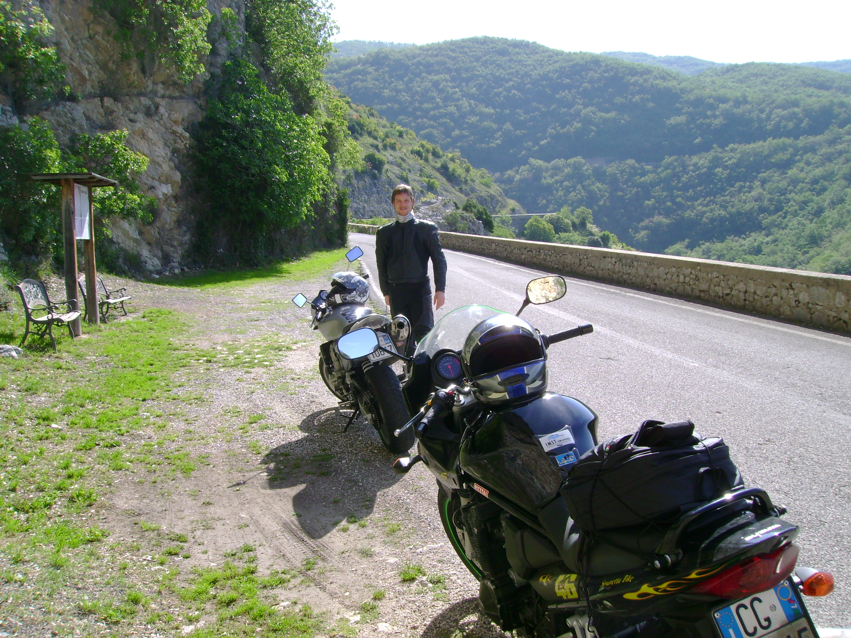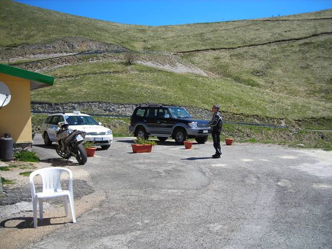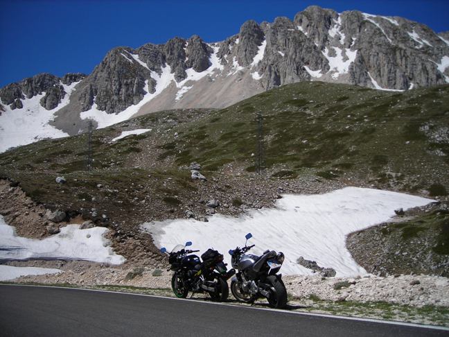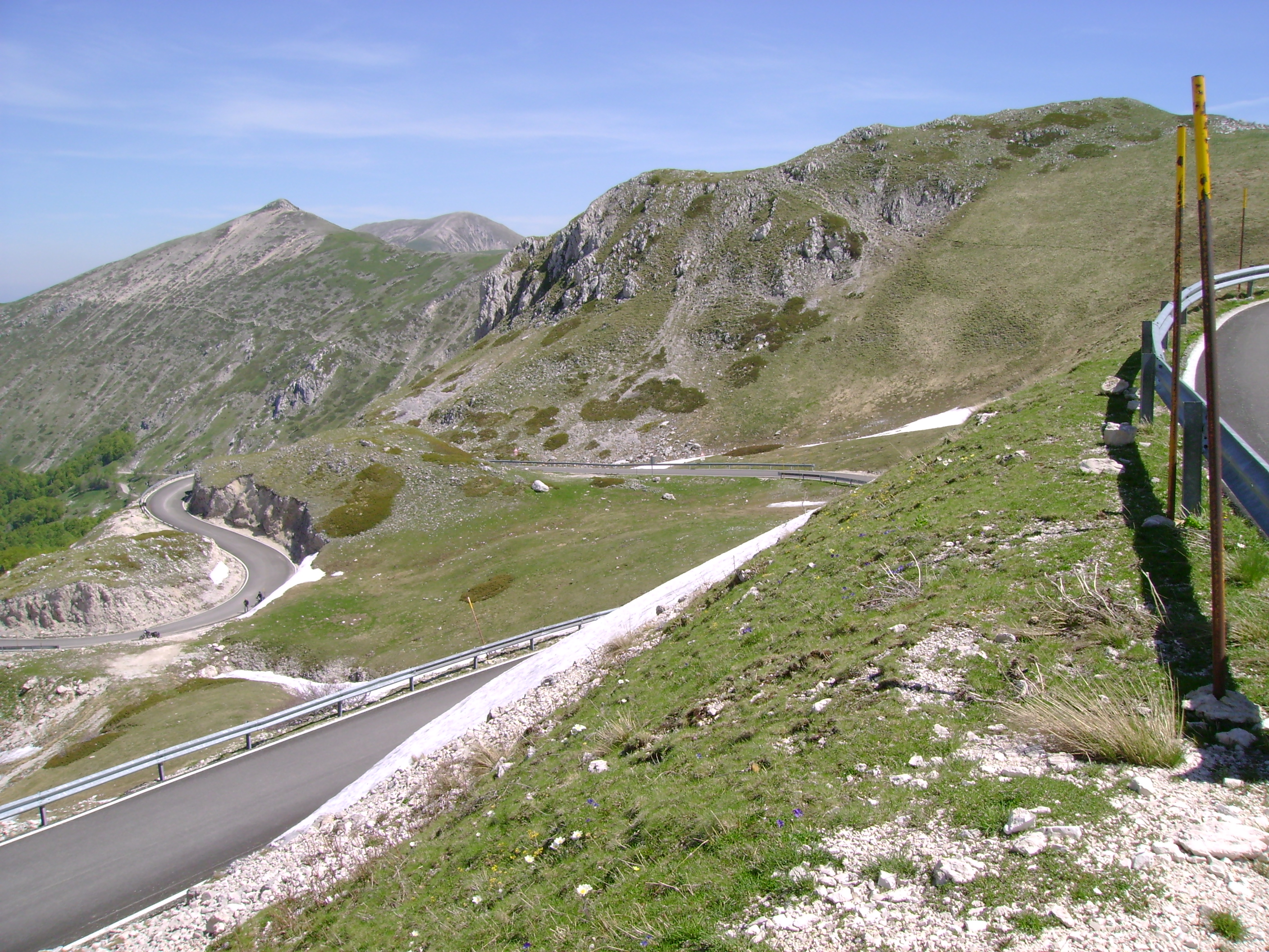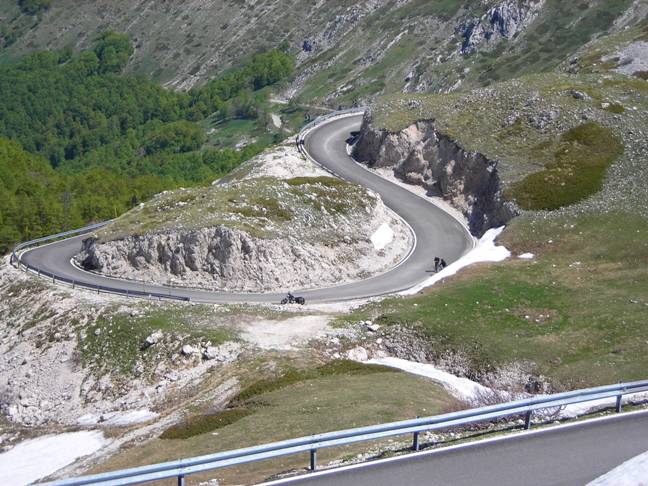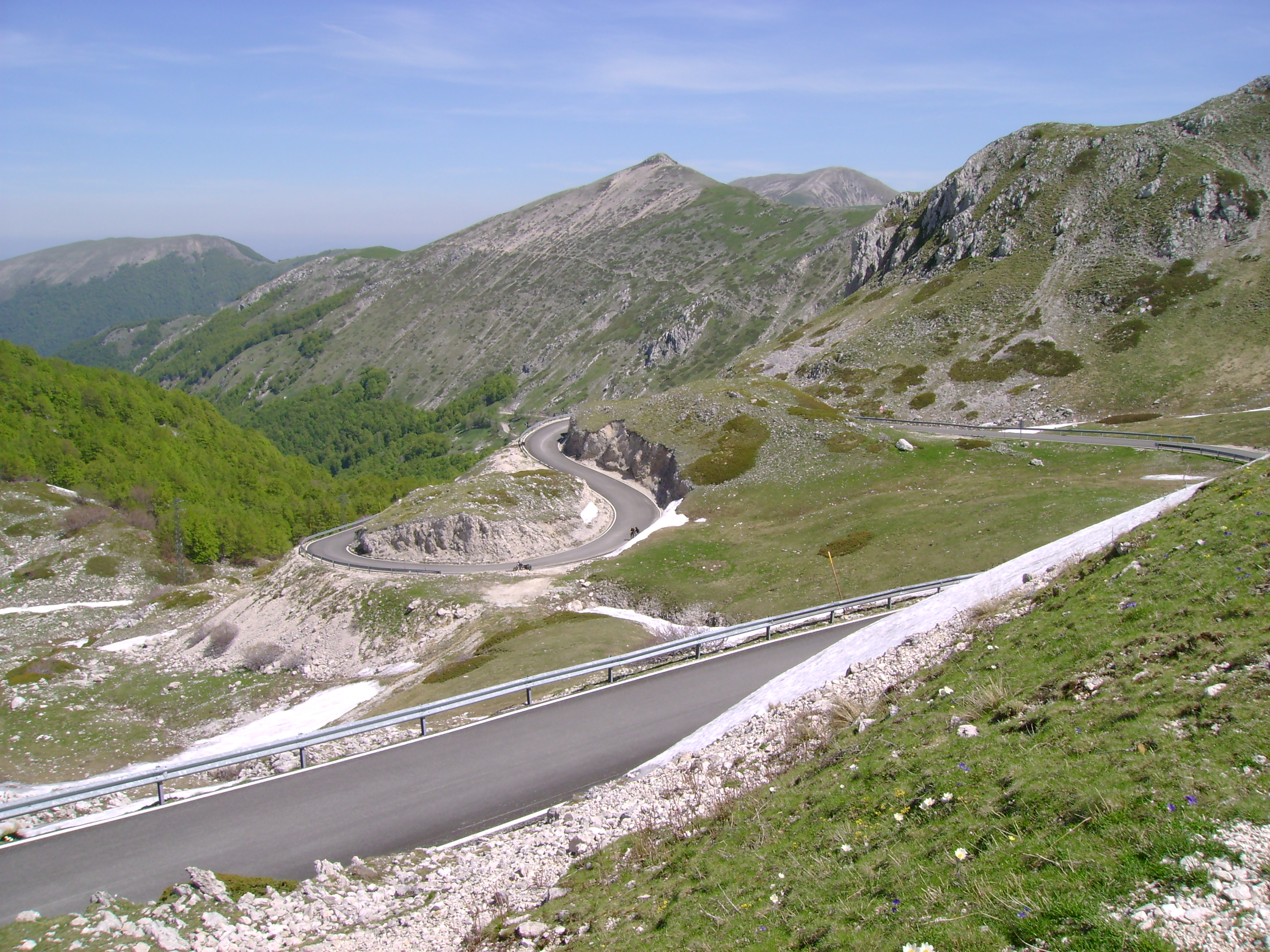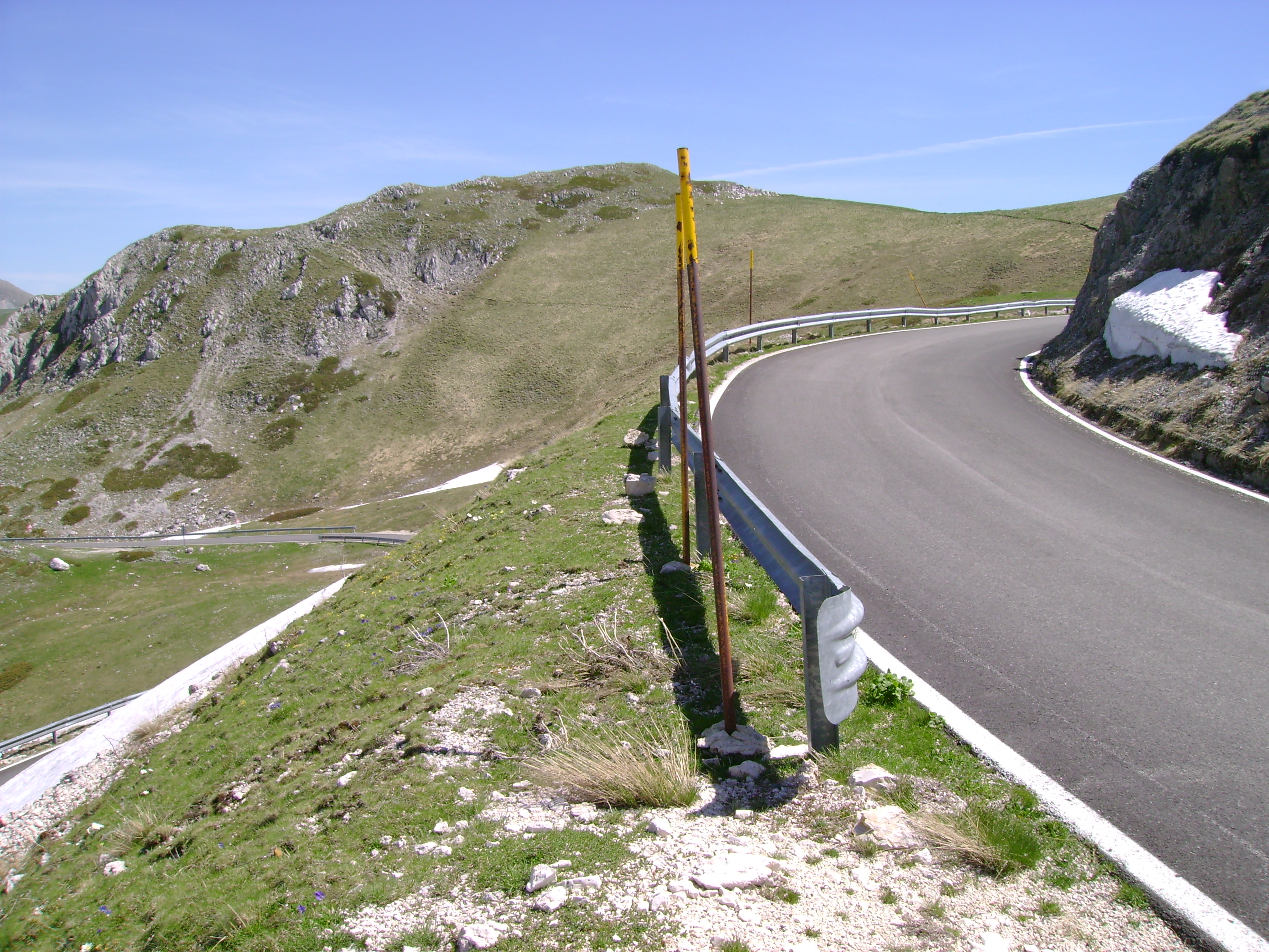 La salita al Terminillo da Rieti è sempre molto bella e devo dire che stavolta me la sto godendo molto meglio dell’ultima volta. Una volta passato il valico di Leonessa ci fermiamo a giocare un po’ con le moto e farci qualche mini ripresa dei nostri passaggi su quei bei tornanti che serpeggiano sotto la vetta rocciosa. Peccato per il pietrisco.