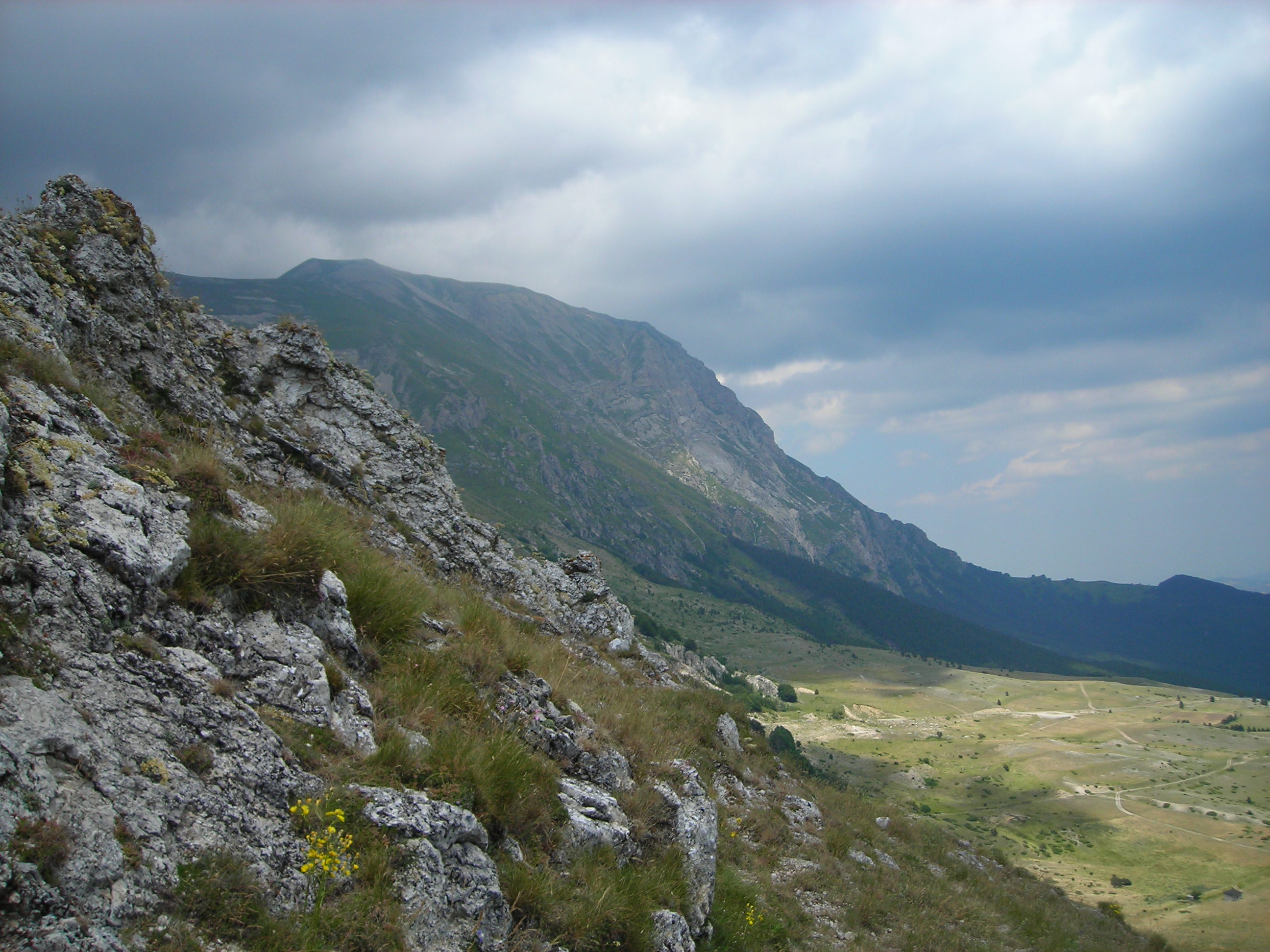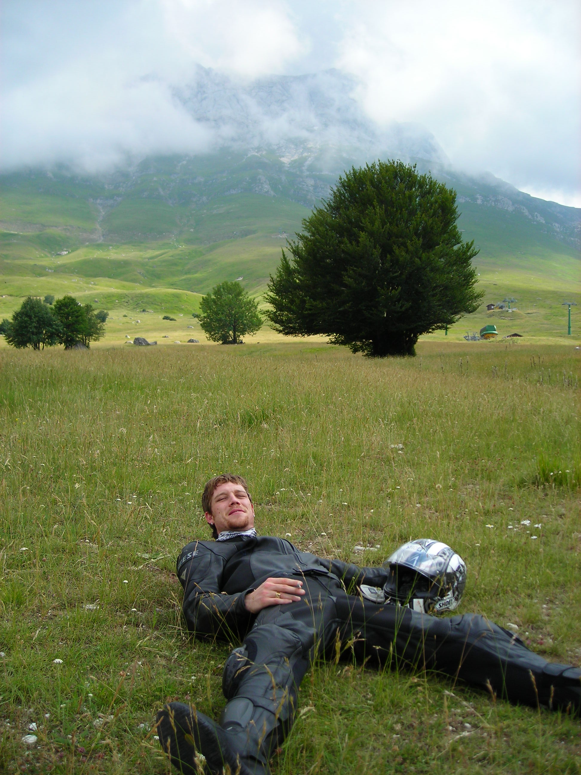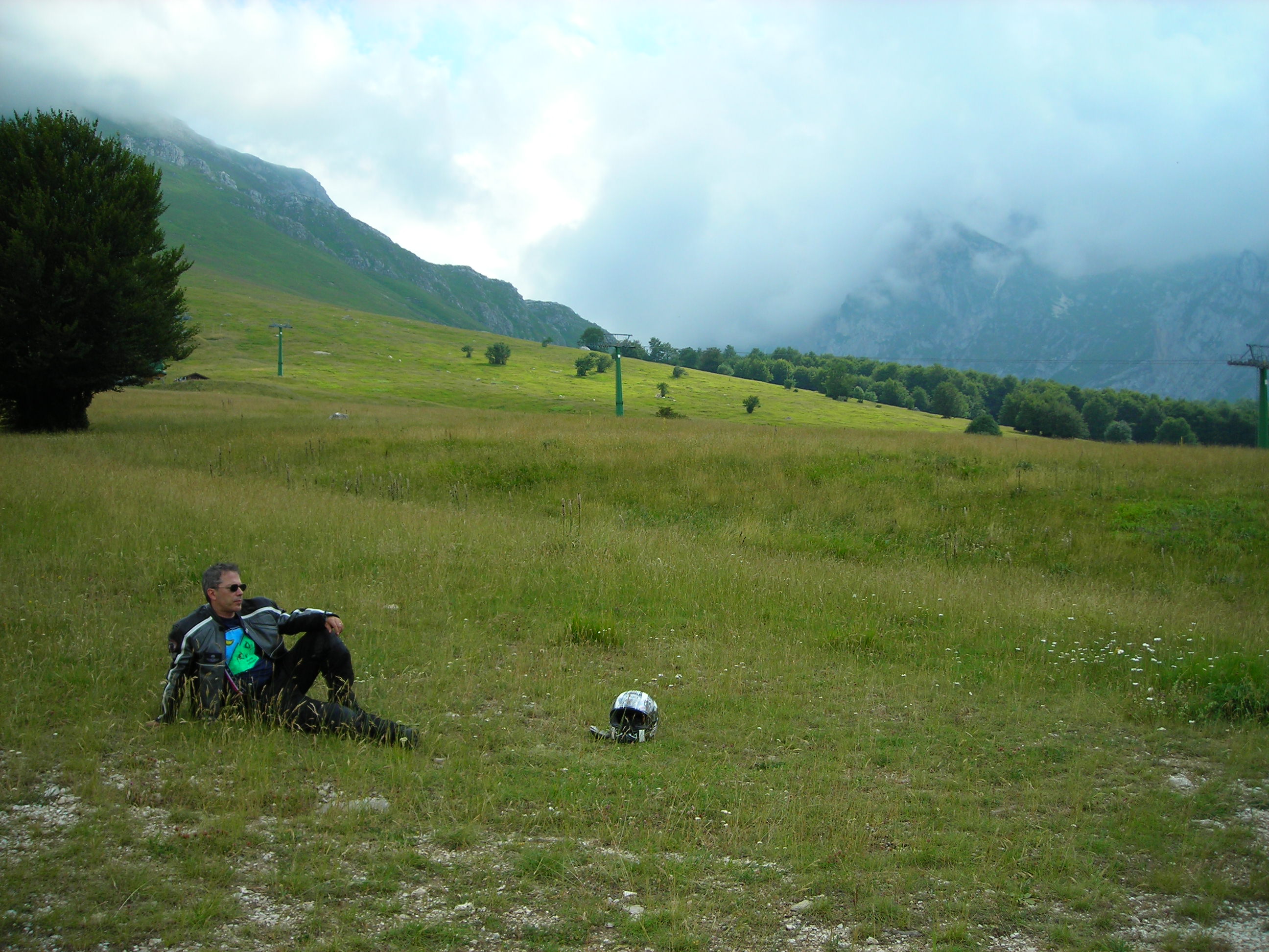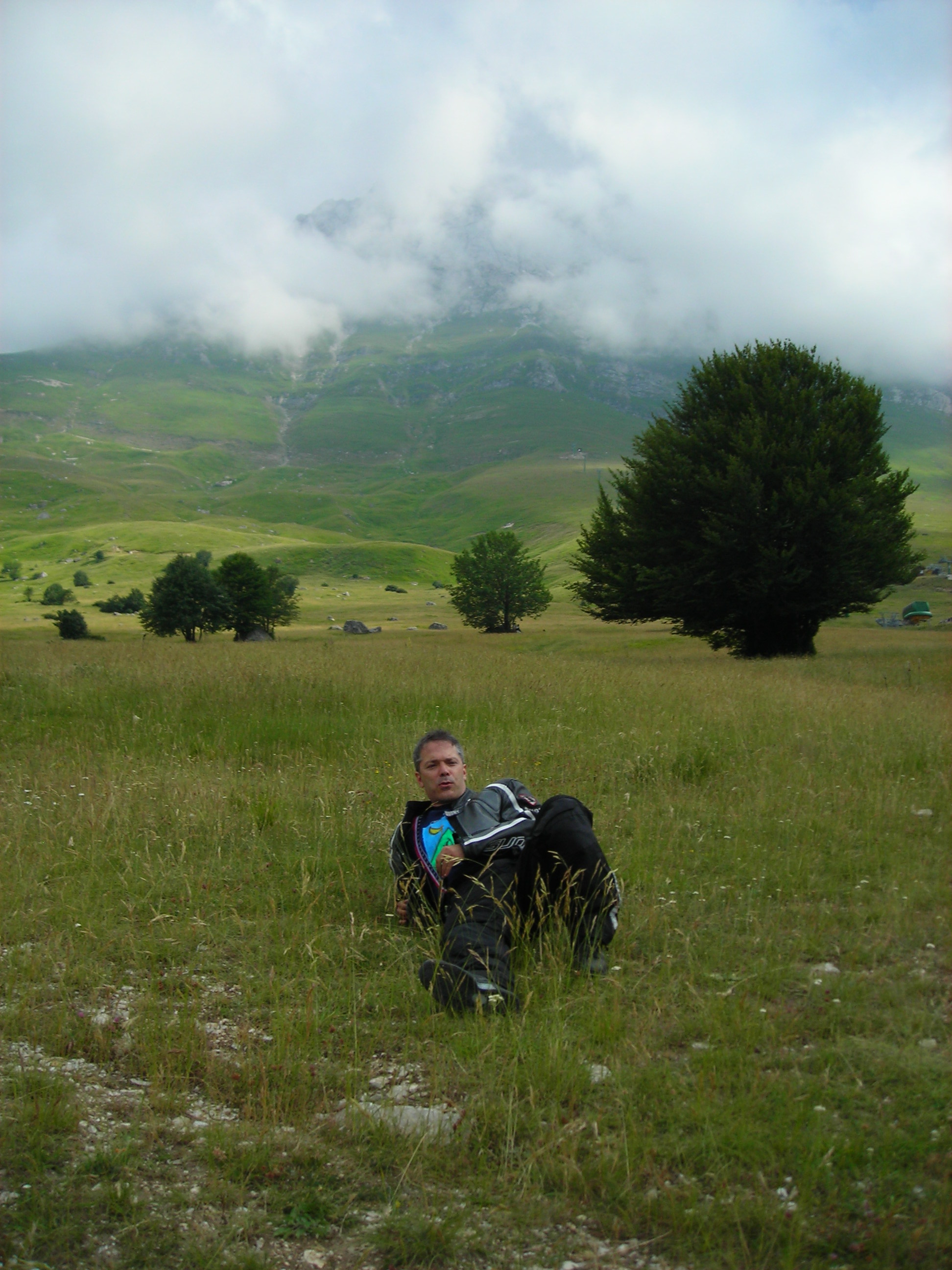 Facciamo una deviazione verso l’altopiano di Pietracamela da dove si gode una vista magnifica su entrambi i corni del Gran Sasso. Starsene sdraiati su quei prati è bellissimo e ne approfittiamo per fare una sosta ristoratrice.