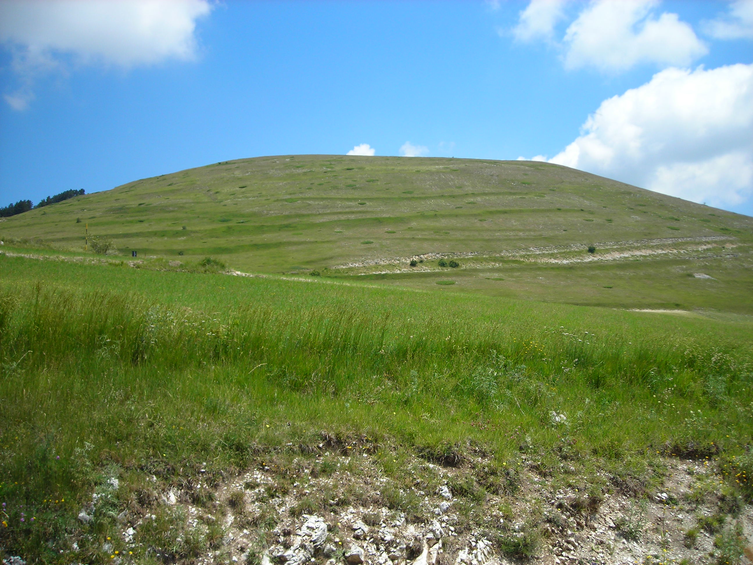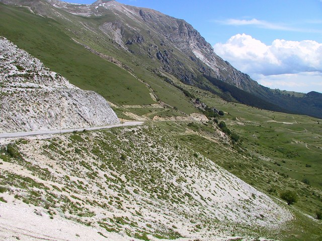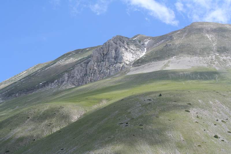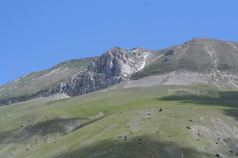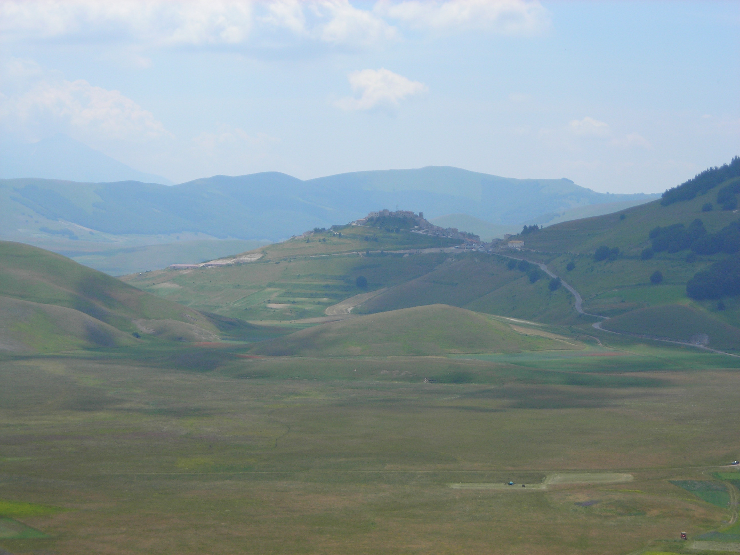 Scendiamo a valle sulla piana maggiore e da lì è pressoché obbligatorio salire a Forca di Presta, sotto il Vettore da dove si gode di uno splendido panorama verso il Terminillo ed il Giano a sud-ovest e verso i primi contrafforti del gruppo del Gran Sasso. Ho fatto questa strada in occasione dello scorso raduno ma oggi percorrerla al contrario ha un altro sapore.