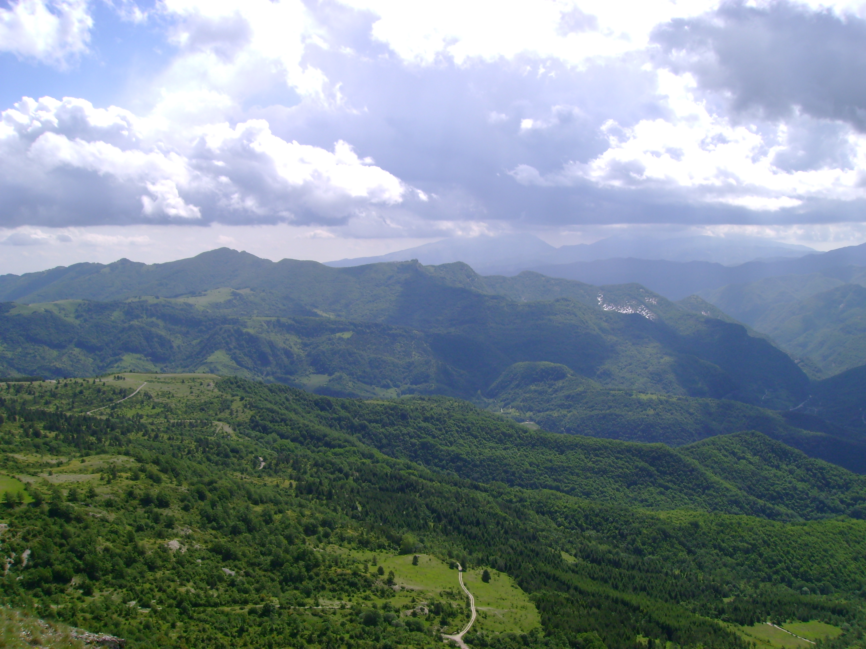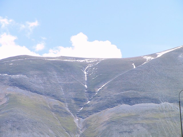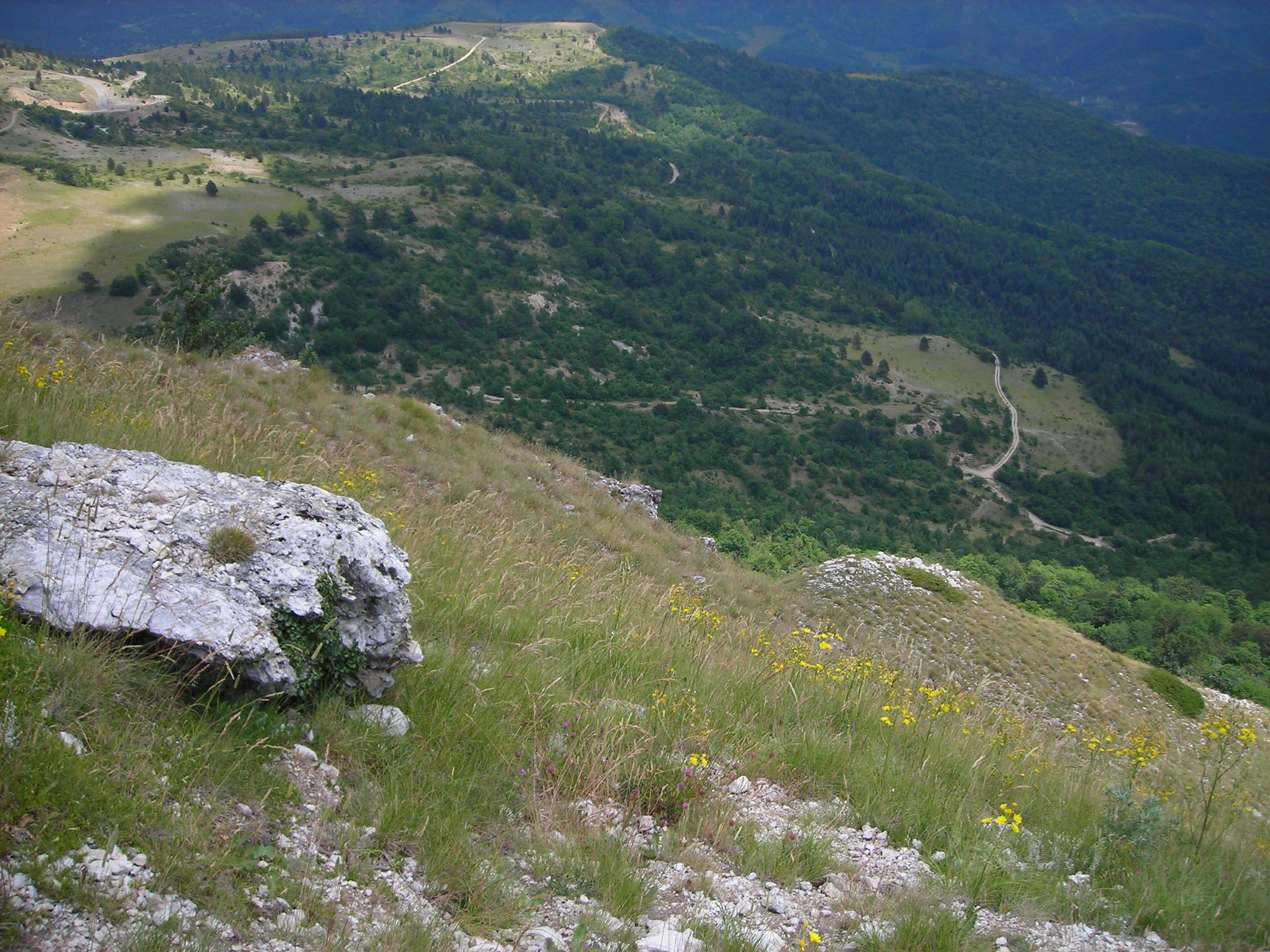 Scendiamo a valle sulla piana maggiore e da lì è pressoché obbligatorio salire a Forca di Presta, sotto il Vettore da dove si gode di uno splendido panorama verso il Terminillo ed il Giano a sud-ovest e verso i primi contrafforti del gruppo del Gran Sasso. Ho fatto questa strada in occasione dello scorso raduno ma oggi percorrerla al contrario ha un altro sapore.