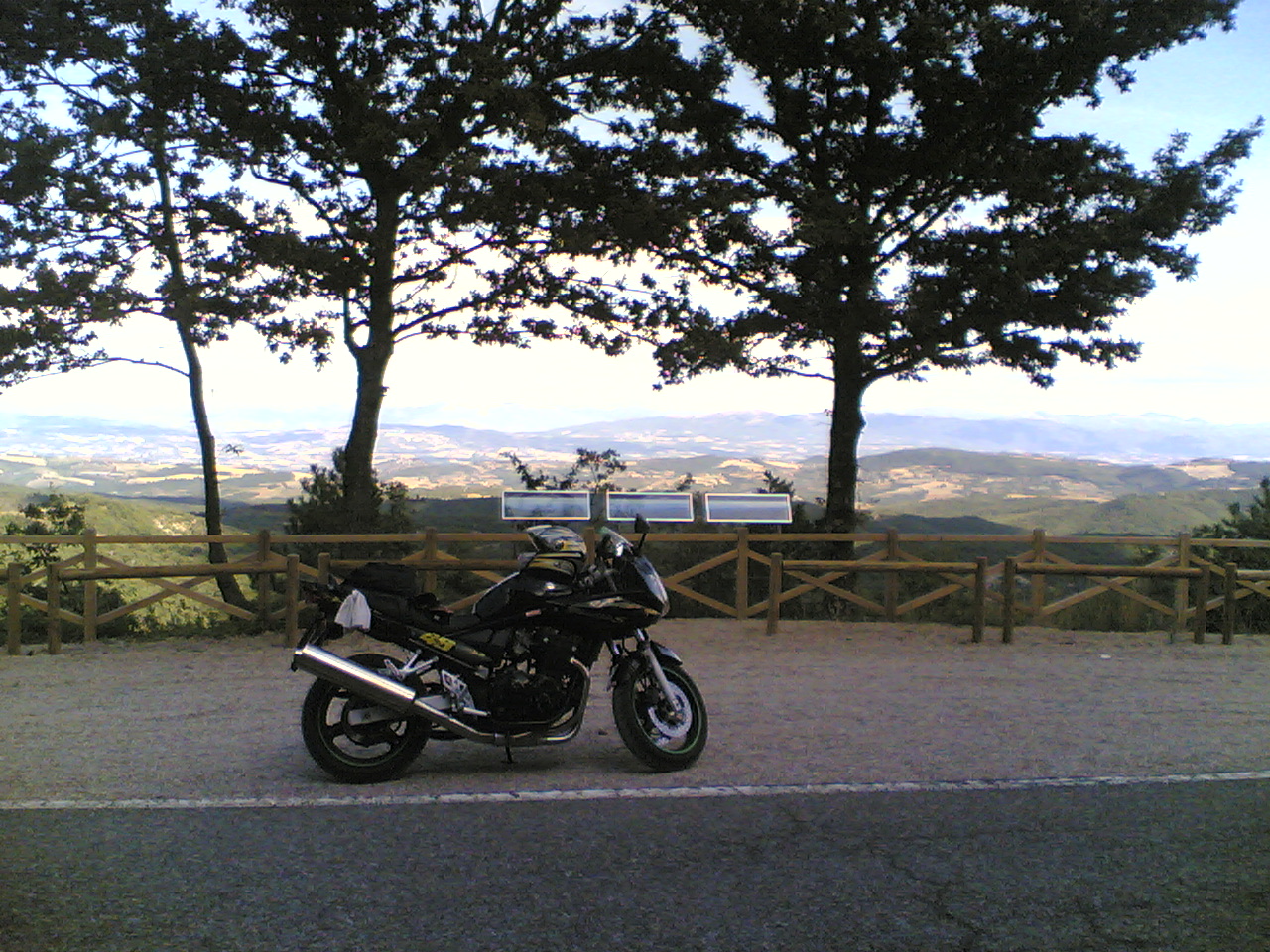 Da Spoleto sulla SS 418 scavalco i deboli rilievi verso Acquasparta e mi trovo nella valle del Tevere. Raggiungo Marsciano via E45 e da lì la salita al Monte Peglia sulla SS 317 è divertentissima, scoperta l’anno scorso dopo il raduno di Colvalenza.