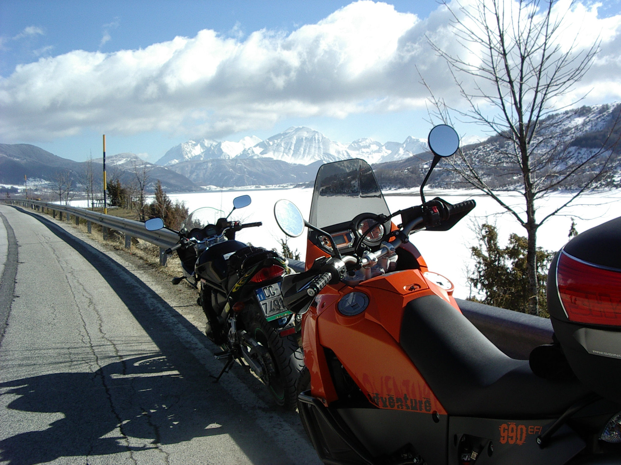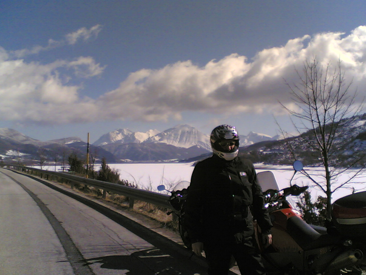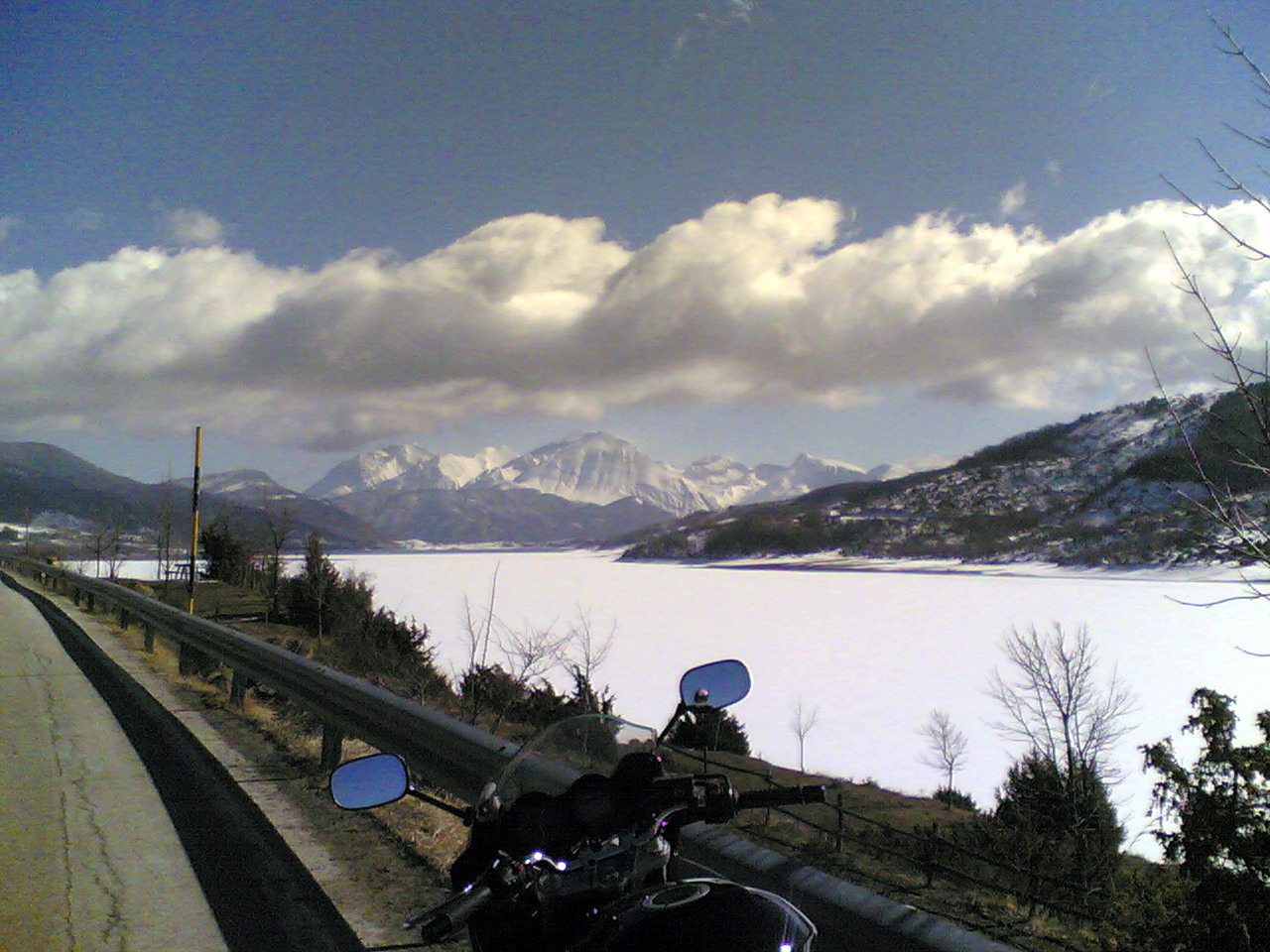 Ma dalla SS 80 salendo verso il lago di Campotosto quel che non ci aspettavamo è stato trovare fanghiglia ghiacciata sempre più abbondante. Ma ormai eravamo in ballo e lentamente, molto lentamente abbiamo percorso il lungo lago con estrema cautela, soprattutto Alberto a causa delle ruote tacchettate del sul KTM.
