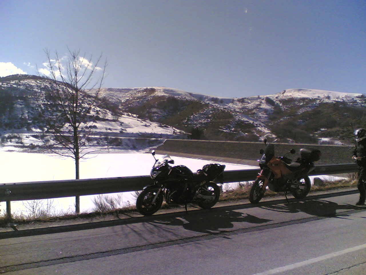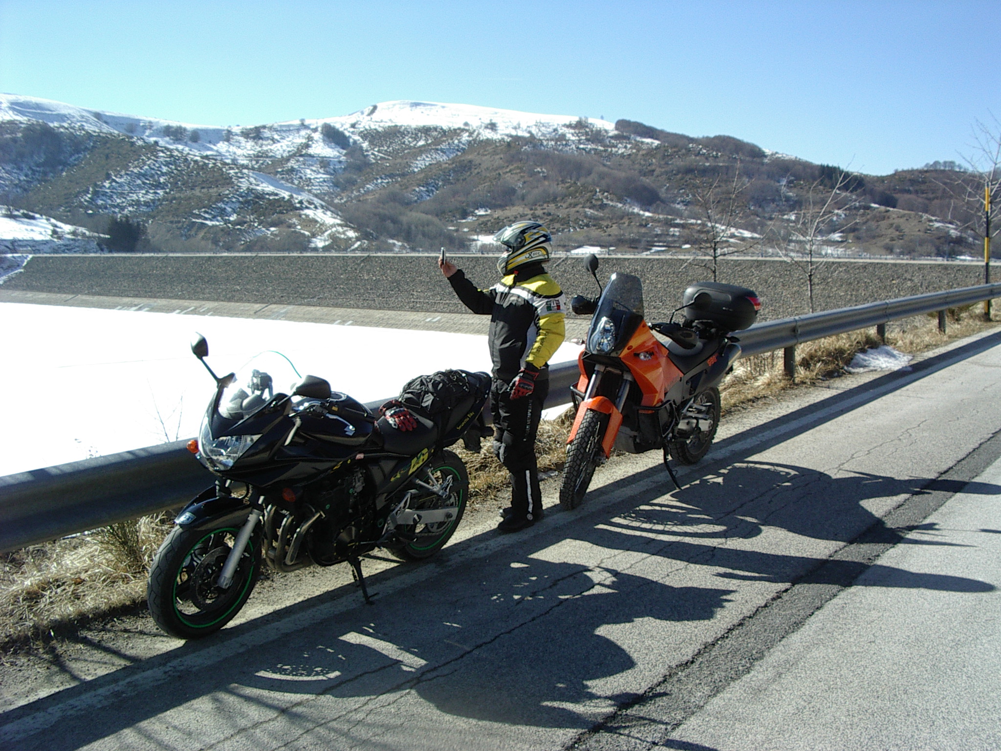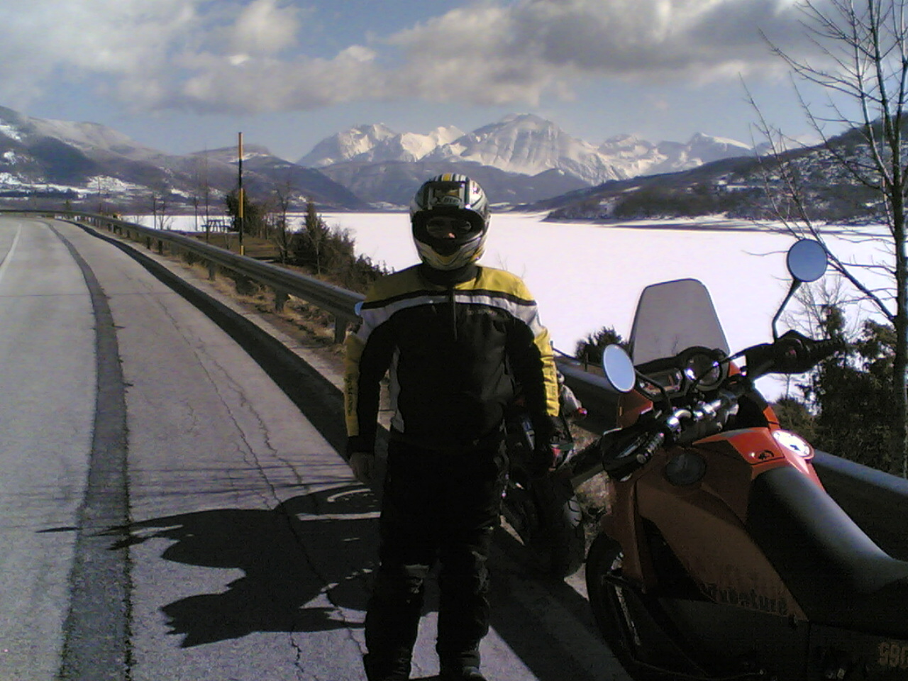 Ma dalla SS 80 salendo verso il lago di Campotosto quel che non ci aspettavamo è stato trovare fanghiglia ghiacciata sempre più abbondante. Ma ormai eravamo in ballo e lentamente, molto lentamente abbiamo percorso il lungo lago con estrema cautela, soprattutto Alberto a causa delle ruote tacchettate del sul KTM.