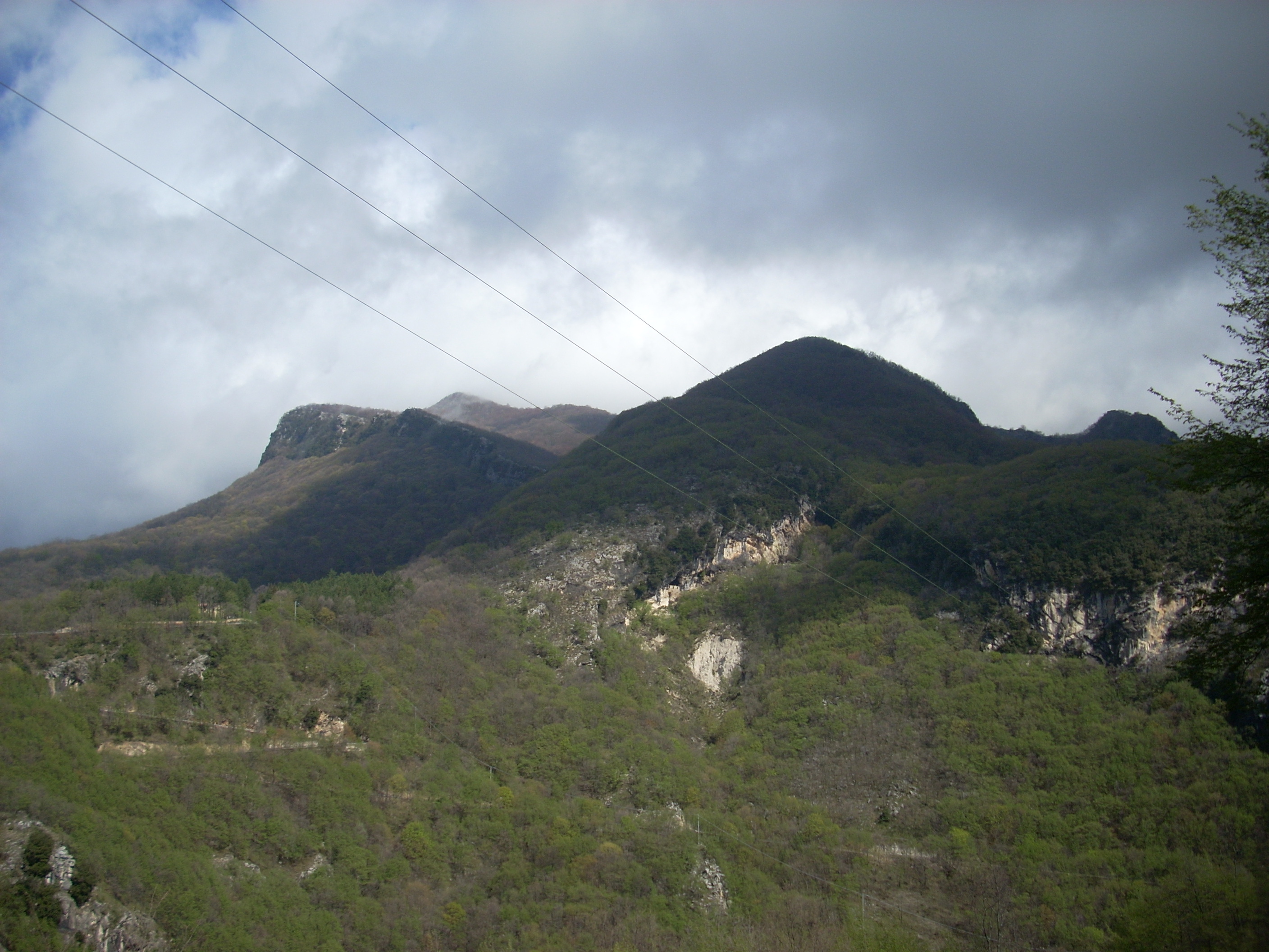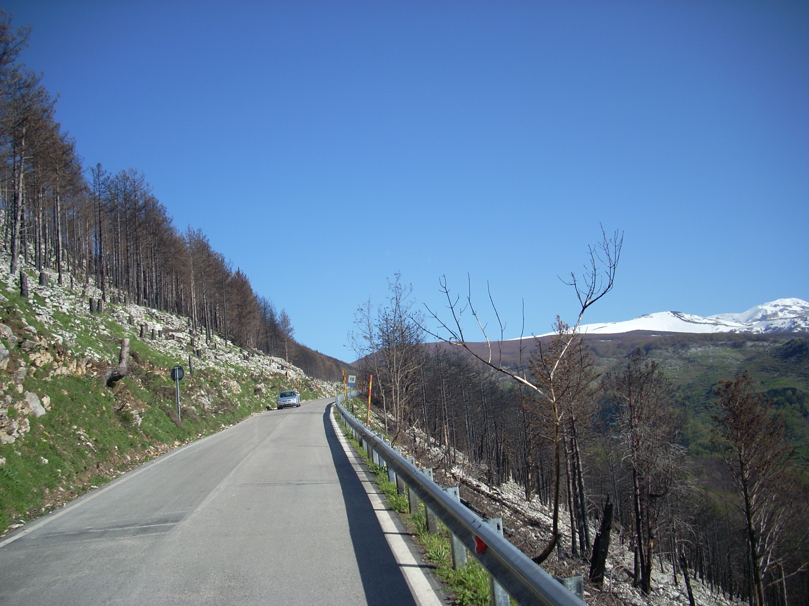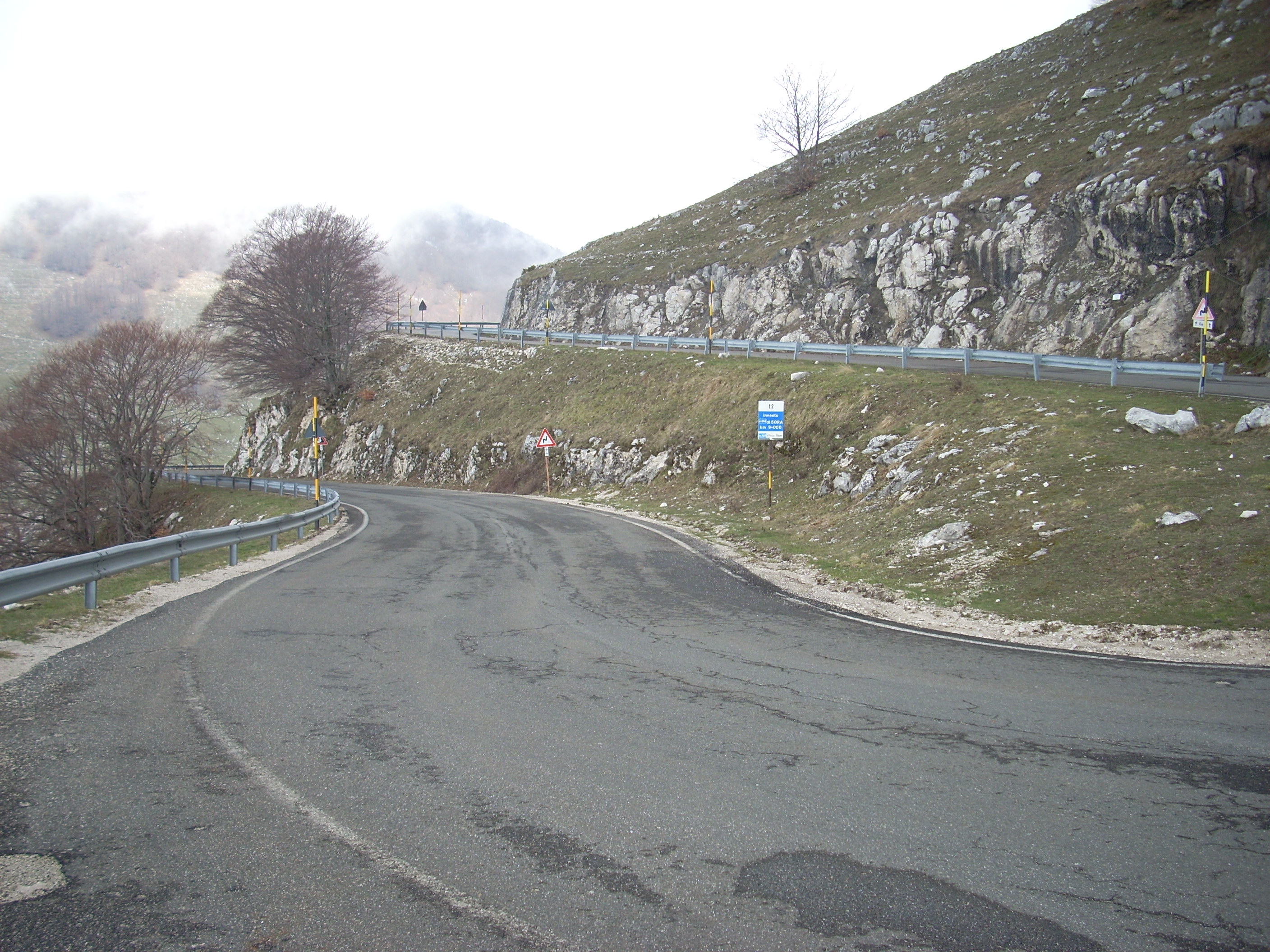 I passaggi sono bellissimi e col sole ce li godiamo appieno. La strada dapprima nel bosco e poi con una serie di fitti cambi di direzione costeggia la montagna a quota abbastanza elevata, intorno ai 900 metri, e lo spettacolo alla nostra sinistra è davvero bello. Osservando il gruppo della Maiella dalla parte di Sulmona o da nord sembra un enorme collina brulla, con i boschi solo fino ad una certa altezza, interrotta ogni tanto da solchi profondi ma da qui è tutt’altra cosa. I versanti orientali sono ripidi e scoscesi, rocciosi, con le lastre di calcare molto inclinate che sembrano scivolare sui paesi sottostanti, come a Fara San Martino. E a destra della strada, a nord di Palena, c’è una valle molto profonda, quella del Sangro, che lasciata Barrea e Castel di Sangro punta deciso a nord verso l’Adriatico.
