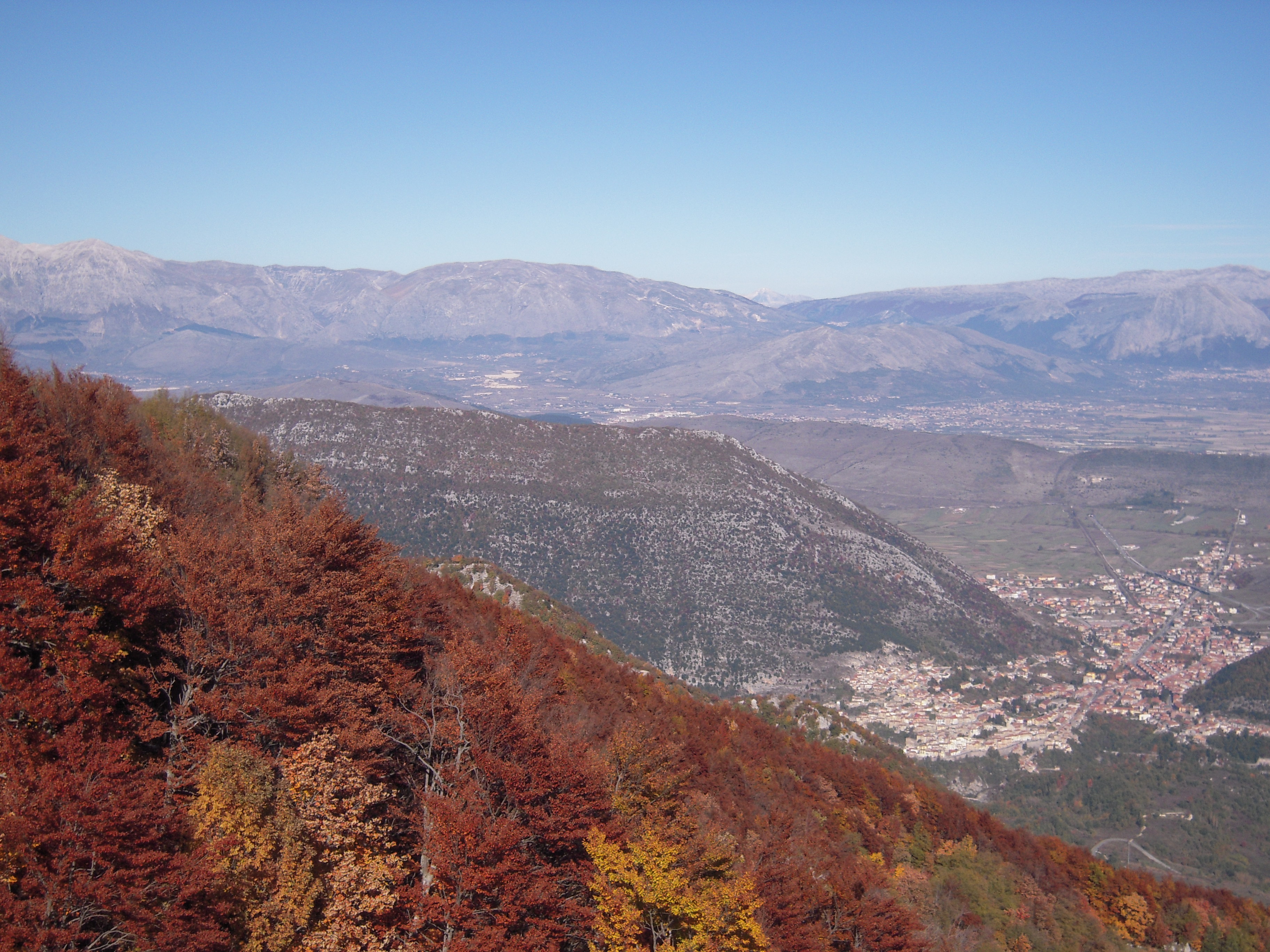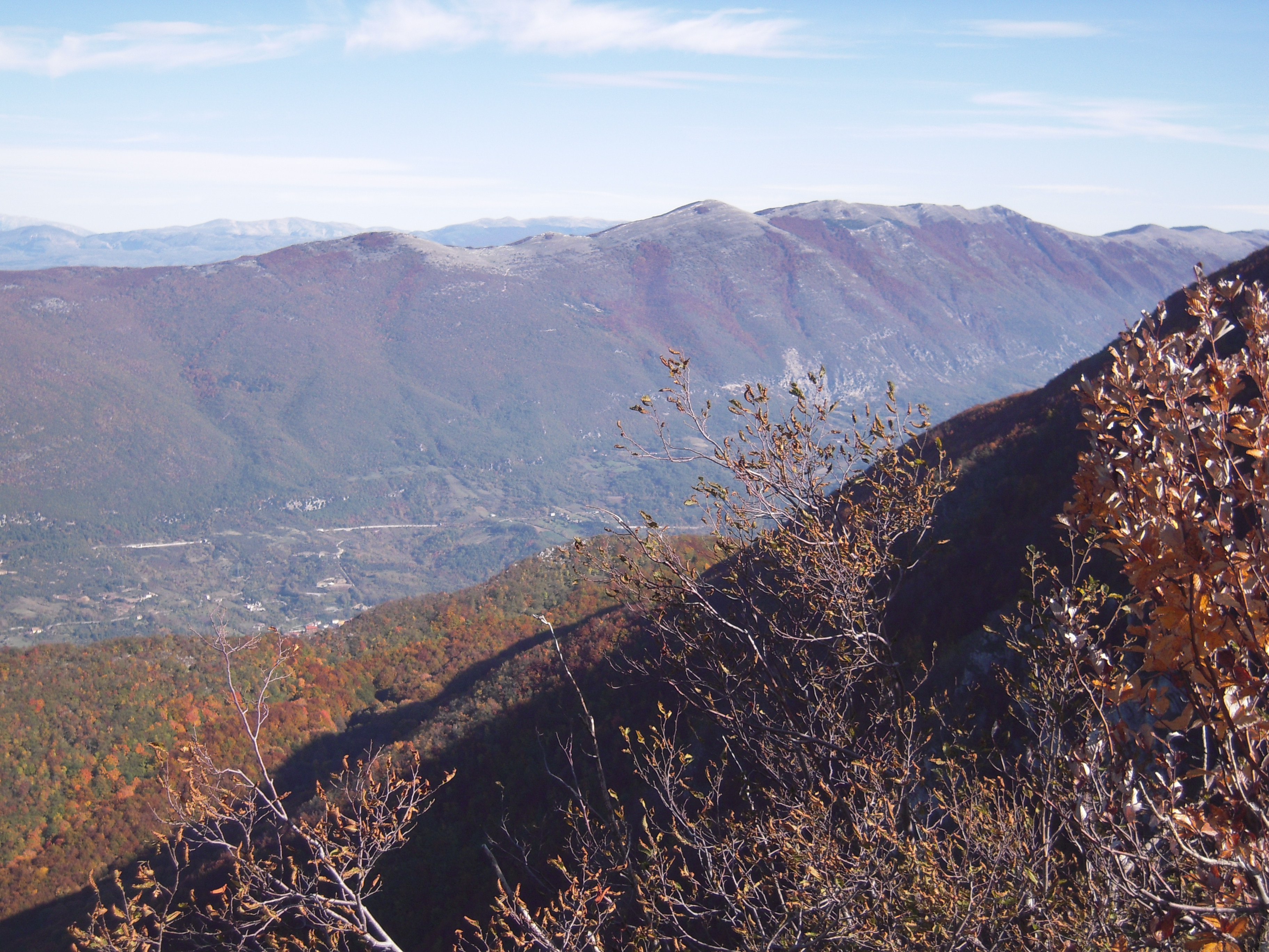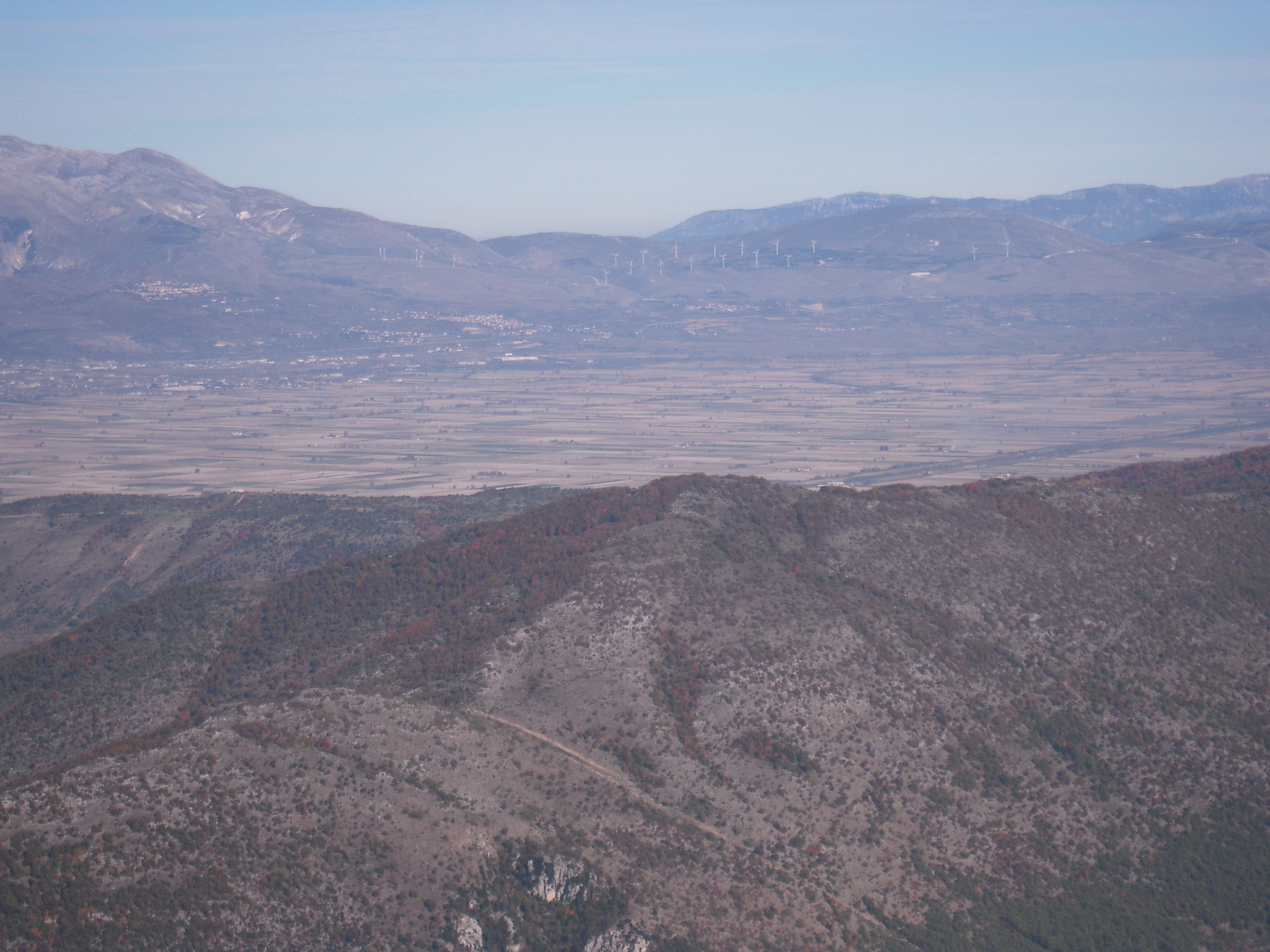 Nei giorni limpidi come oggi si vede l’intera piana del Fucino, il gruppo Sirente-Velino, l’altopiano delle Rocche e se si è fortunati il pizzo del Corno Grande parecchie decine di km a nord, svettare alle spalle delle montagne che orlano il Fucino e per finire le pale eoliche di Collarmele ed ancora più ad est il gruppo della Maiella. Ed oggi l’aria è davvero limpida.
