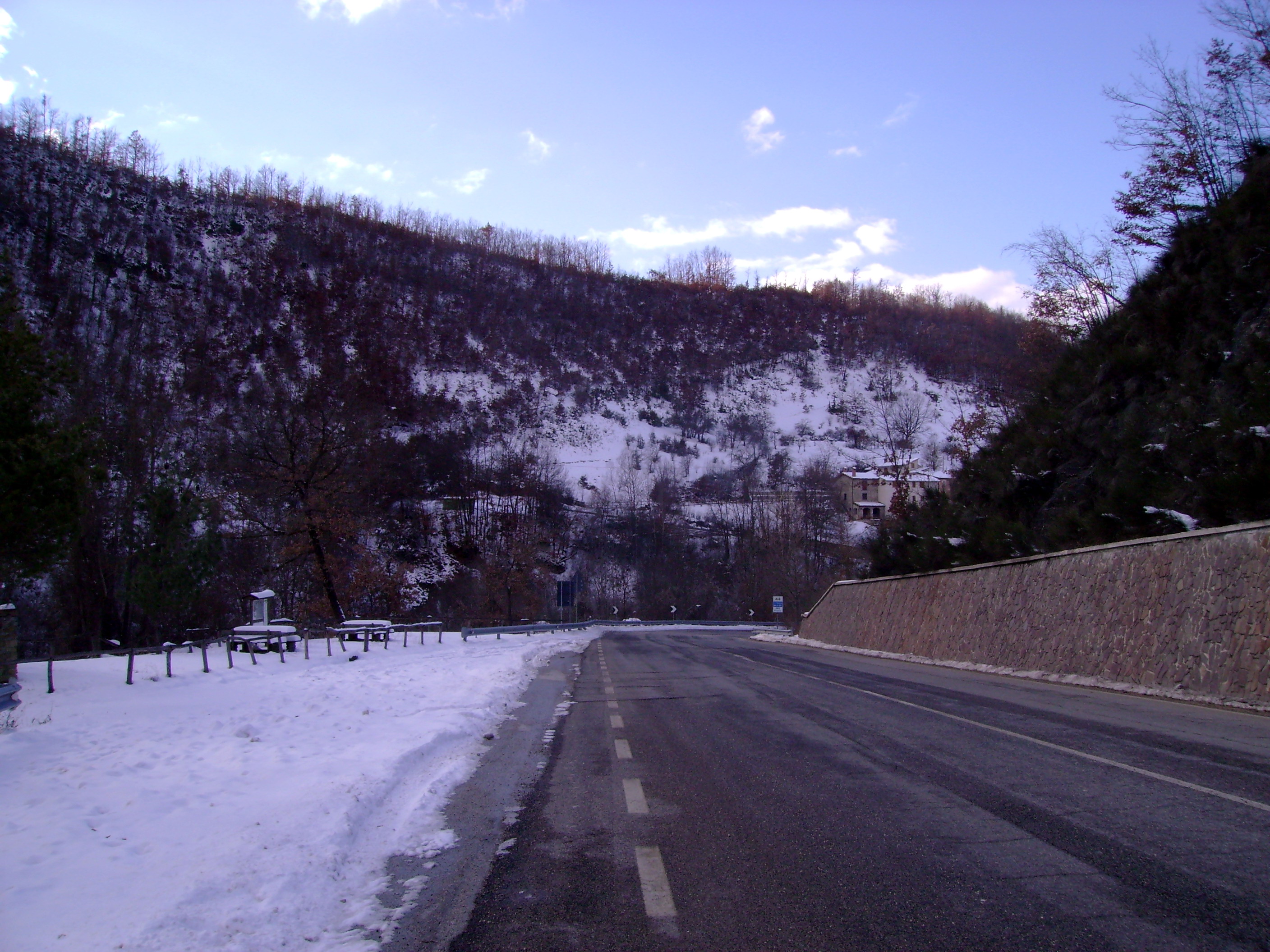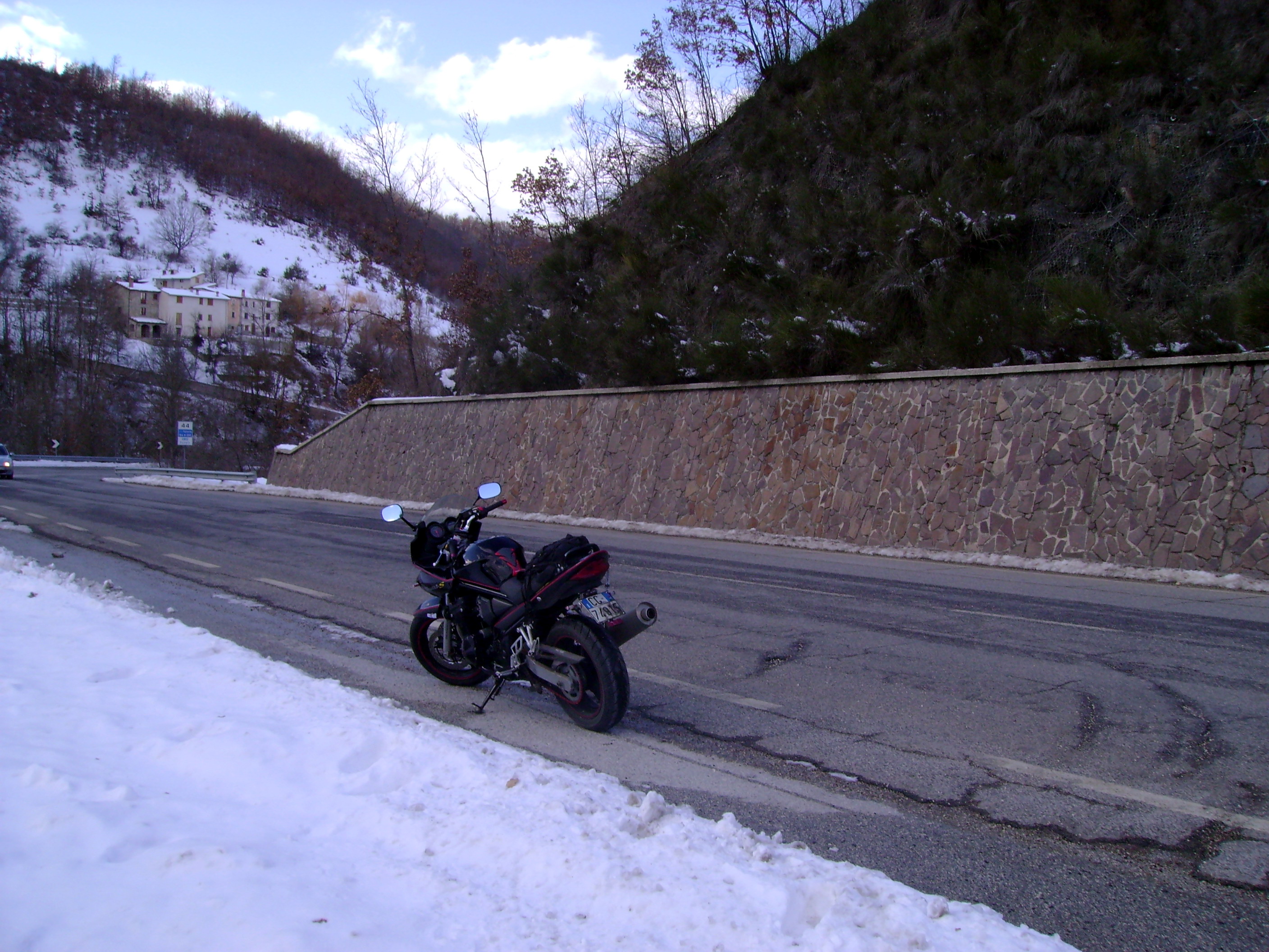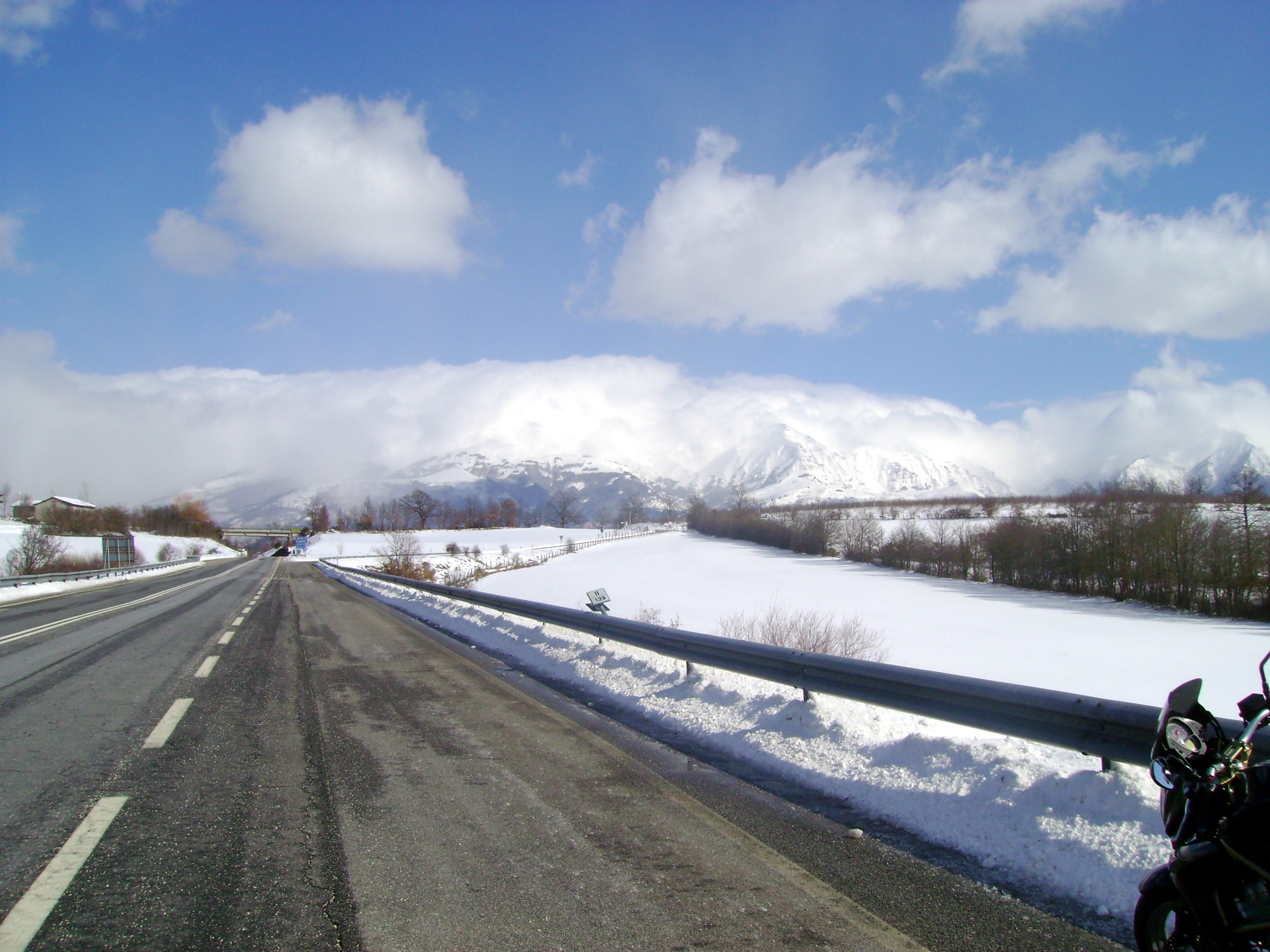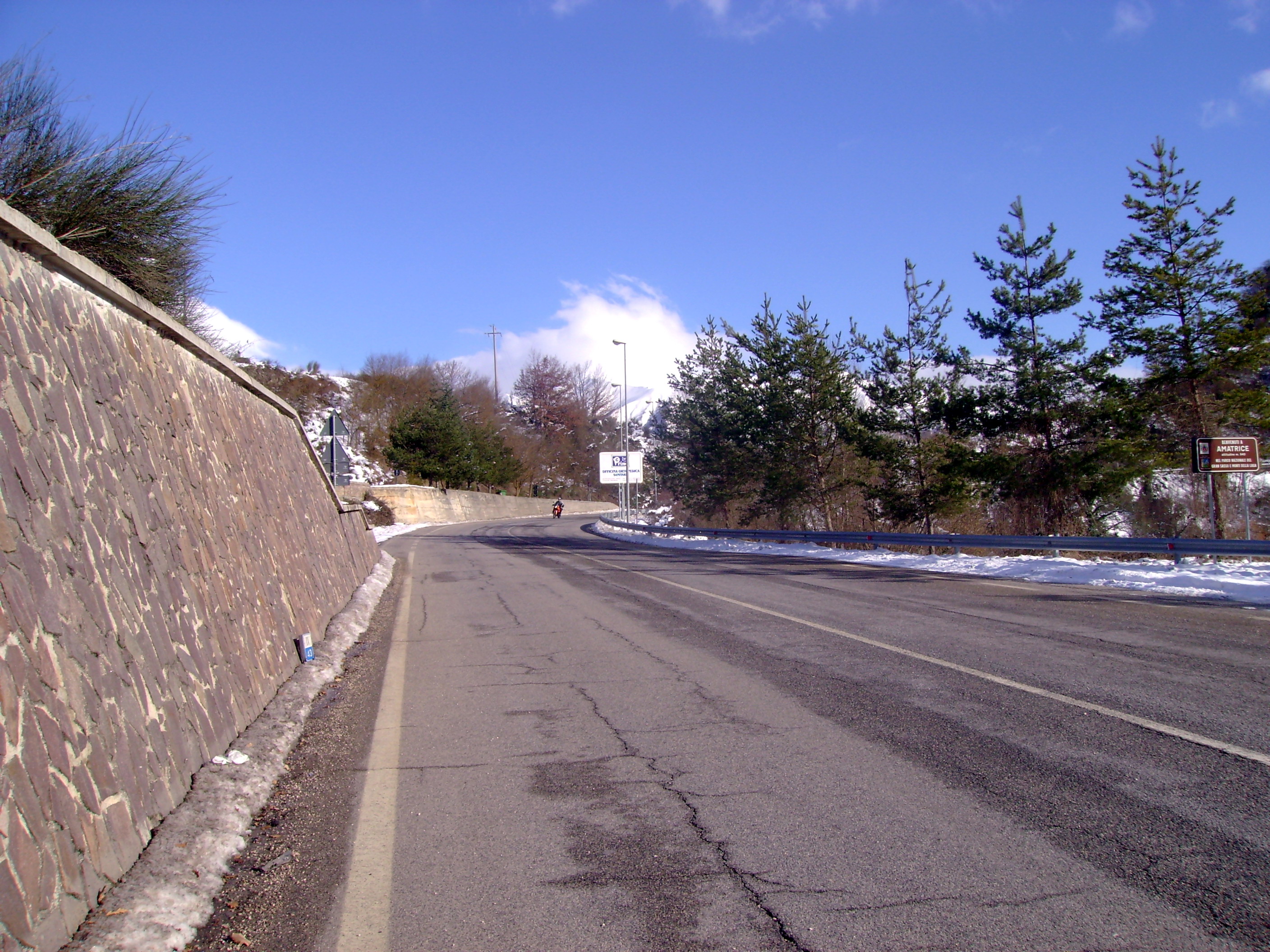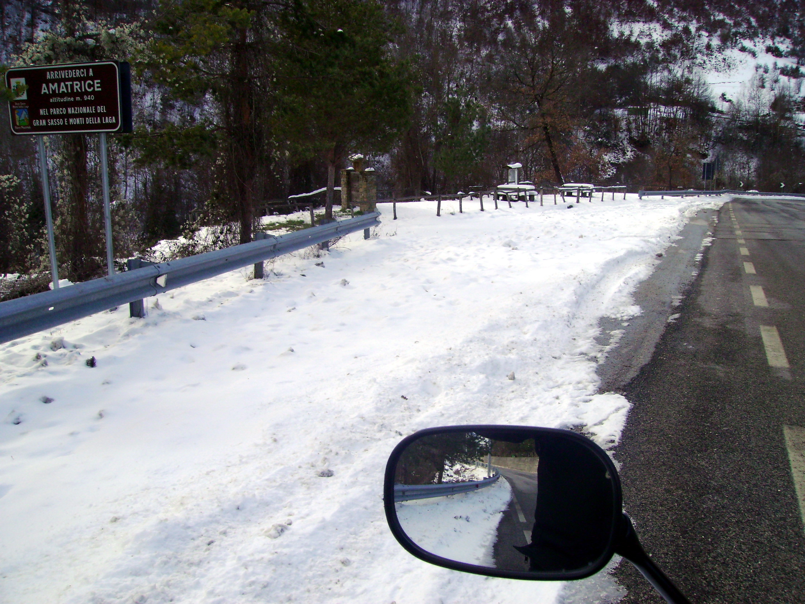 La strada è asciutta ma quel che troviamo sulla Salaria non appena passiamo la galleria poco prima di Amatrice è un paesaggio invernale doc: i campi e le cime intorno a noi sono abbondantemente innevati con la strada per fortuna ben pulita e riccamente cosparsa di sale. Lasciamo la Salaria e sulla provinciale che sale al paese la strada per fortuna continua ad essere pulita. Viaggiare in moto circondato da paesaggi innevati è emozionante.