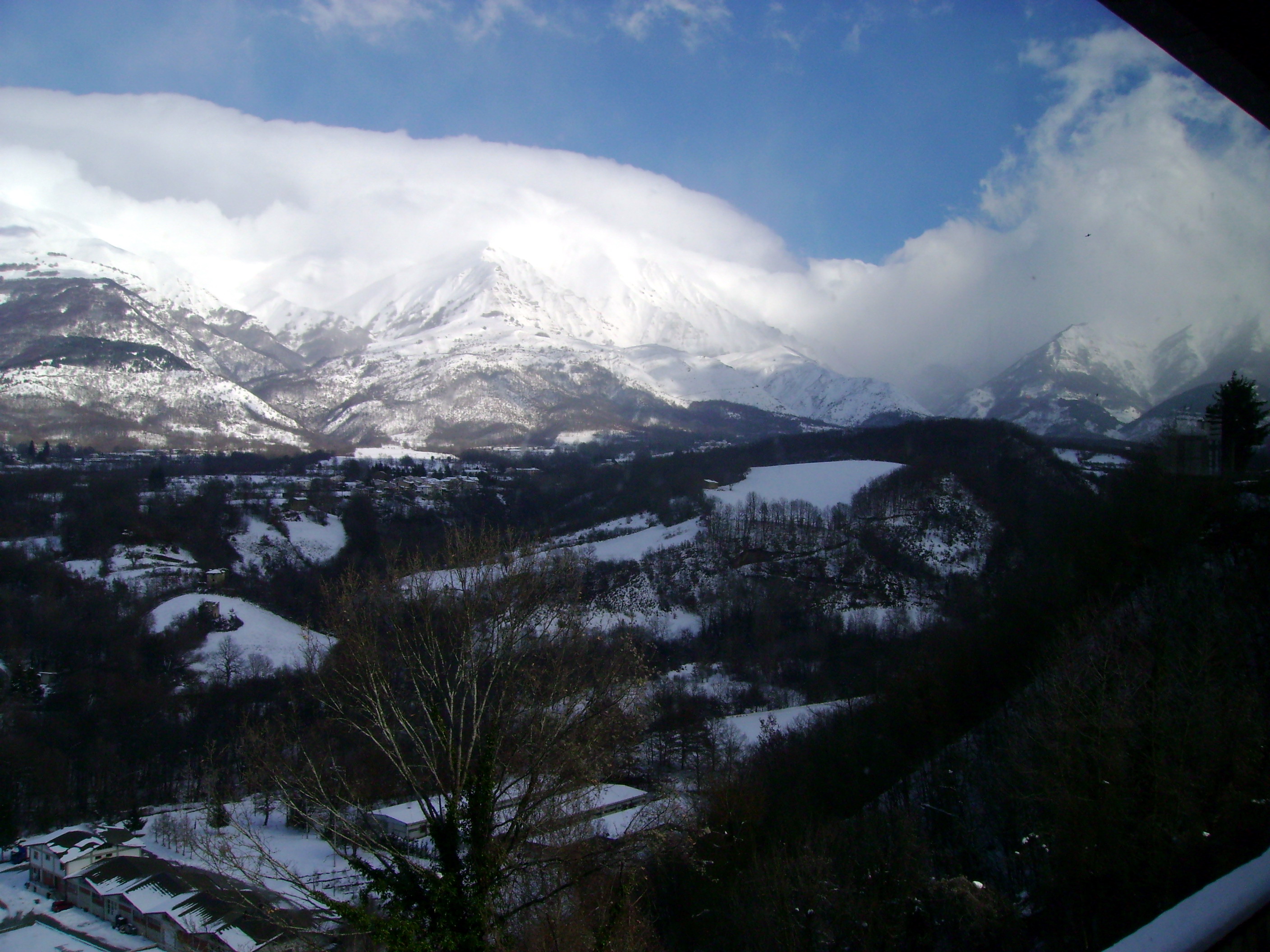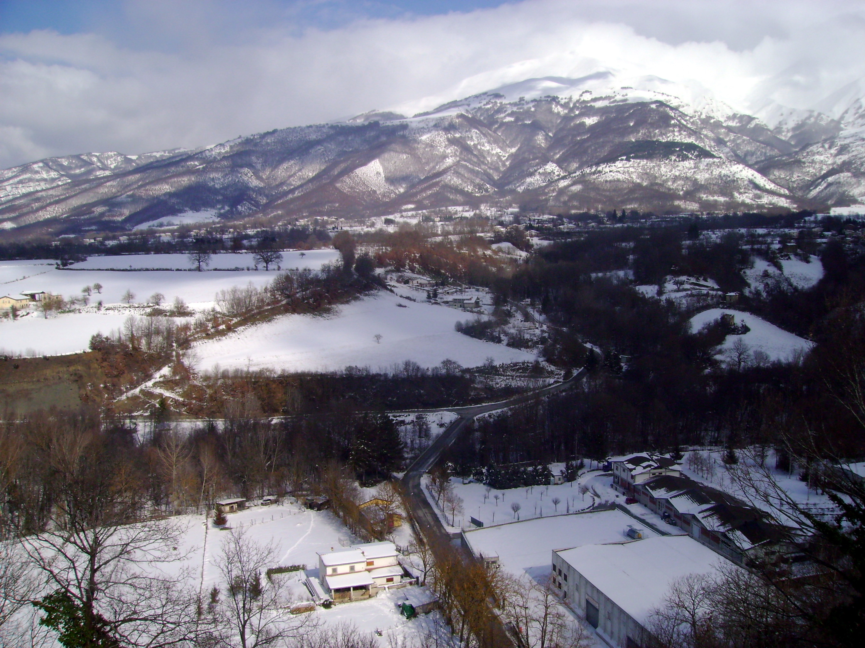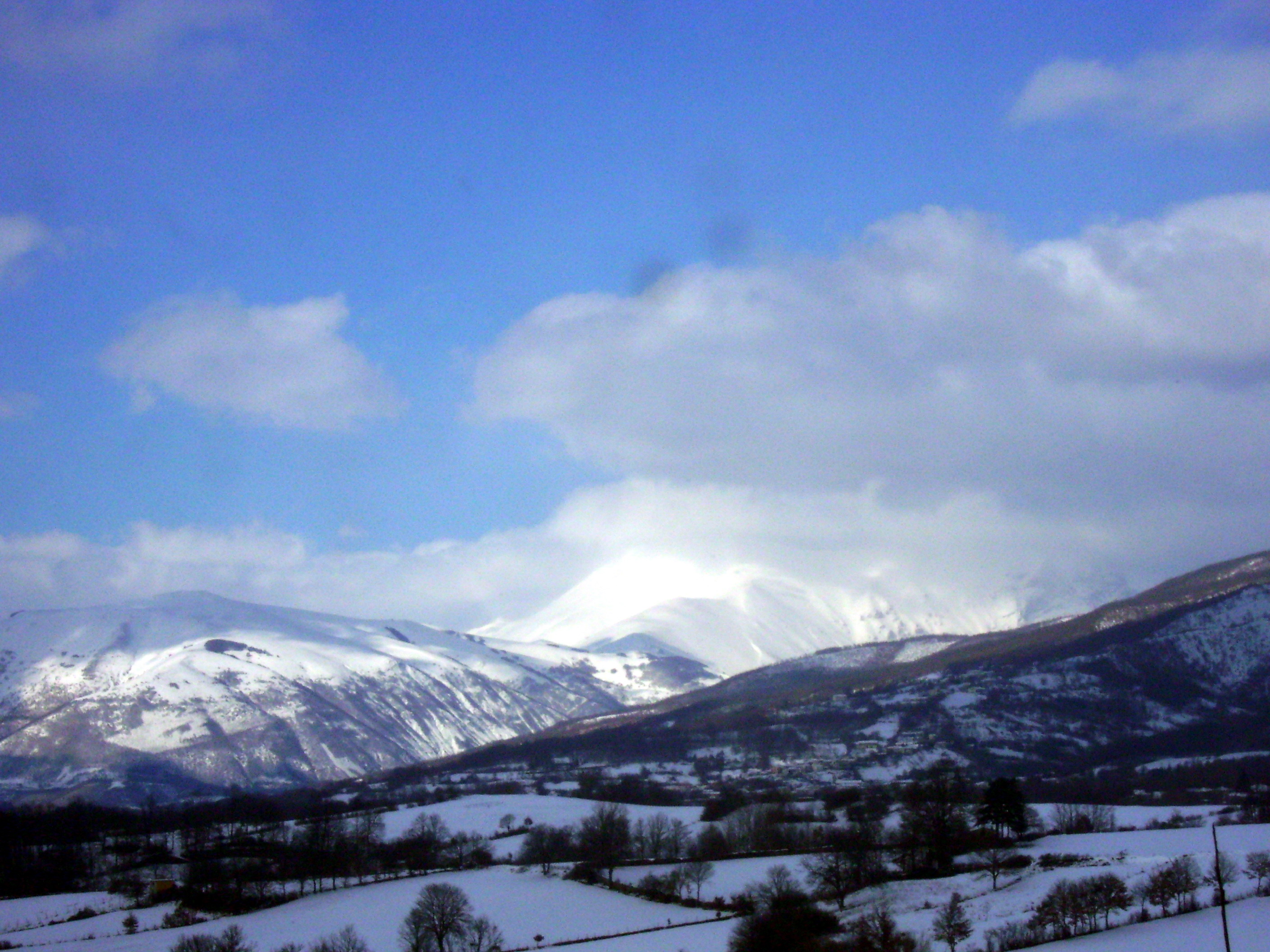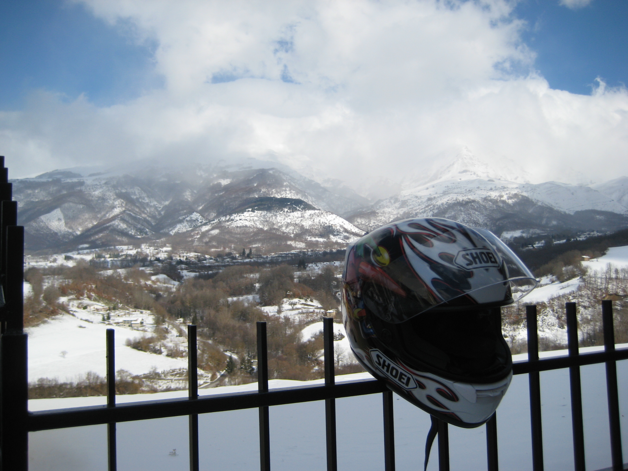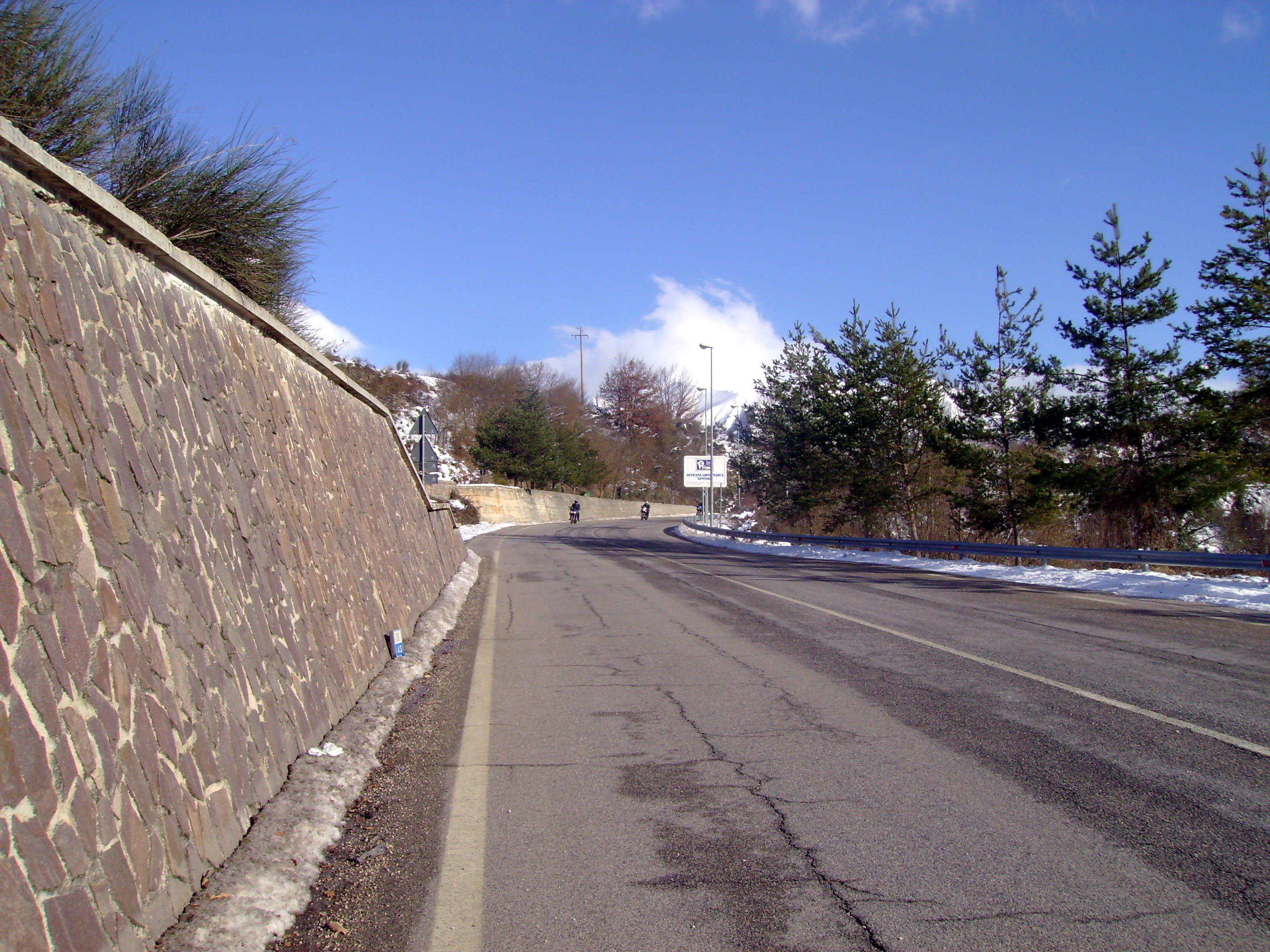 La strada è asciutta ma quel che troviamo sulla Salaria non appena passiamo la galleria poco prima di Amatrice è un paesaggio invernale doc: i campi e le cime intorno a noi sono abbondantemente innevati con la strada per fortuna ben pulita e riccamente cosparsa di sale. Lasciamo la Salaria e sulla provinciale che sale al paese la strada per fortuna continua ad essere pulita. Viaggiare in moto circondato da paesaggi innevati è emozionante.