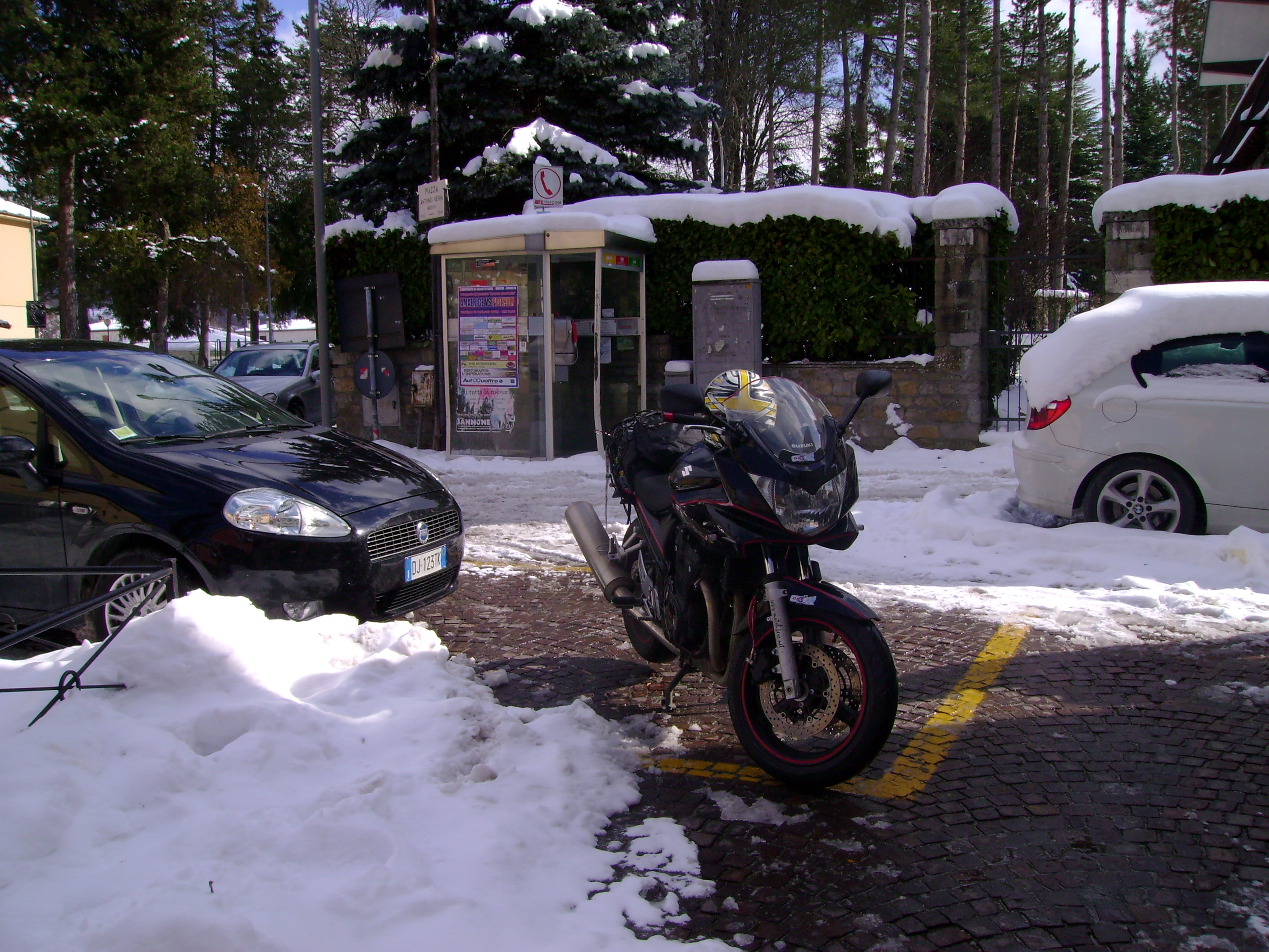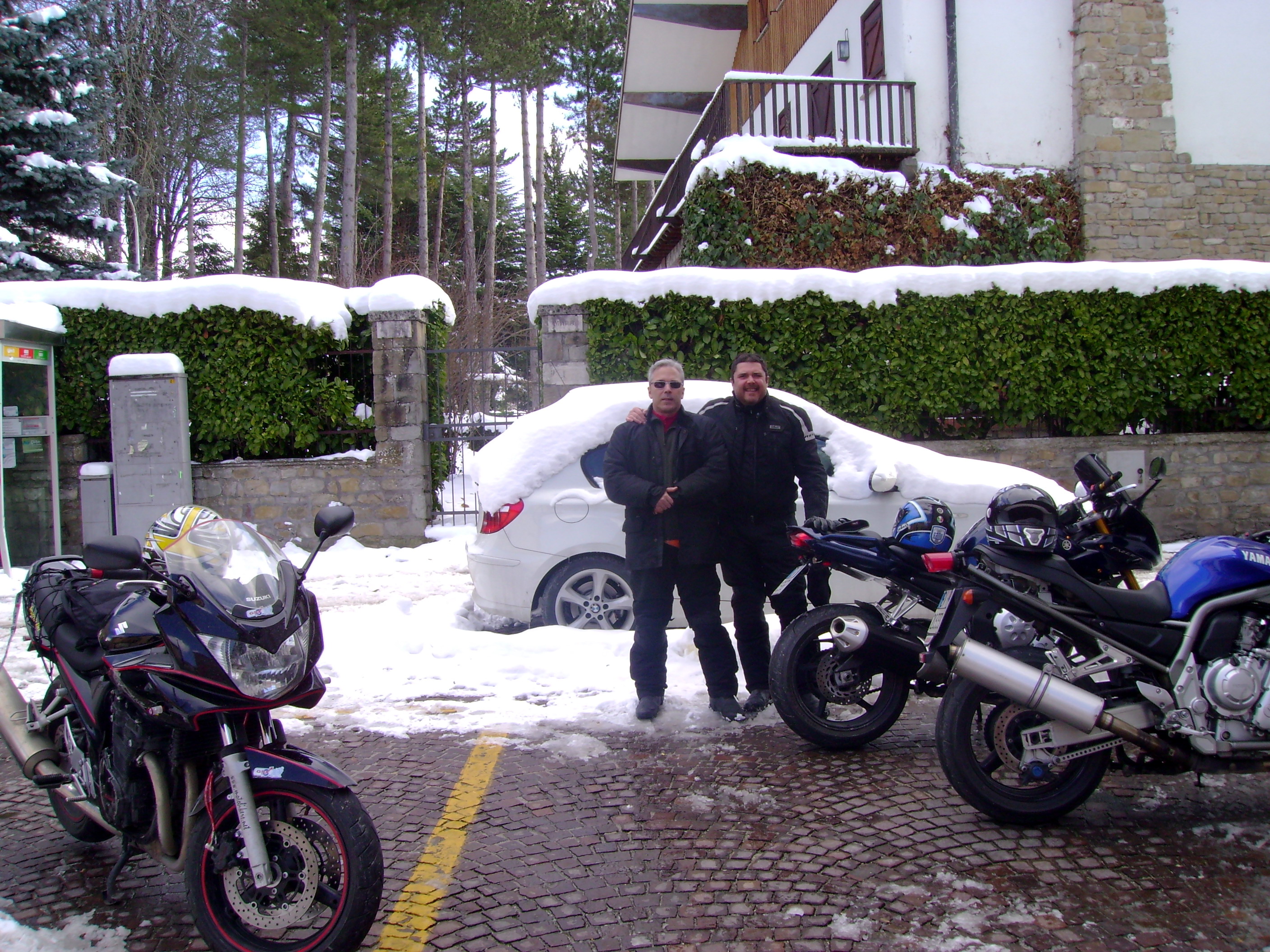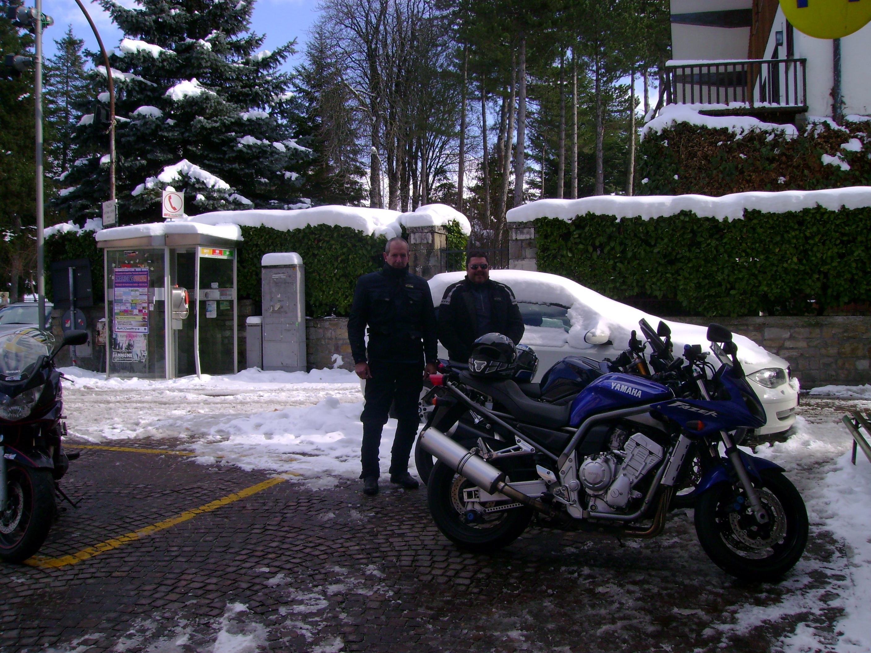 Arrivati al paese la strada principale non è perfettamente pulita e con entrambi i piedi a terra si procede a passo d’uomo ed all’arrivo qualche difficoltà nel trovare un parcheggio stabile c’è! Non capisco la temerarietà di quelli che hanno portato le moto nel vicolo innevato proprio di fronte al ristorante col rischio di cadere ad ogni metro. E’ noto che come la ruota anteriore slitta di lato a meno di non essere degli energumeni la caduta è assicurata!