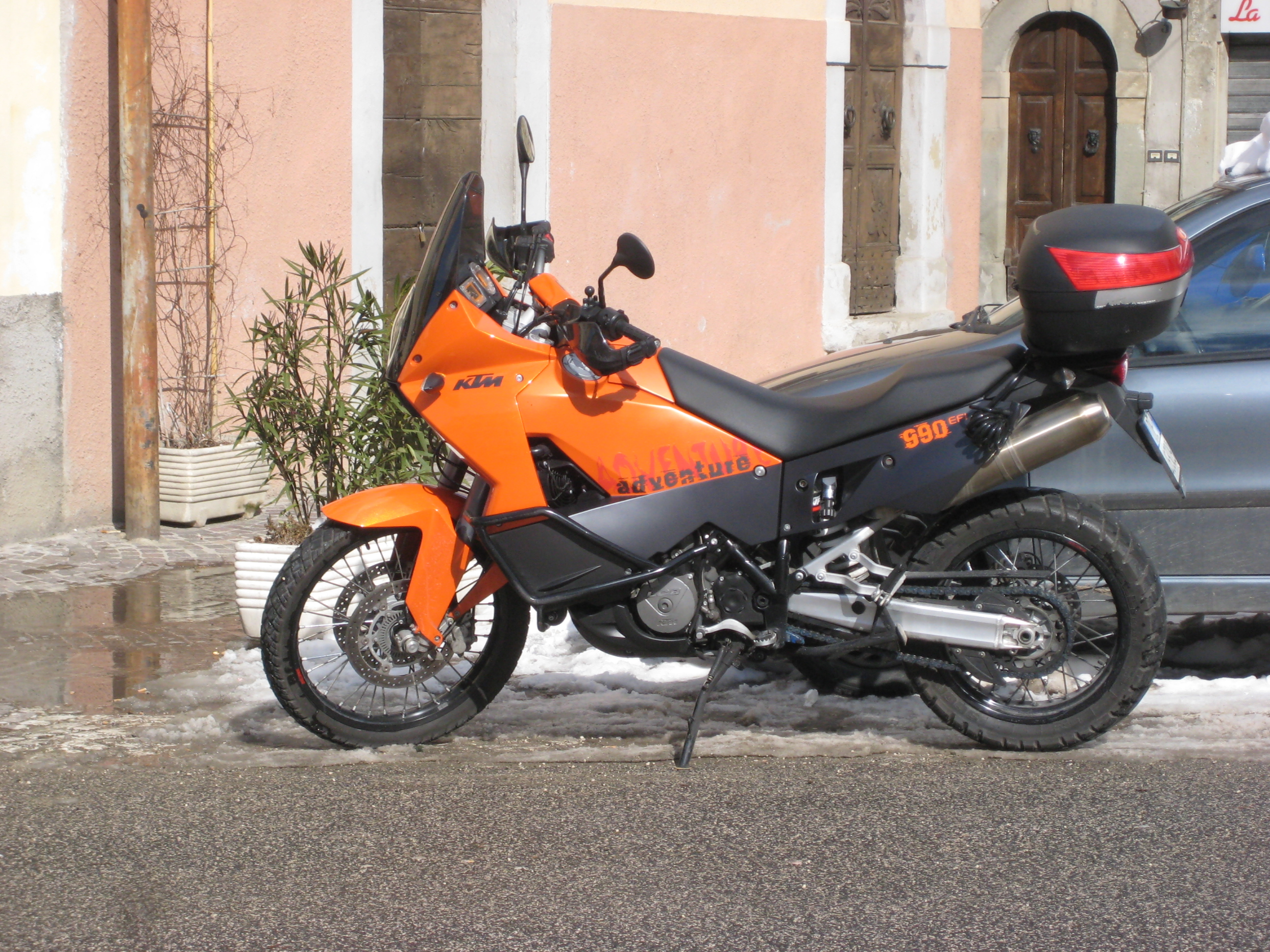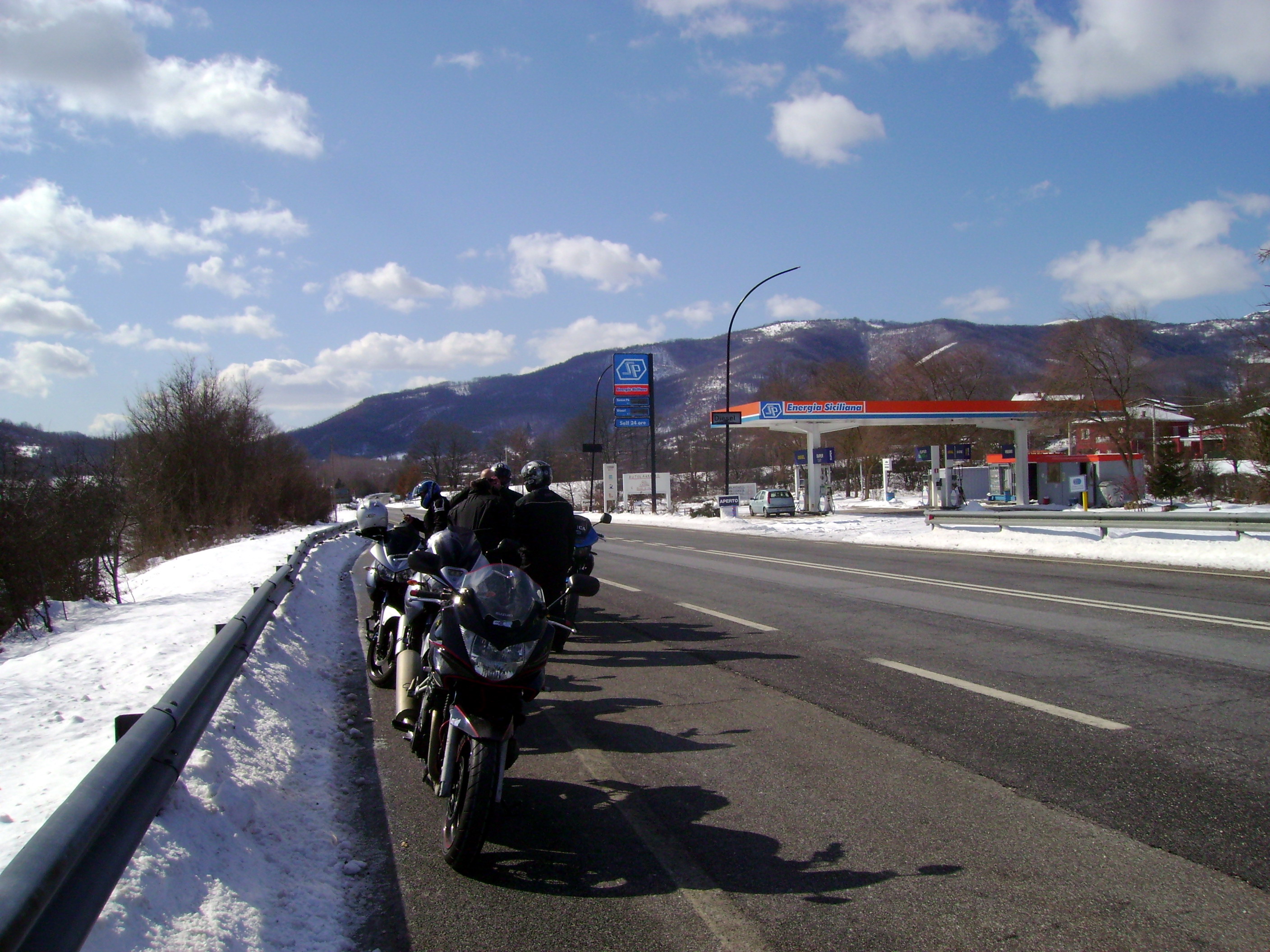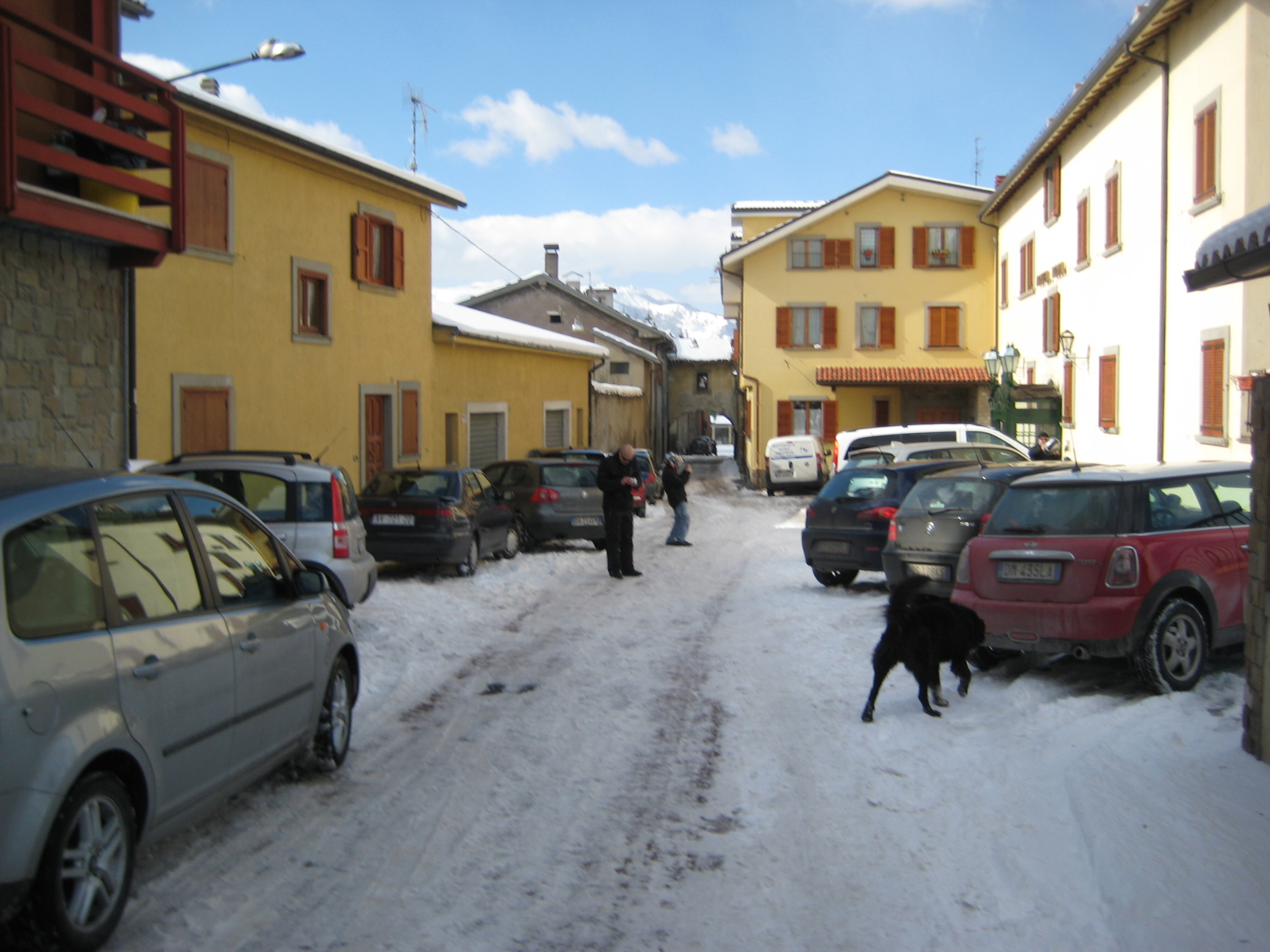 Arrivati al paese la strada principale non è perfettamente pulita e con entrambi i piedi a terra si procede a passo d’uomo ed all’arrivo qualche difficoltà nel trovare un parcheggio stabile c’è! Non capisco la temerarietà di quelli che hanno portato le moto nel vicolo innevato proprio di fronte al ristorante col rischio di cadere ad ogni metro. E’ noto che come la ruota anteriore slitta di lato a meno di non essere degli energumeni la caduta è assicurata!