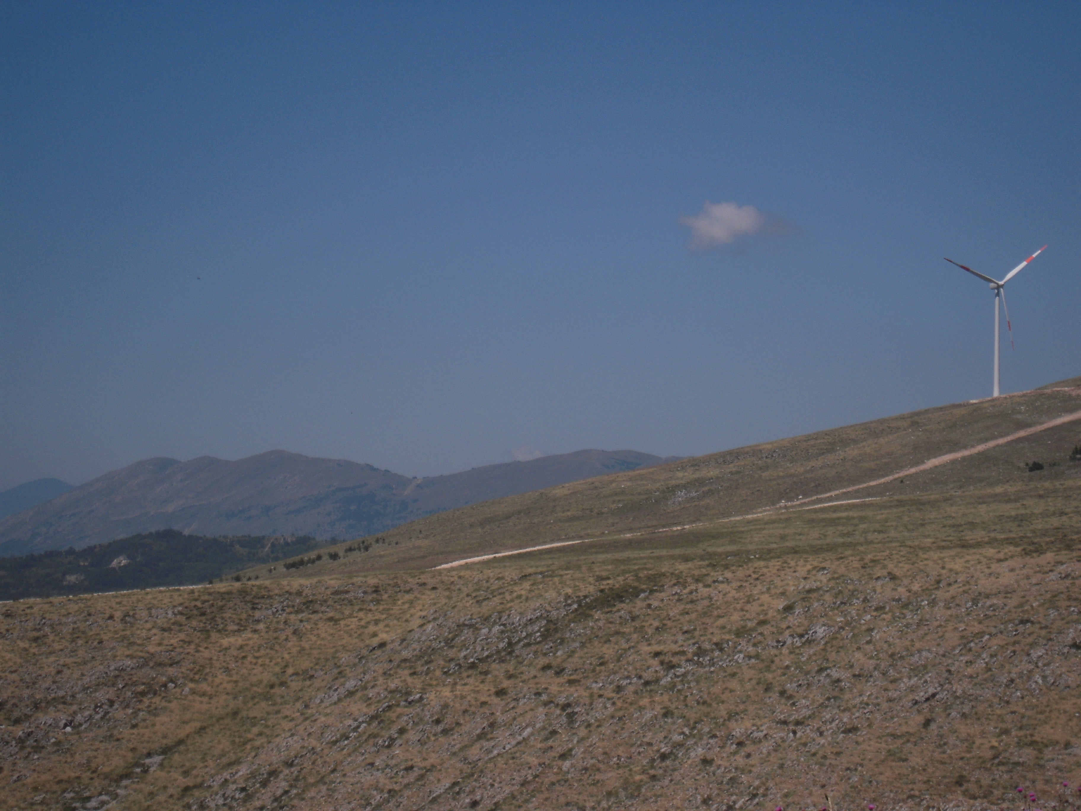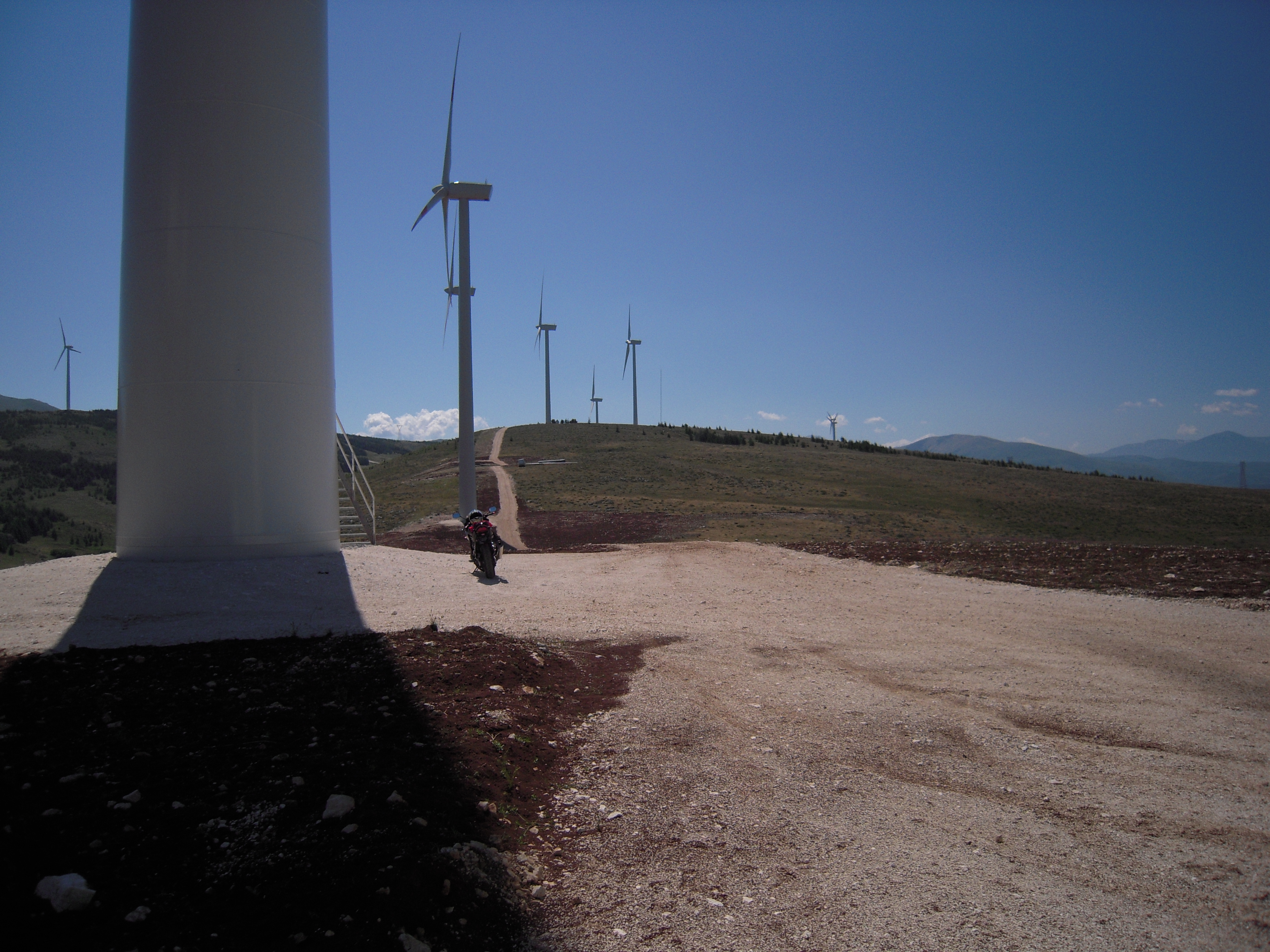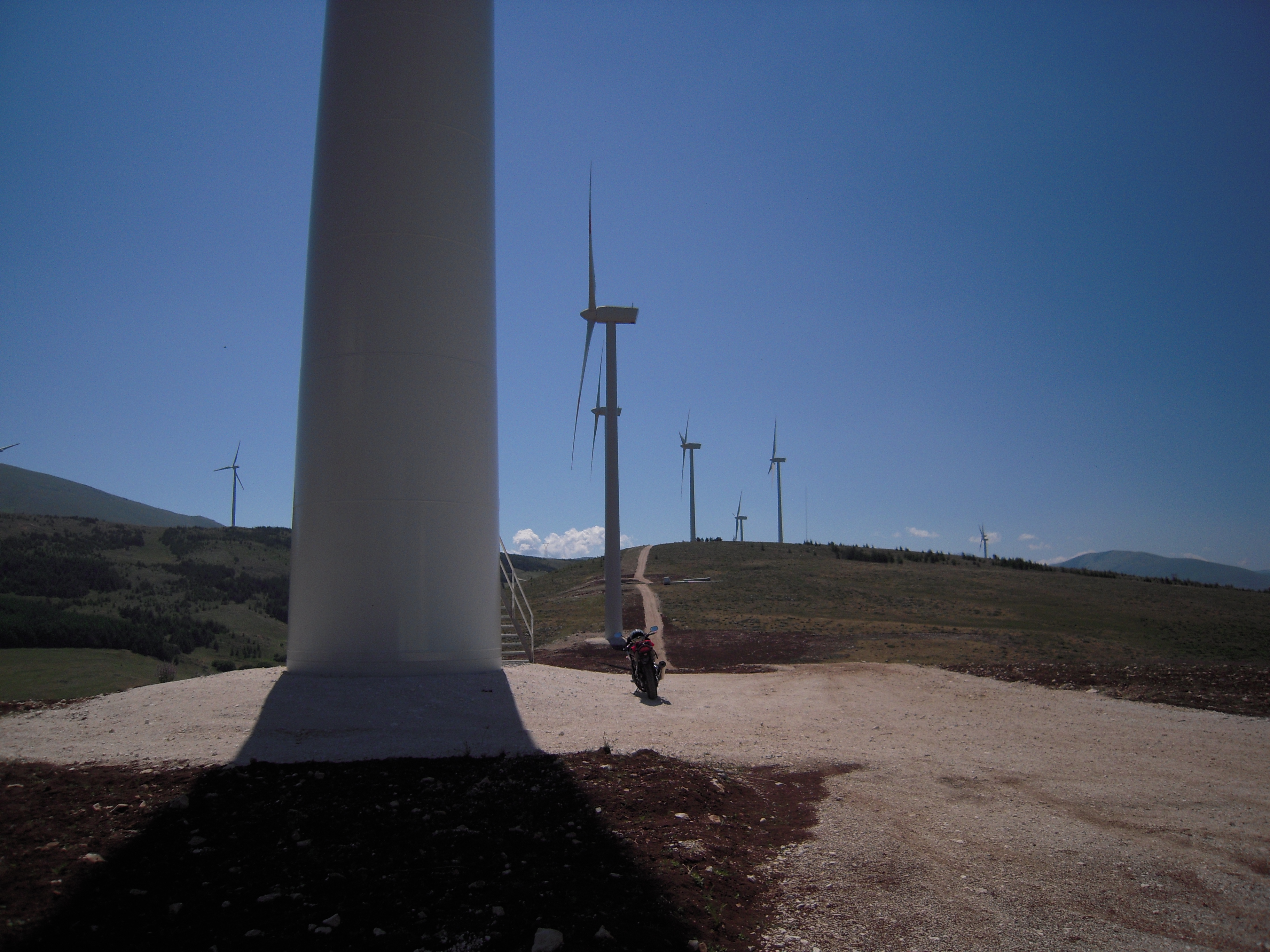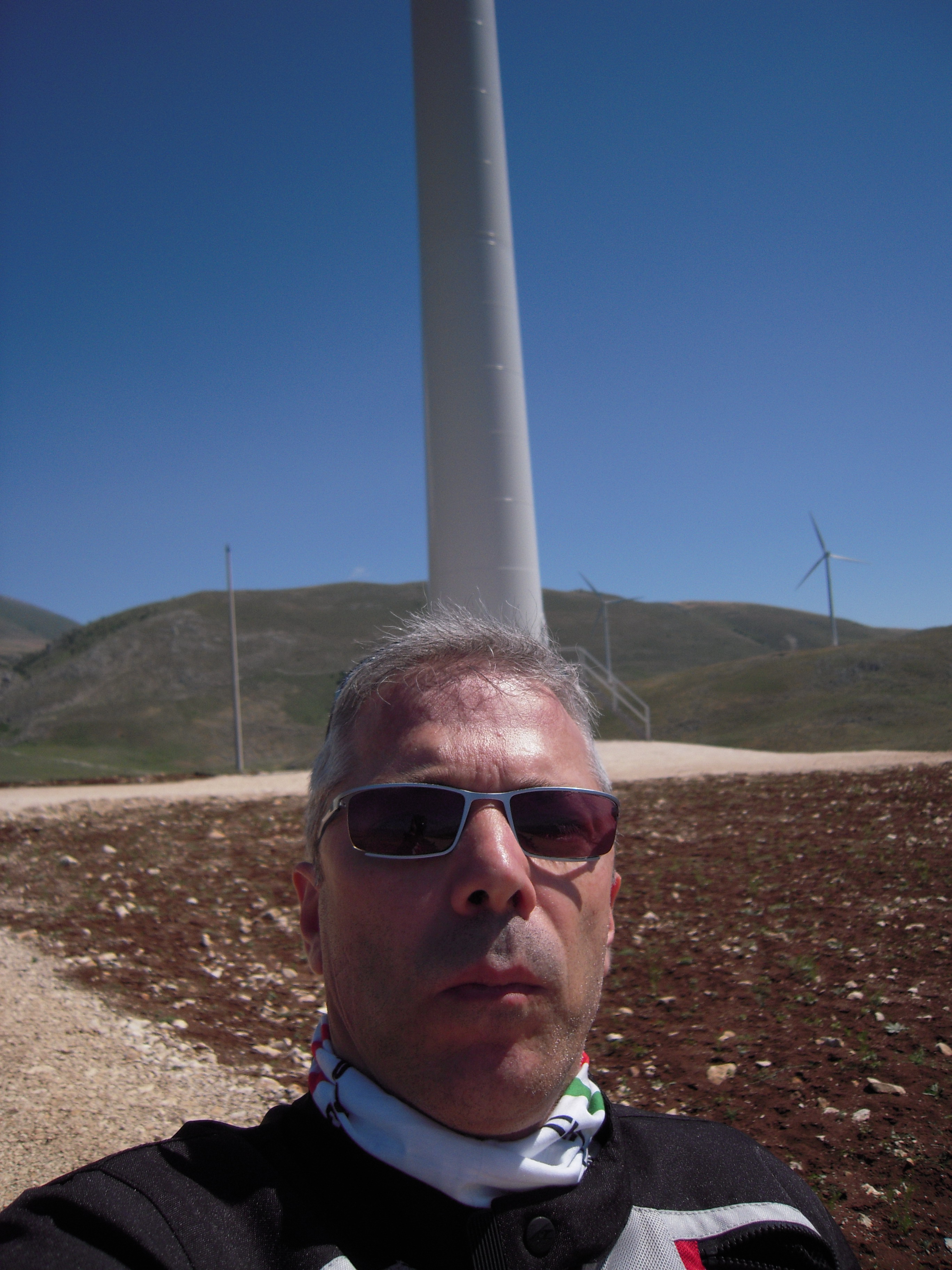 All’altezza del parco eolico di Collarmele mi sono levato uno sfizio che avrei voluto togliermi ogni volta che mi sono trovato a passare di qui. Salire con la strada bianca ma percorribile fin sotto una delle enormi pale eoliche che svettano da quelle parti. Sono davvero imponenti. Alte forse 50 metri il gruppo che è in cima sarà grande come un pulmino! Basta osservare le foto e le dimensioni della moto!