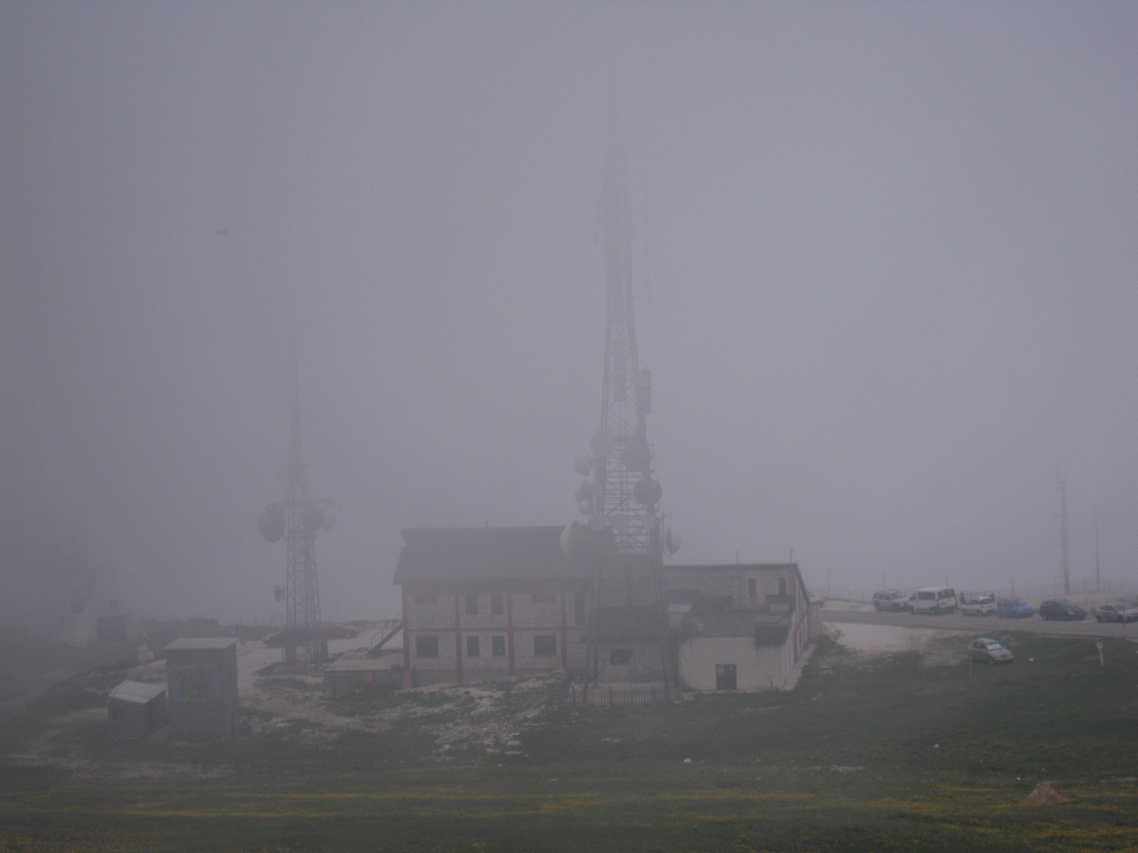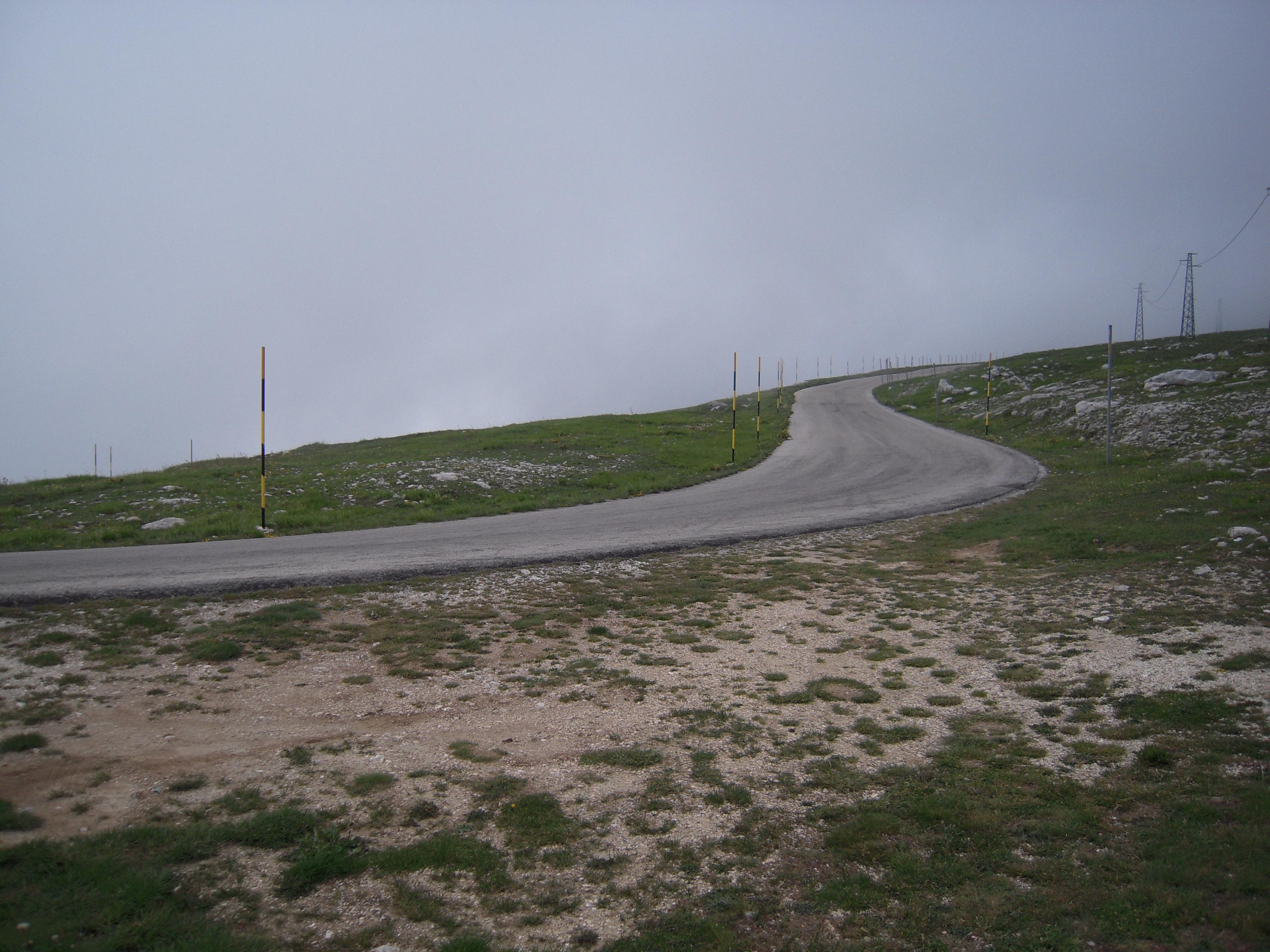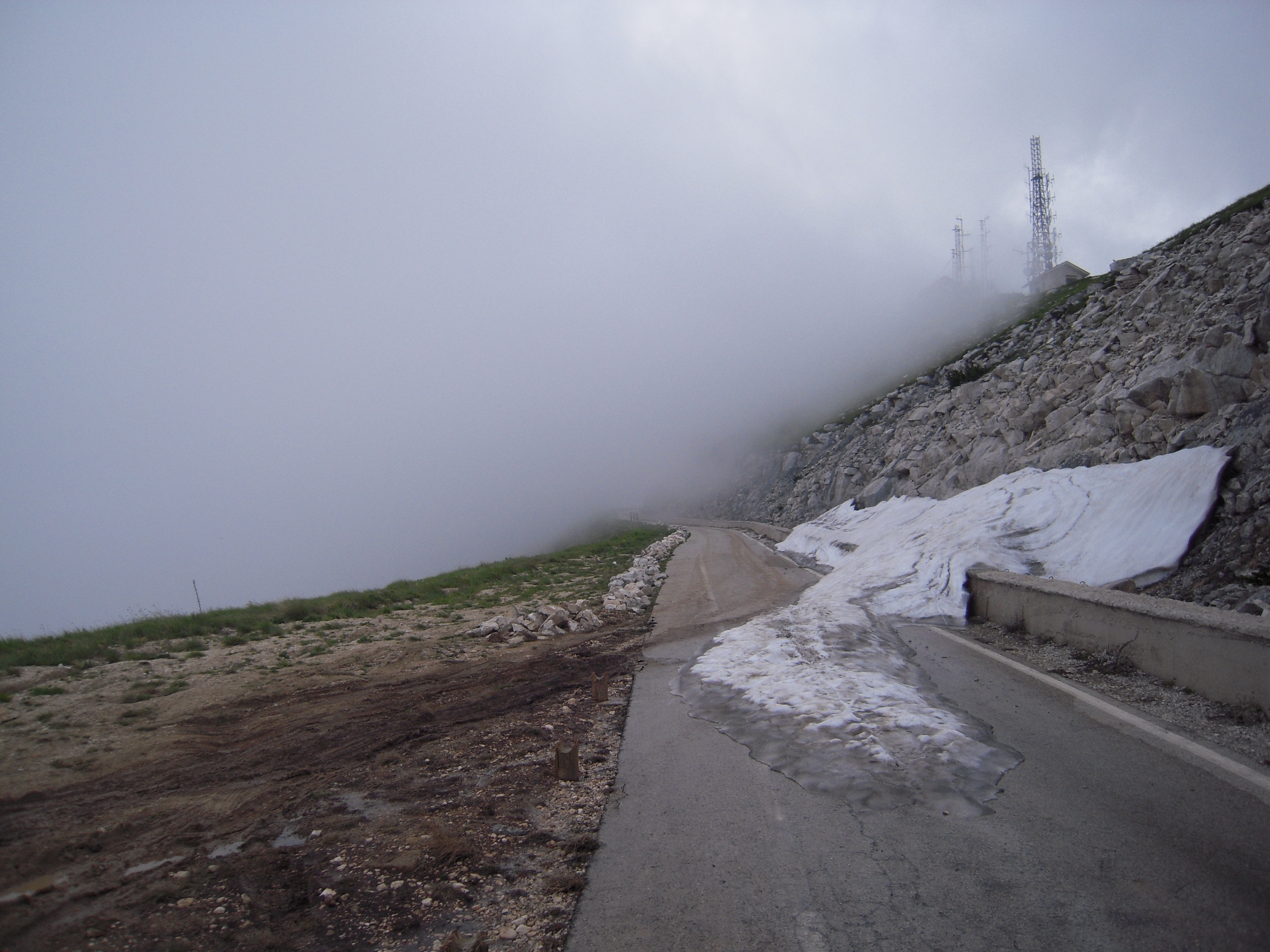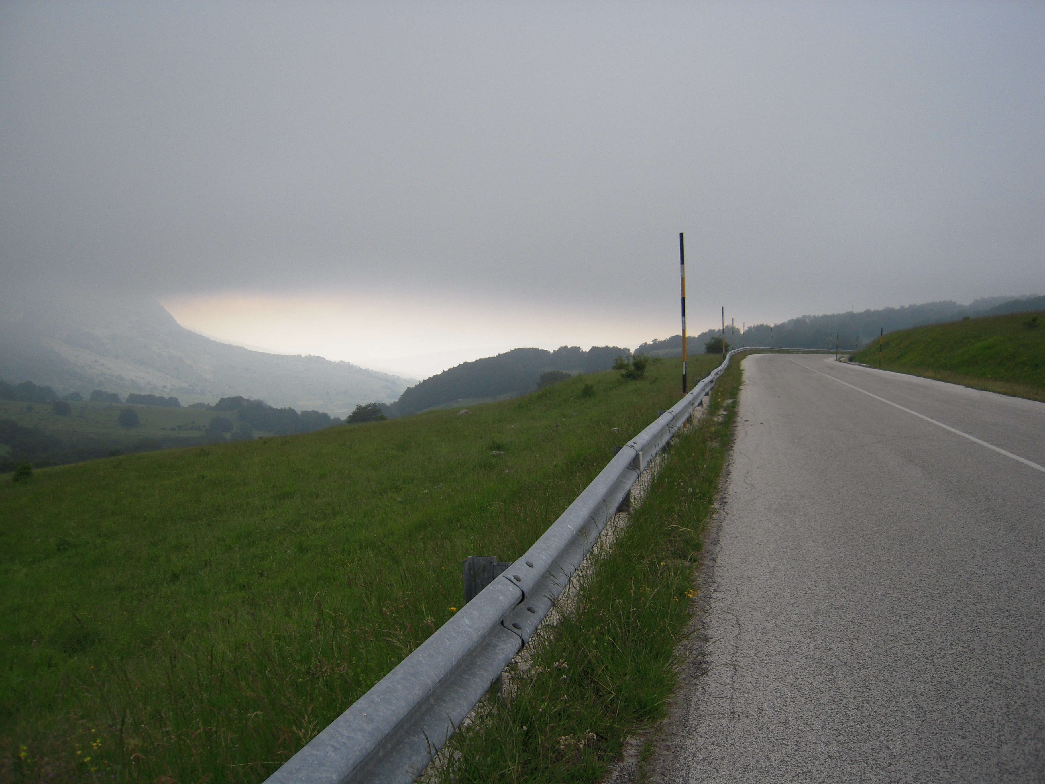 Ho continuato sulla Tiburtina nella caldissima piana di Sulmona e su fino a Scafa da dove ho iniziato la mia salita verso Passo Lanciano ed alla Maielletta, al Blockhaus. Ci sono stato un sacco di tempo. Il sole lascia il posto ad un cielo abbastanza coperto, sarà il gran caldo, ma non sembra dover piovere. La sorpresa sarà la salita sulla bella strada che da Passo Lanciano va su, nella nebbia delle nuvole basse, a tratti anche abbastanza fitta.