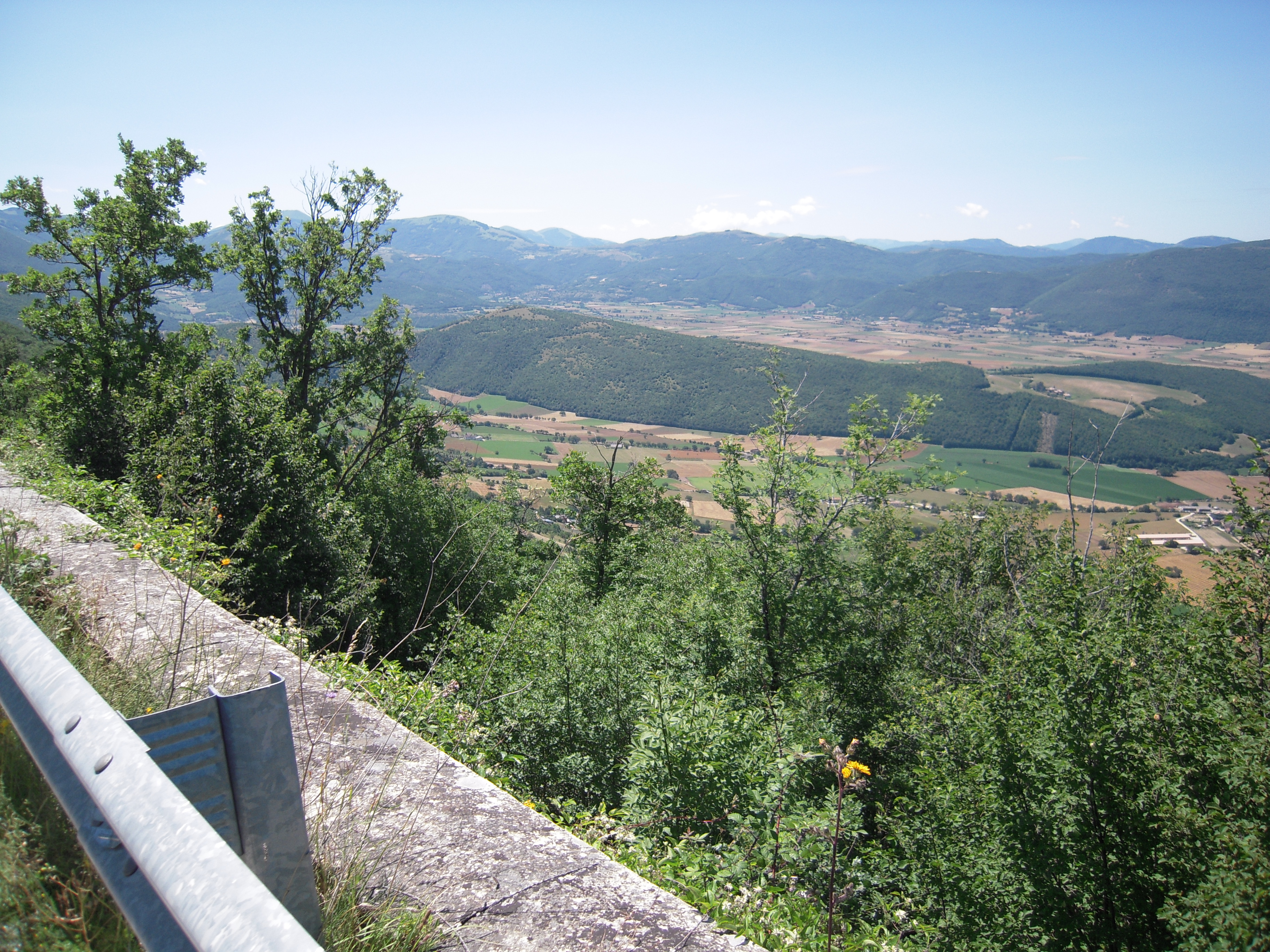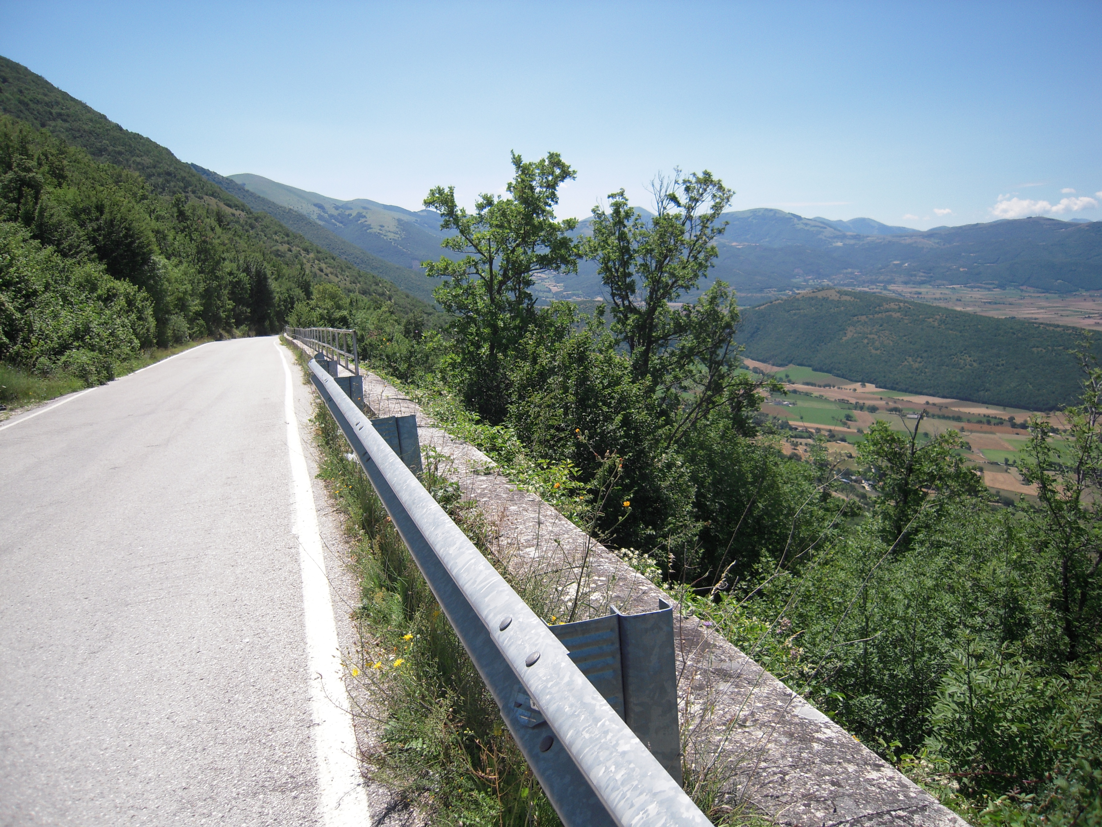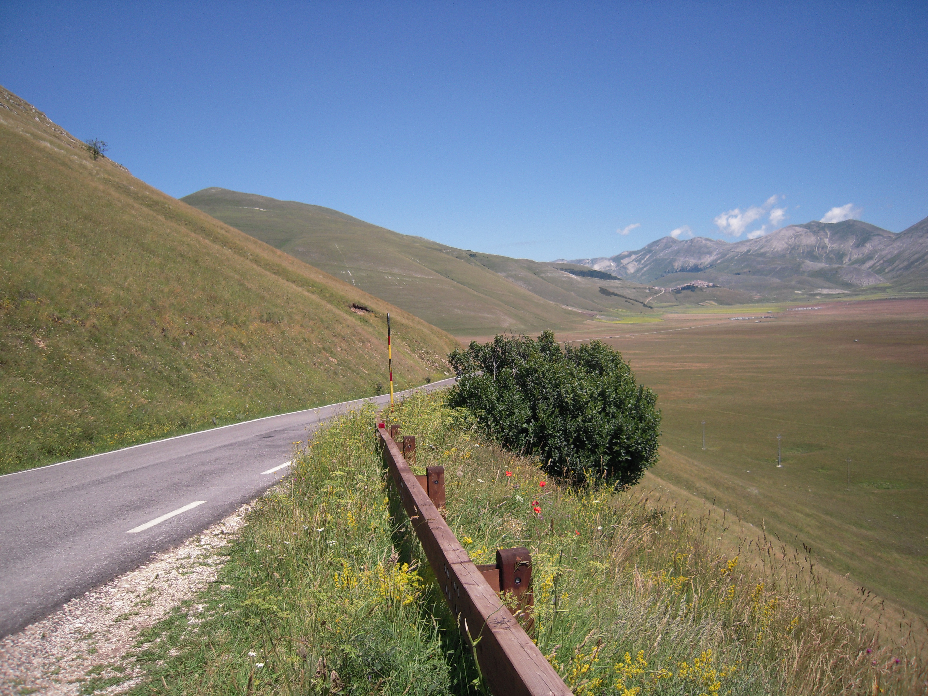 Da Leonessa puntiamo a nord sulla SS 471 verso Cascia e Norcia che passa in uno stretto fondovalle con la strada che nel tratto centrale attraversa delle gole rocciose scavate dal fiume Corno. Da Norcia saliamo sulla vecchia strada del valico di Forca Canapine senza però raggiungerlo perché la nostra meta è la piana di Castelluccio di Norcia. Una lunghissima galleria di fondo valle ha sostituito questa bellissima strada ma ovviamente, un motociclista affronta curve e tornanti e non la galleria!