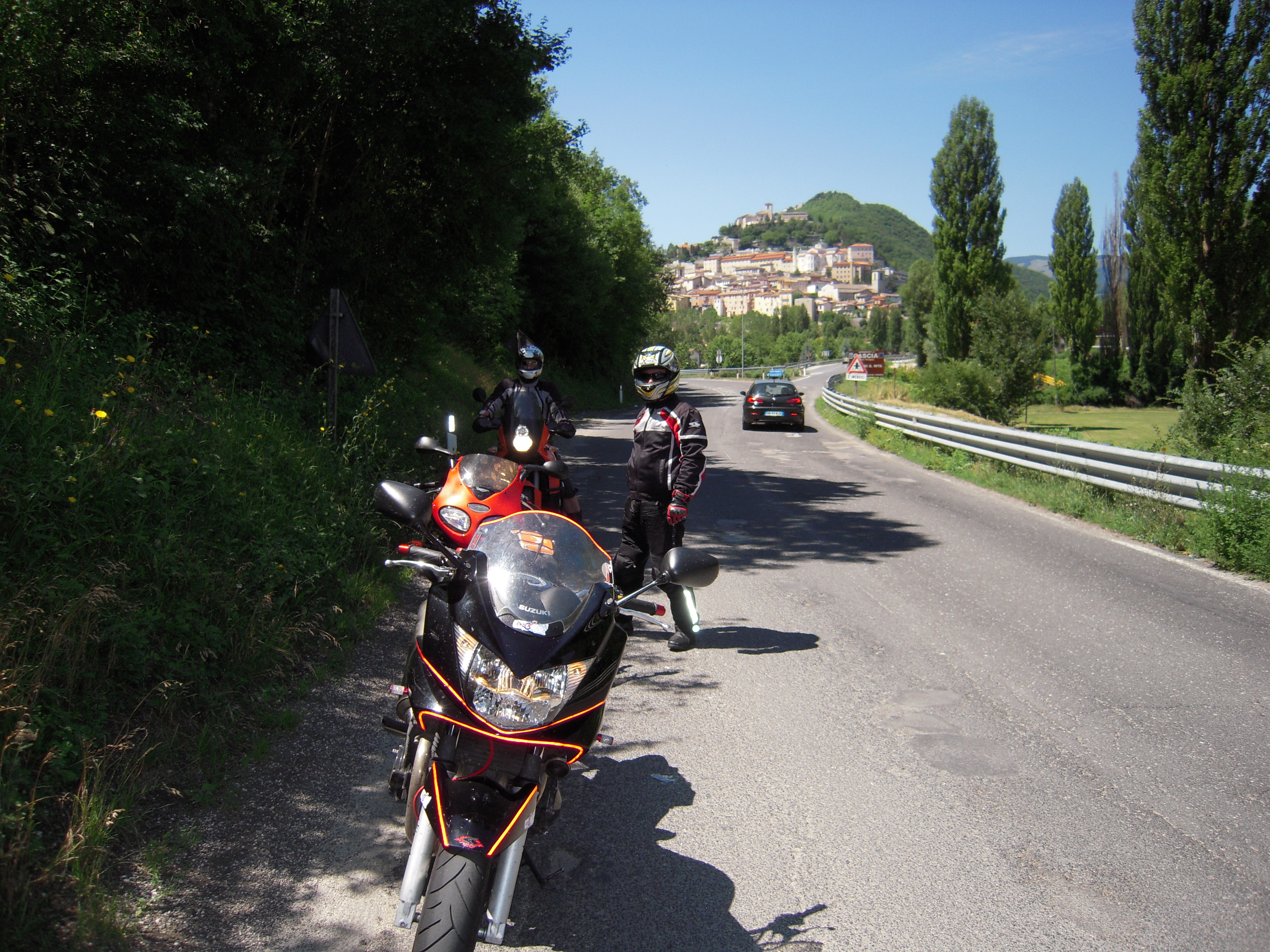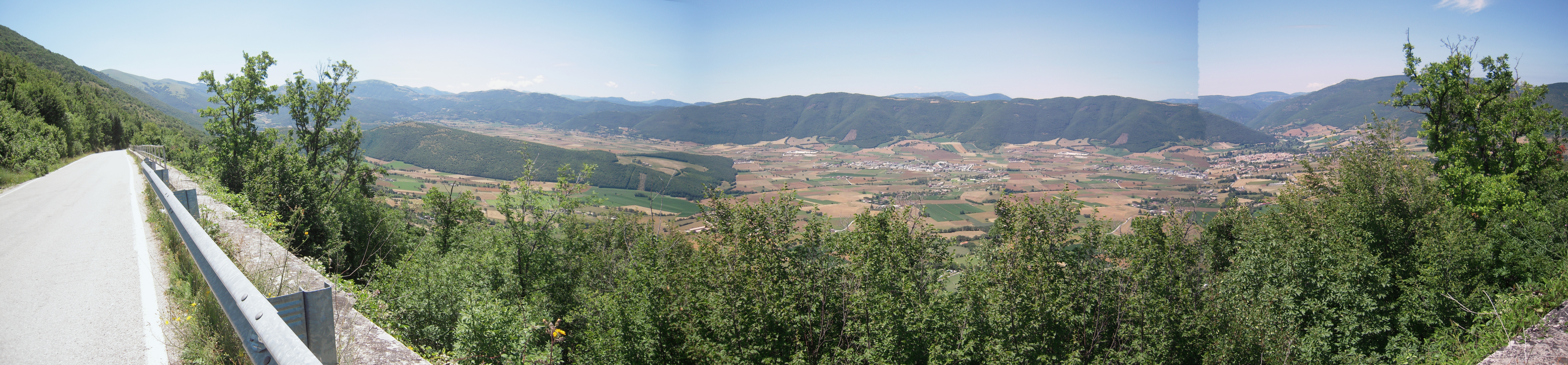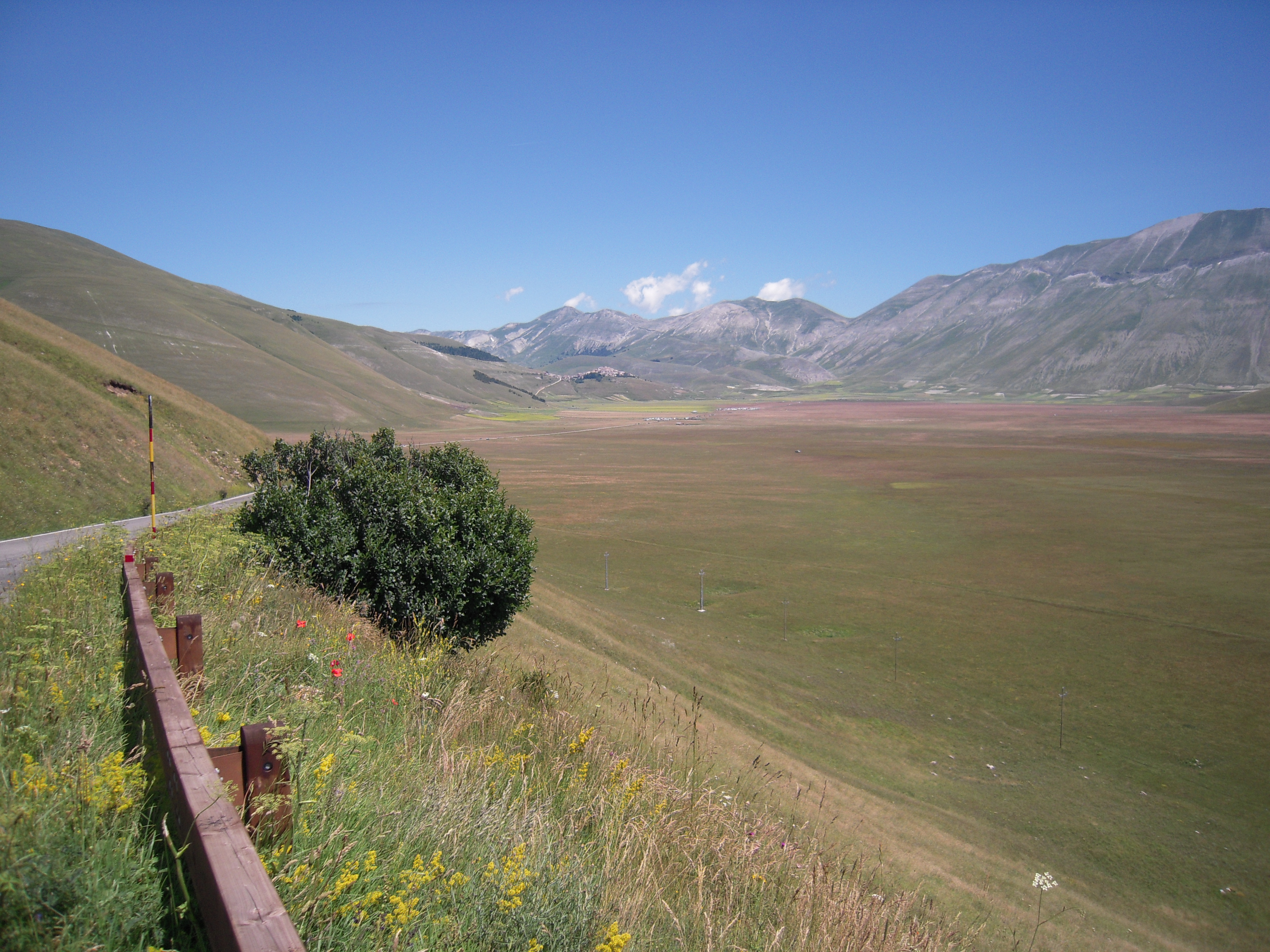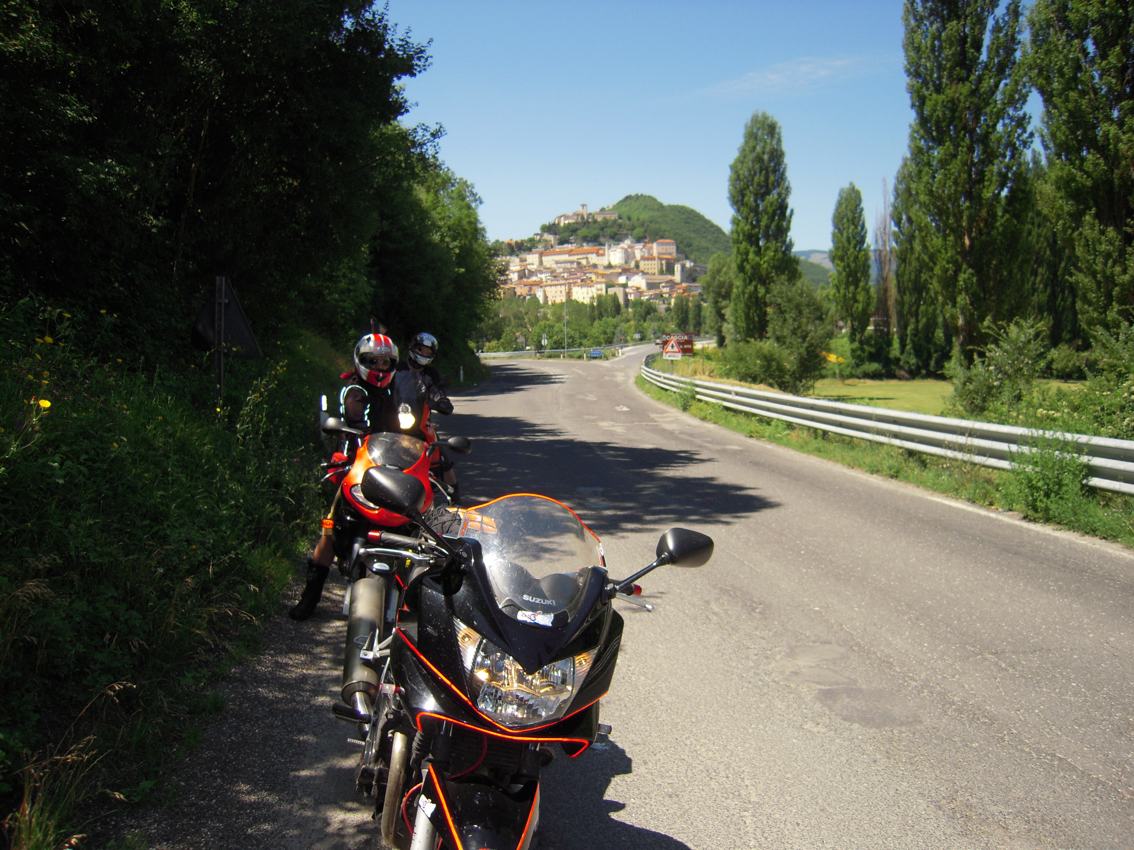 Da Leonessa puntiamo a nord sulla SS 471 verso Cascia e Norcia che passa in uno stretto fondovalle con la strada che nel tratto centrale attraversa delle gole rocciose scavate dal fiume Corno. Da Norcia saliamo sulla vecchia strada del valico di Forca Canapine senza però raggiungerlo perché la nostra meta è la piana di Castelluccio di Norcia. Una lunghissima galleria di fondo valle ha sostituito questa bellissima strada ma ovviamente, un motociclista affronta curve e tornanti e non la galleria!