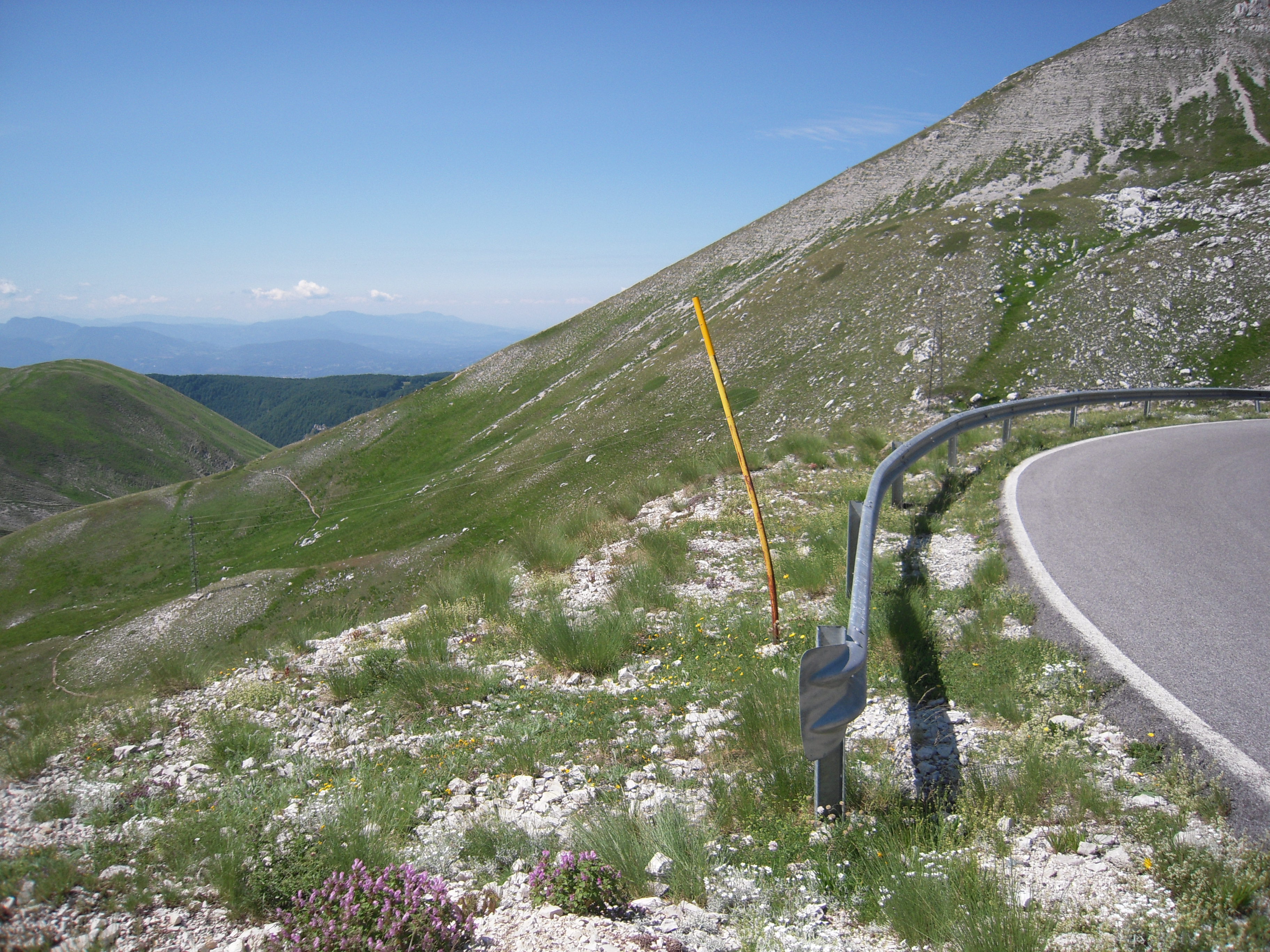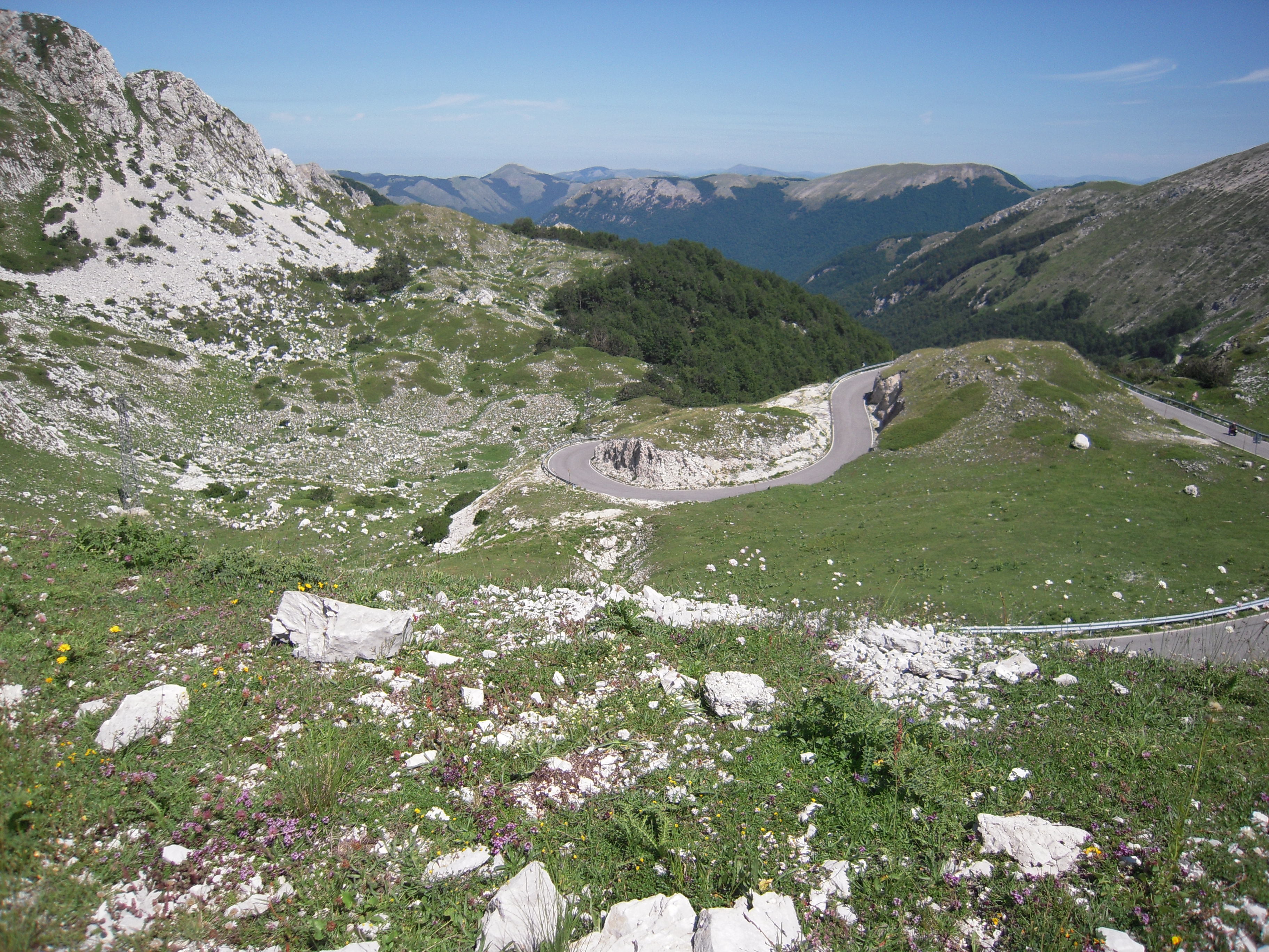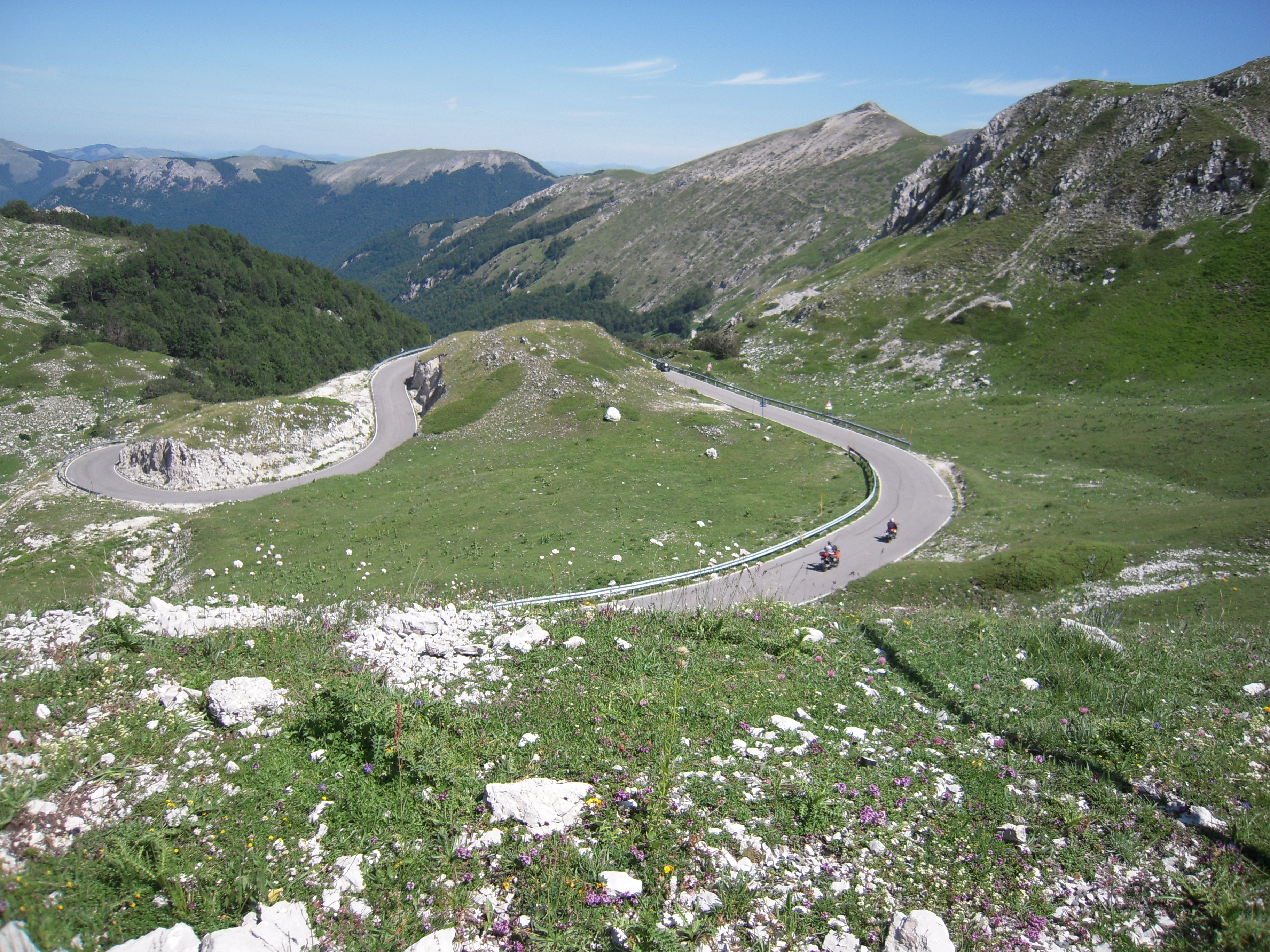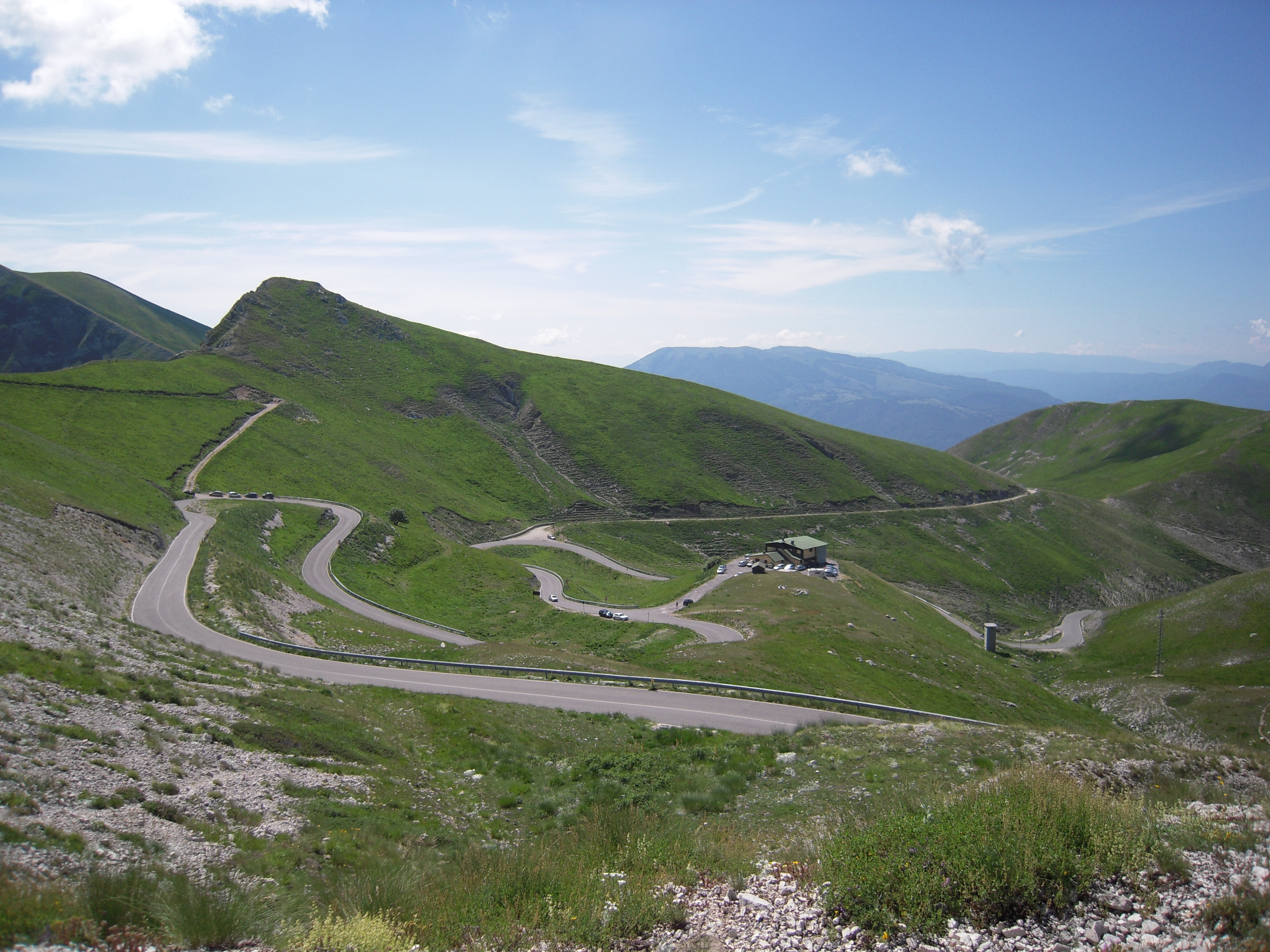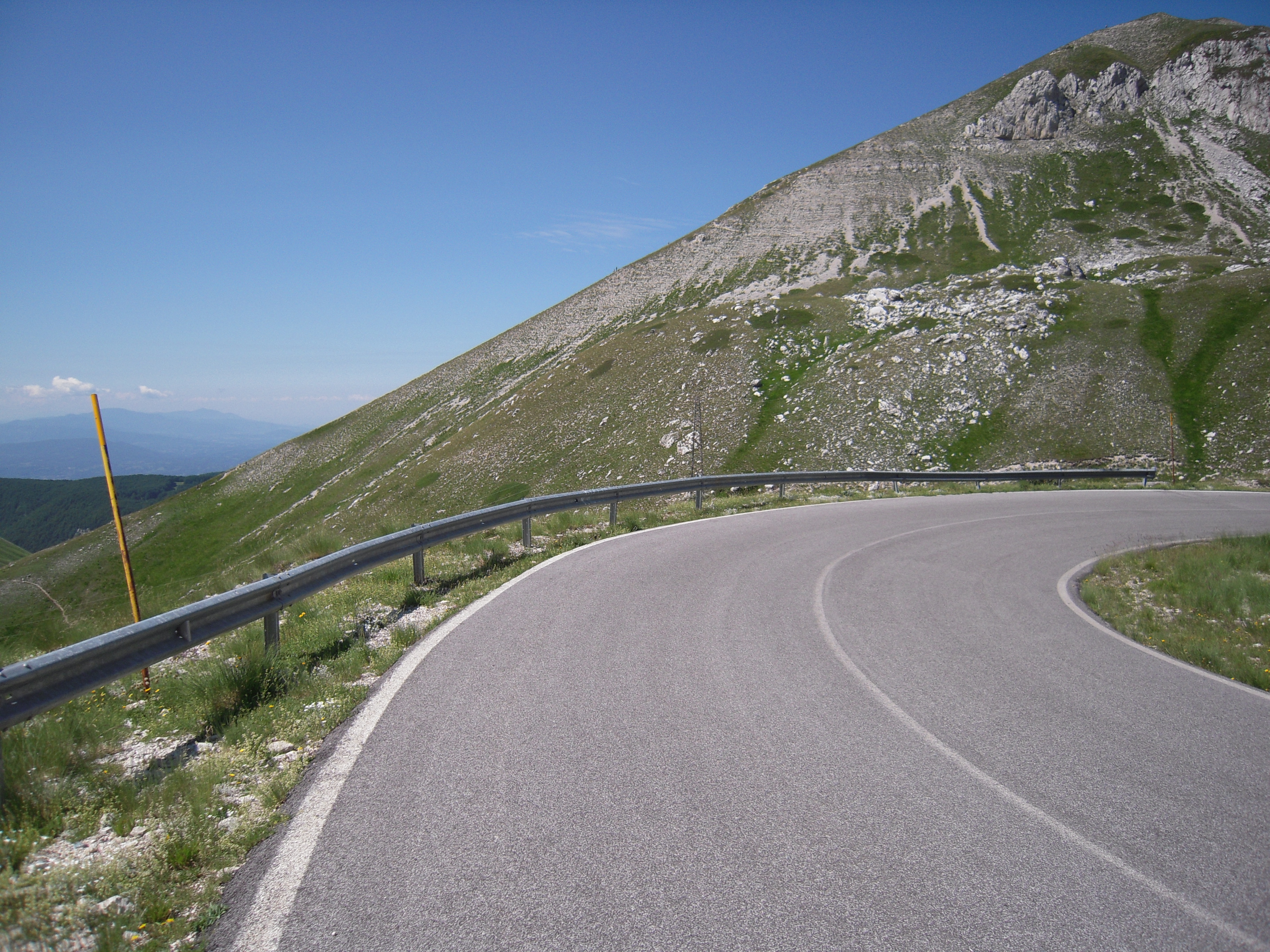 Oltrepassato il nucleo industriale di Rieti la salita al Monte Terminillo è divertentissima con i suoi passaggi nel bosco ed i tornanti che rapidamente portano fino a Pian de’ Valli. Da lì in poi con calma si godono i paesaggi che portano in cima al valico di Leonessa: la sosta al rifugio del CAI almeno per un caffè è quasi obbligatoria. Non dimenticherò mai l’emozione del maggio 2006 quando trovammo la strada contornata da muri di neve alti quasi 2 metri e dovemmo tornare indietro perché il valico era ancora chiuso!
