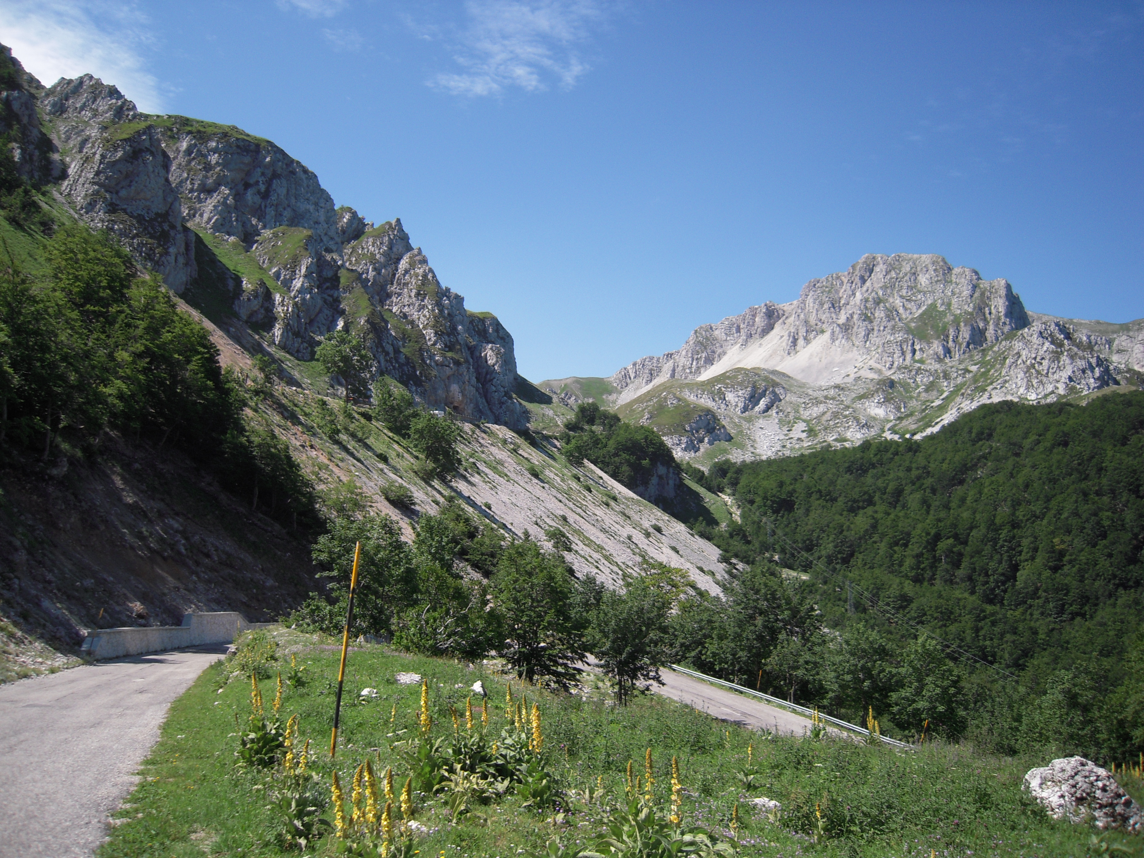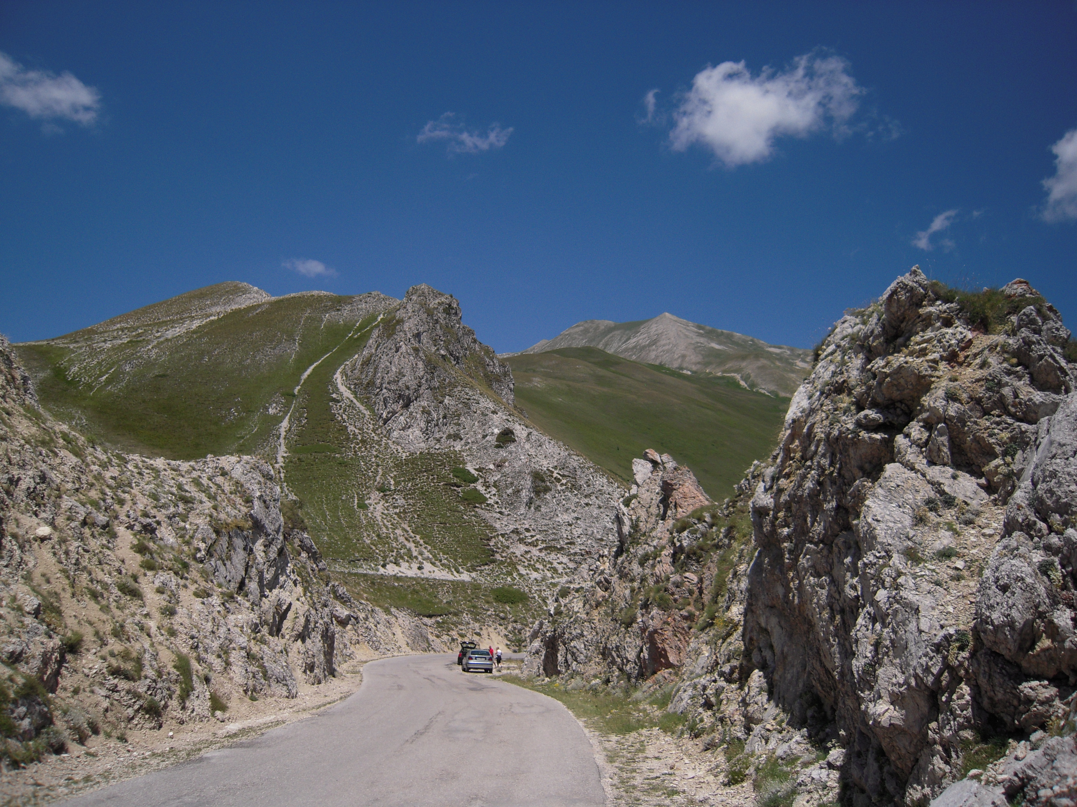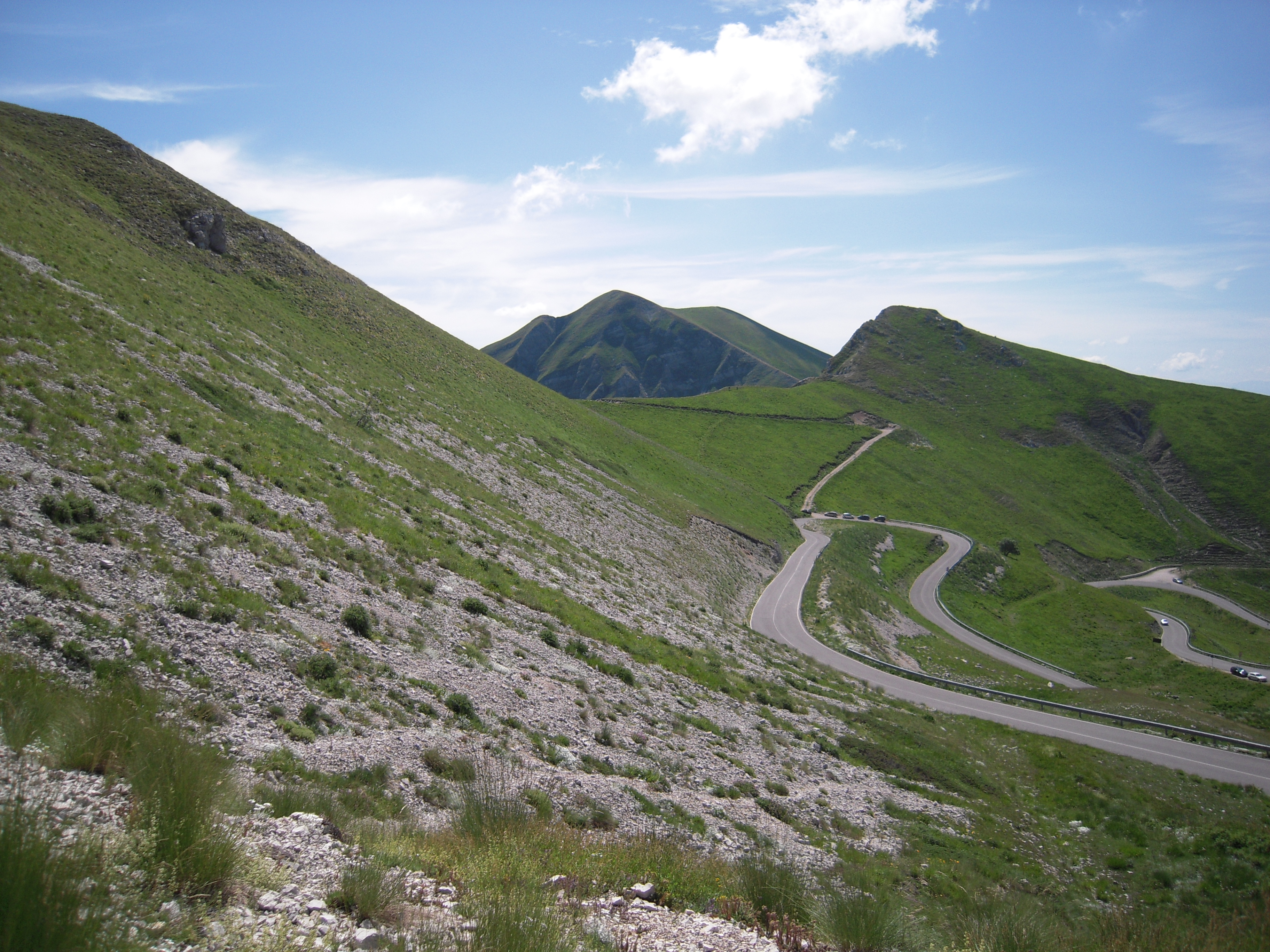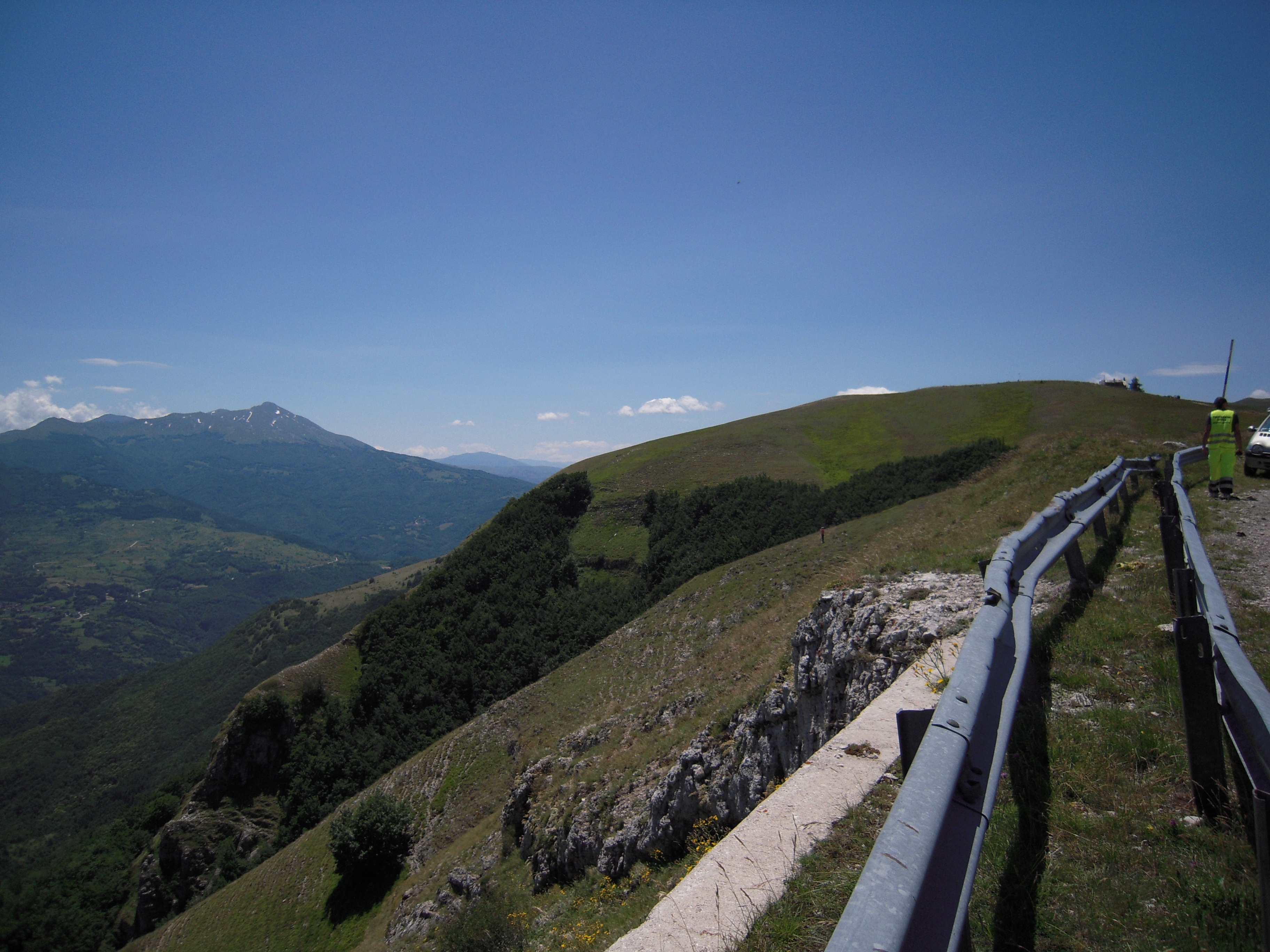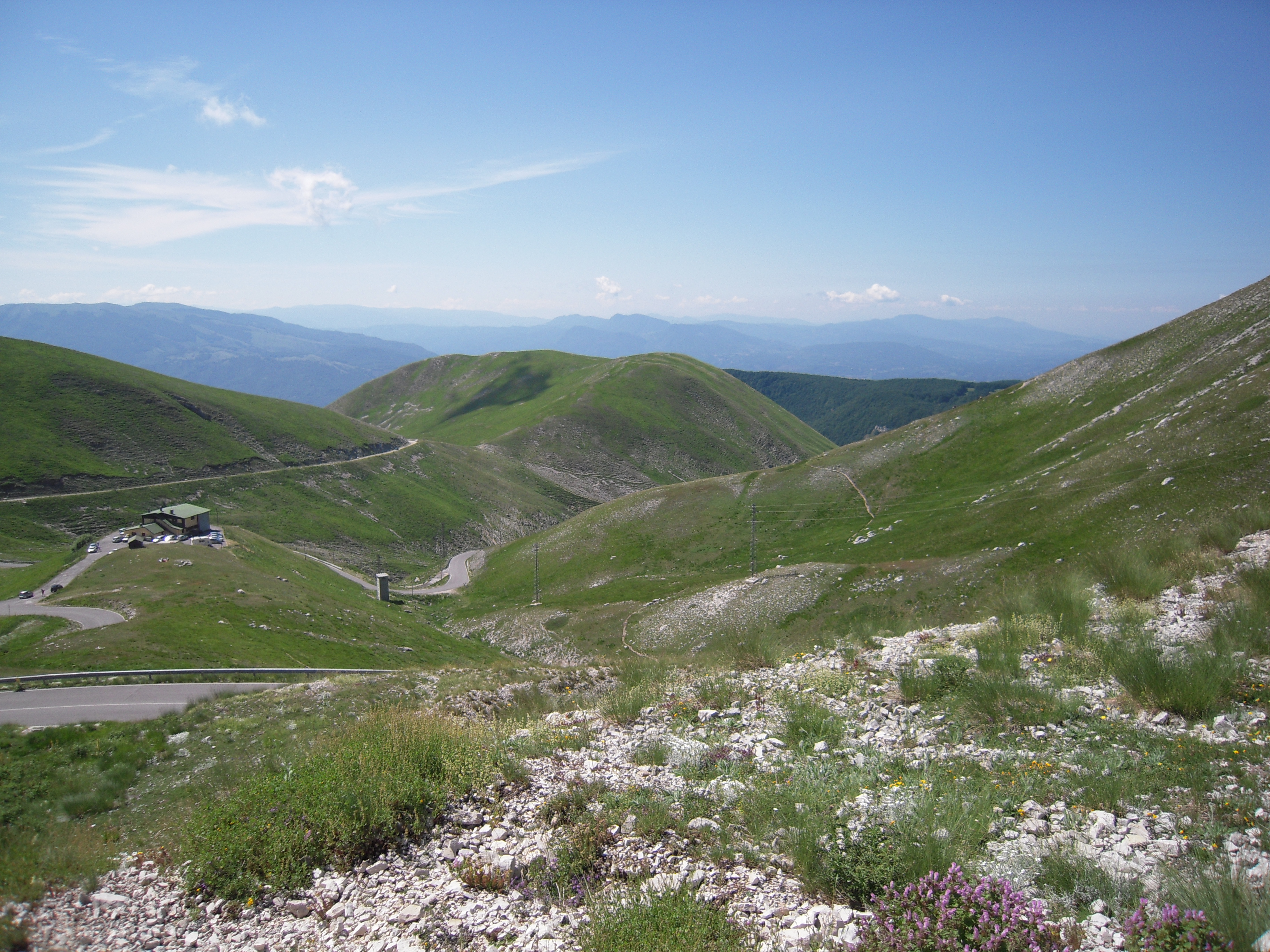 Oltrepassato il nucleo industriale di Rieti la salita al Monte Terminillo è divertentissima con i suoi passaggi nel bosco ed i tornanti che rapidamente portano fino a Pian de’ Valli. Da lì in poi con calma si godono i paesaggi che portano in cima al valico di Leonessa: la sosta al rifugio del CAI almeno per un caffè è quasi obbligatoria. Non dimenticherò mai l’emozione del maggio 2006 quando trovammo la strada contornata da muri di neve alti quasi 2 metri e dovemmo tornare indietro perché il valico era ancora chiuso!
