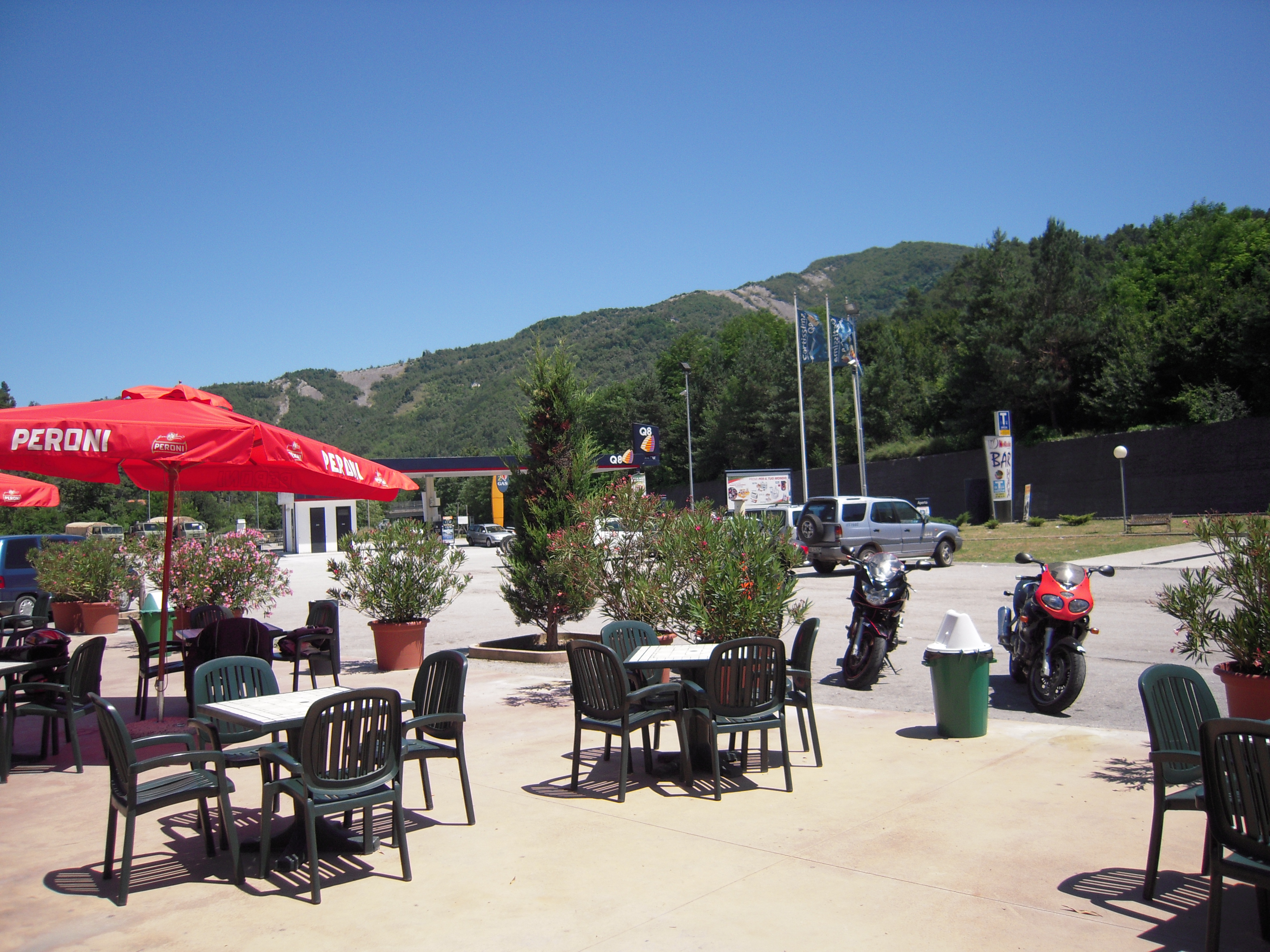 Passate le gole del Tronto ci fermiamo a mangiare qualcosa nel bar di una stazione di servizio, per fortuna non fa molto caldo.