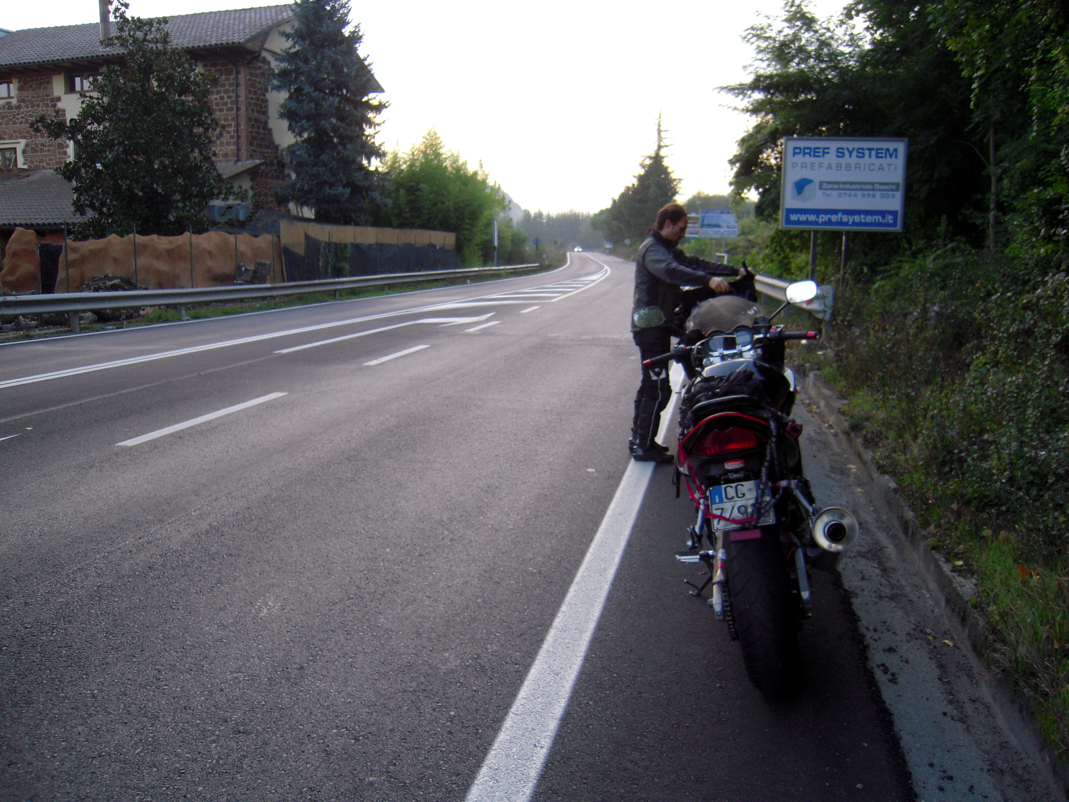 E così con Barnaba organizziamo questa bella uscita. Lasciamo subito l’A1 ad Orvieto scalo perché l’intenzione è quella di scaldare le gomme sulla cosiddetta 100 curve del lago di Corbara: sarà l’umido ma il percorso non mi entusiasma particolarmente oggi mentre a quanto pare Barnaba si è divertito parecchio.