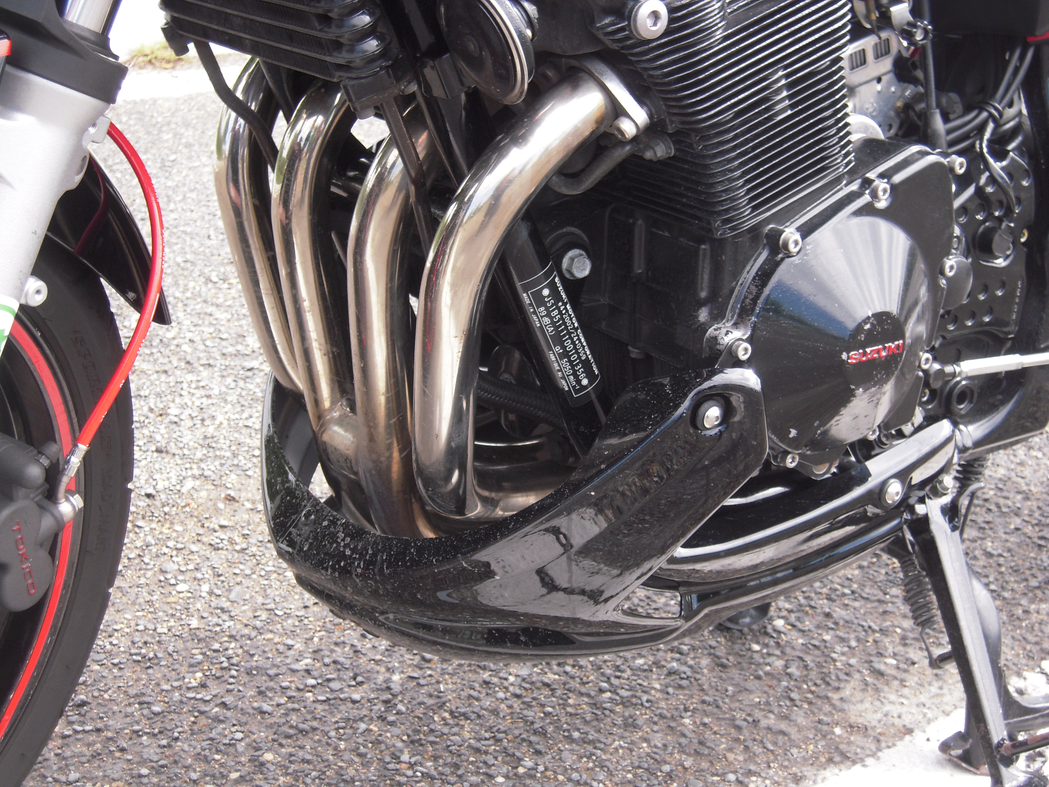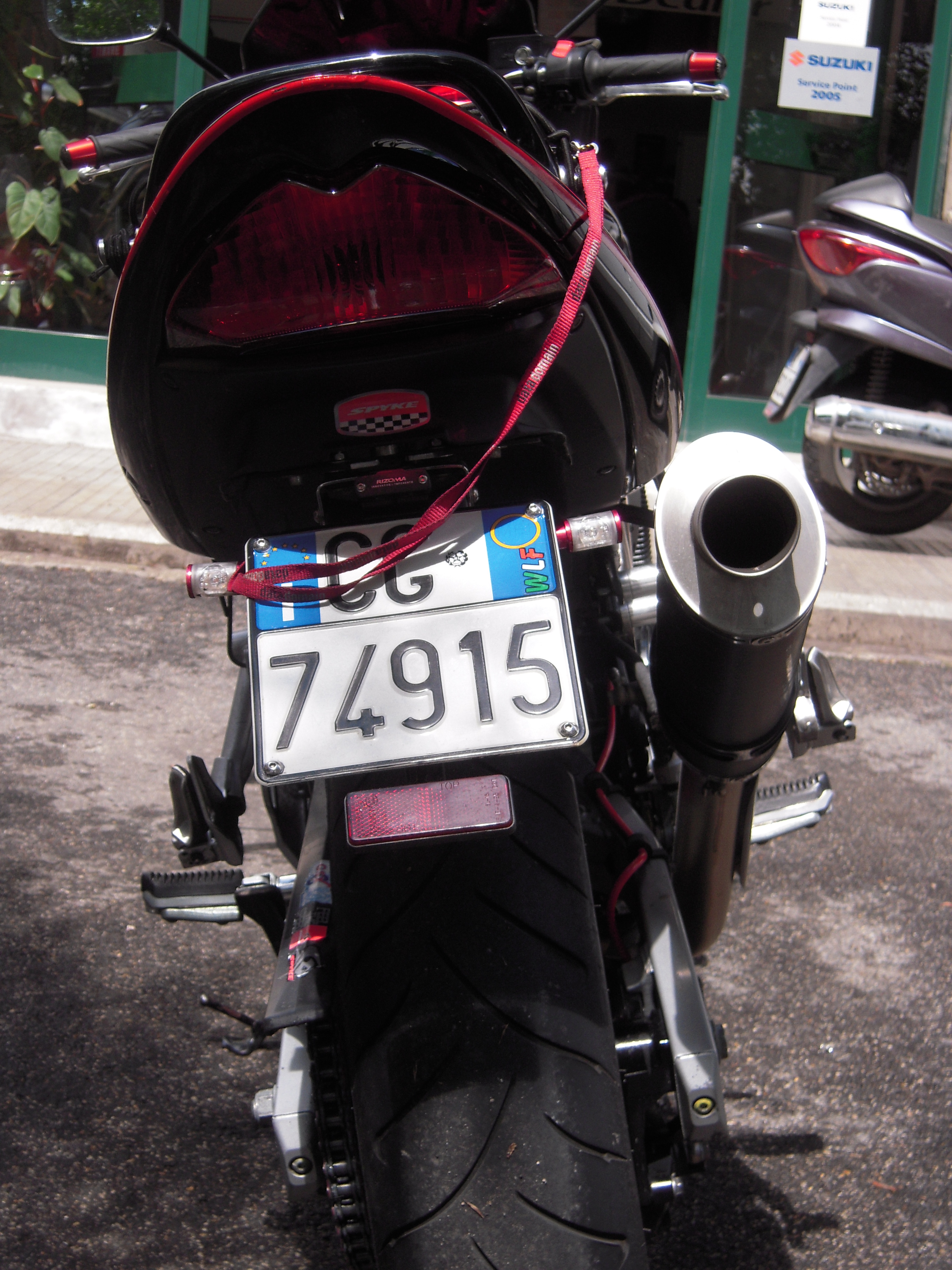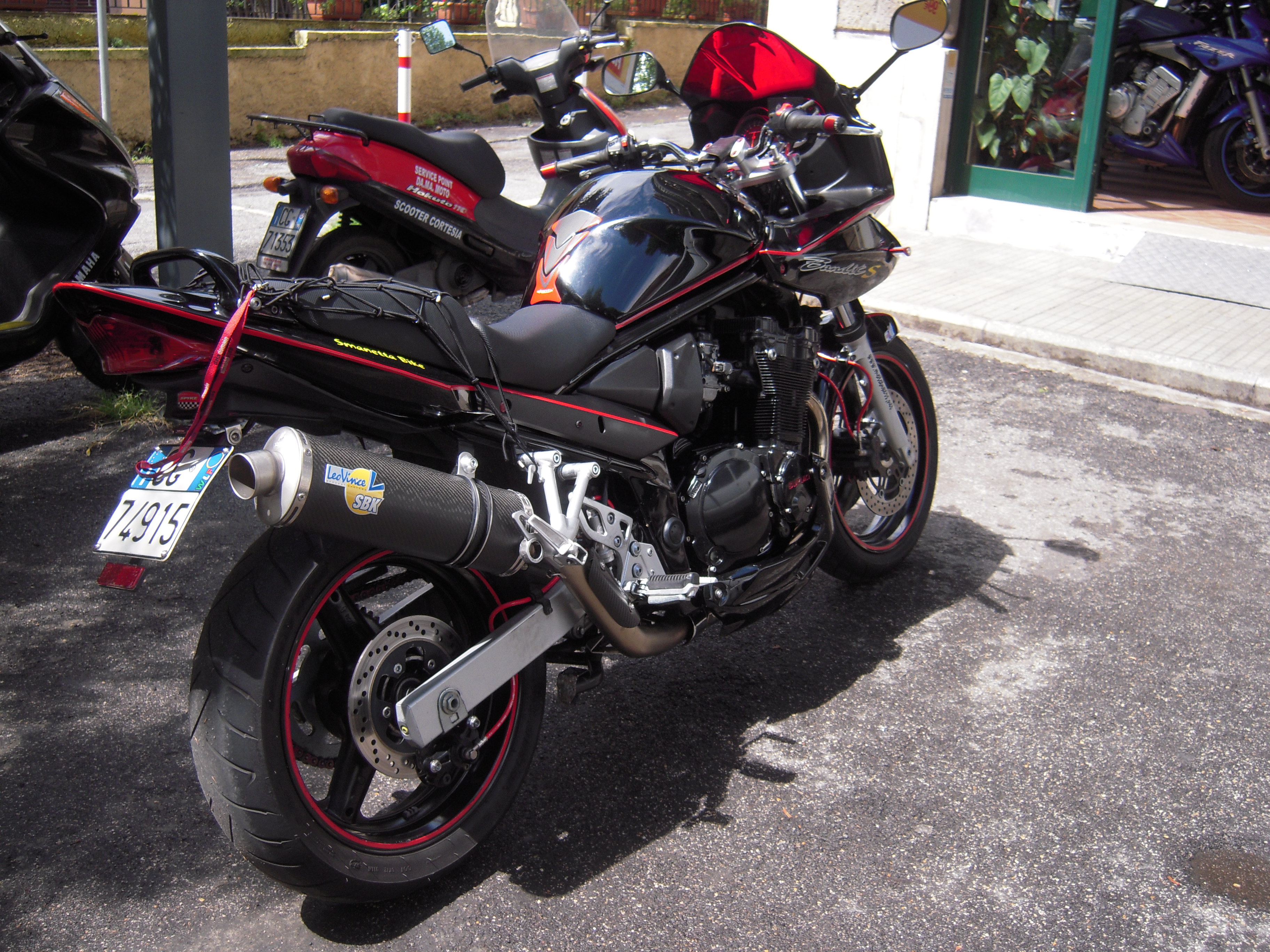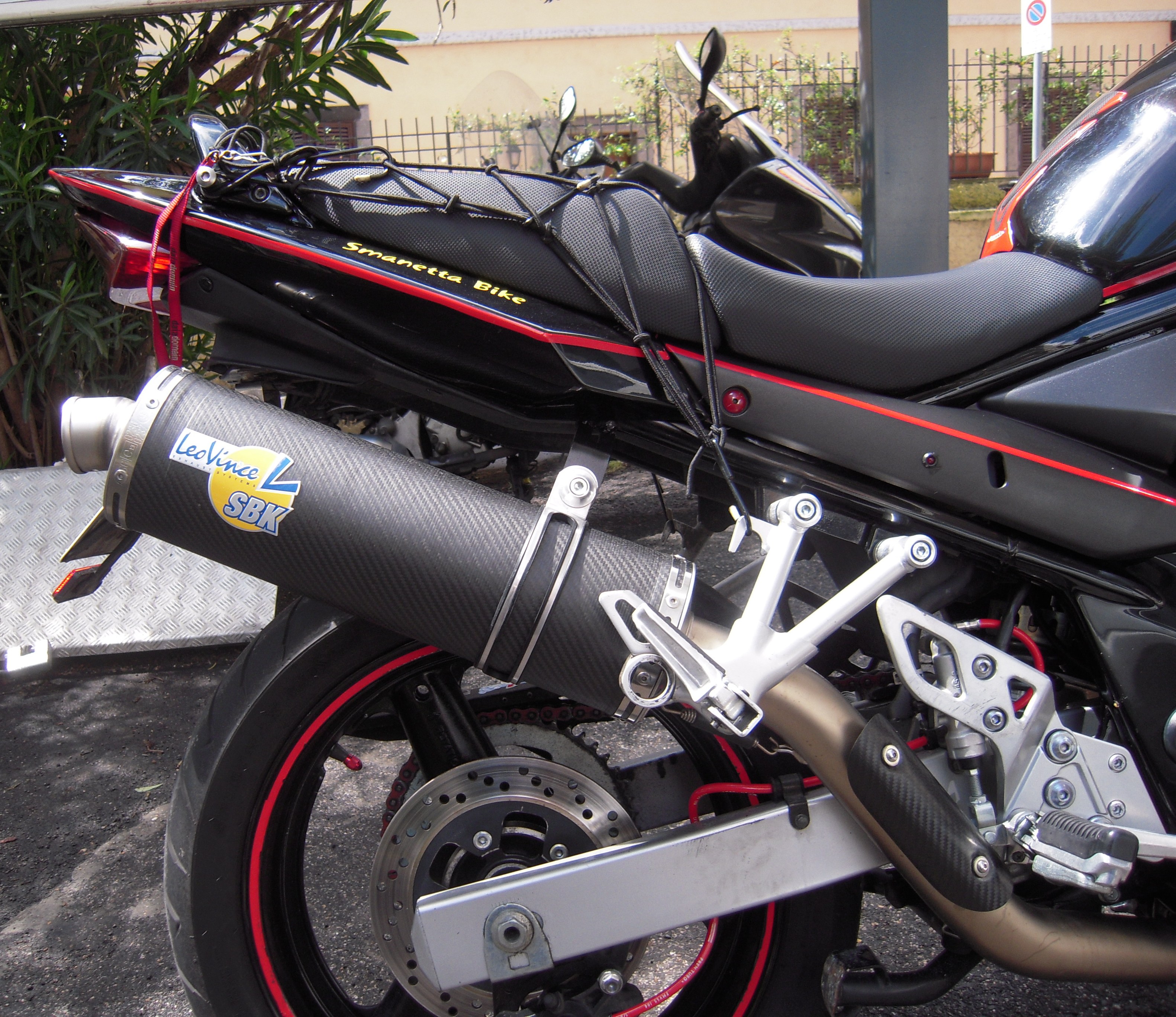 Scarico Leovince SBK in carbonio: realizzato per la Bandit modifica sostanzialmente l’estetica della Bandita eliminando il trombone laterale piuttosto antiestetico a vedersi e soprattutto offrendo un potenziamento complessivo delle prestazioni grazie alla maggior fluidità in erogazione. E che sound pensando soprattutto agli scoppiettii in freno motore od agli spari di ritorno in certe condizioni! Complimenti al meccanico per l’attacco che ha realizzato saldando una staffa sotto la coda!