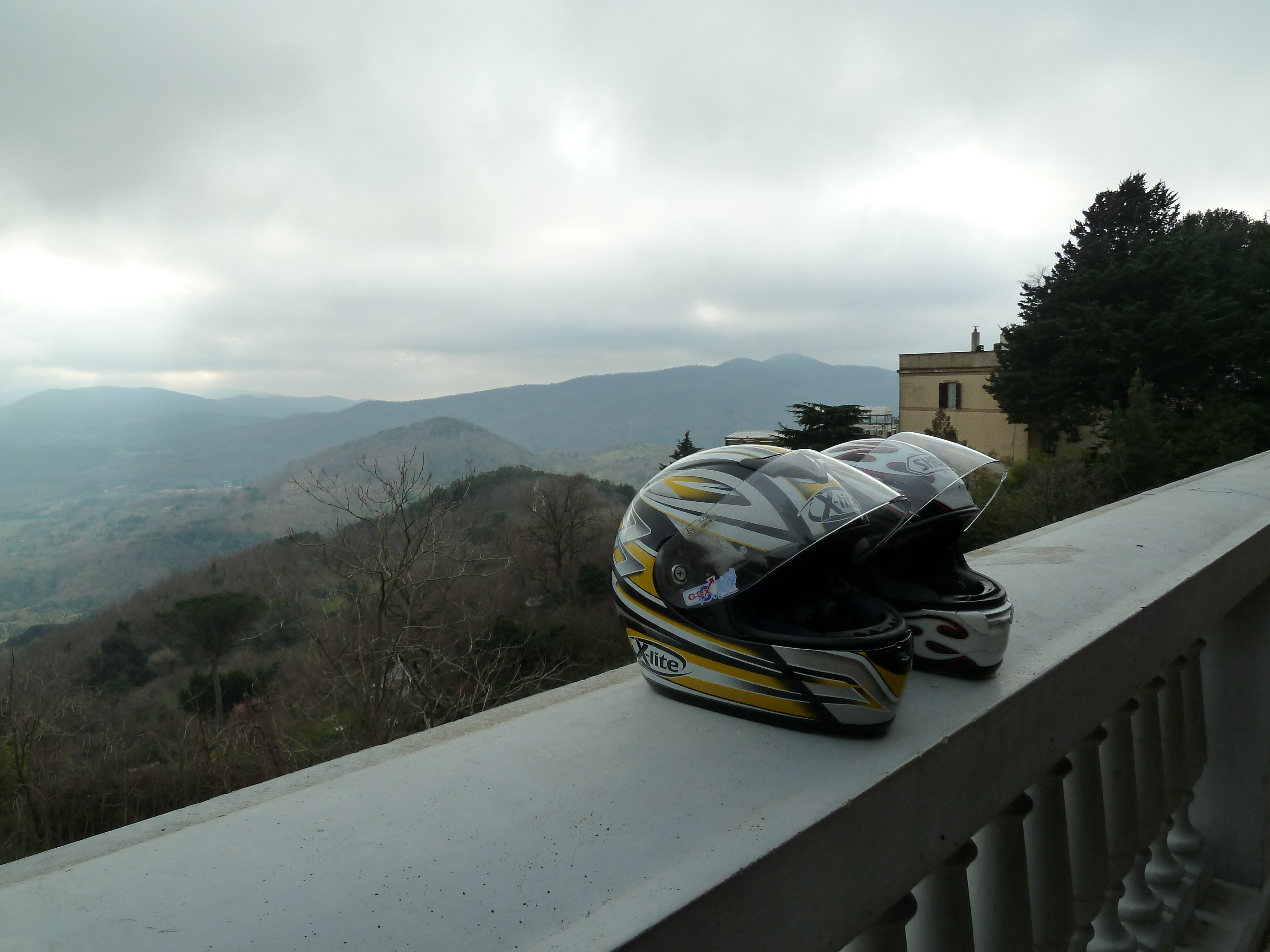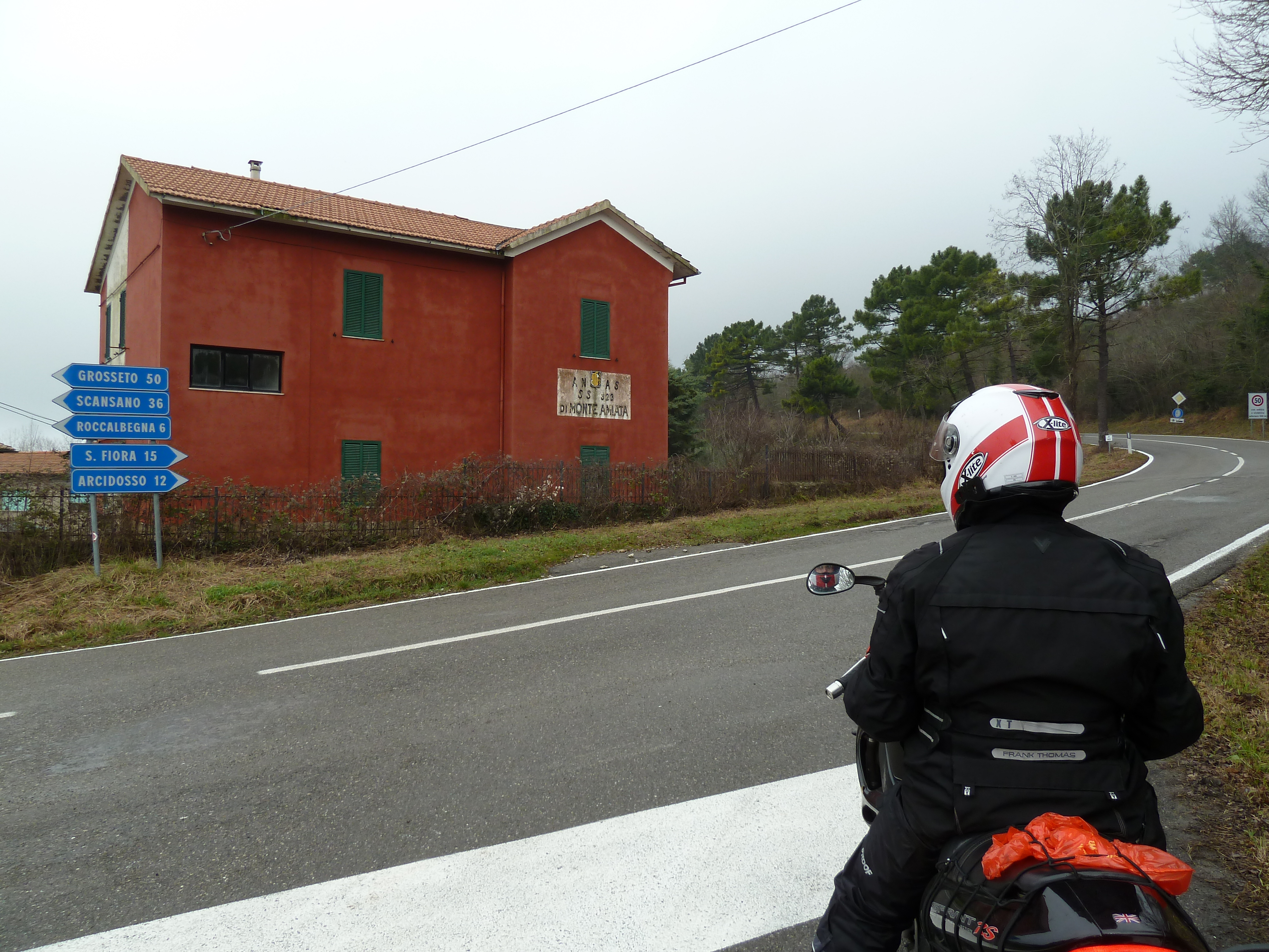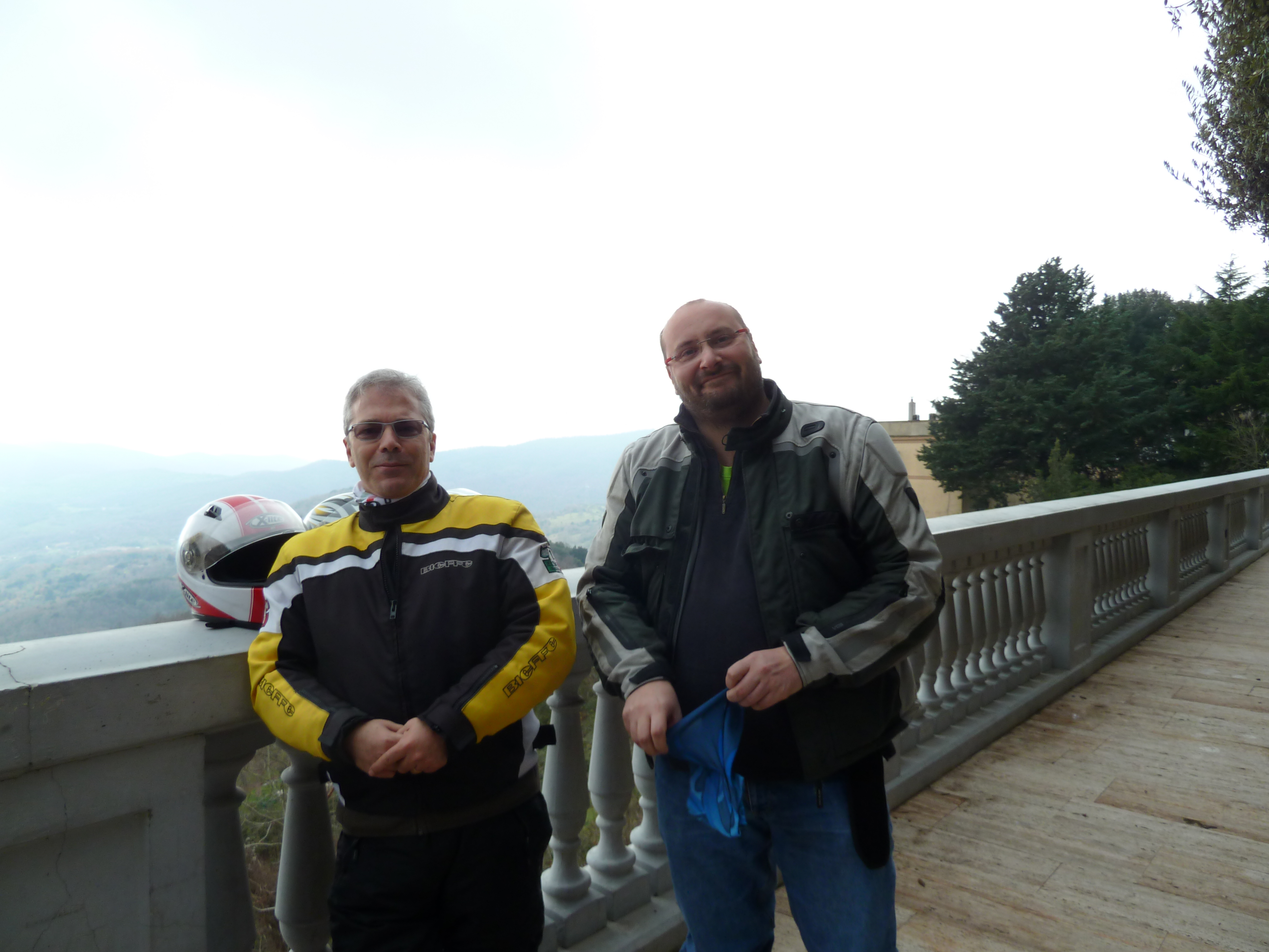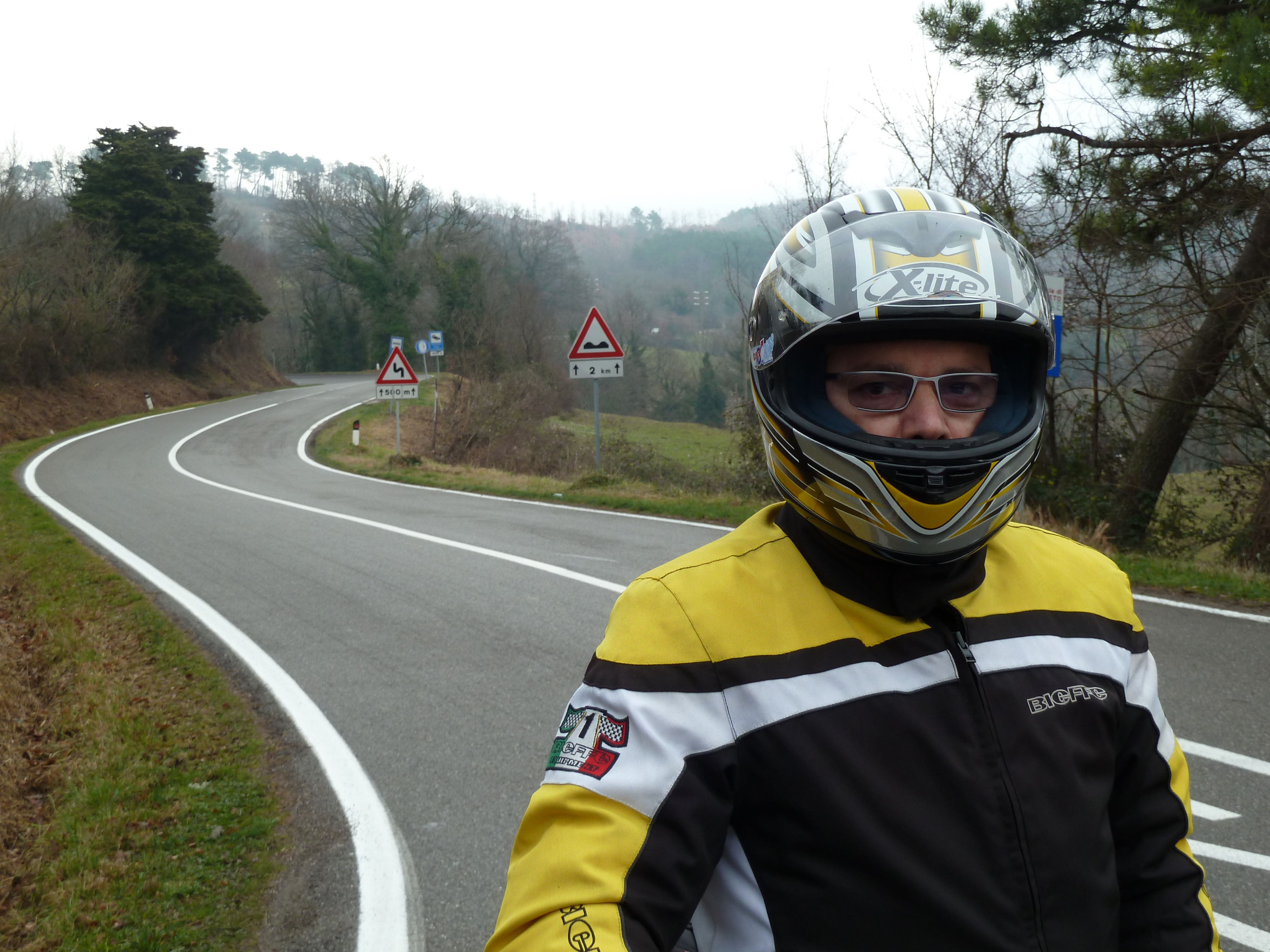 Ci avviamo verso nord e raggiungiamo rapidamente Santa Severa di A12 e una volta tanto non devo fare decine di km per arrivare all’appuntamento! Da lì saliamo su una delle strade più contestate dai motociclisti romani: quella che sale a Tolfa. Chi la trova entusiasmante e chi la trova, come Alberto, pessima e pericolosa. Per me è una via di mezzo, ha qualche passaggio interessante, il paesaggio è discreto ma per lo più è fatta di strada troppo stretta e troppo costellata di mucche e dei loro escrementi che in curva non sono affatto…simpatici. Inoltre da un po’ è spesso sporca di fango portata dalle ruote dei numerosi fuori strada che da quelle parti hanno un circuito loro dedicato.