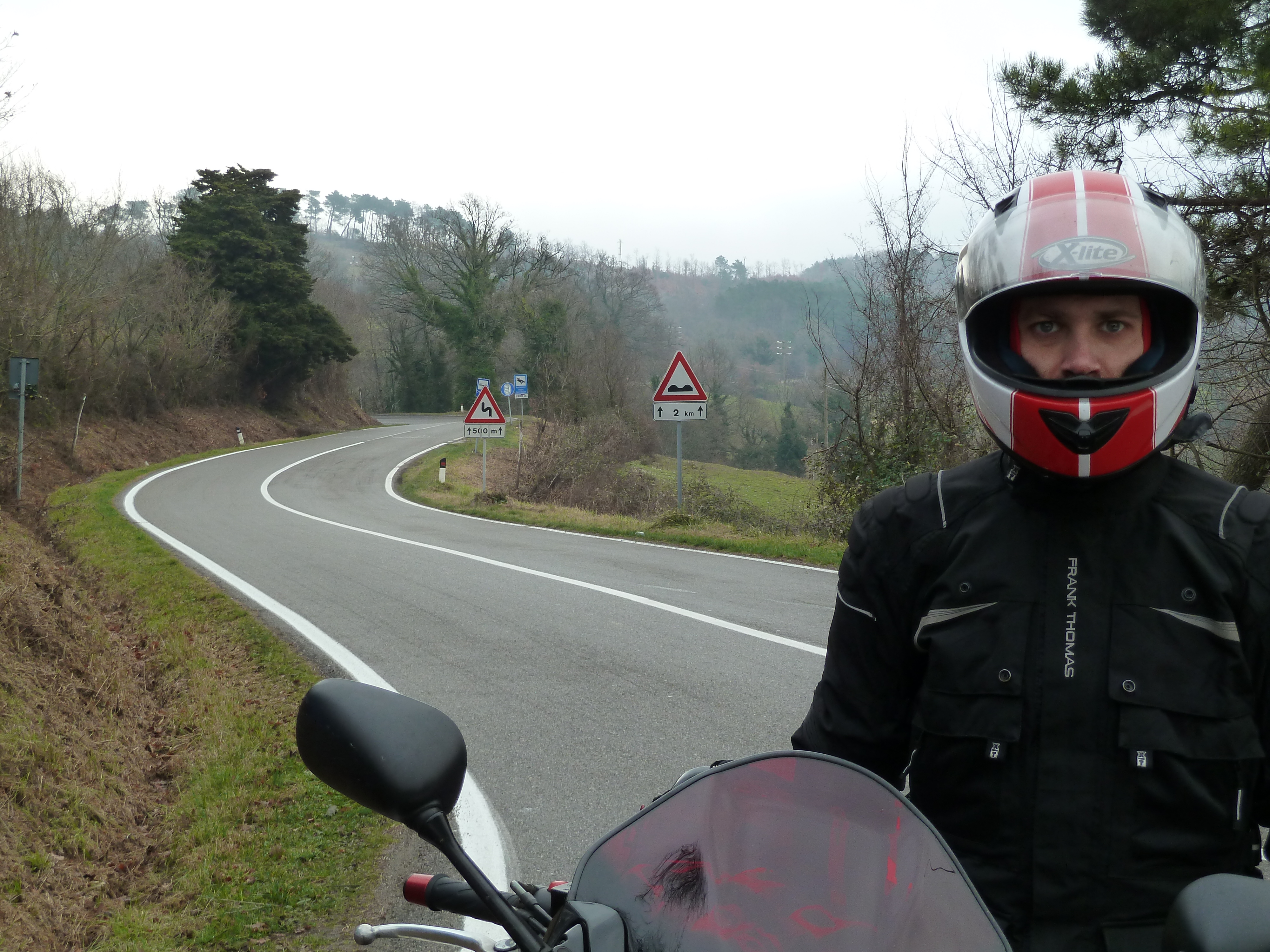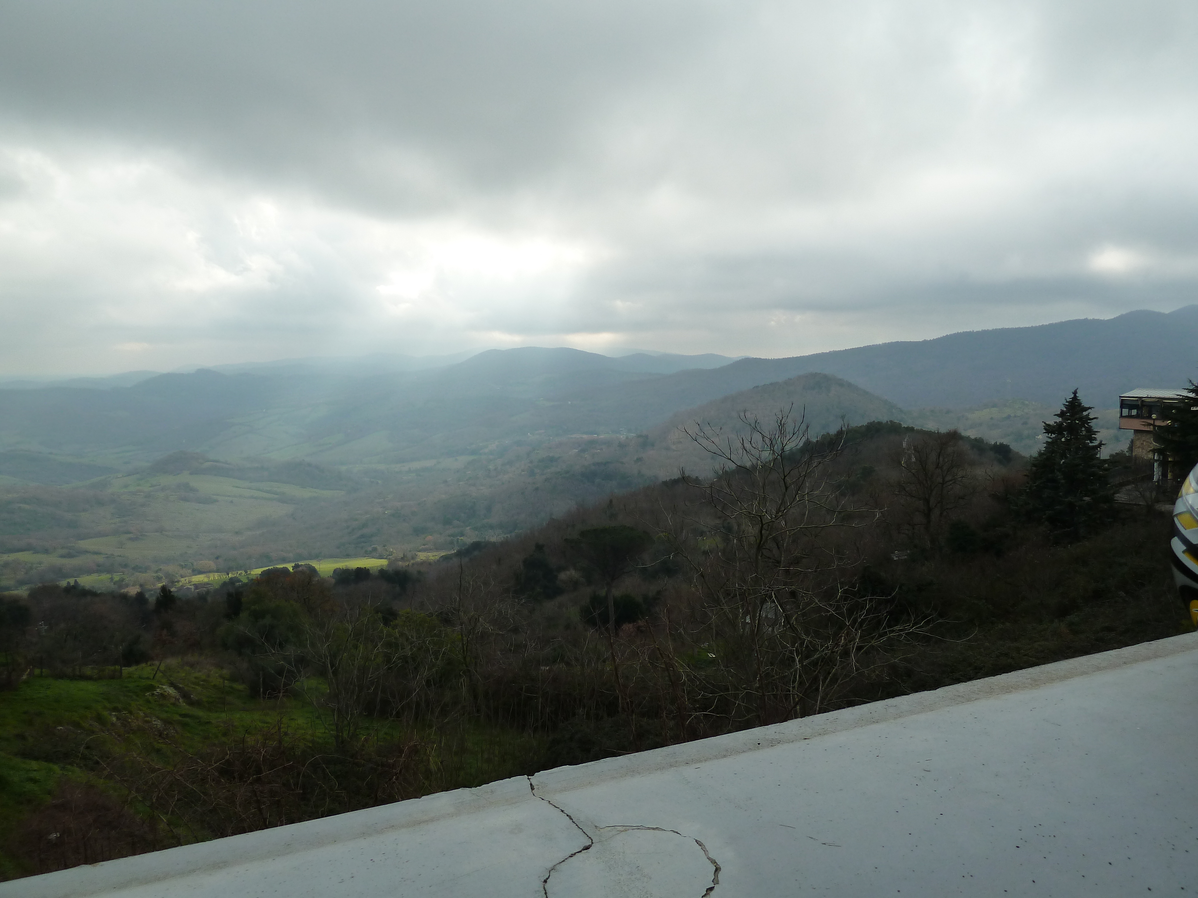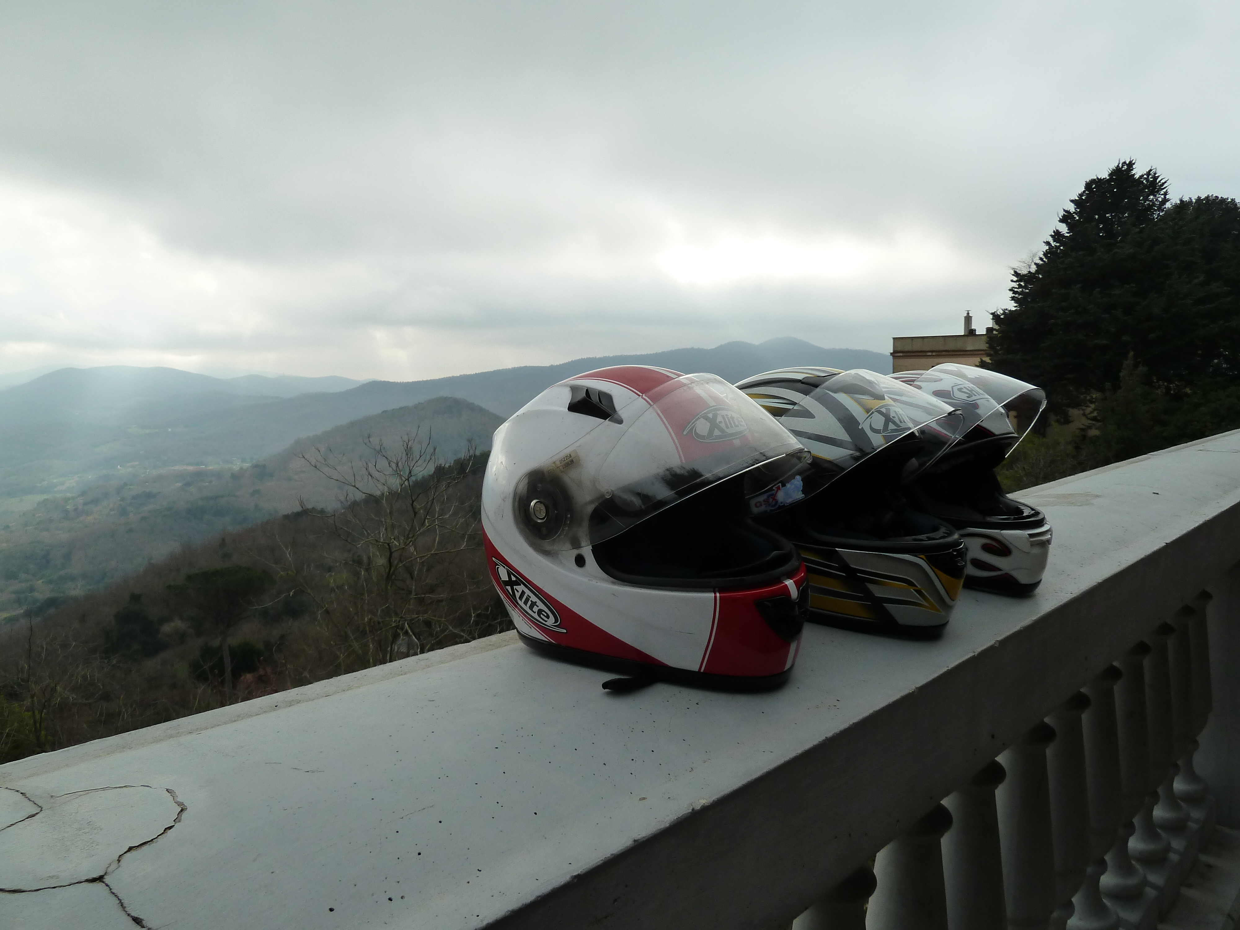 Ci avviamo verso nord e raggiungiamo rapidamente Santa Severa di A12 e una volta tanto non devo fare decine di km per arrivare all’appuntamento! Da lì saliamo su una delle strade più contestate dai motociclisti romani: quella che sale a Tolfa. Chi la trova entusiasmante e chi la trova, come Alberto, pessima e pericolosa. Per me è una via di mezzo, ha qualche passaggio interessante, il paesaggio è discreto ma per lo più è fatta di strada troppo stretta e troppo costellata di mucche e dei loro escrementi che in curva non sono affatto…simpatici. Inoltre da un po’ è spesso sporca di fango portata dalle ruote dei numerosi fuori strada che da quelle parti hanno un circuito loro dedicato.