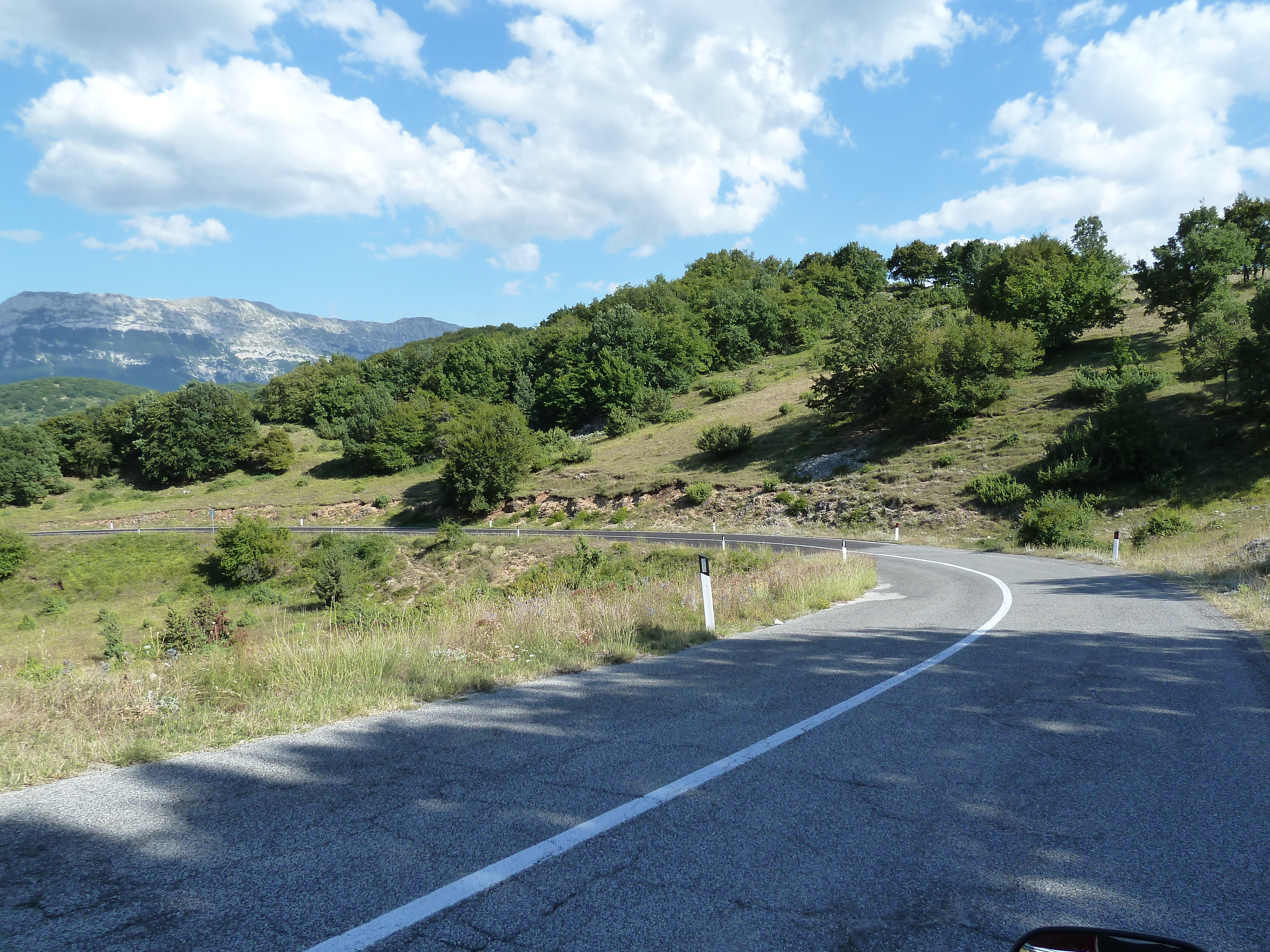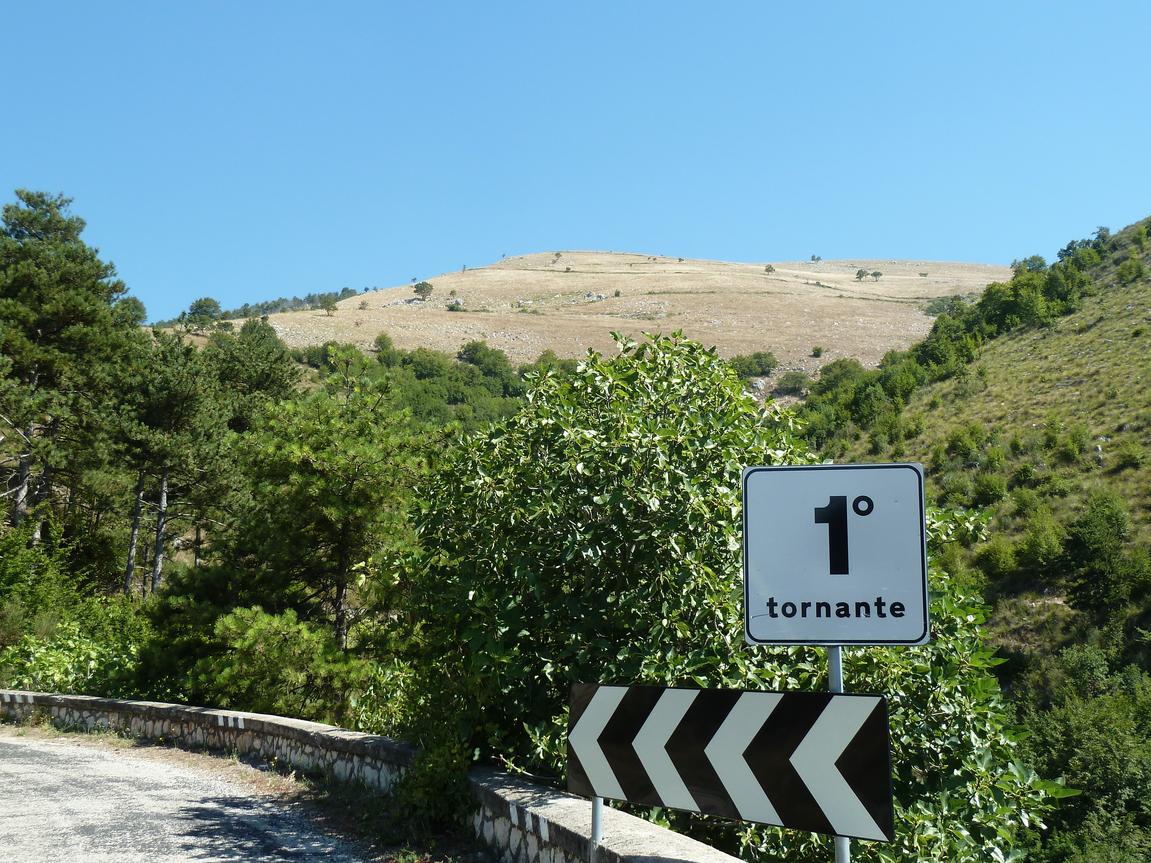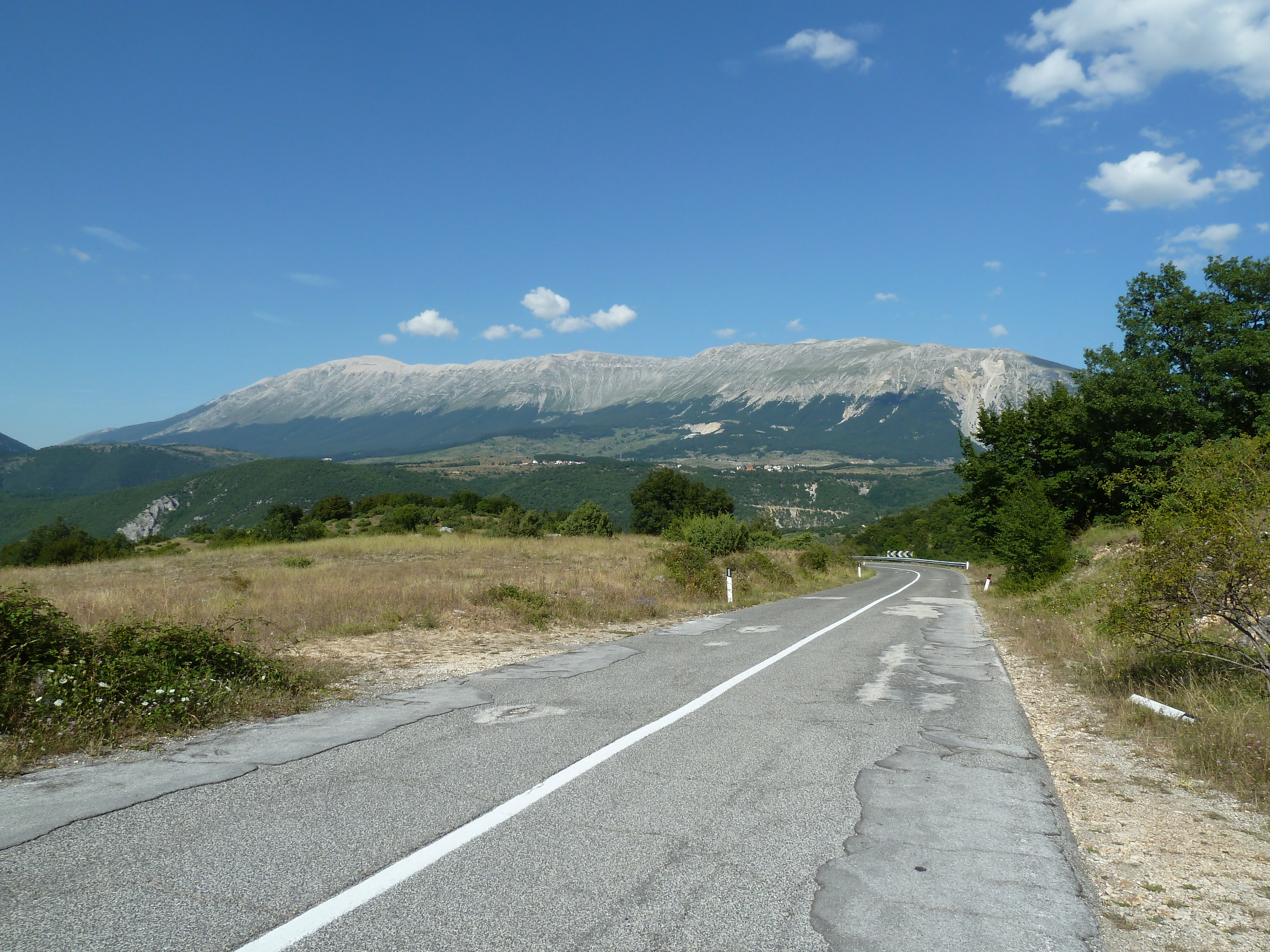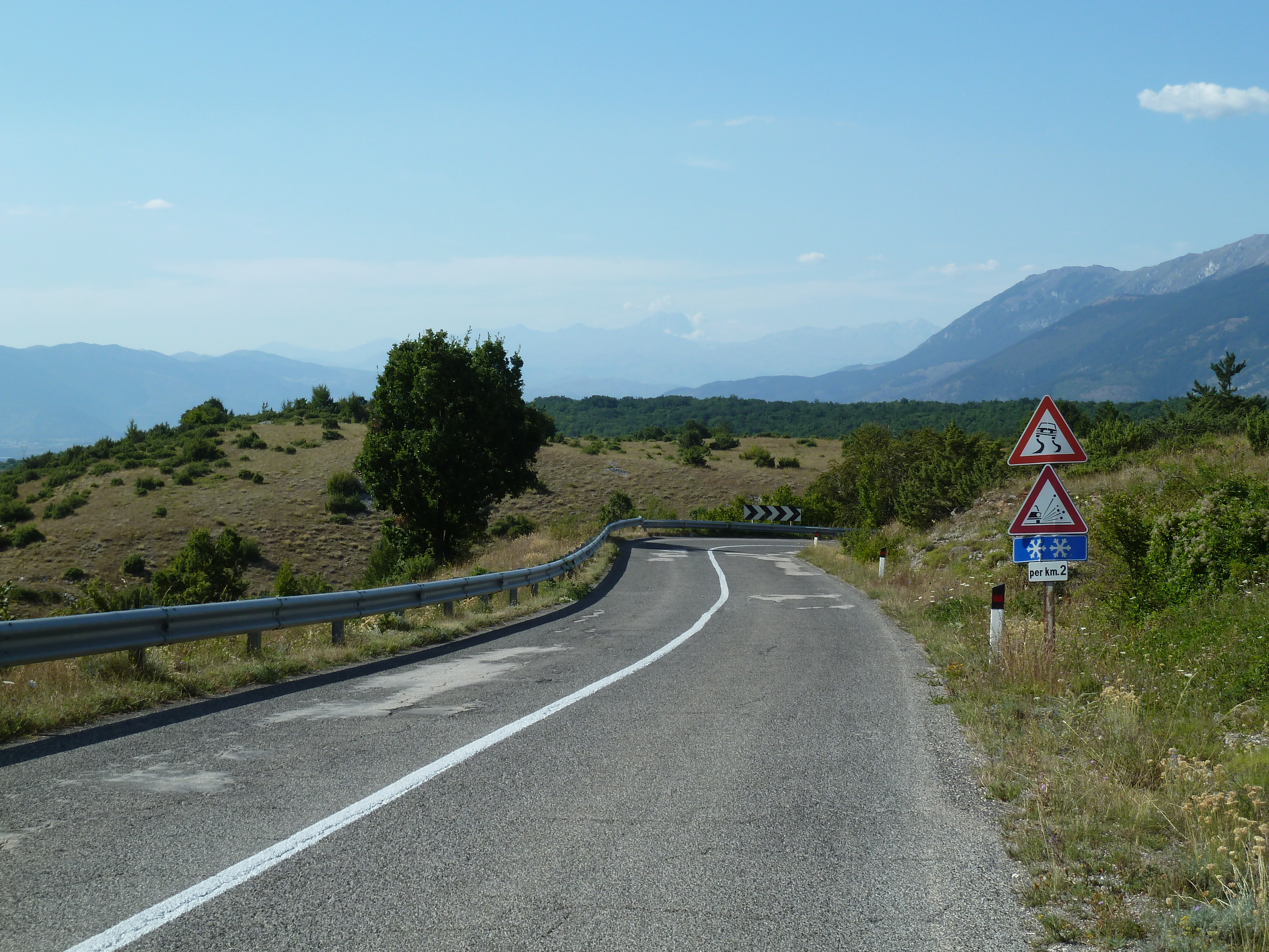 Traversato tutta la Piana delle Cinque Miglia sono praticamente a Cansano da dove salgo per Campo di Giove deciso a salire verso Passo San Leonardo, anche qui non vado da un bel pezzo e ritrovare certe strade mi fa molto piacere. La SS 487 comunque dopo il passo è sempre piuttosto malconcia e va percorsa con calma godendosi i contrafforti della Maiella che da questo lato sembra un grosso collinone brullo e biancastro.