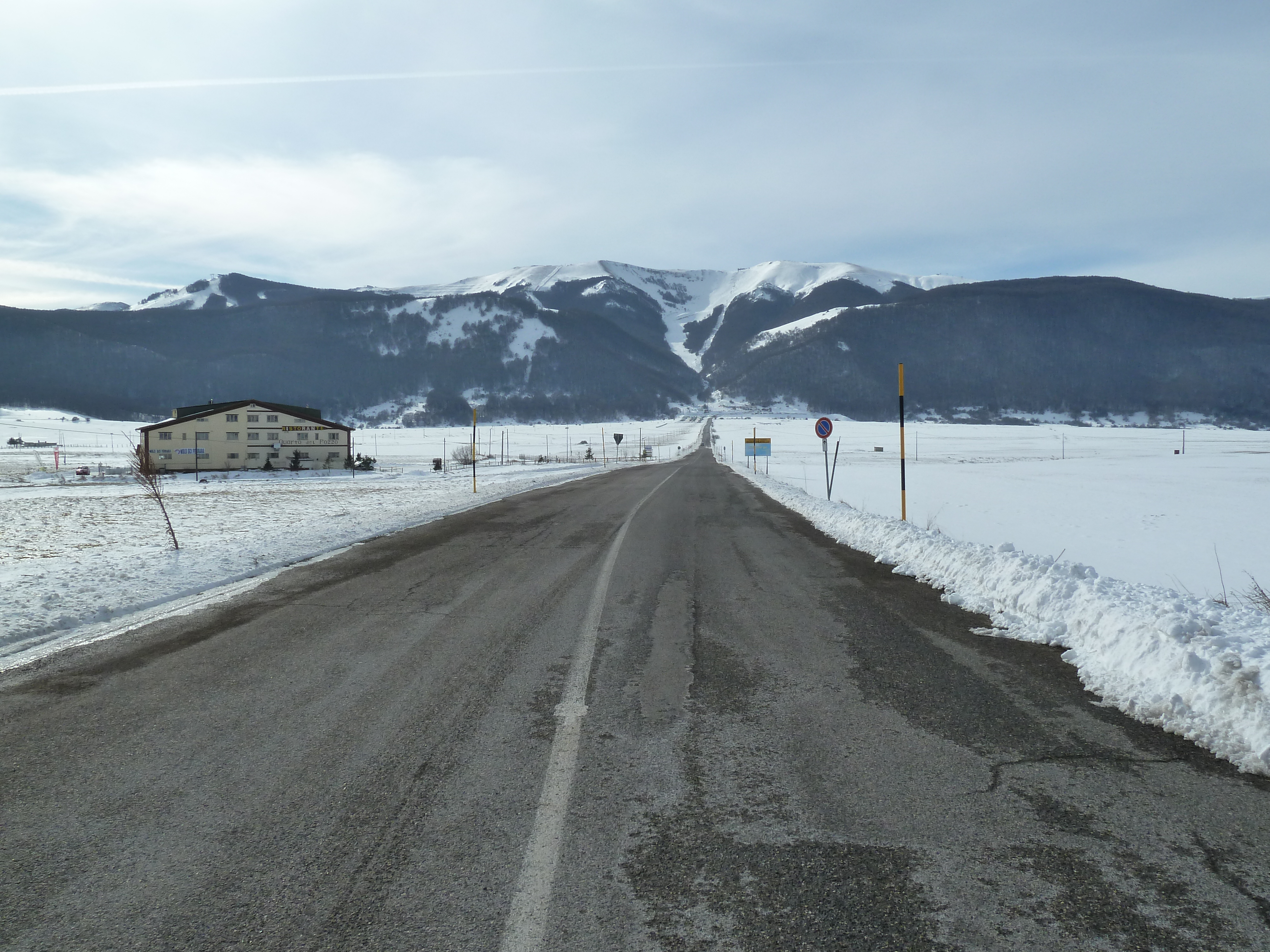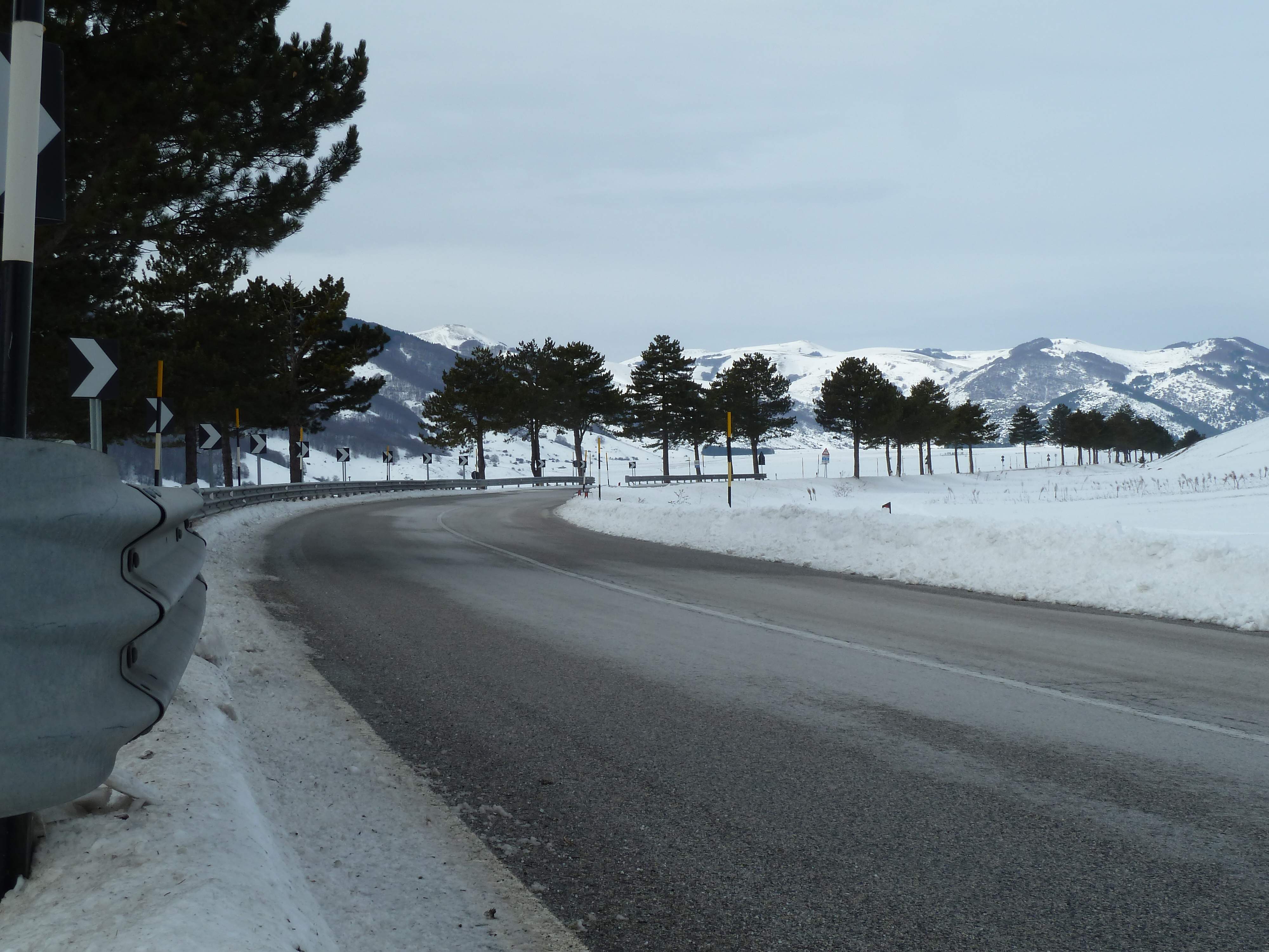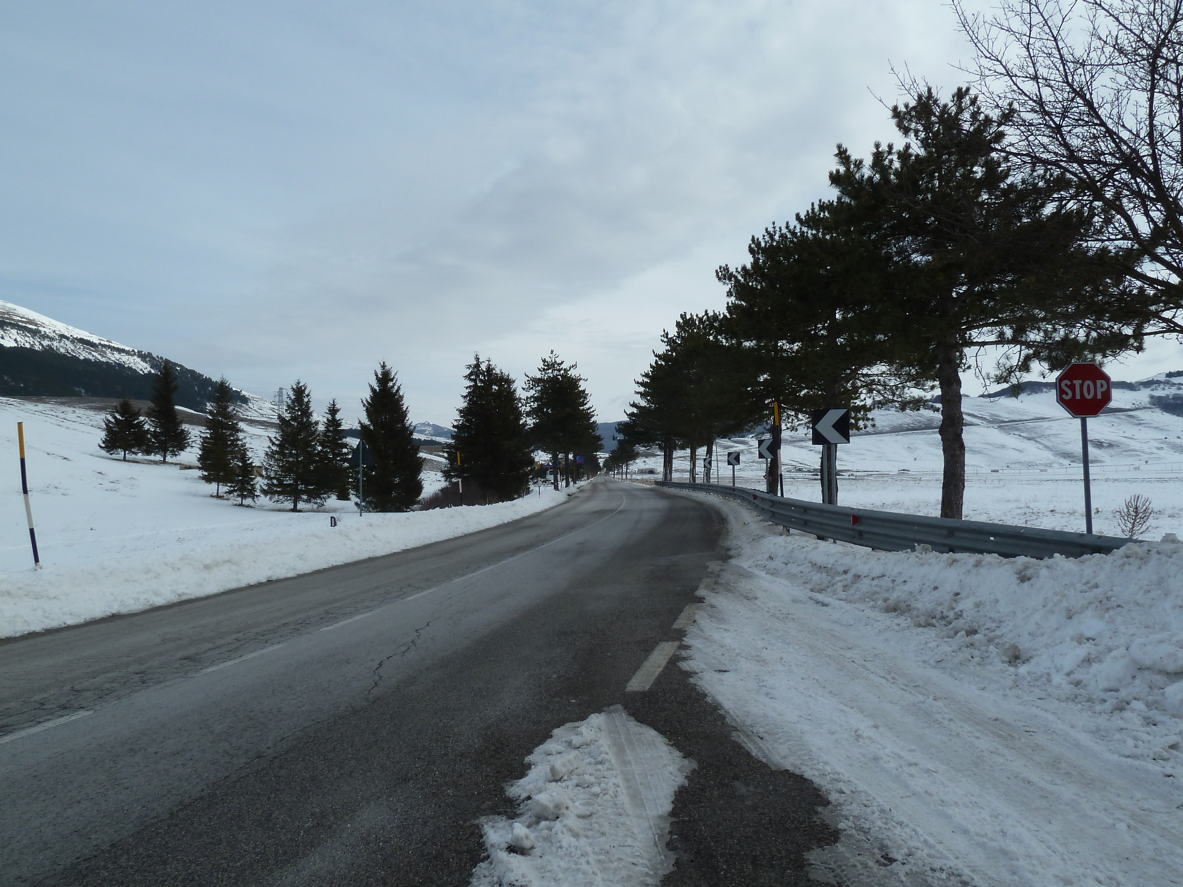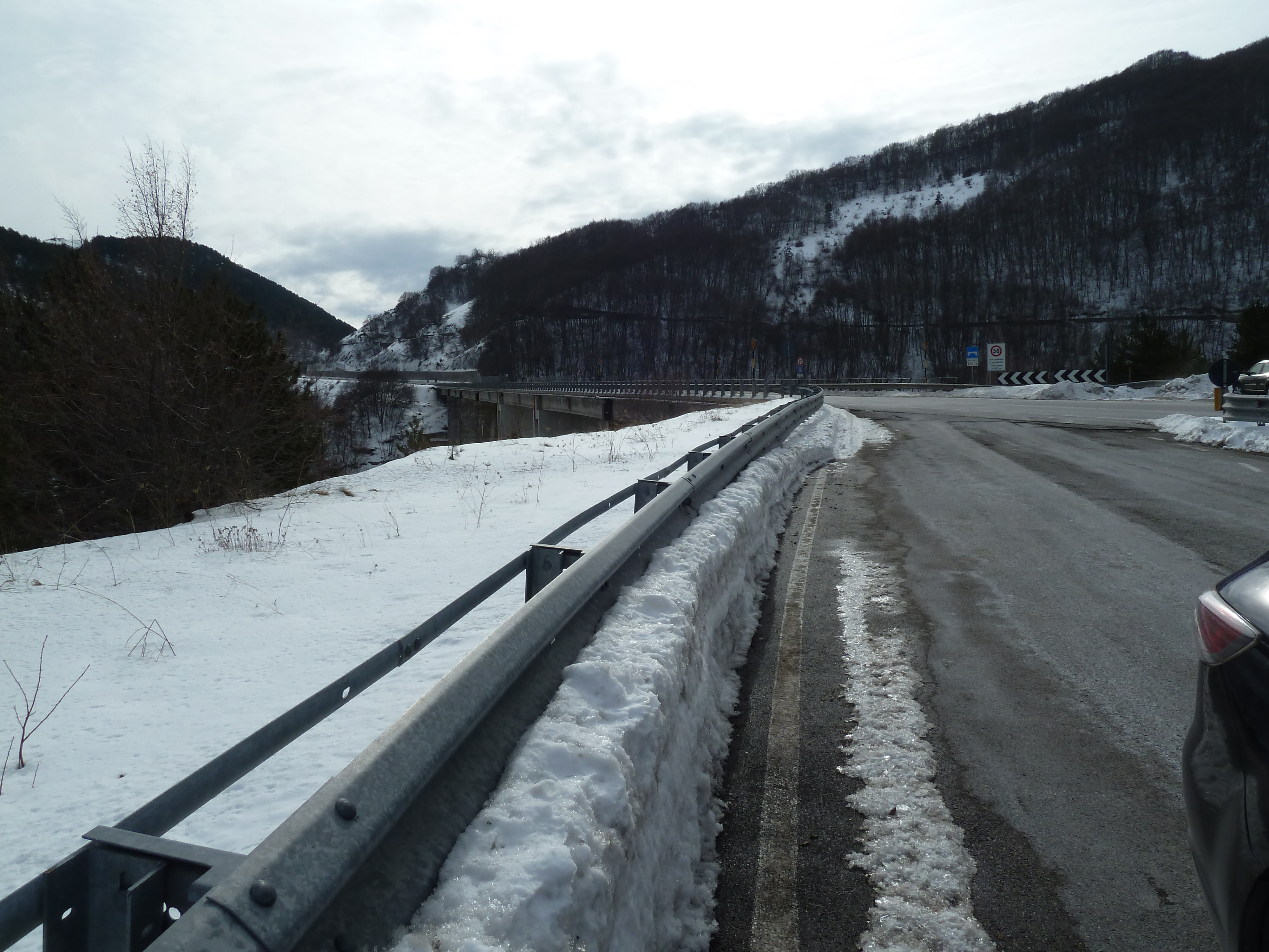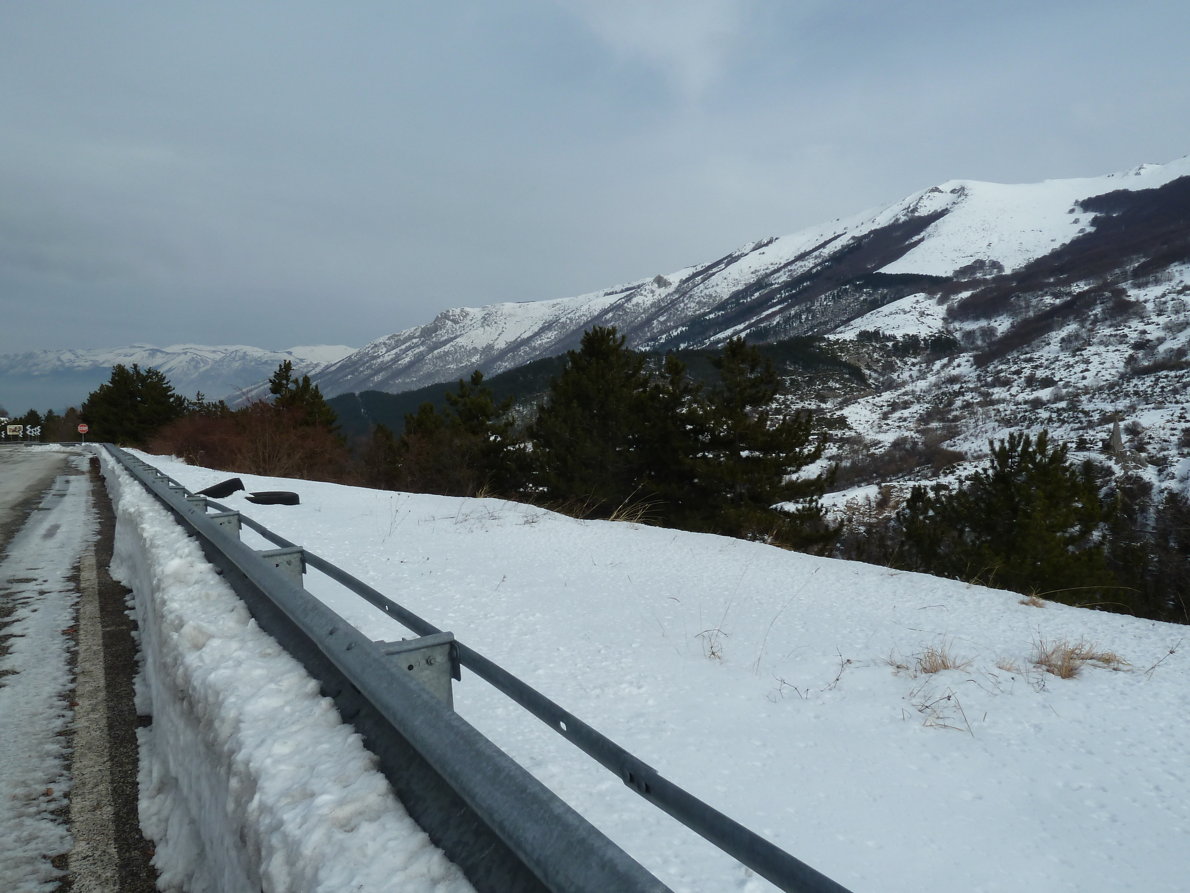 Proseguiamo sulla SS 17 che ai nostri lati offre scorci sempre più innevati man mano che si sale fino a sbucare nella Piana delle Cinque Miglia dopo la galleria che si apre bianchissima! Le strade sono asciutte e completamente ricoperte di polvere bianca dovuta al sale che le rende comunque un po’ insidiose. Poco dopo Roccaraso e prima della galleria che fa iniziare il tratto in discesa della SS 17 verso Castel di Sangro Alberto mi fa cenno di accostare e fermare anche per fare qualche bella fotografia.