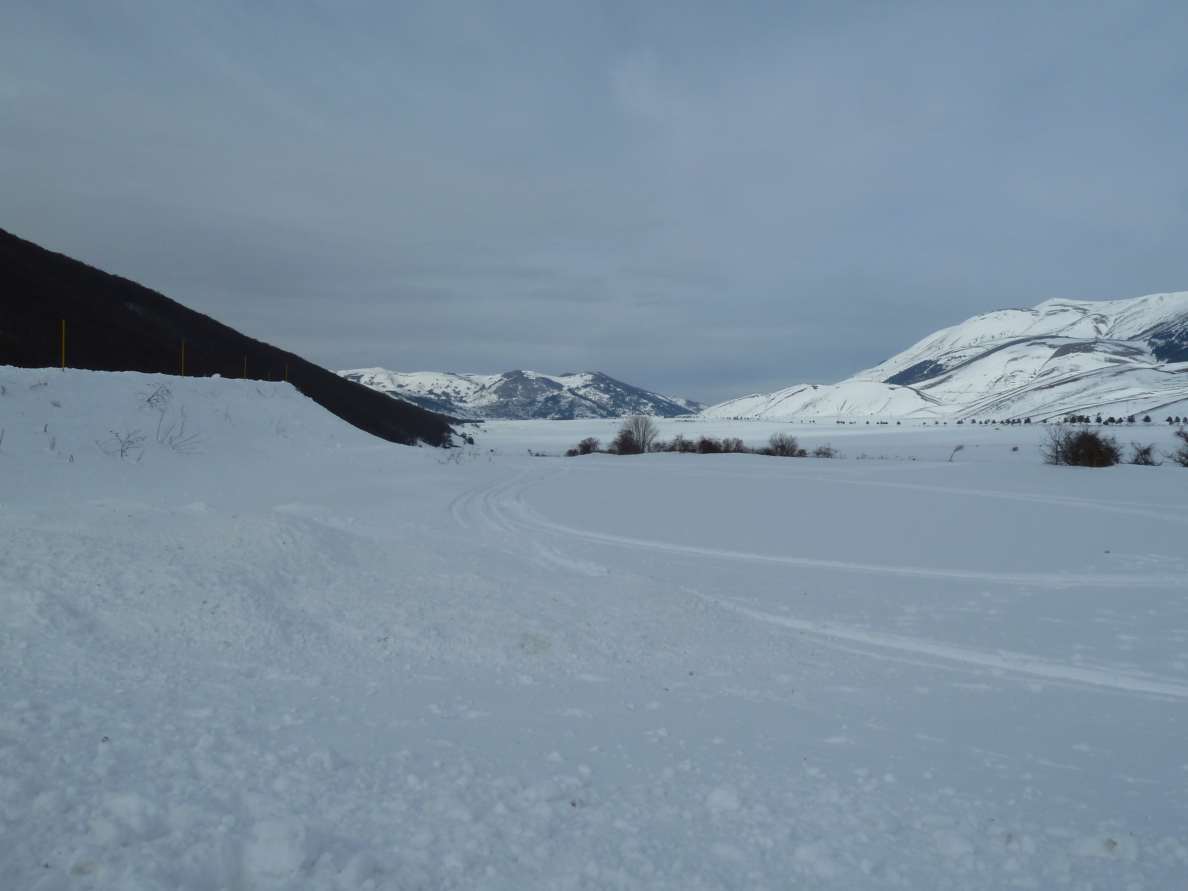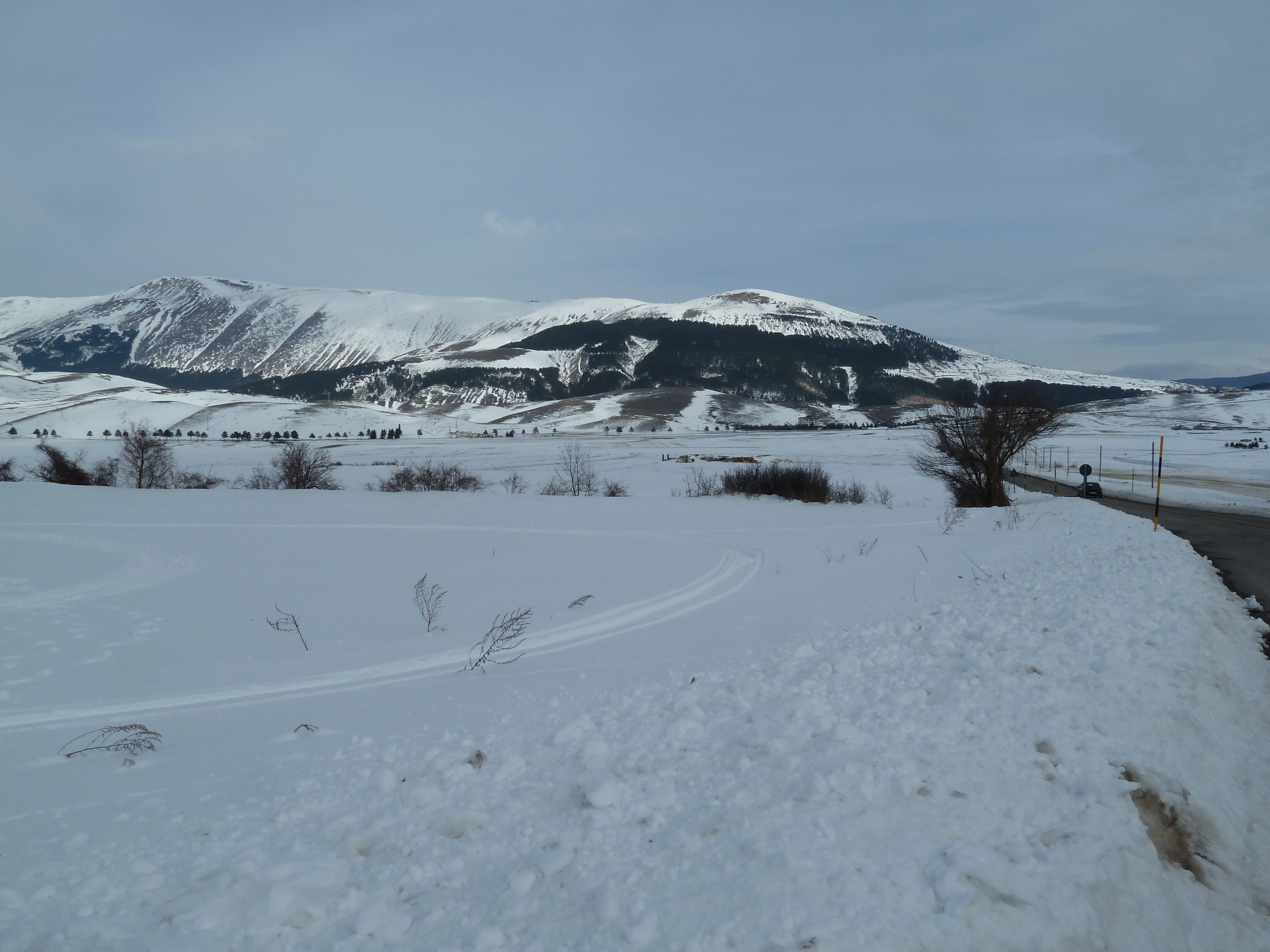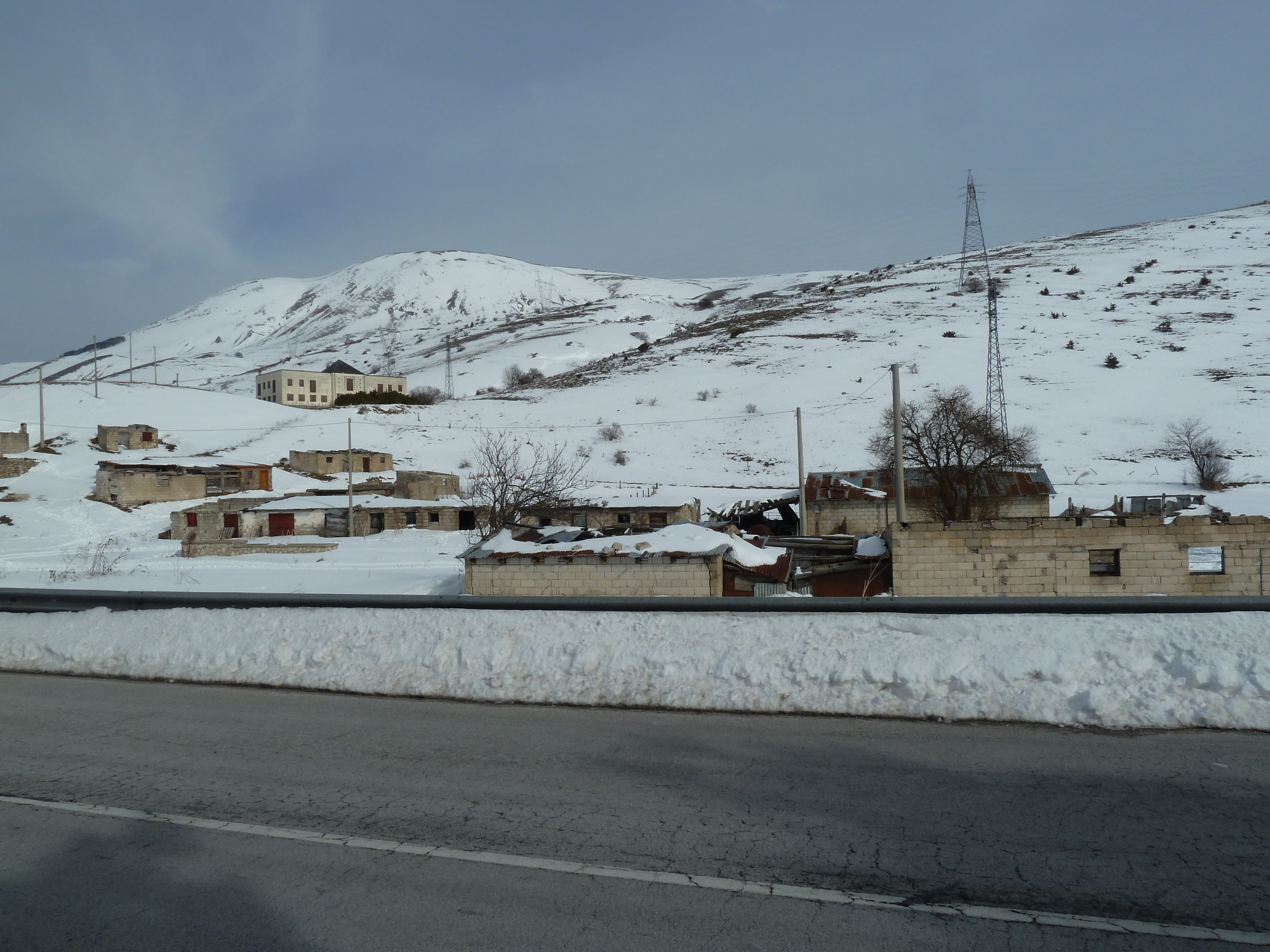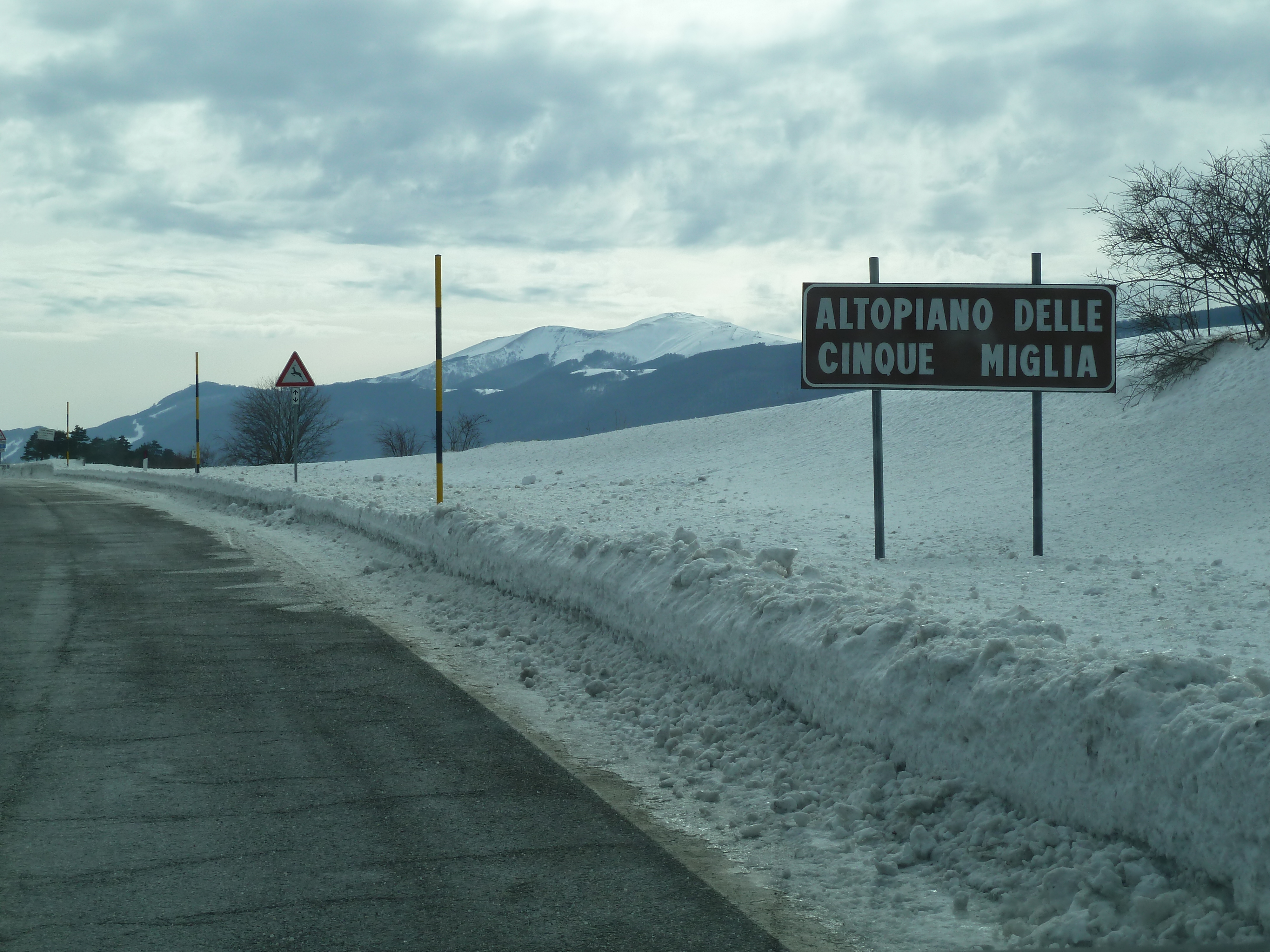 Proseguiamo sulla SS 17 che ai nostri lati offre scorci sempre più innevati man mano che si sale fino a sbucare nella Piana delle Cinque Miglia dopo la galleria che si apre bianchissima! Le strade sono asciutte e completamente ricoperte di polvere bianca dovuta al sale che le rende comunque un po’ insidiose. Poco dopo Roccaraso e prima della galleria che fa iniziare il tratto in discesa della SS 17 verso Castel di Sangro Alberto mi fa cenno di accostare e fermare anche per fare qualche bella fotografia.