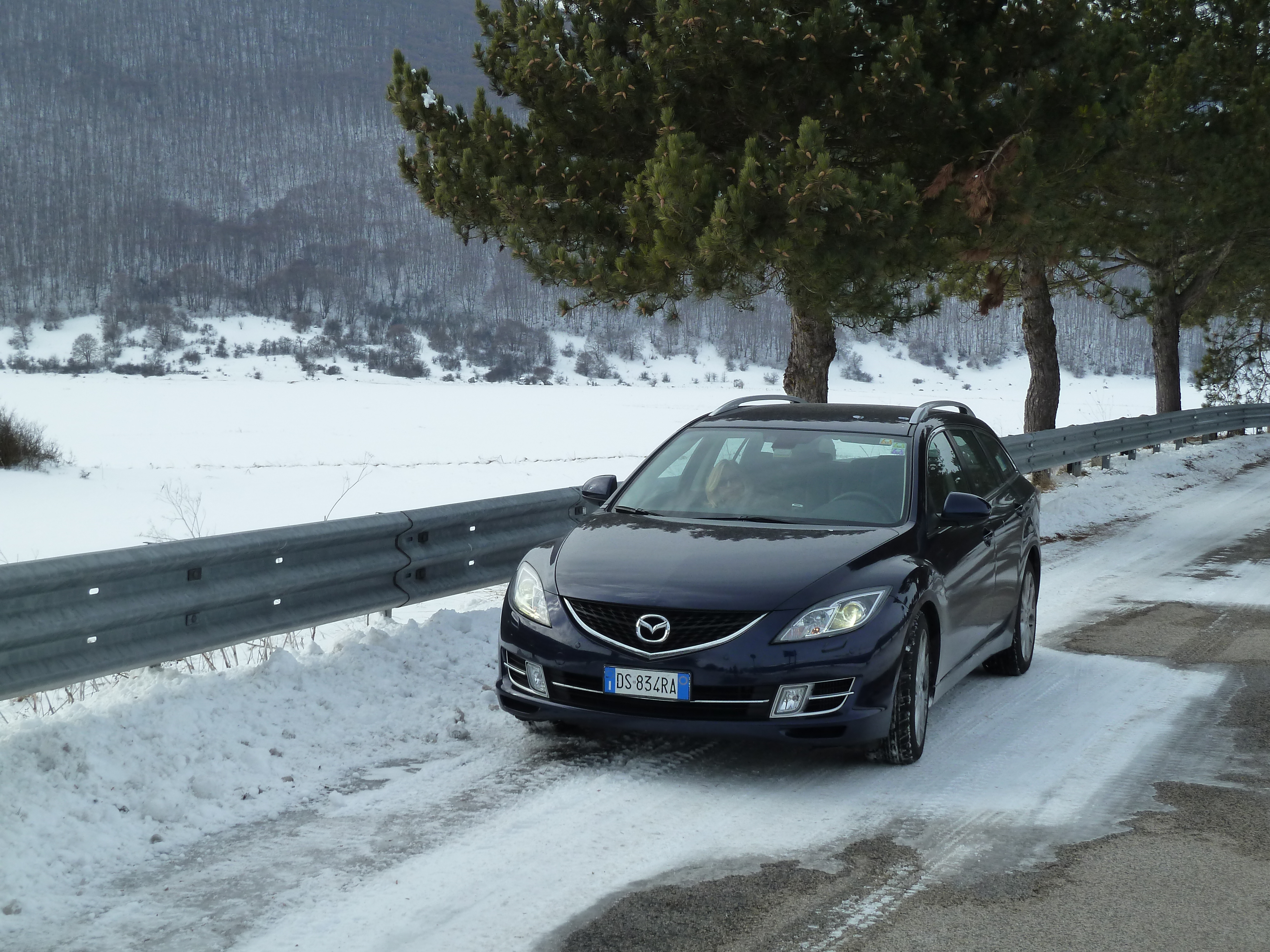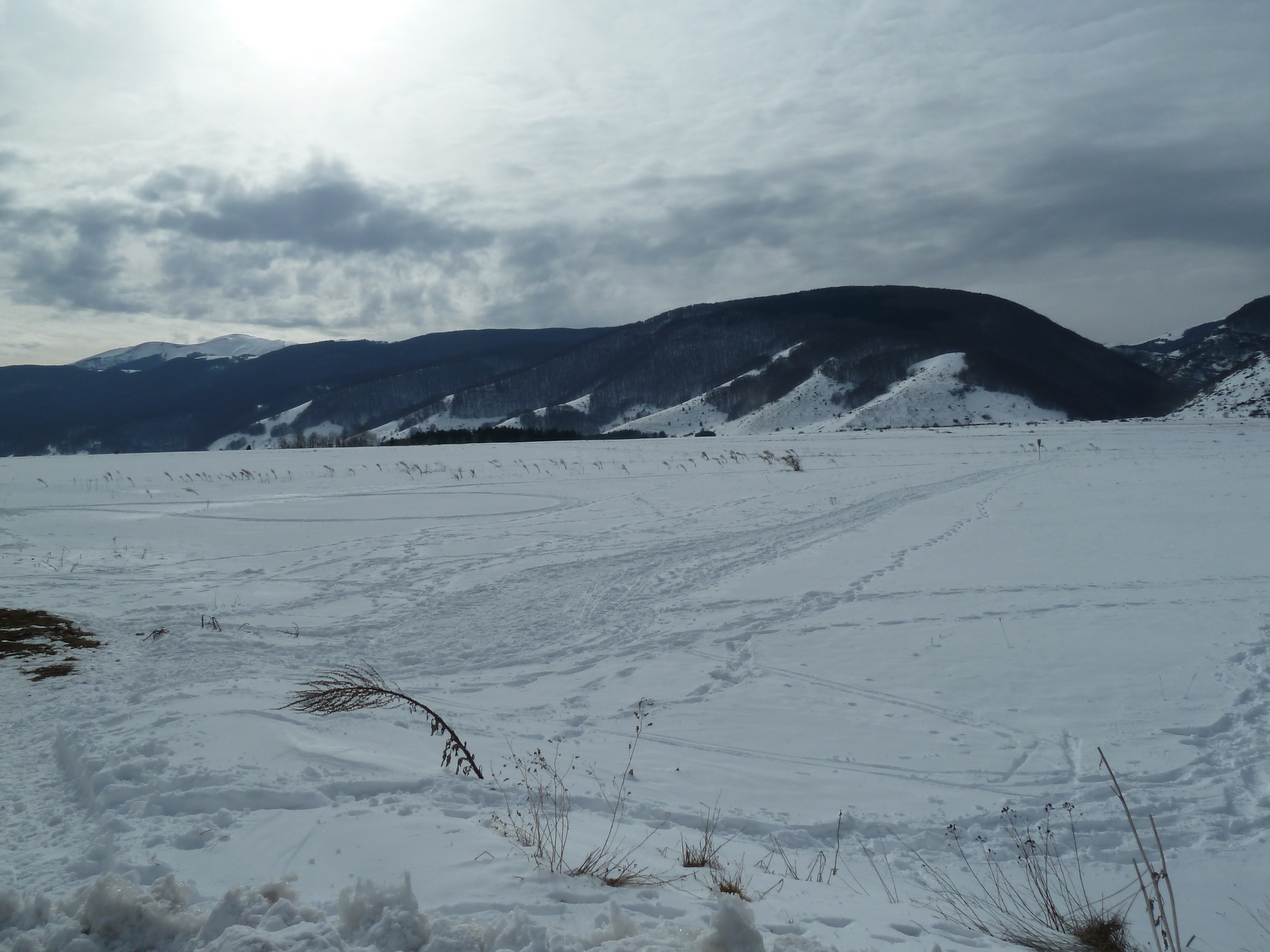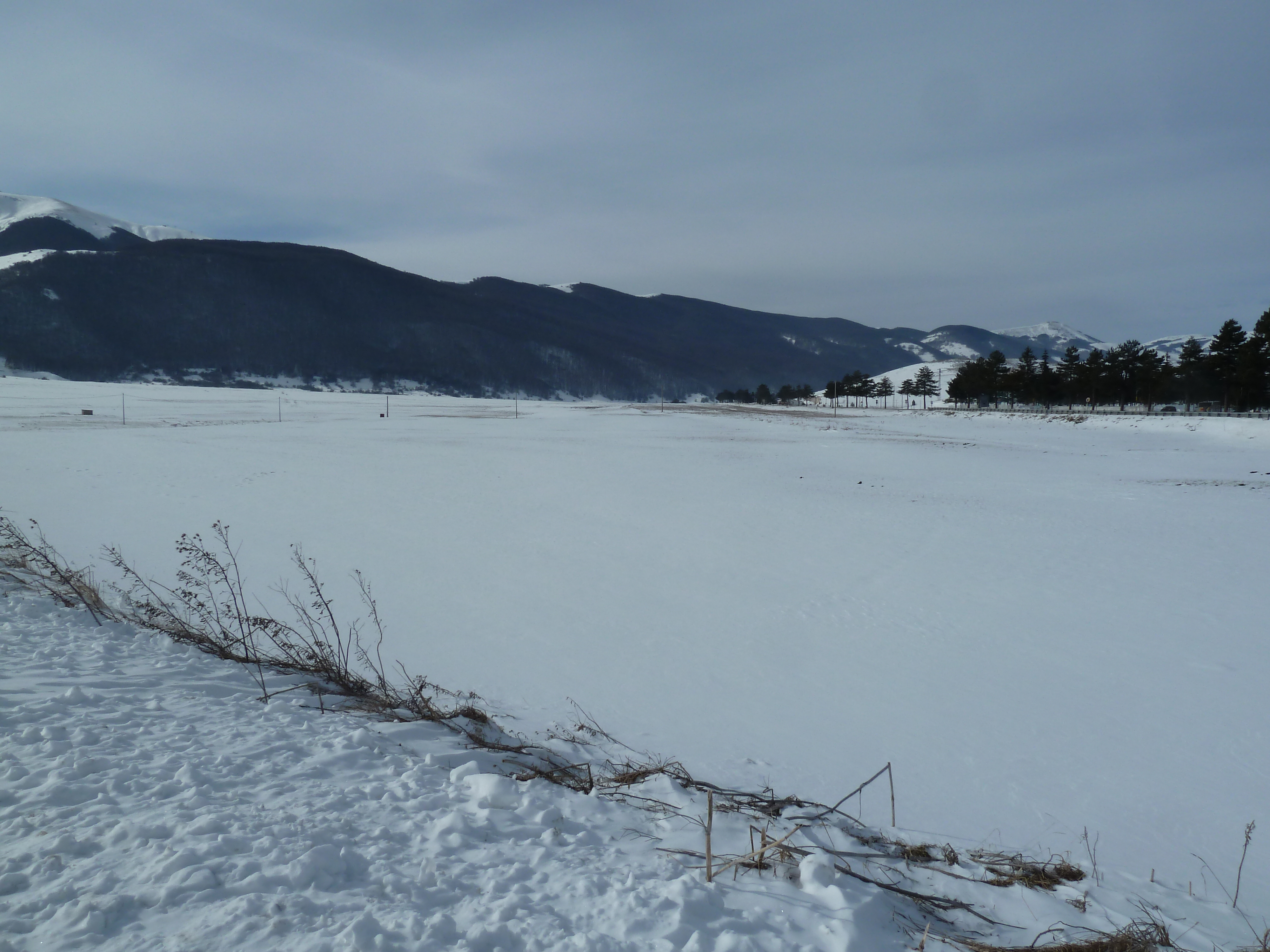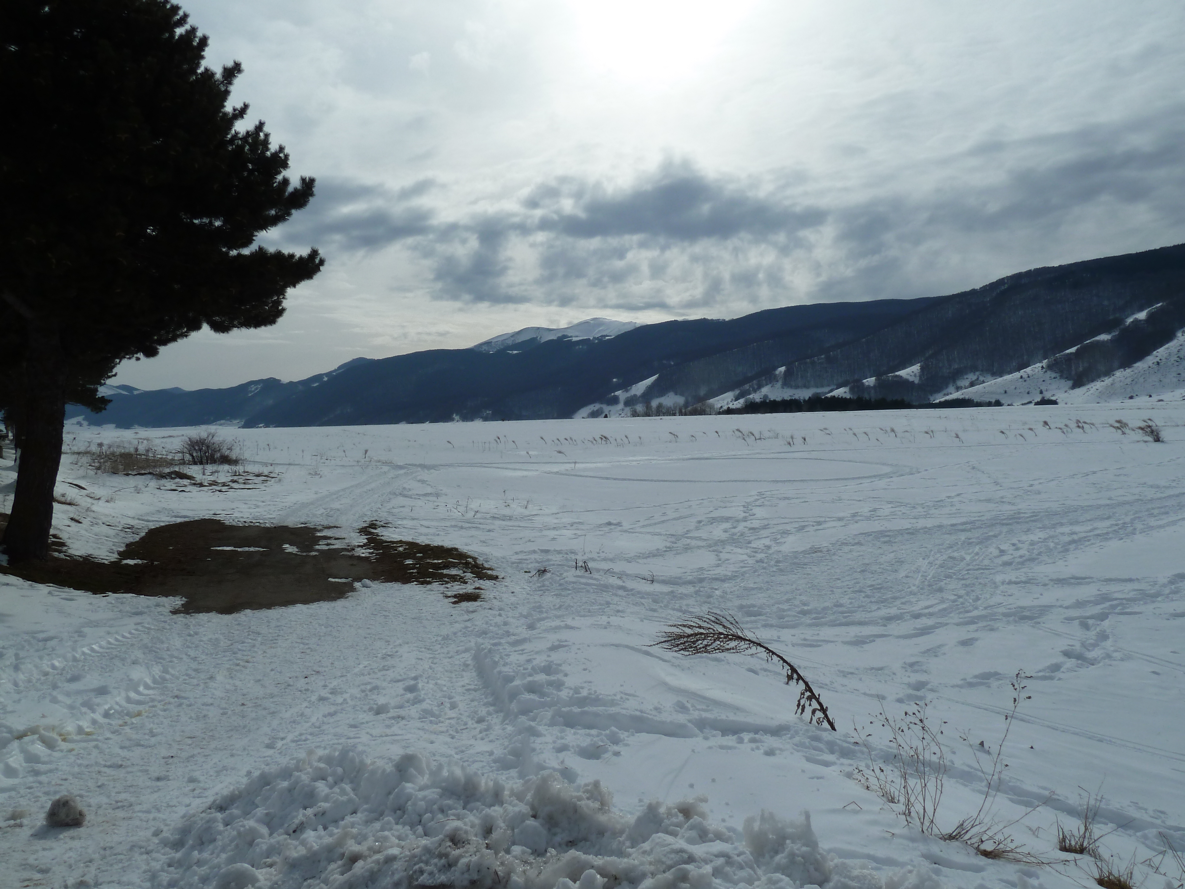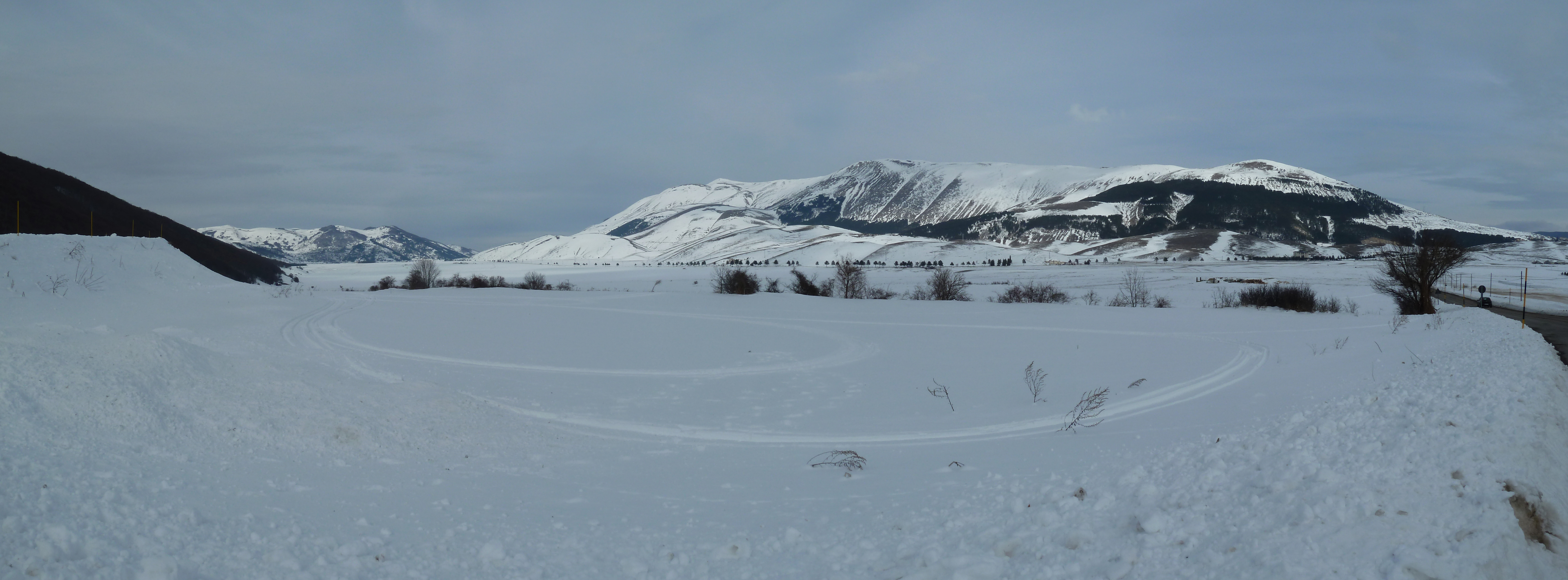 Proseguiamo sulla SS 17 che ai nostri lati offre scorci sempre più innevati man mano che si sale fino a sbucare nella Piana delle Cinque Miglia dopo la galleria che si apre bianchissima! Le strade sono asciutte e completamente ricoperte di polvere bianca dovuta al sale che le rende comunque un po’ insidiose. Poco dopo Roccaraso e prima della galleria che fa iniziare il tratto in discesa della SS 17 verso Castel di Sangro Alberto mi fa cenno di accostare e fermare anche per fare qualche bella fotografia.