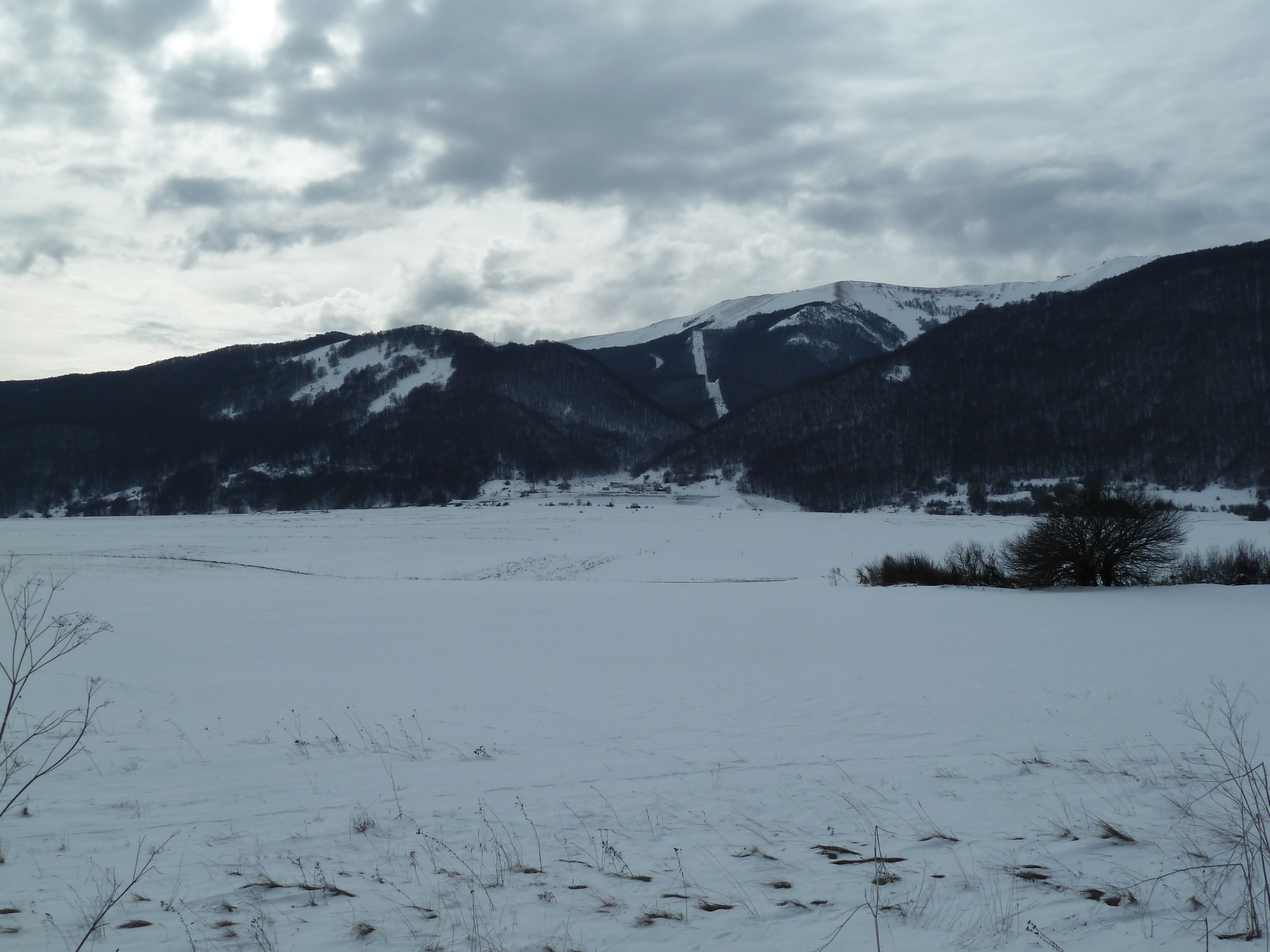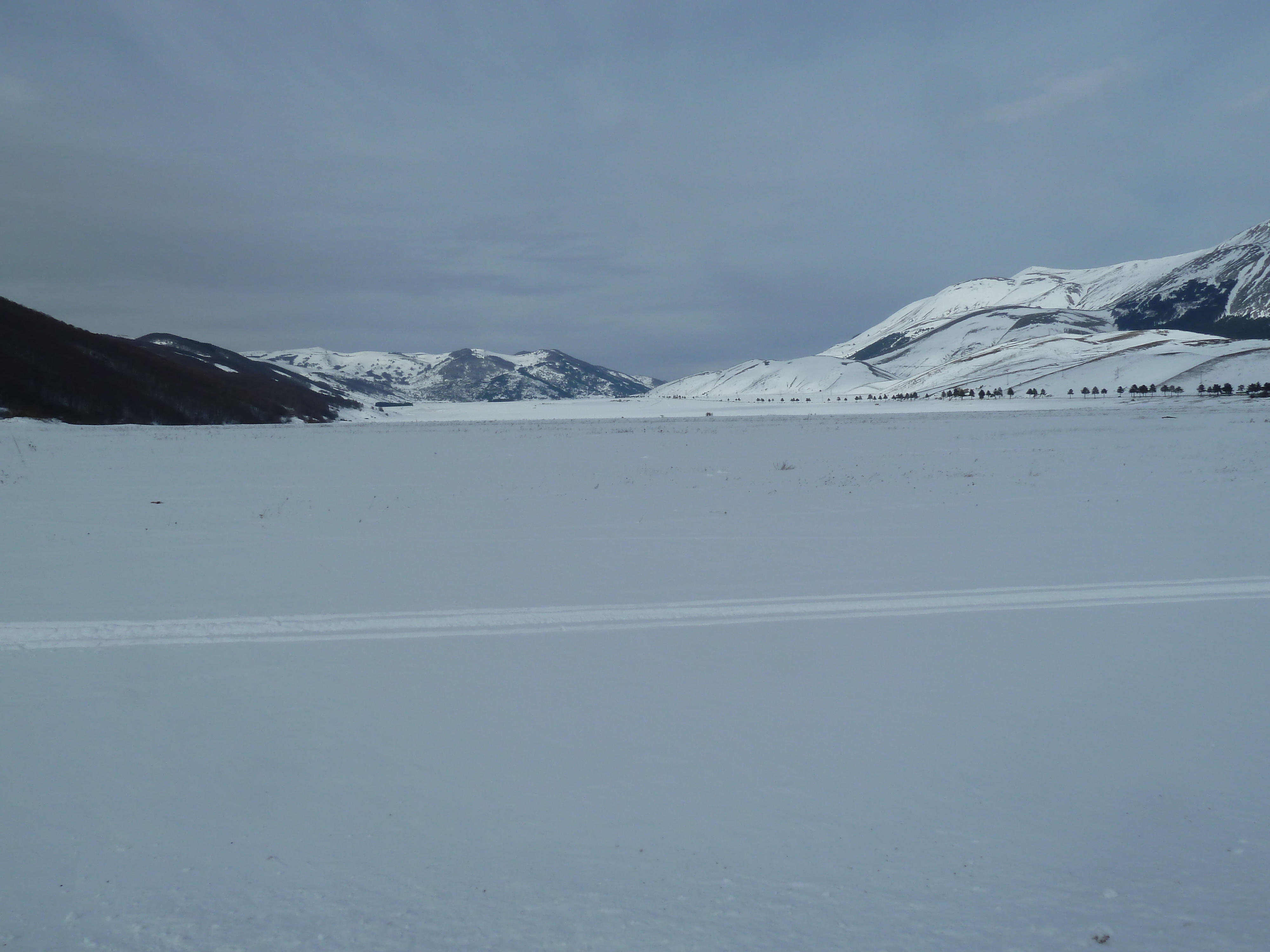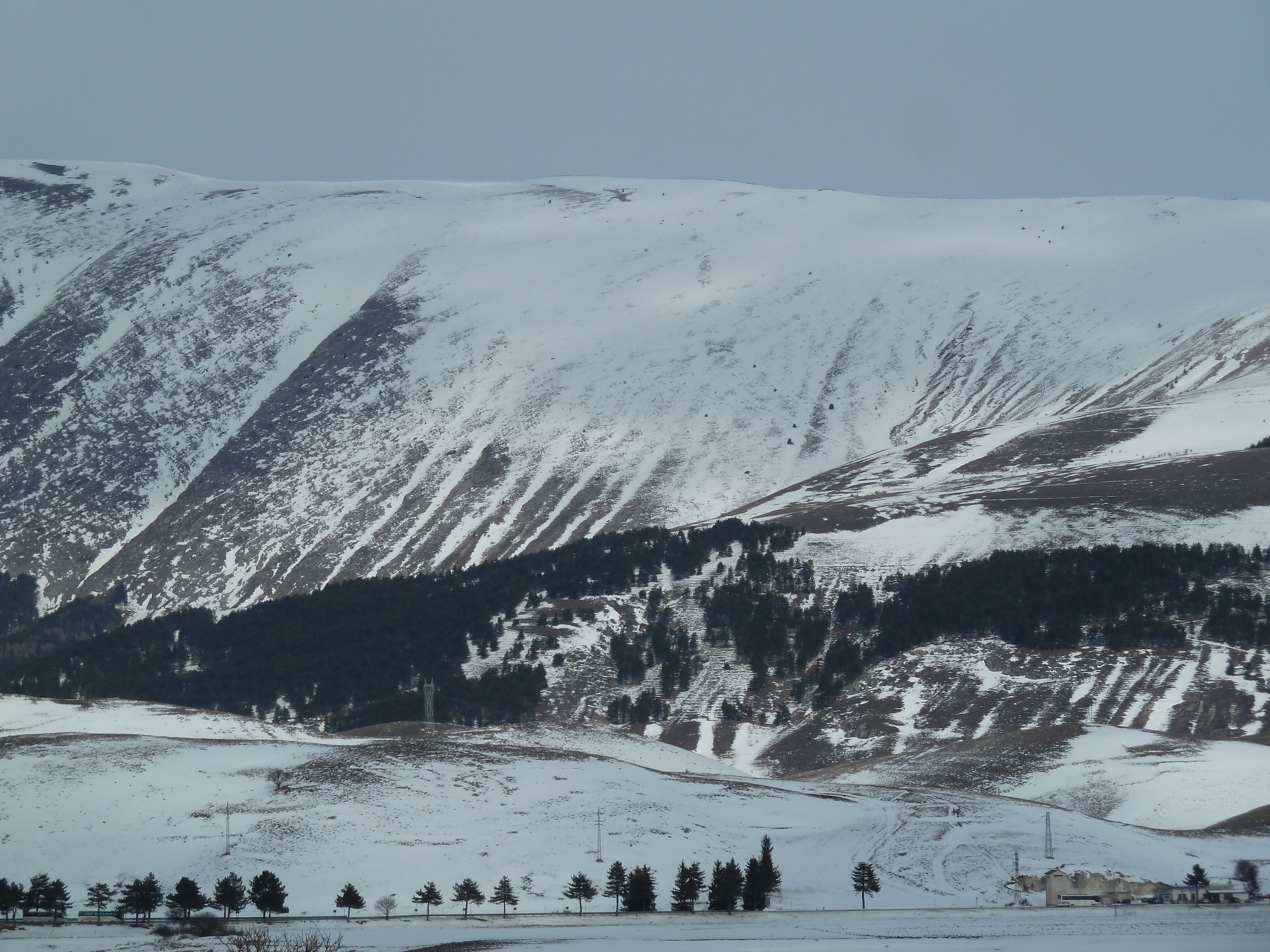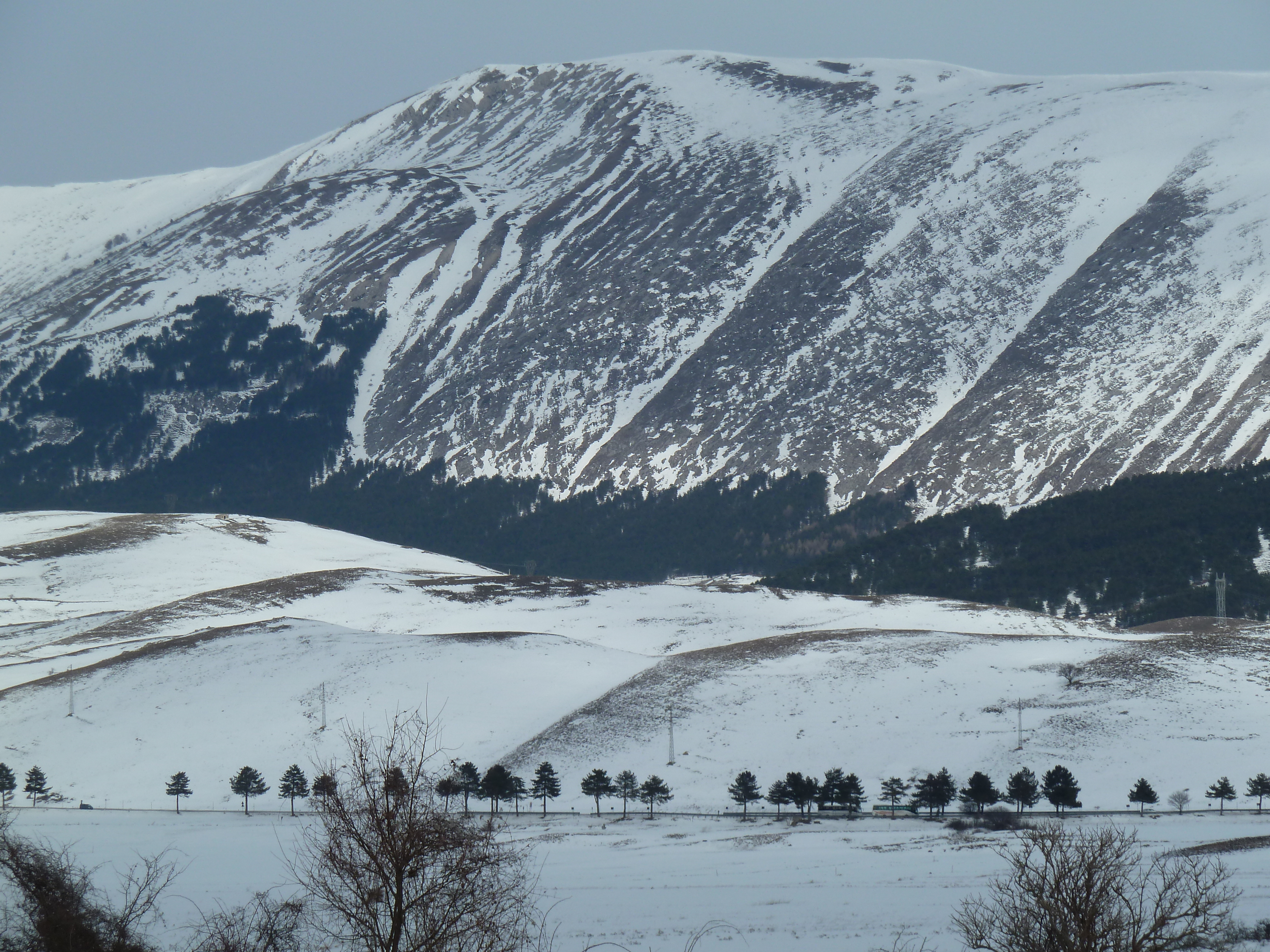 Proseguiamo sulla SS 17 che ai nostri lati offre scorci sempre più innevati man mano che si sale fino a sbucare nella Piana delle Cinque Miglia dopo la galleria che si apre bianchissima! Le strade sono asciutte e completamente ricoperte di polvere bianca dovuta al sale che le rende comunque un po’ insidiose. Poco dopo Roccaraso e prima della galleria che fa iniziare il tratto in discesa della SS 17 verso Castel di Sangro Alberto mi fa cenno di accostare e fermare anche per fare qualche bella fotografia.