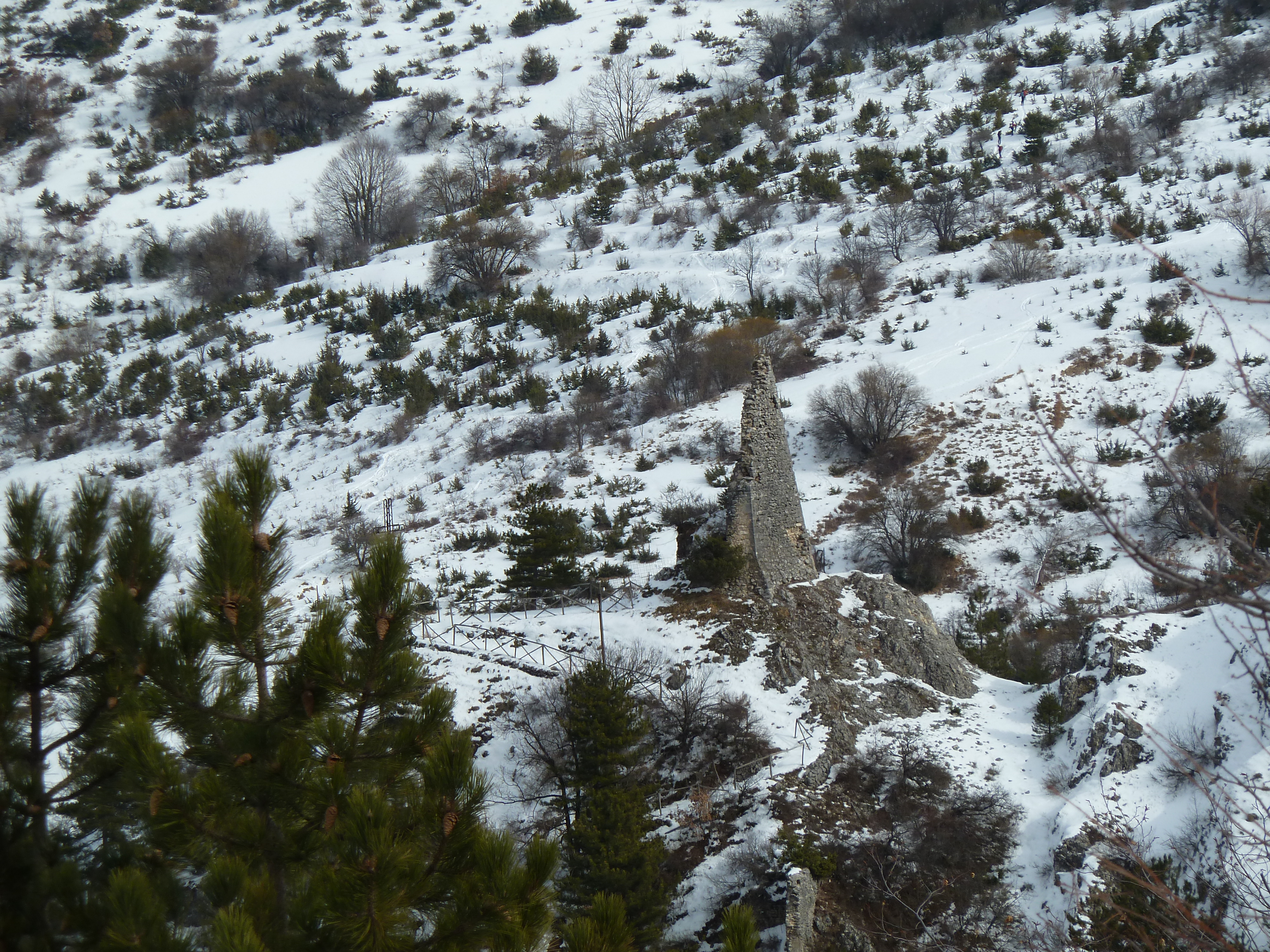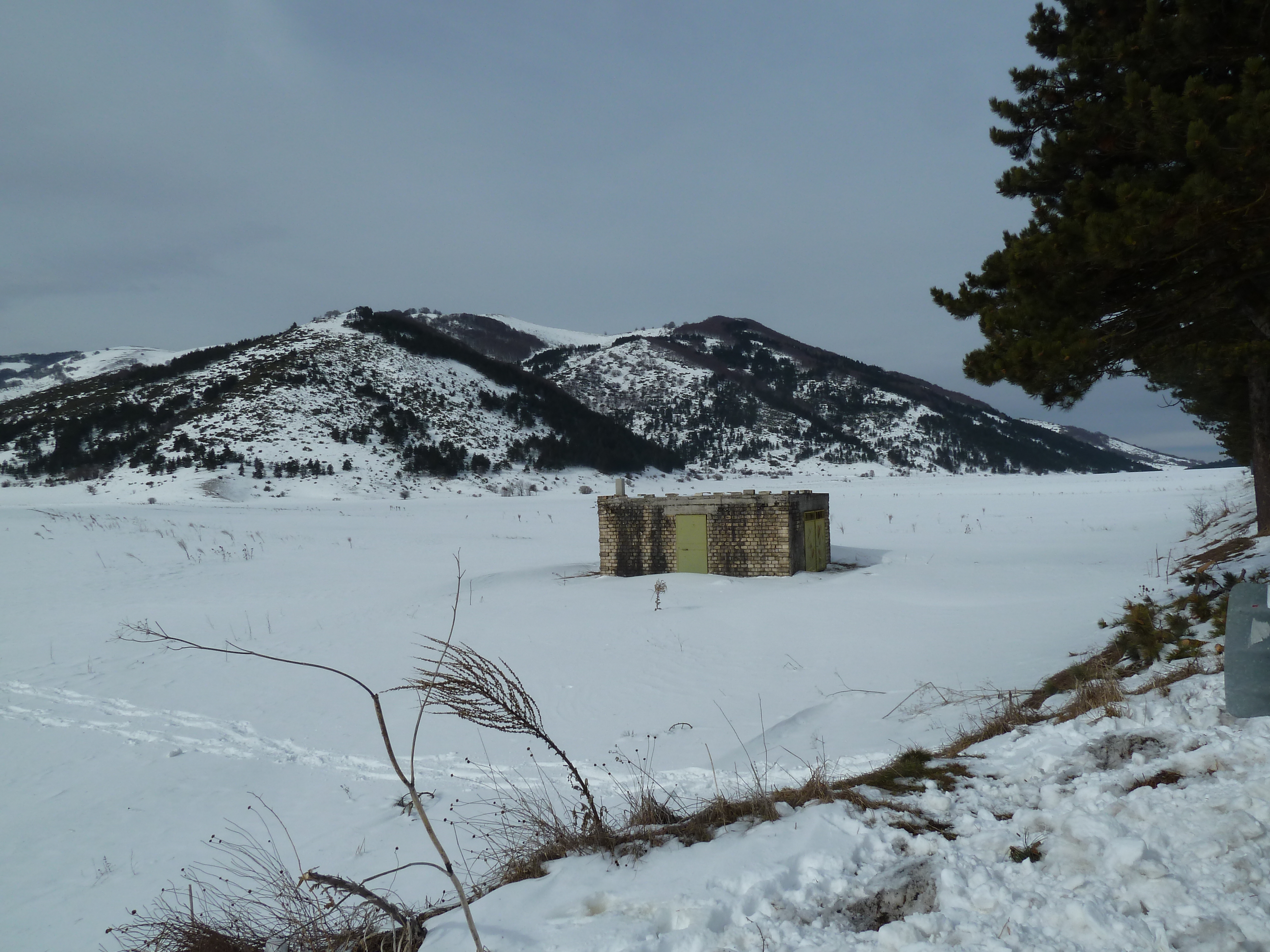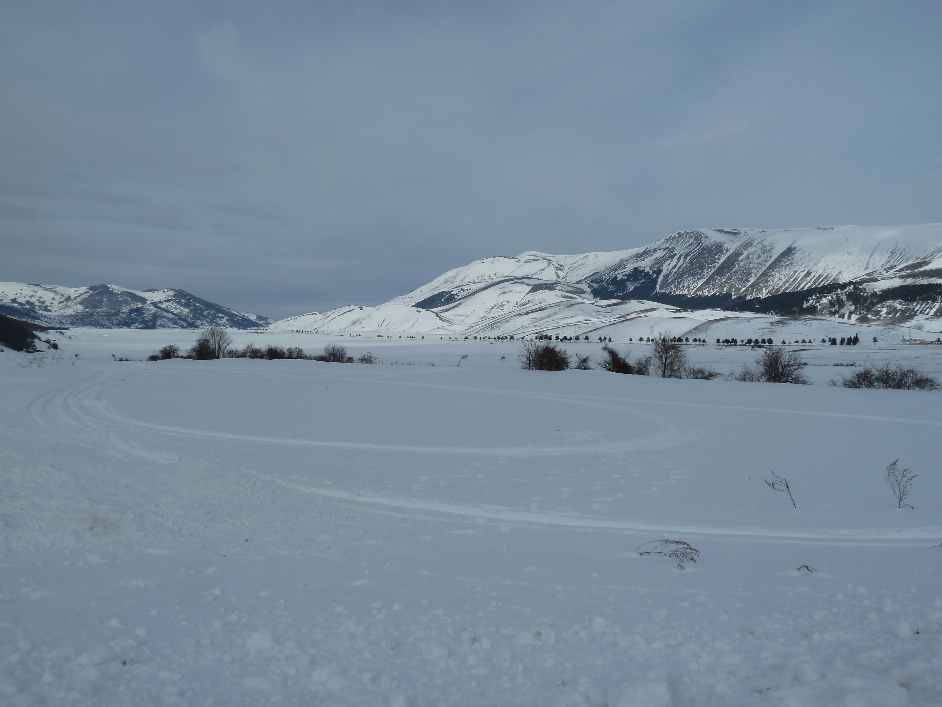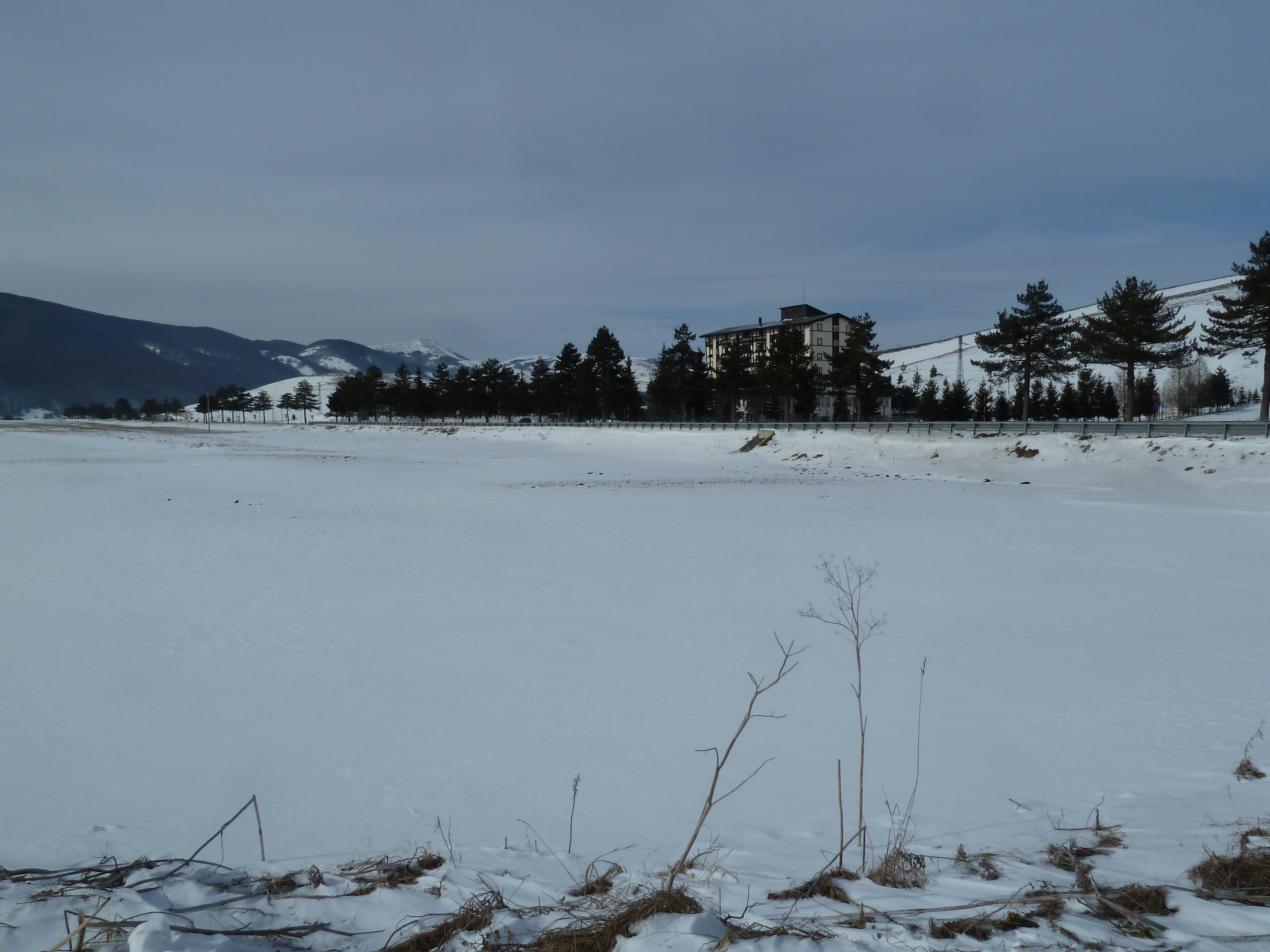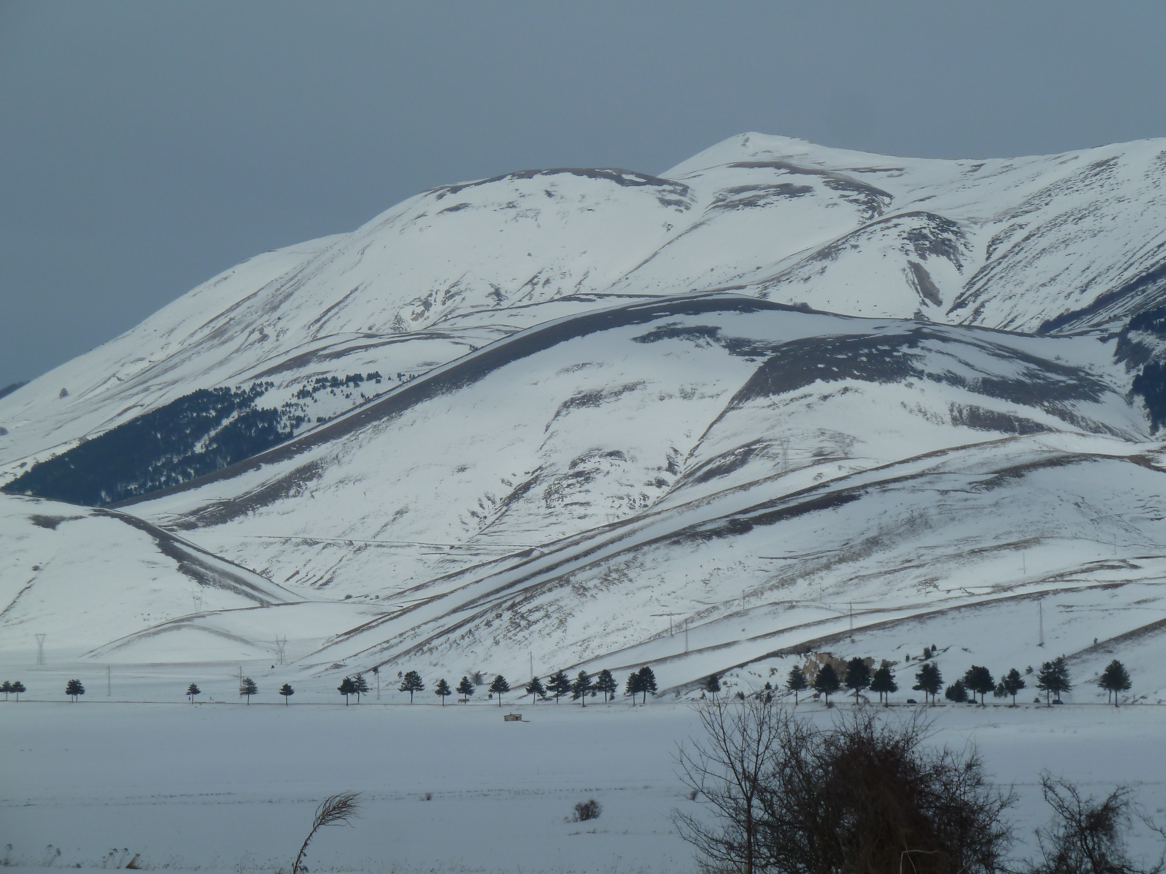 Proseguiamo sulla SS 17 che ai nostri lati offre scorci sempre più innevati man mano che si sale fino a sbucare nella Piana delle Cinque Miglia dopo la galleria che si apre bianchissima! Le strade sono asciutte e completamente ricoperte di polvere bianca dovuta al sale che le rende comunque un po’ insidiose. Poco dopo Roccaraso e prima della galleria che fa iniziare il tratto in discesa della SS 17 verso Castel di Sangro Alberto mi fa cenno di accostare e fermare anche per fare qualche bella fotografia.