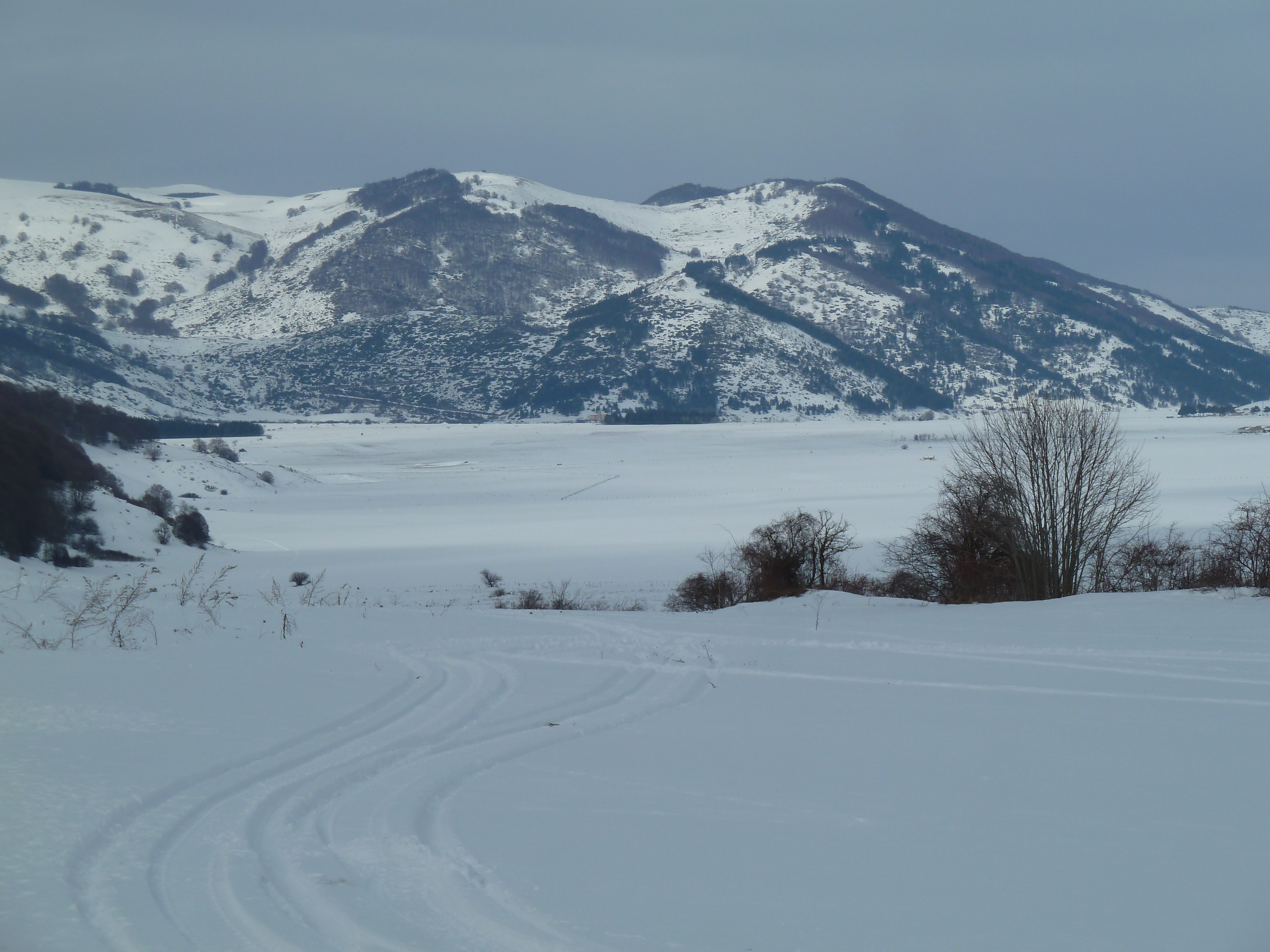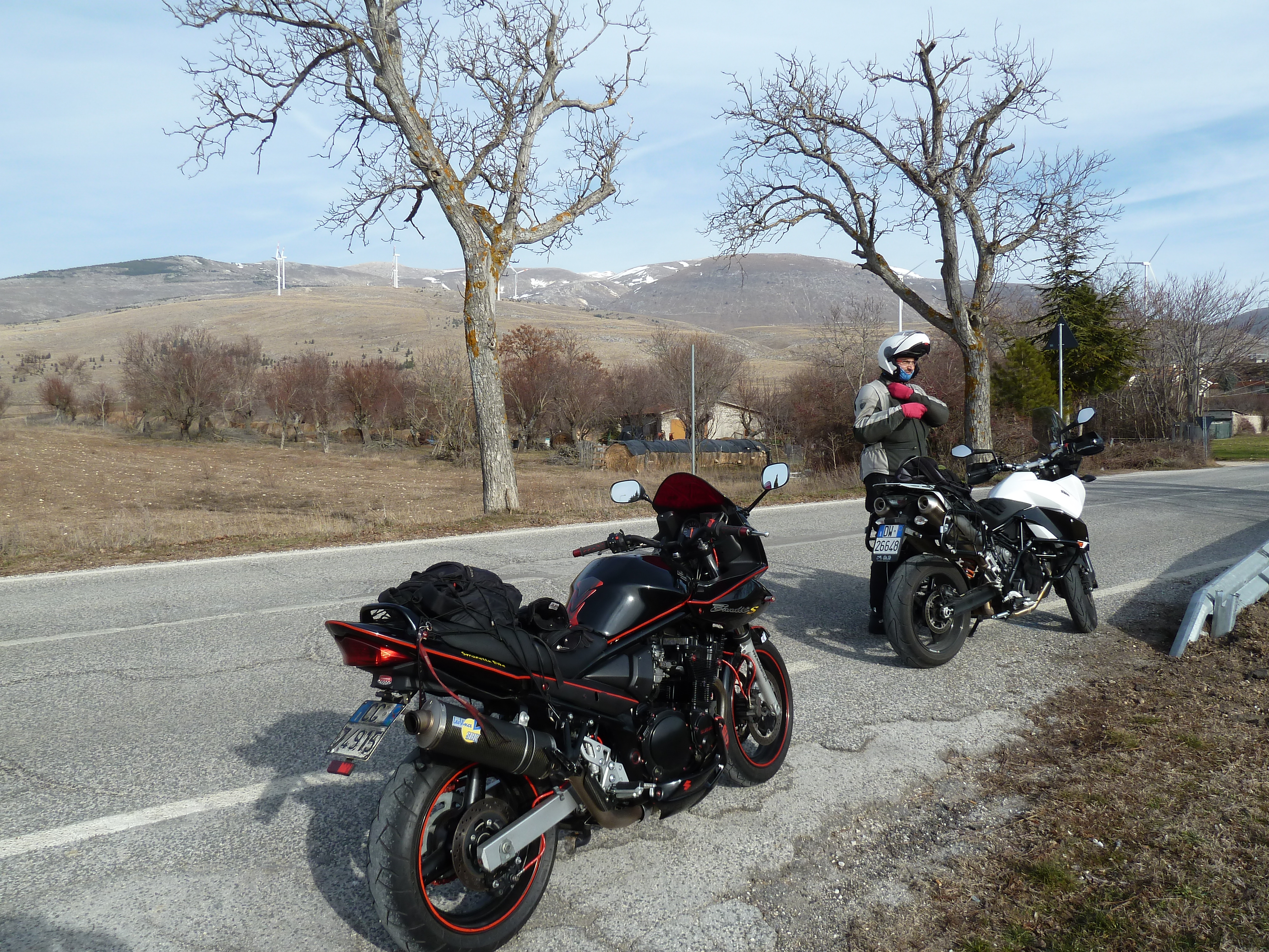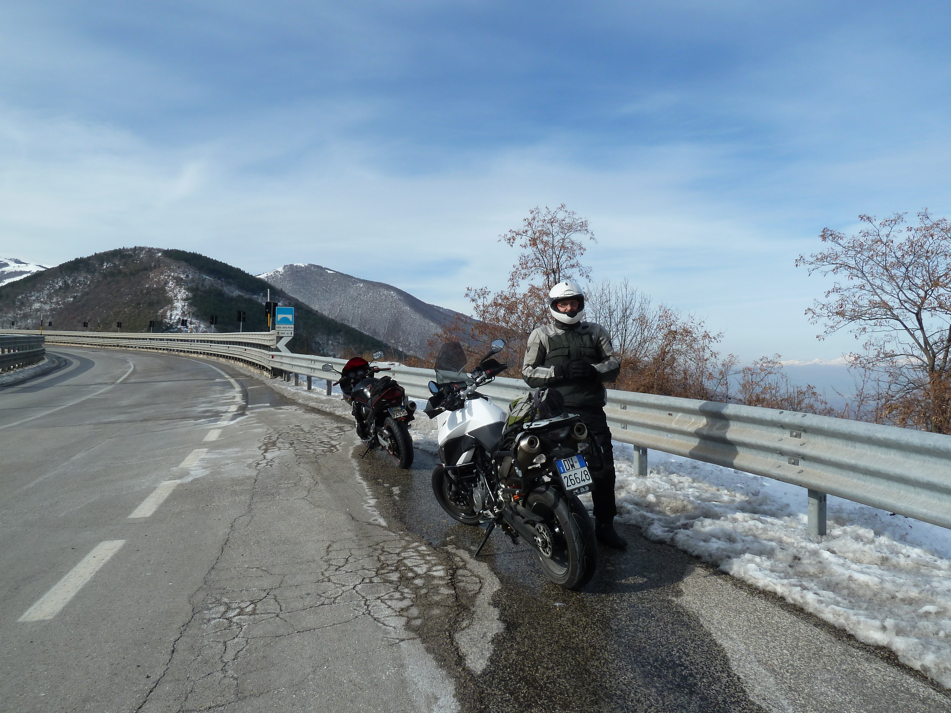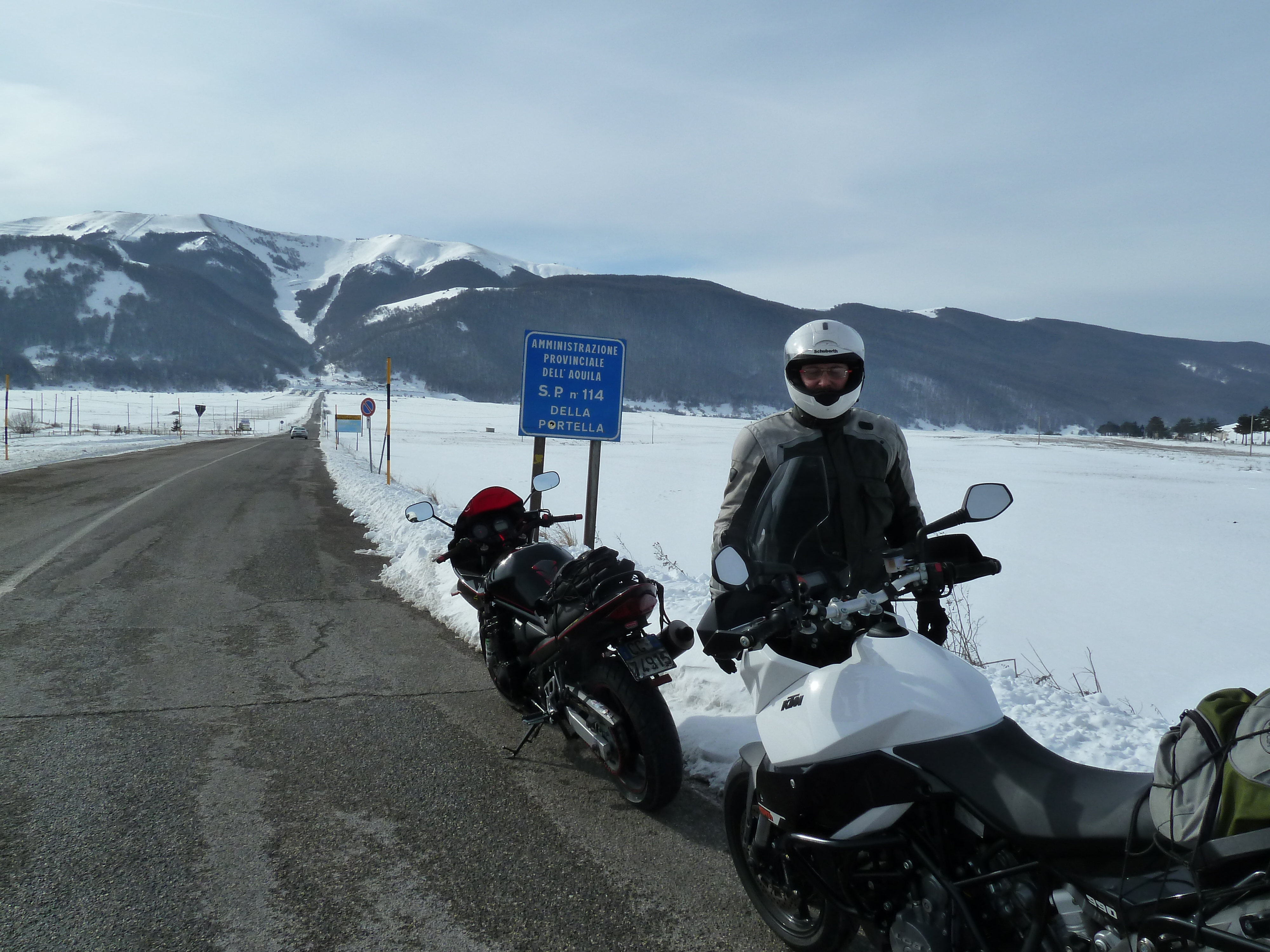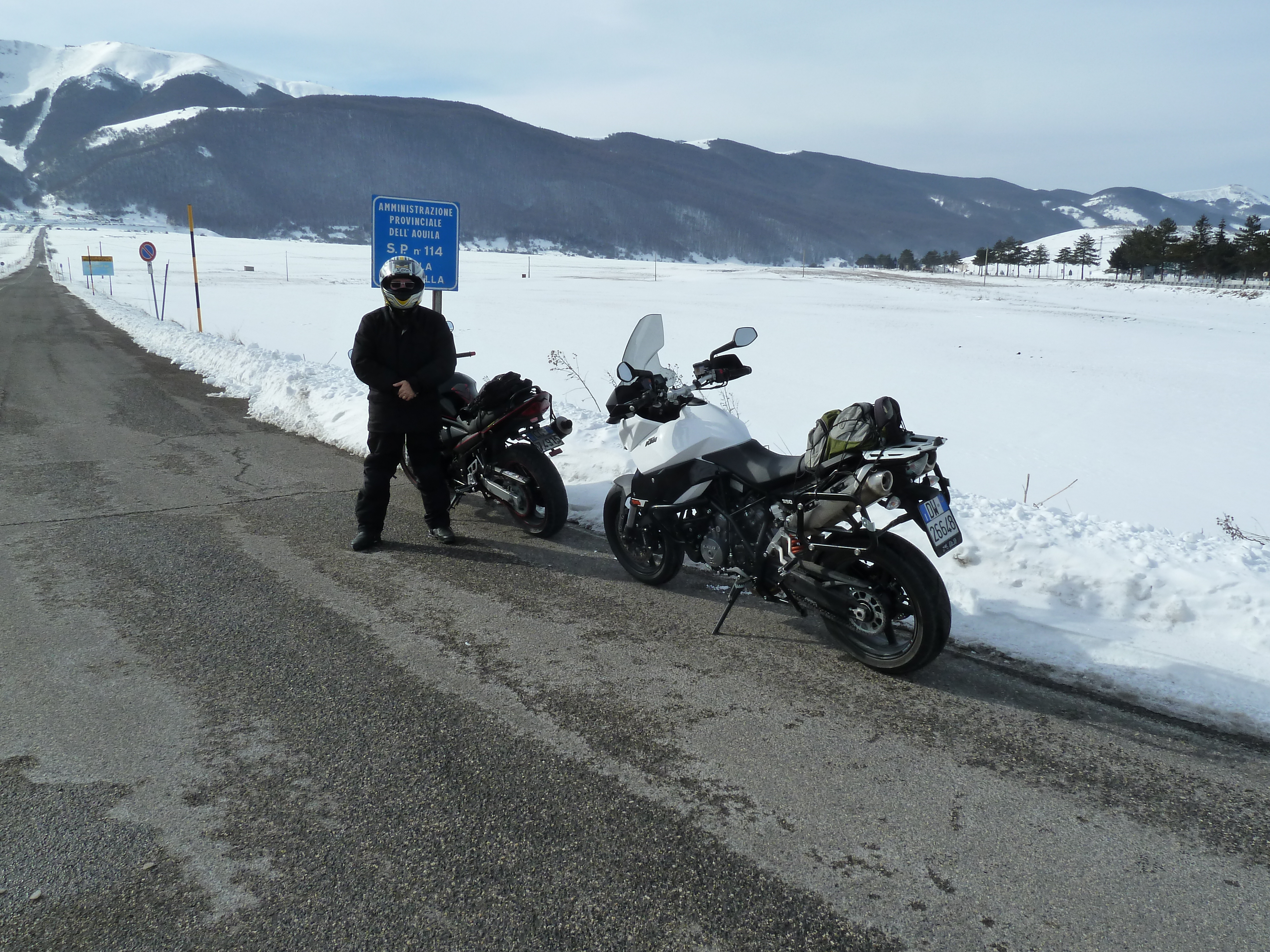 E’ una delle prime uscite di Alberto con la nuova KTM ed il termometro ambientale che ha a bordo come accessorio ci sarà d’aiuto a testimoniare la nostra determinazione ad essere motociclisti non solo…della domenica! Usciti a Pescina e dopo aver rinforzato l’abbigliamento imbocchiamo la SS 5 verso il valico di Forca Caruso che quest’anno mi ha già visto passarci proprio ad inizio di gennaio. Soprattutto la discesa ci vede guardinghi ma nonostante la nuvolaglia scura e bassa non sembra dovrà piovere e tutto sommato poco dopo il valico si apre davanti a noi la vista bellissima verso il Gran Sasso e la valle del Tirino a nord.