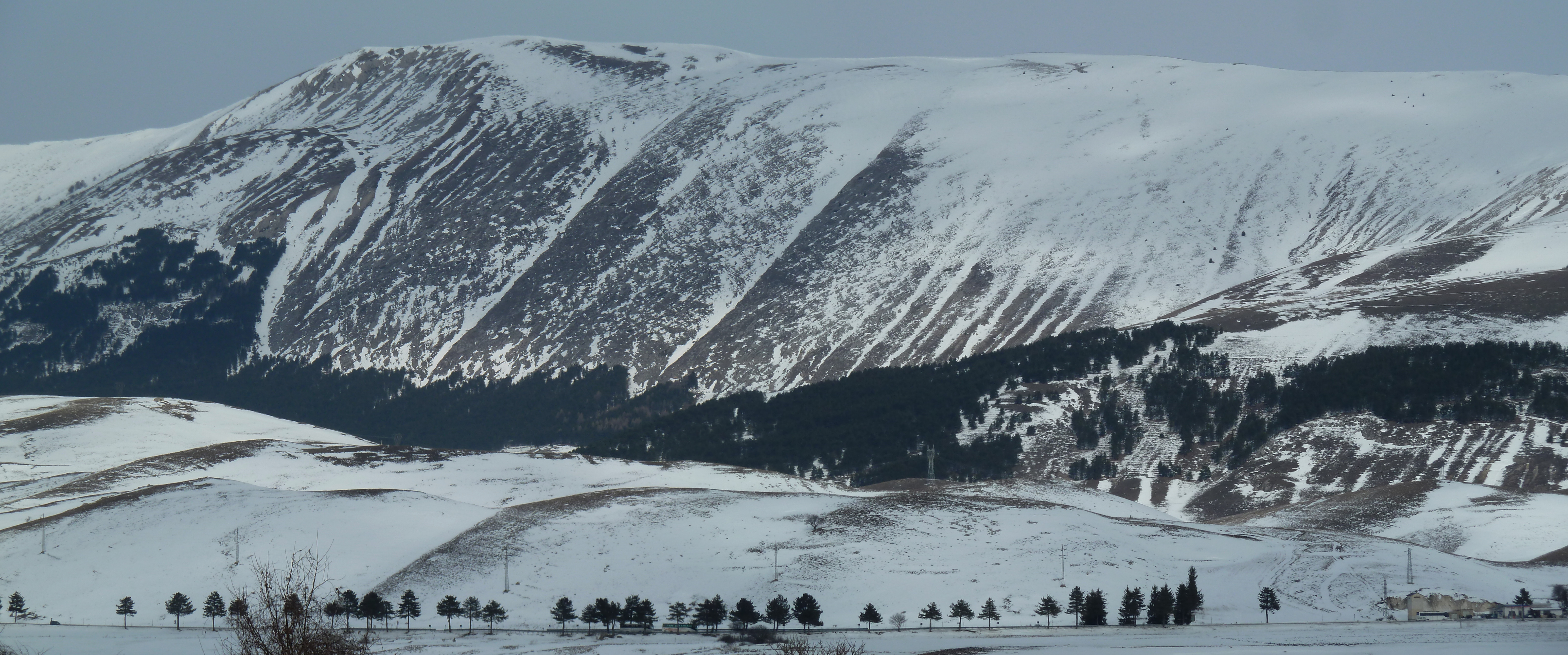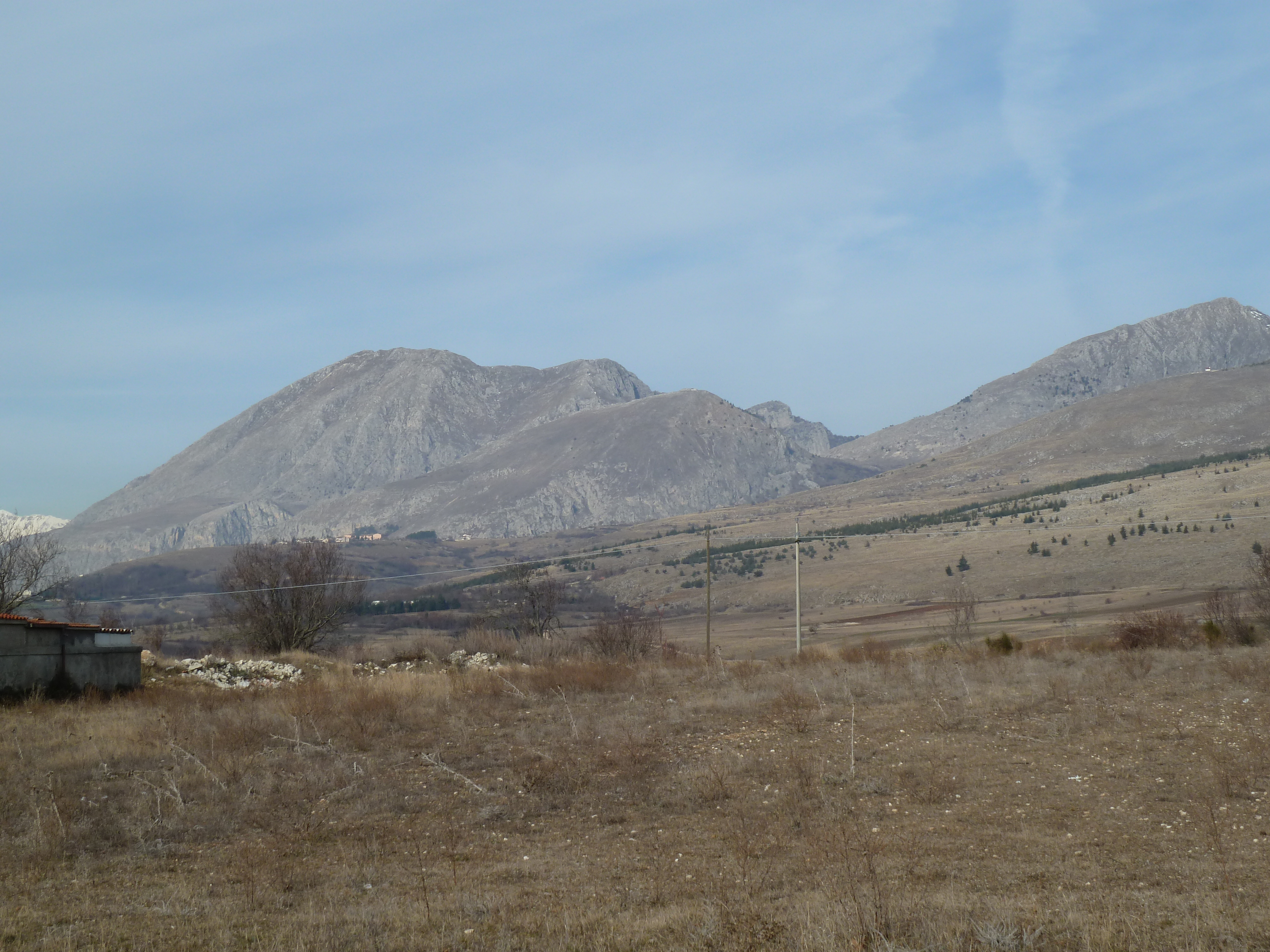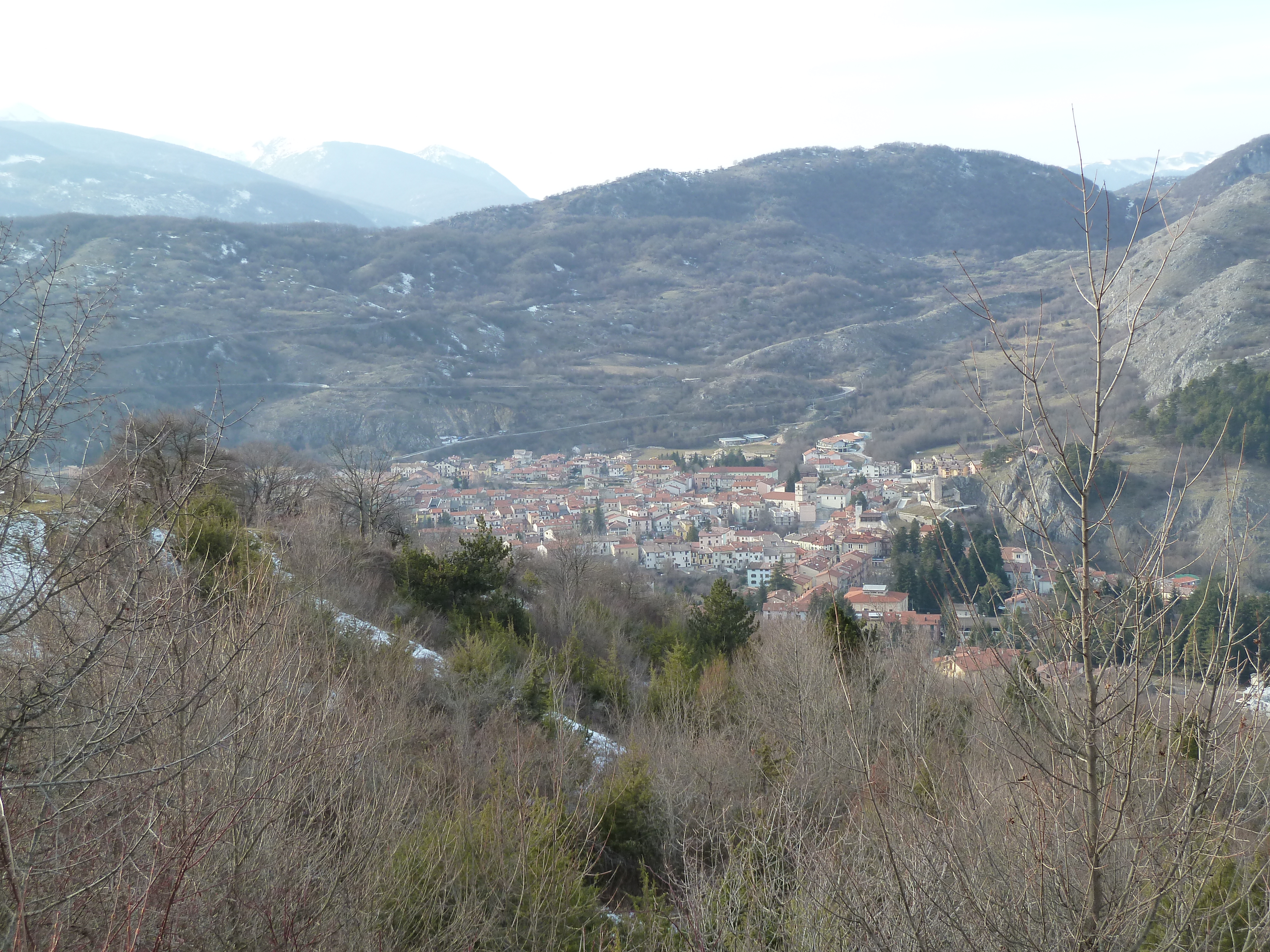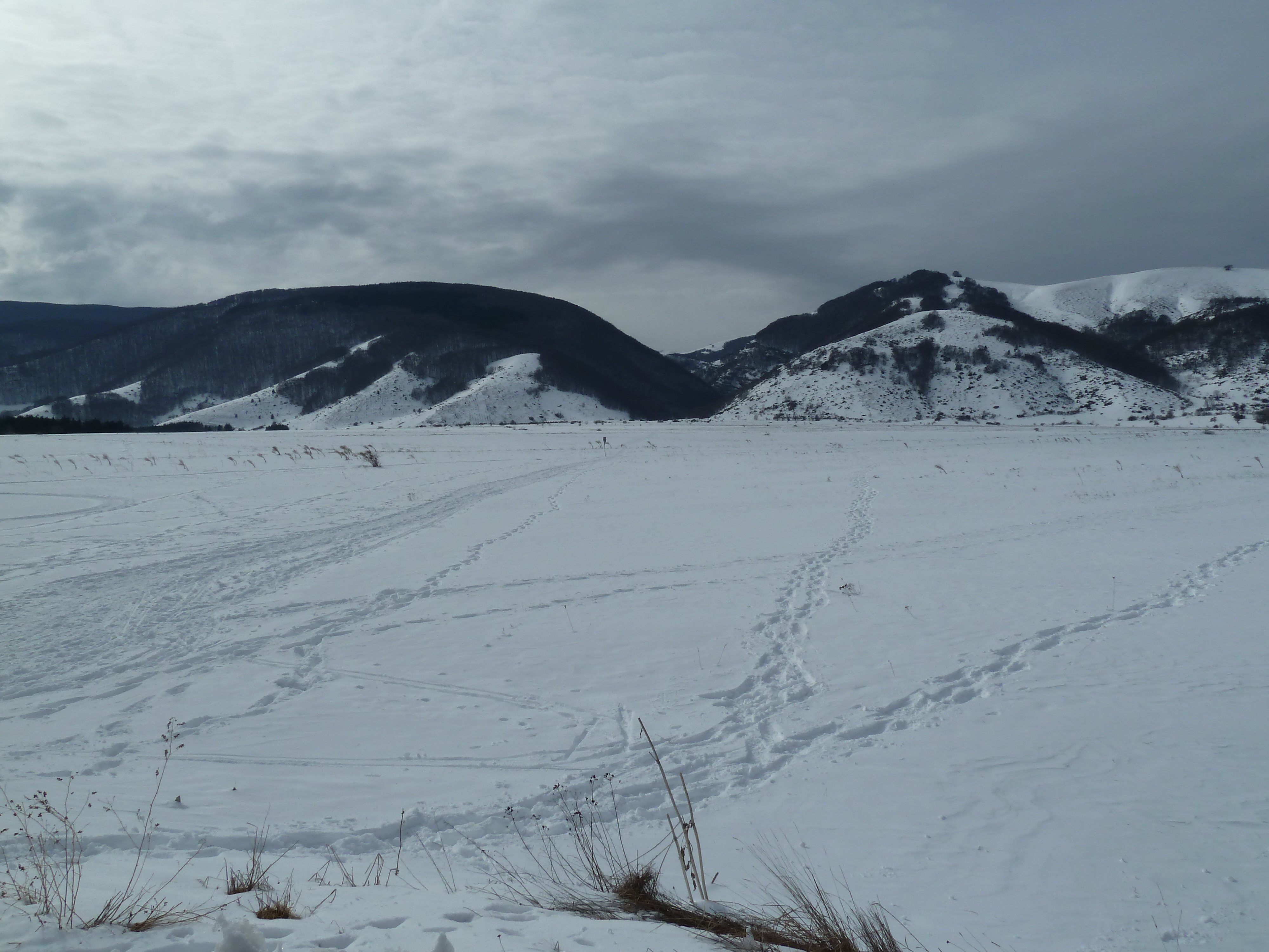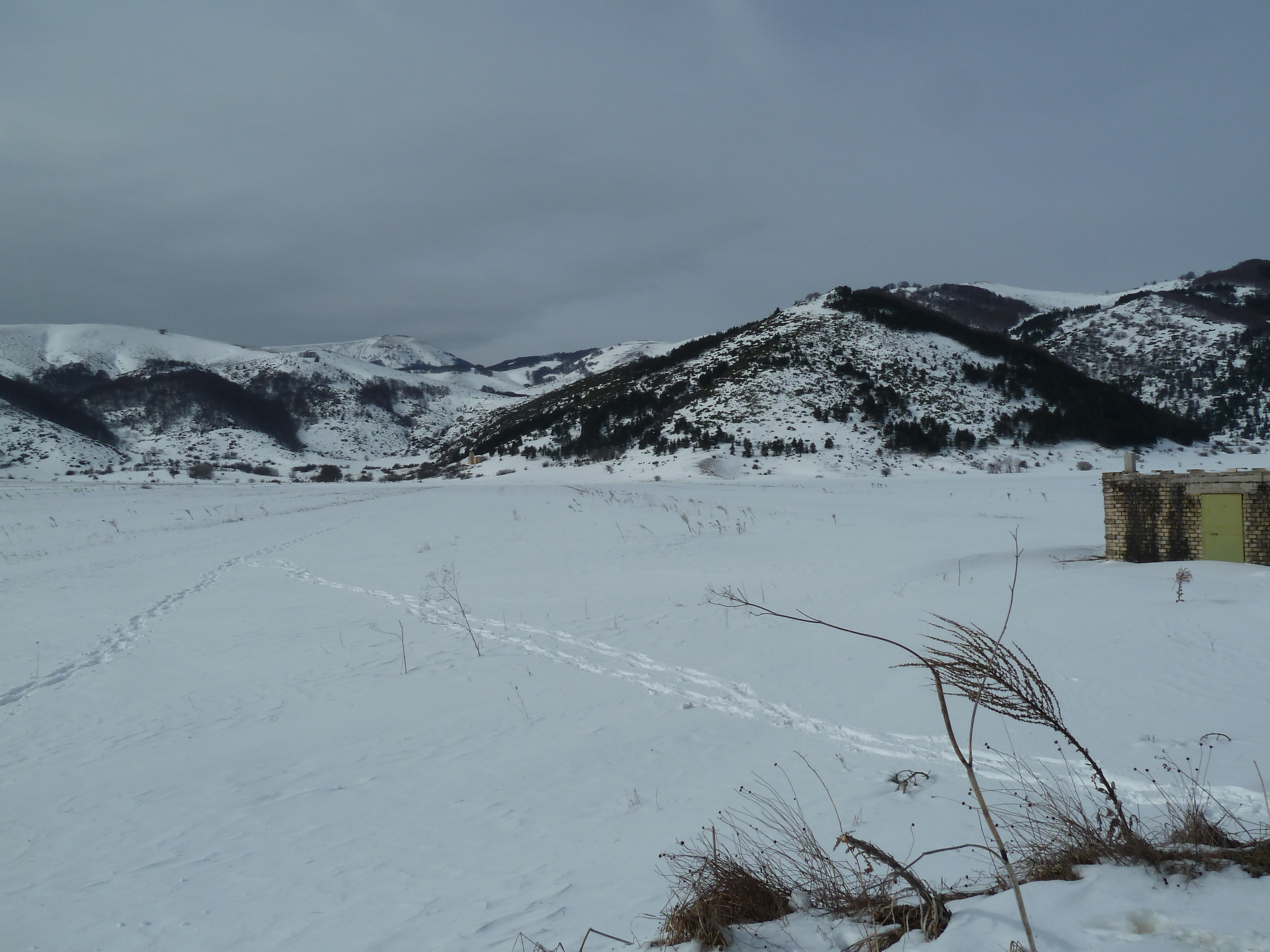 E’ una delle prime uscite di Alberto con la nuova KTM ed il termometro ambientale che ha a bordo come accessorio ci sarà d’aiuto a testimoniare la nostra determinazione ad essere motociclisti non solo…della domenica! Usciti a Pescina e dopo aver rinforzato l’abbigliamento imbocchiamo la SS 5 verso il valico di Forca Caruso che quest’anno mi ha già visto passarci proprio ad inizio di gennaio. Soprattutto la discesa ci vede guardinghi ma nonostante la nuvolaglia scura e bassa non sembra dovrà piovere e tutto sommato poco dopo il valico si apre davanti a noi la vista bellissima verso il Gran Sasso e la valle del Tirino a nord.
