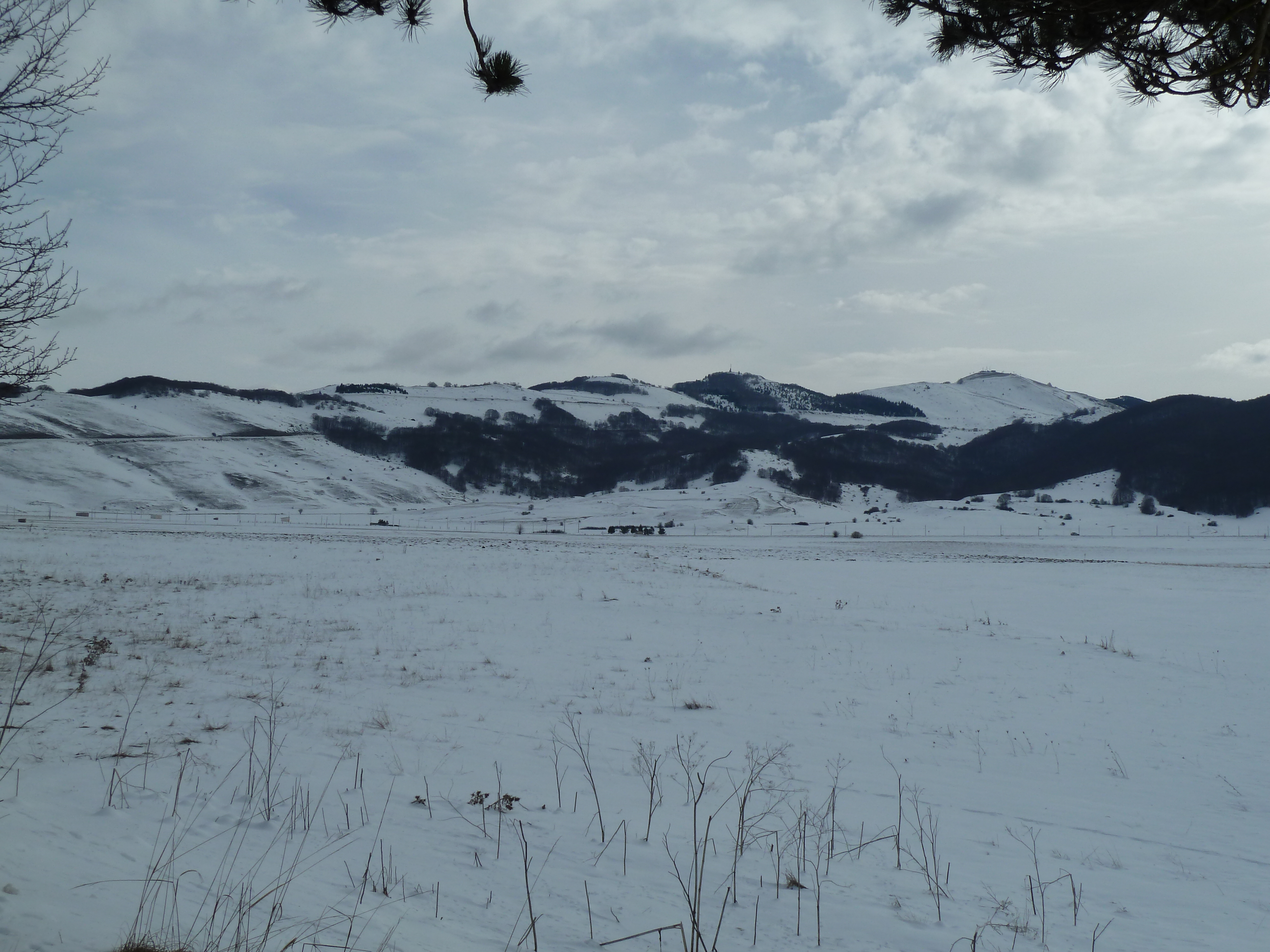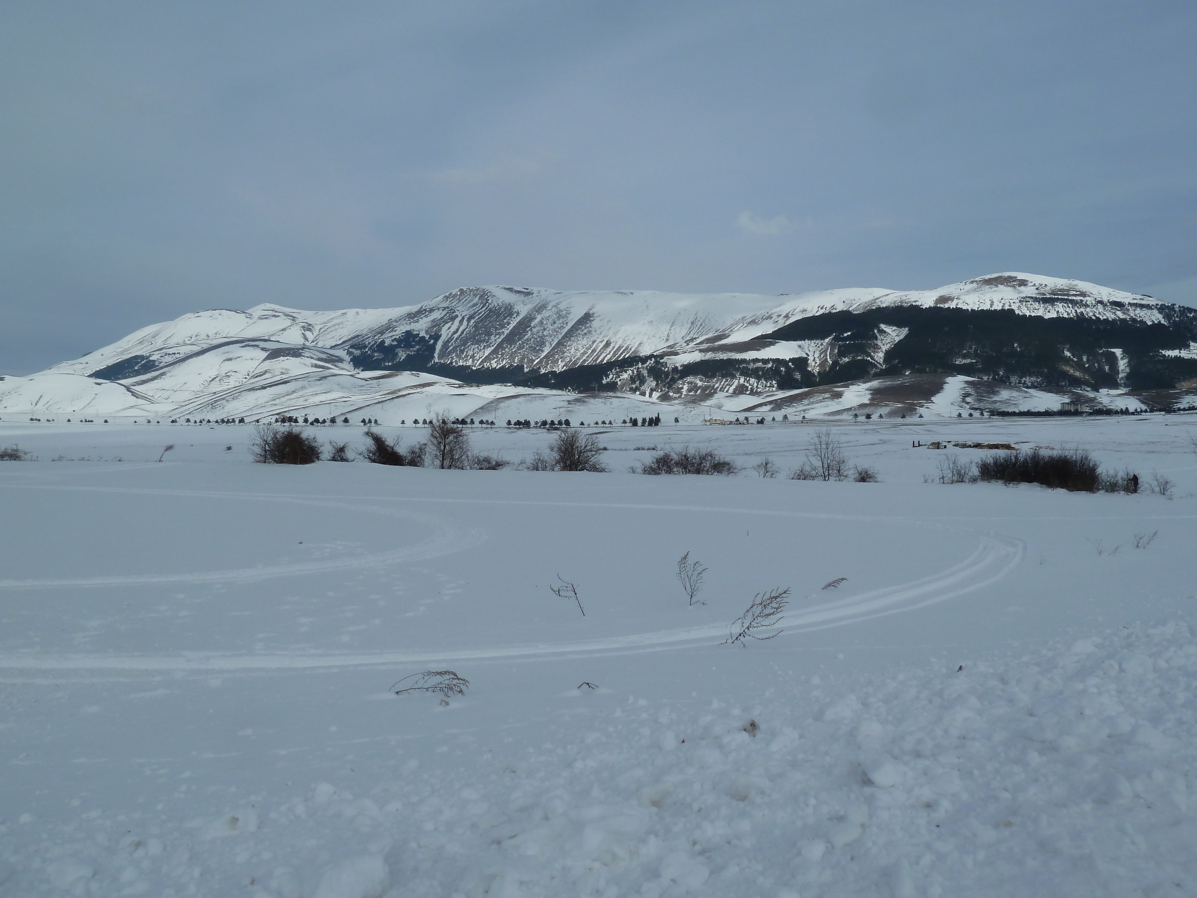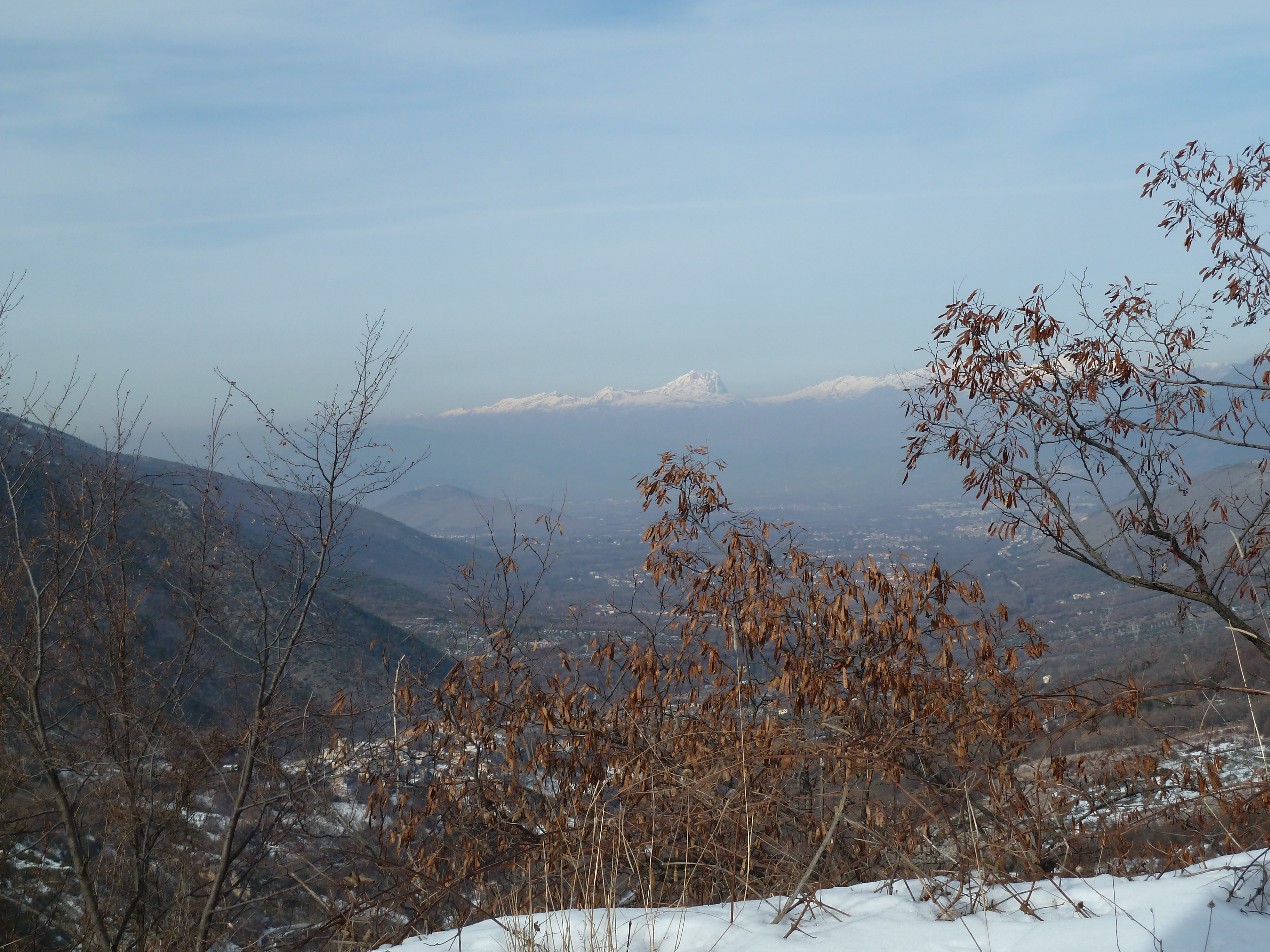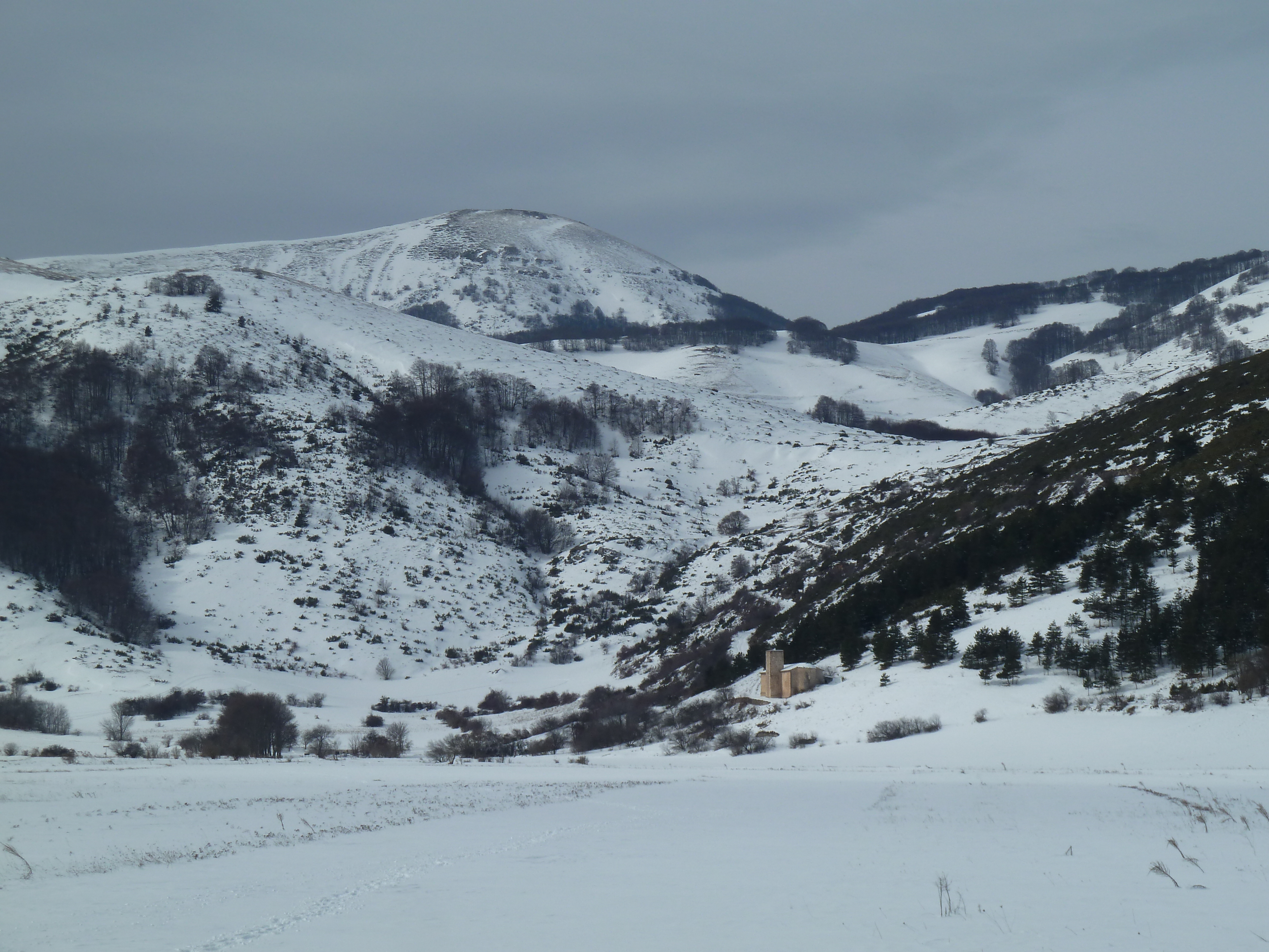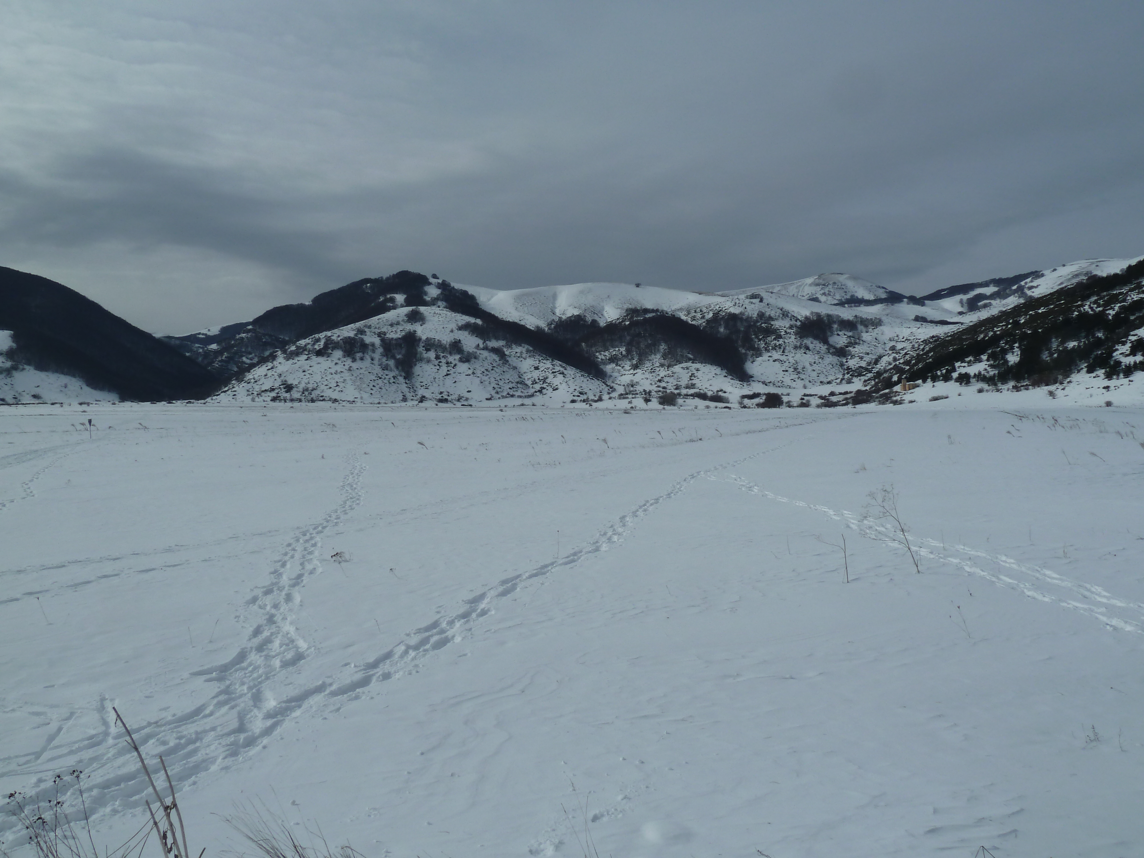 E’ una delle prime uscite di Alberto con la nuova KTM ed il termometro ambientale che ha a bordo come accessorio ci sarà d’aiuto a testimoniare la nostra determinazione ad essere motociclisti non solo…della domenica! Usciti a Pescina e dopo aver rinforzato l’abbigliamento imbocchiamo la SS 5 verso il valico di Forca Caruso che quest’anno mi ha già visto passarci proprio ad inizio di gennaio. Soprattutto la discesa ci vede guardinghi ma nonostante la nuvolaglia scura e bassa non sembra dovrà piovere e tutto sommato poco dopo il valico si apre davanti a noi la vista bellissima verso il Gran Sasso e la valle del Tirino a nord.