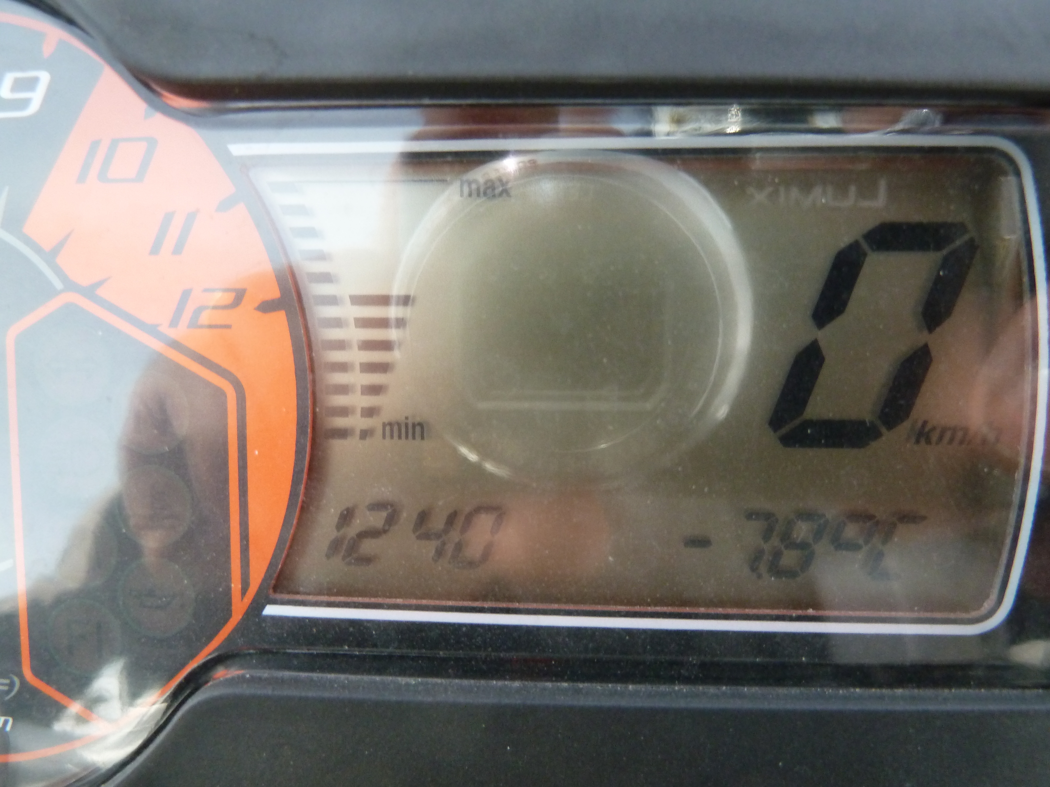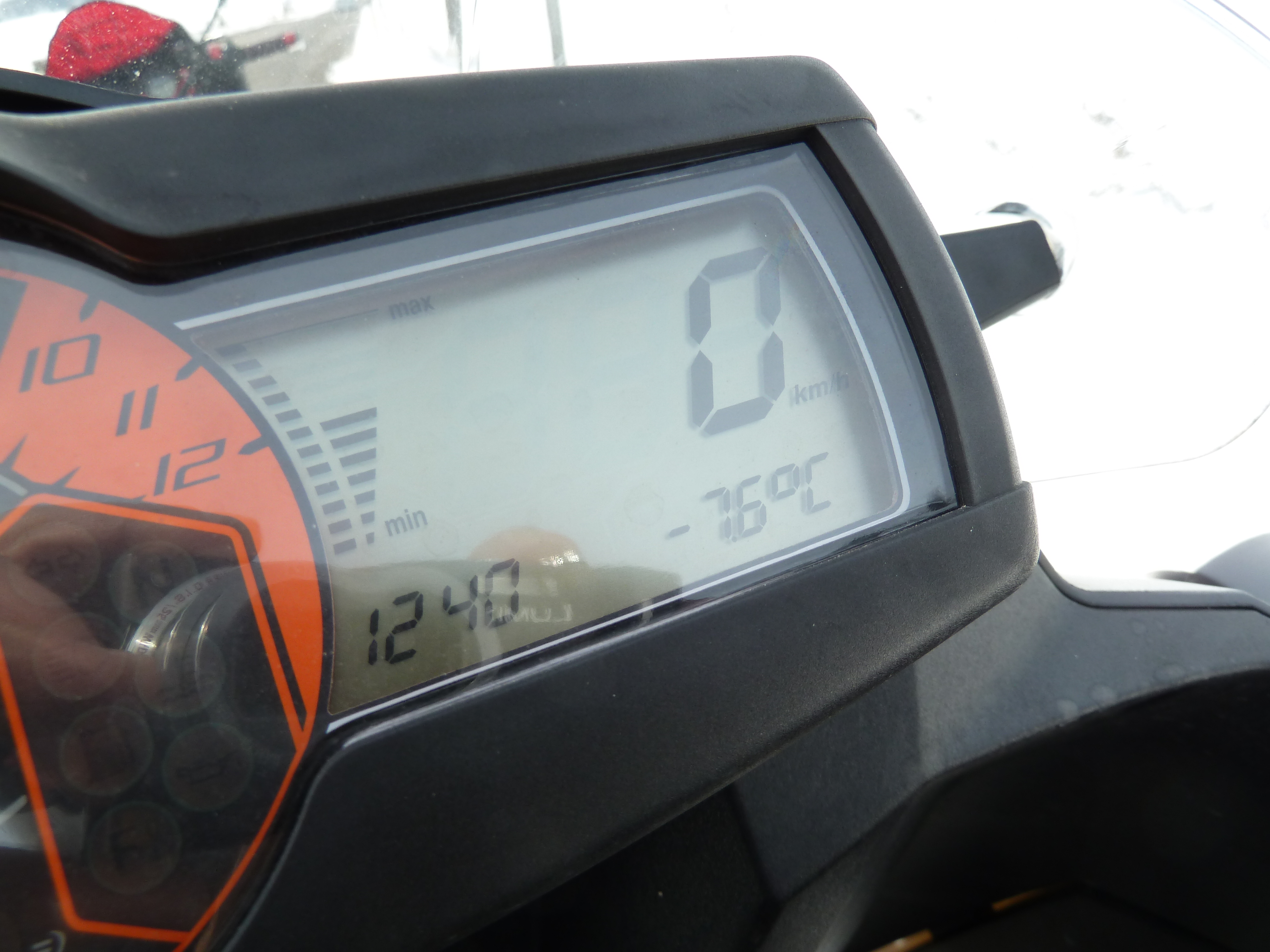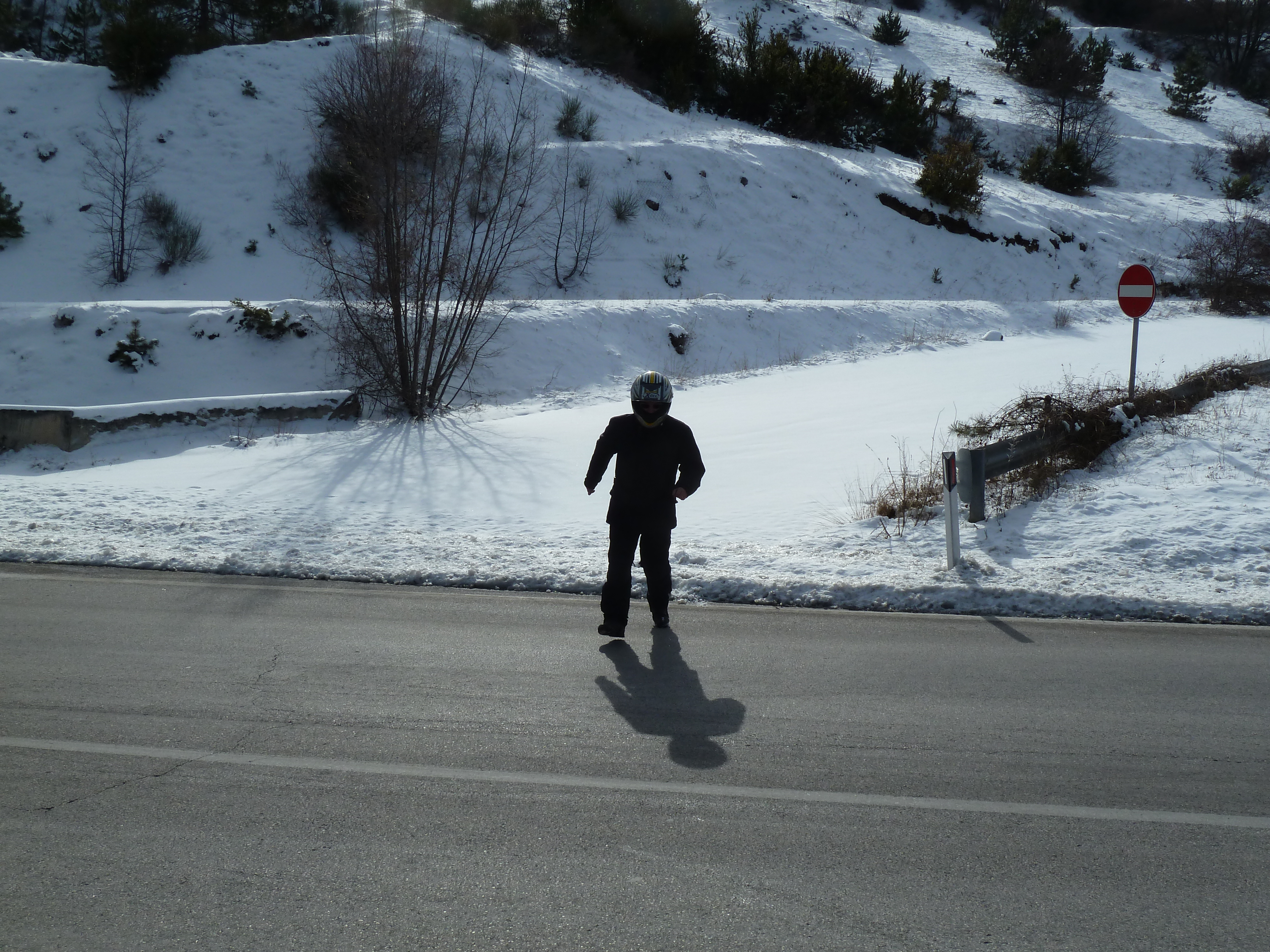 Mi chiama e mi indica il termometro della sua moto: –8! E noi due in moto, niente male! E’ interessante notare anche gli sguardi attoniti di automobilisti e passanti che osservano quei due in motocicletta con la neve e col freddo…