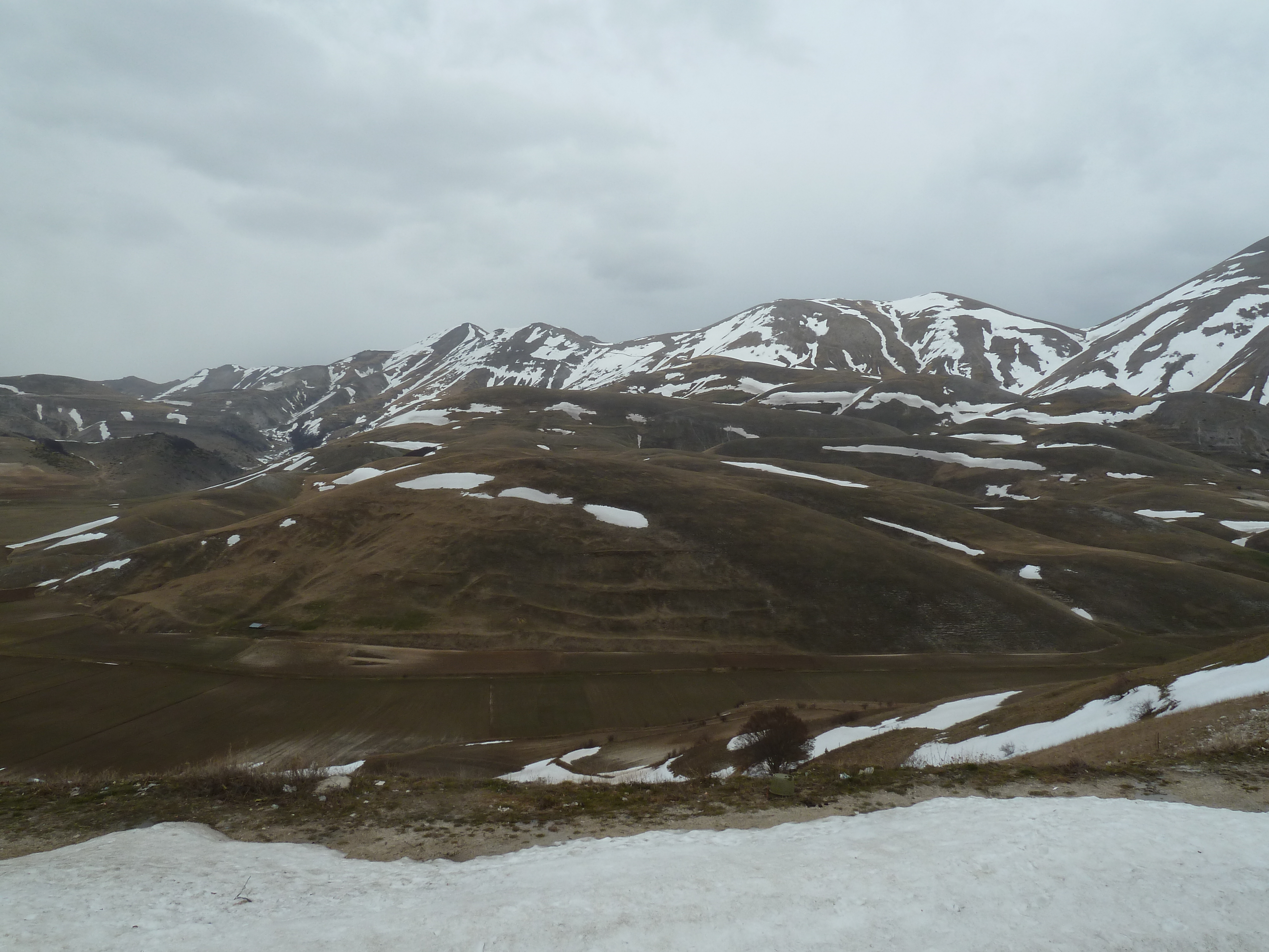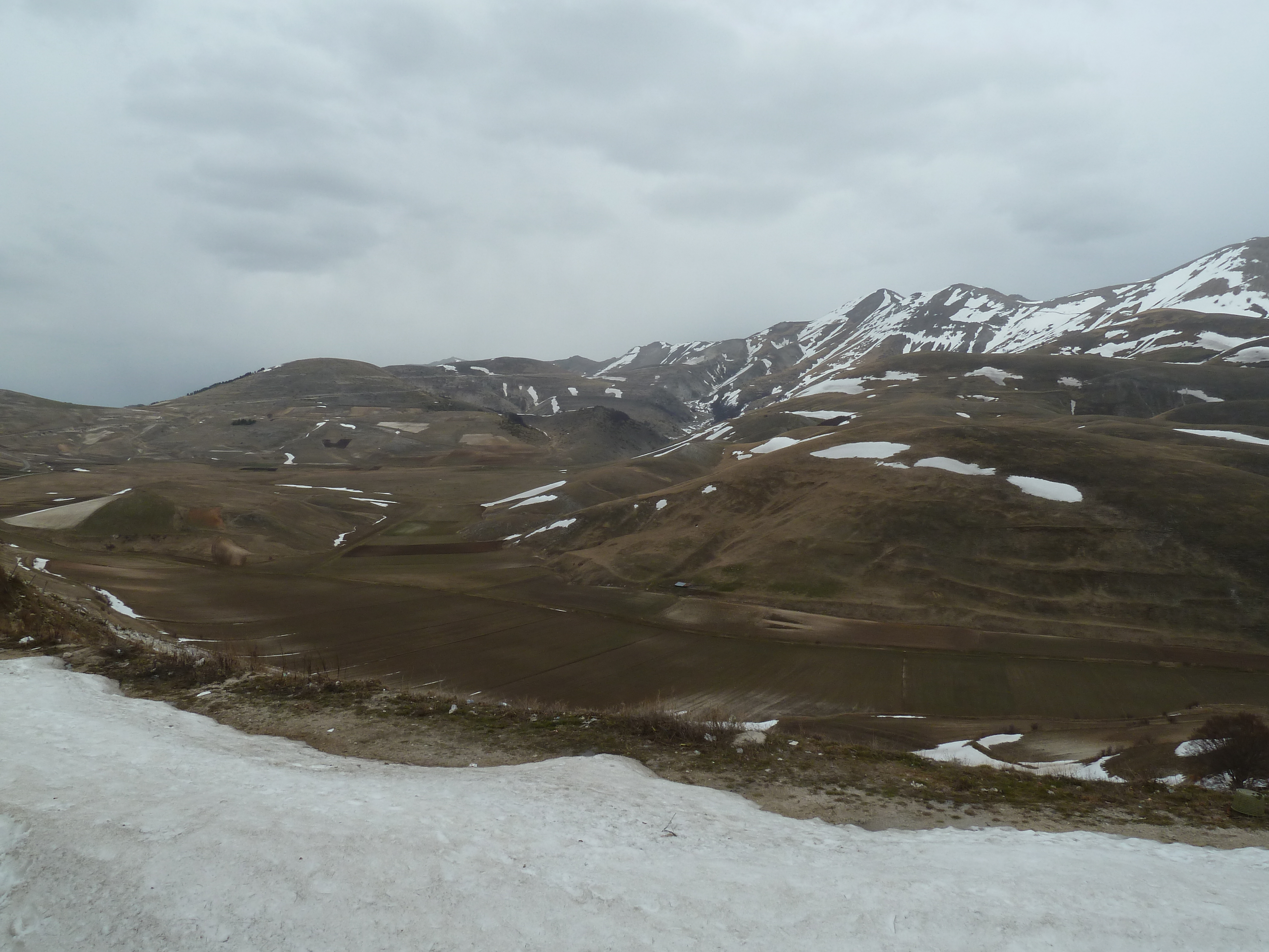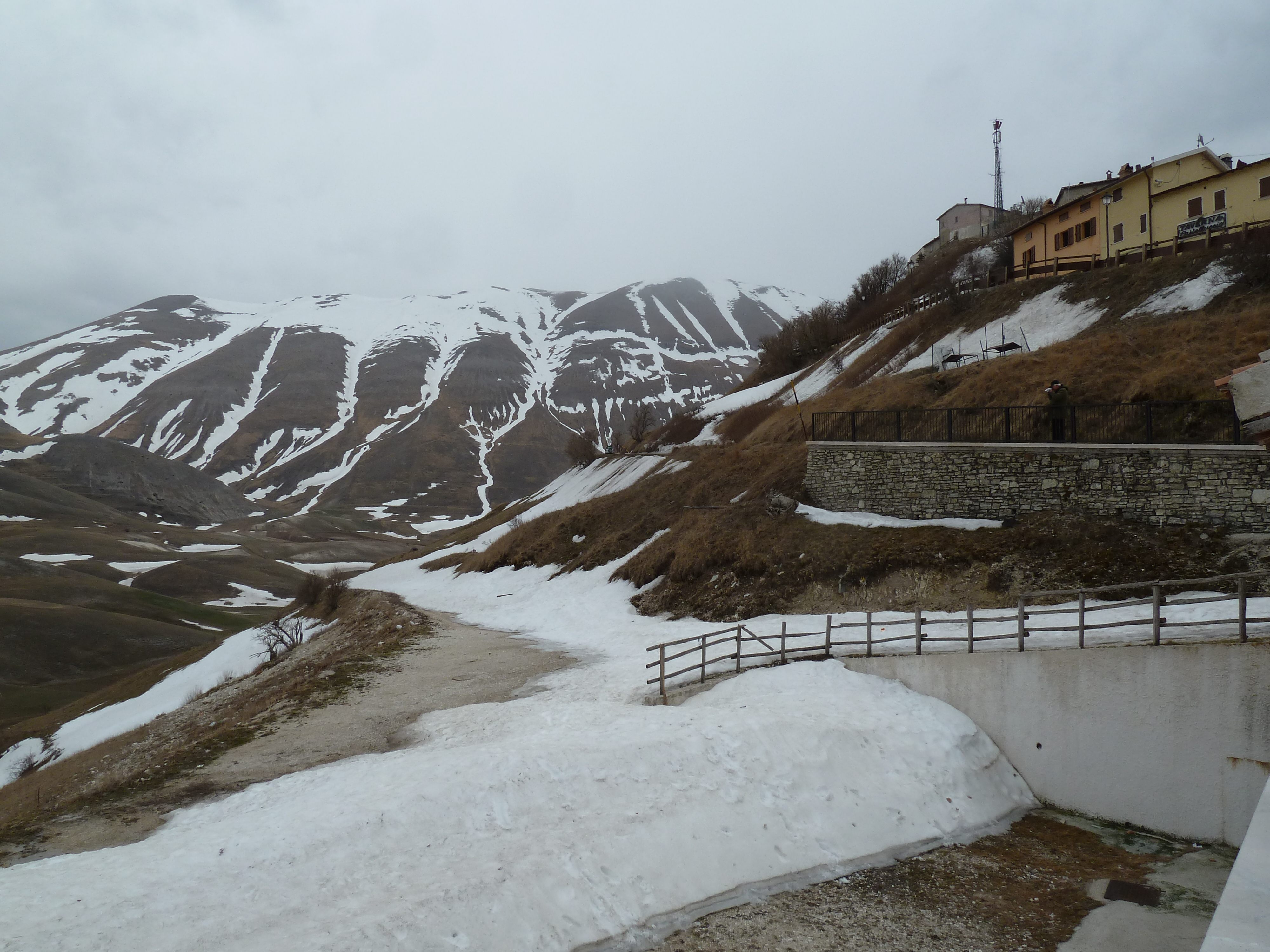 Da Visso puntiamo dritti verso Castelluccio di Norcia. Preferisco arrivare da nord in questo splendido posto e la vista degli altopiani prima e dopo il paesello tra i più alti dell’appennino (credo che Rocca di Cambio, AQ, lo superi di poco seguito per pochi metri da Capracotta, IS, in Molise). Il Monte Vettore, terza cima dell’Appennino, svetta ancora abbastanza innevato.