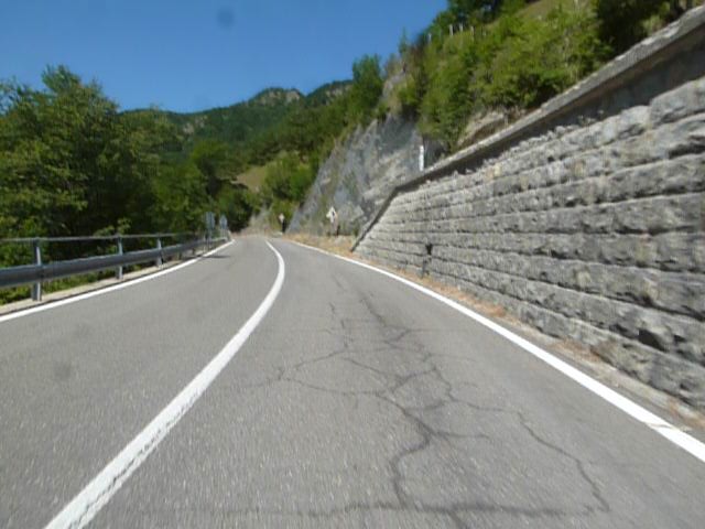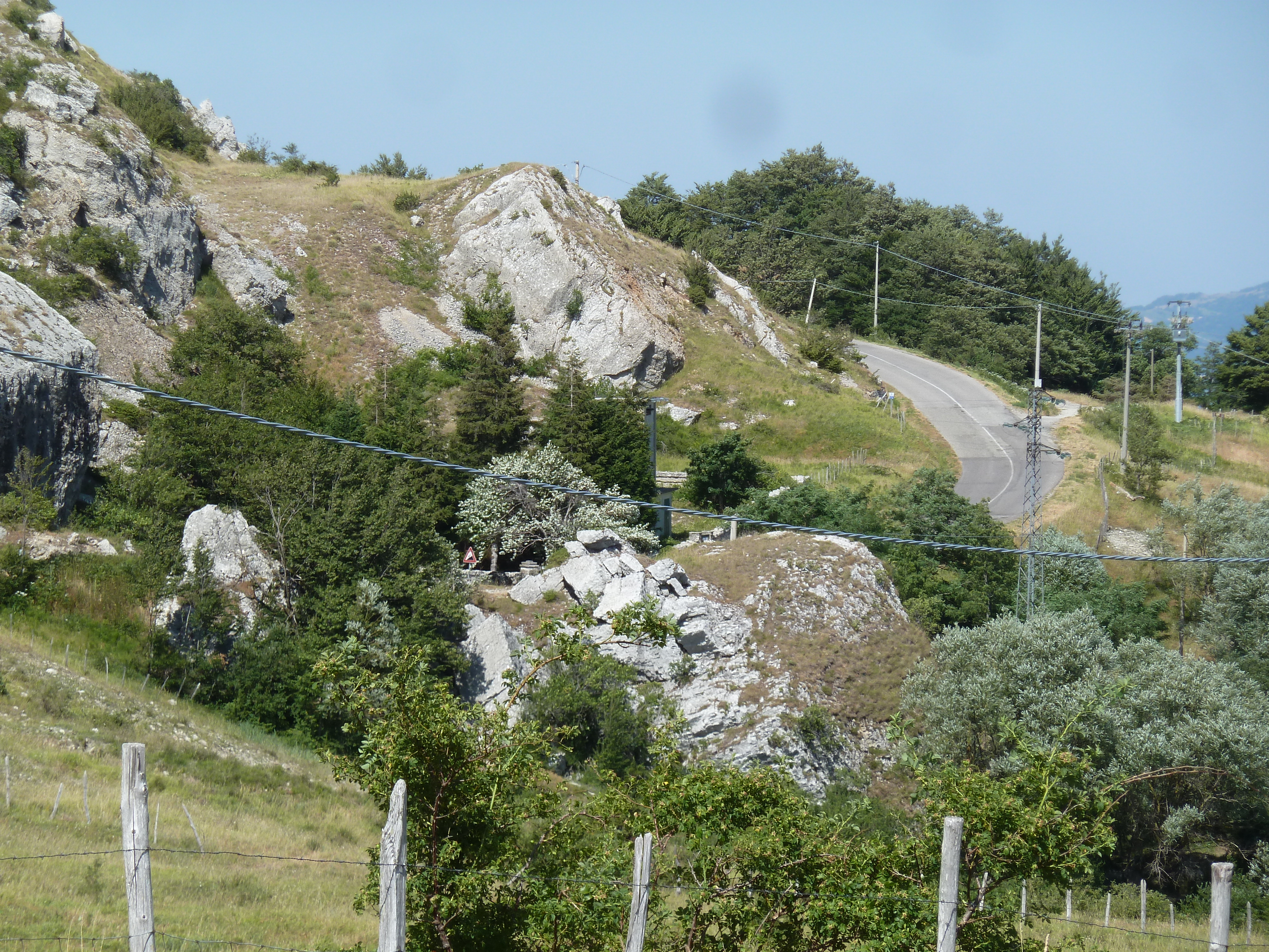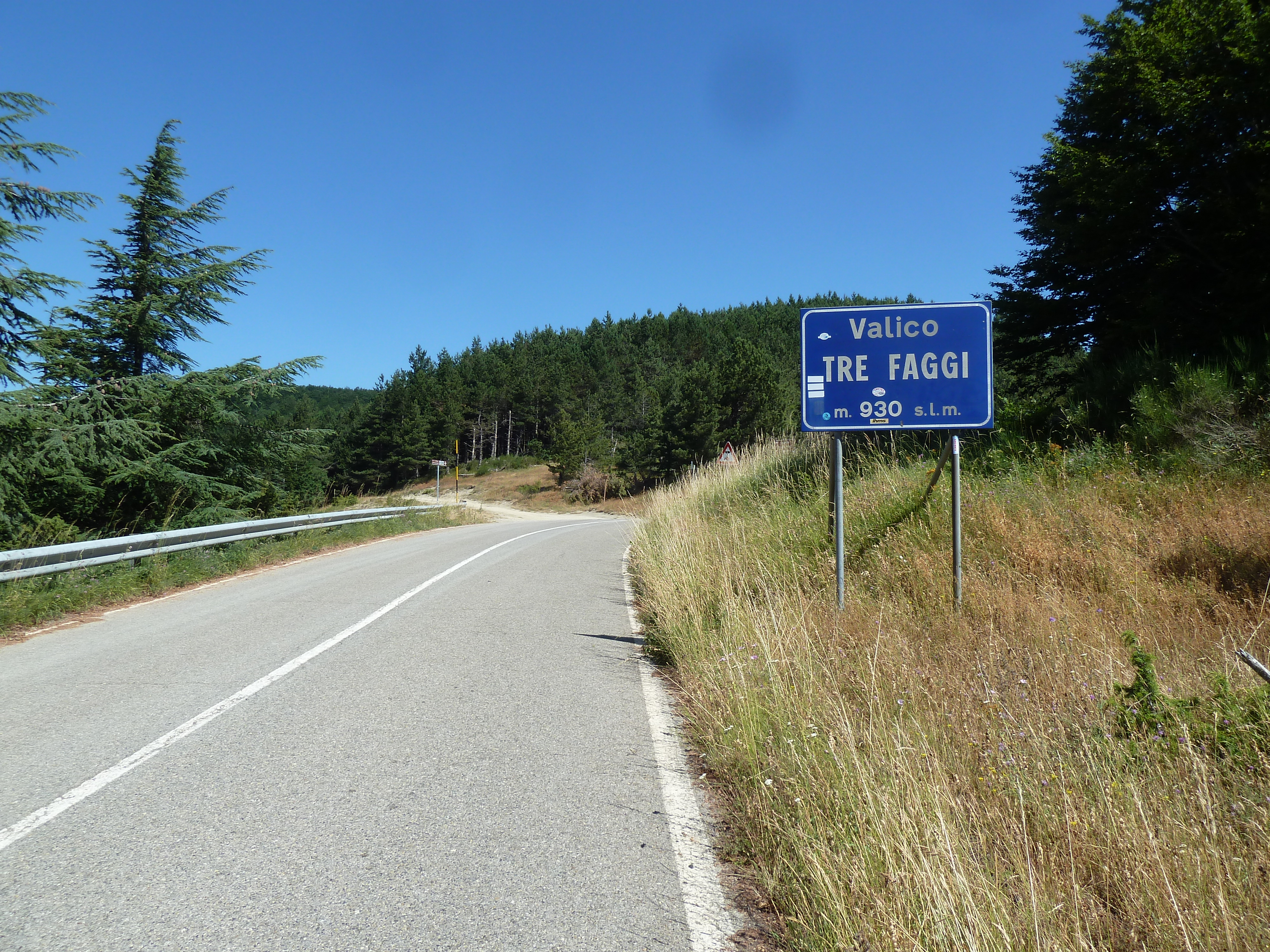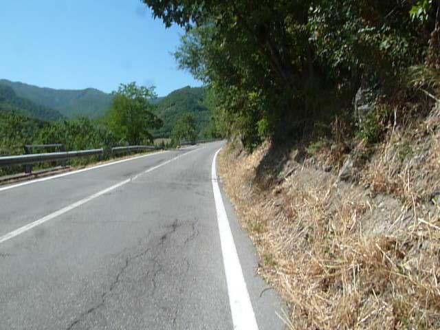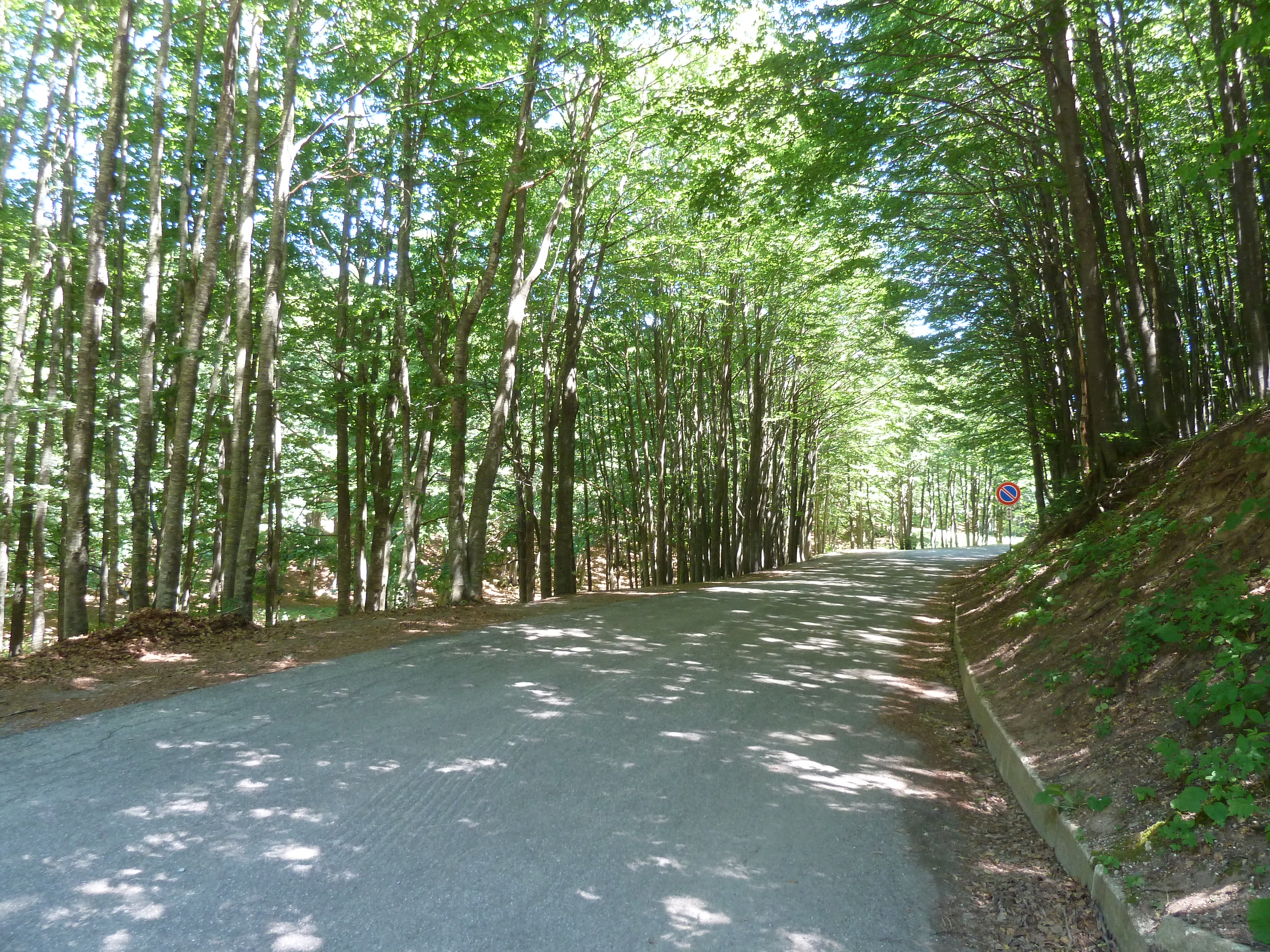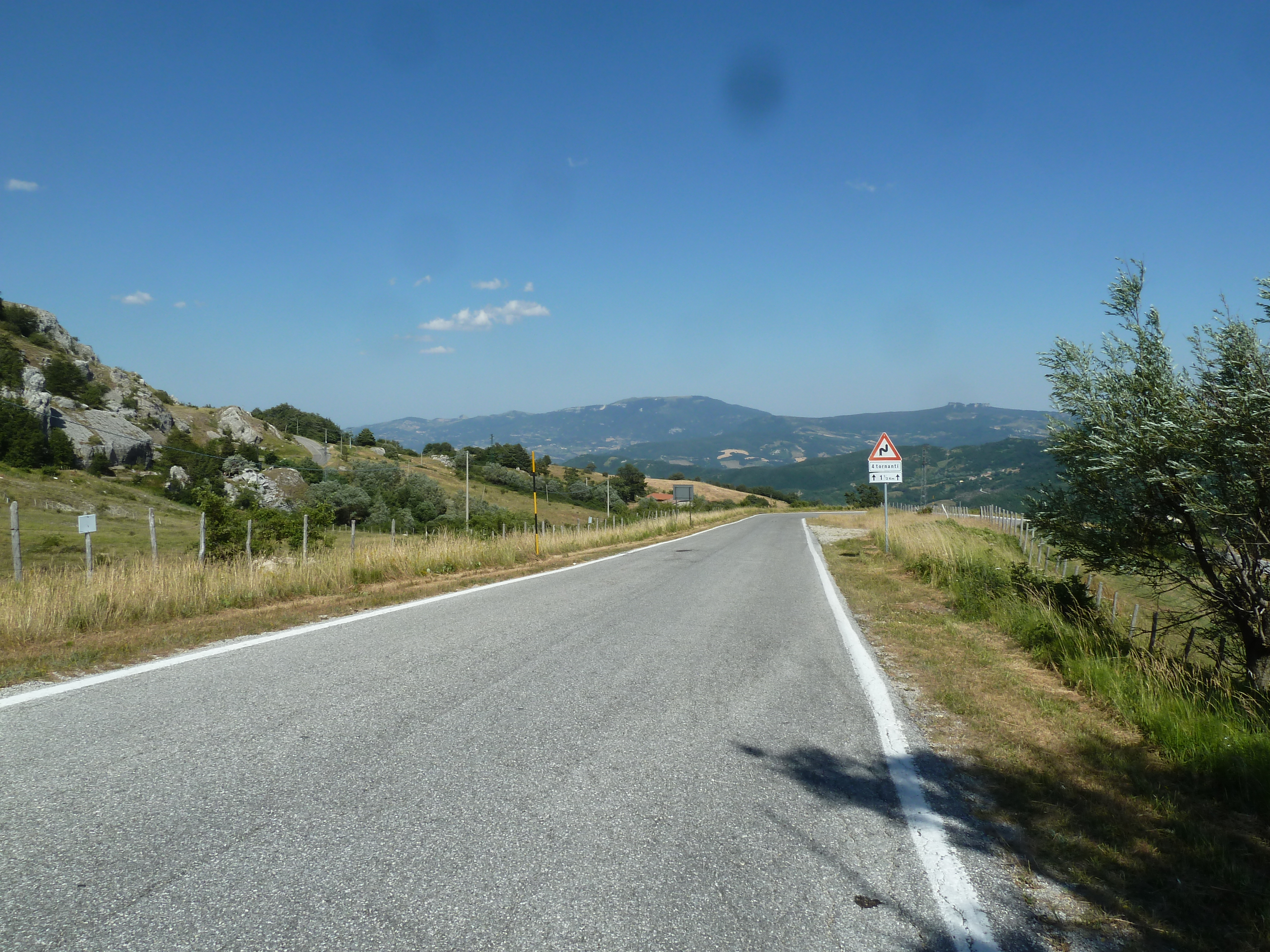 Ci ritempriamo nel fresco di Passolanciano e poi via. La discesa verso Lettomanoppello si apre in una stretta valle molto bella sulla SP 65 ancora segnata sul fianco sinistro dai segni di un incendio di diversi anni fa e con all’orizzonte nella foschia della calura pomeridiana il Gran Sasso ed il Corno Grande. Una tirata verso la valle del Pescara da Scafa a Popoli sulla SS 5 Tiburtina e da lì sempre sulla SS 5 il tratto bellissimo ed ottimamente conosciuto (quest’anno l’avrò fatto 4 o 5 volte!) che da Raiano risale le gole di San Venanzio ed attraverso il valico di Forca Caruso riporta a Collarmele.