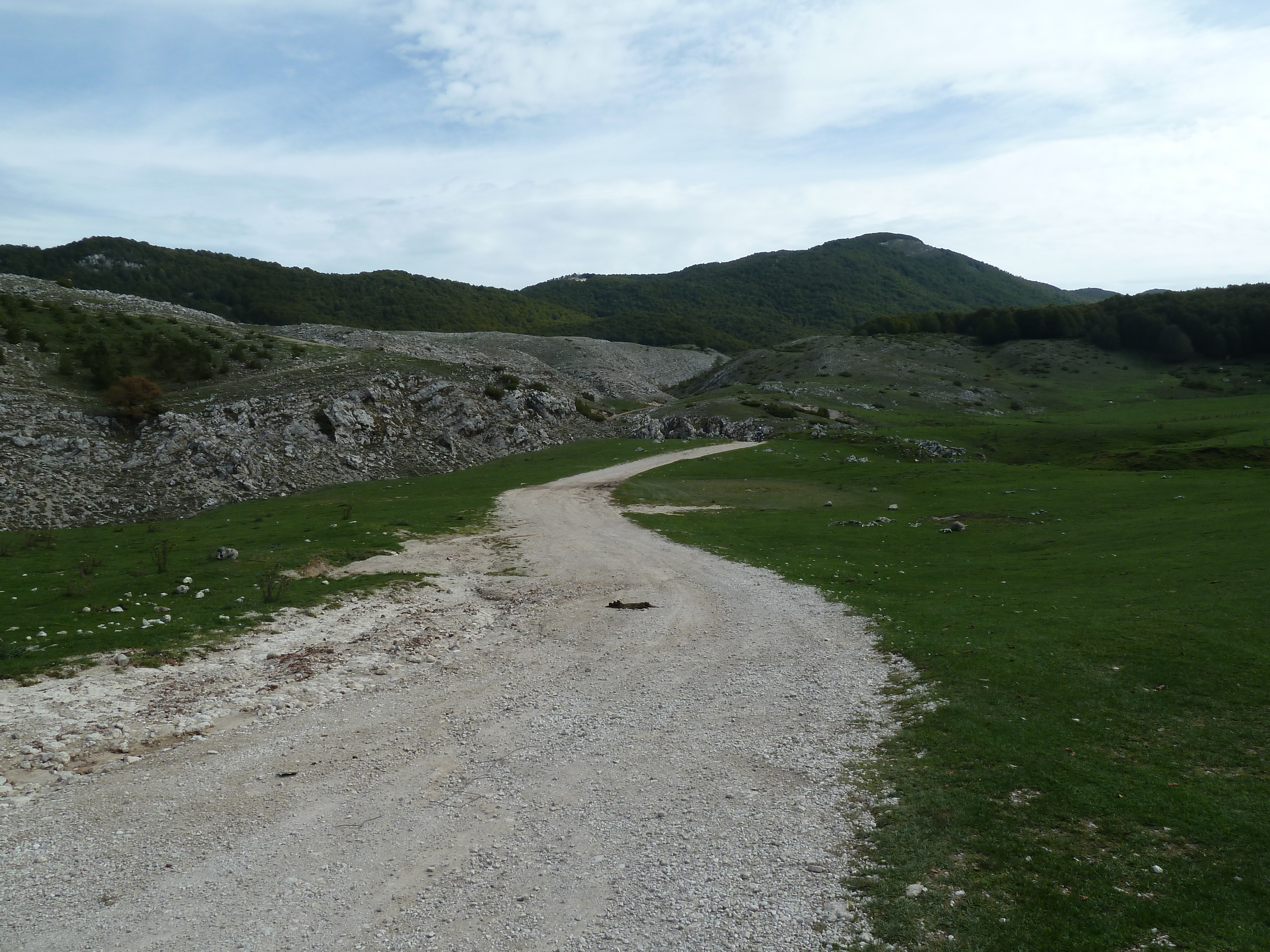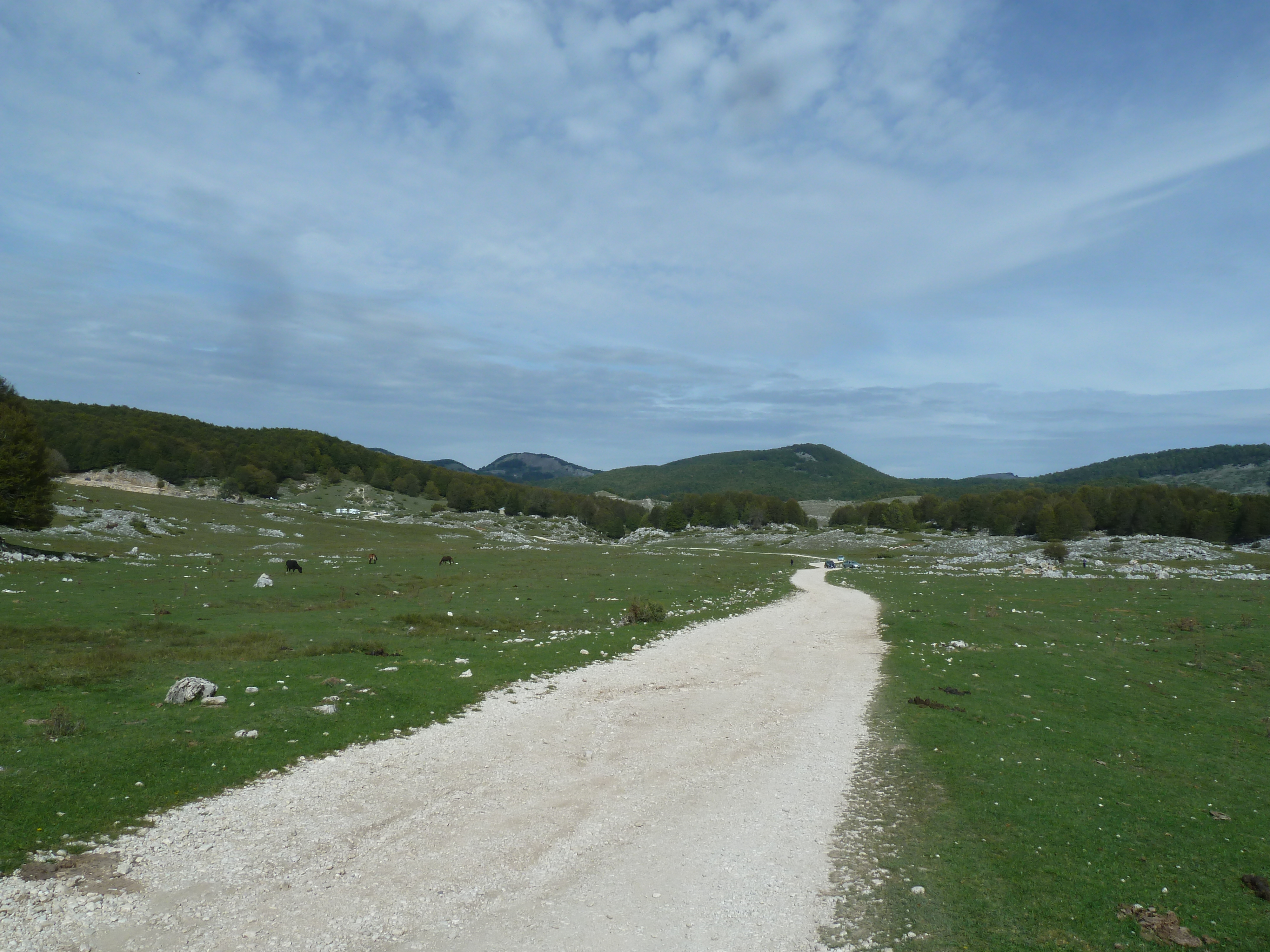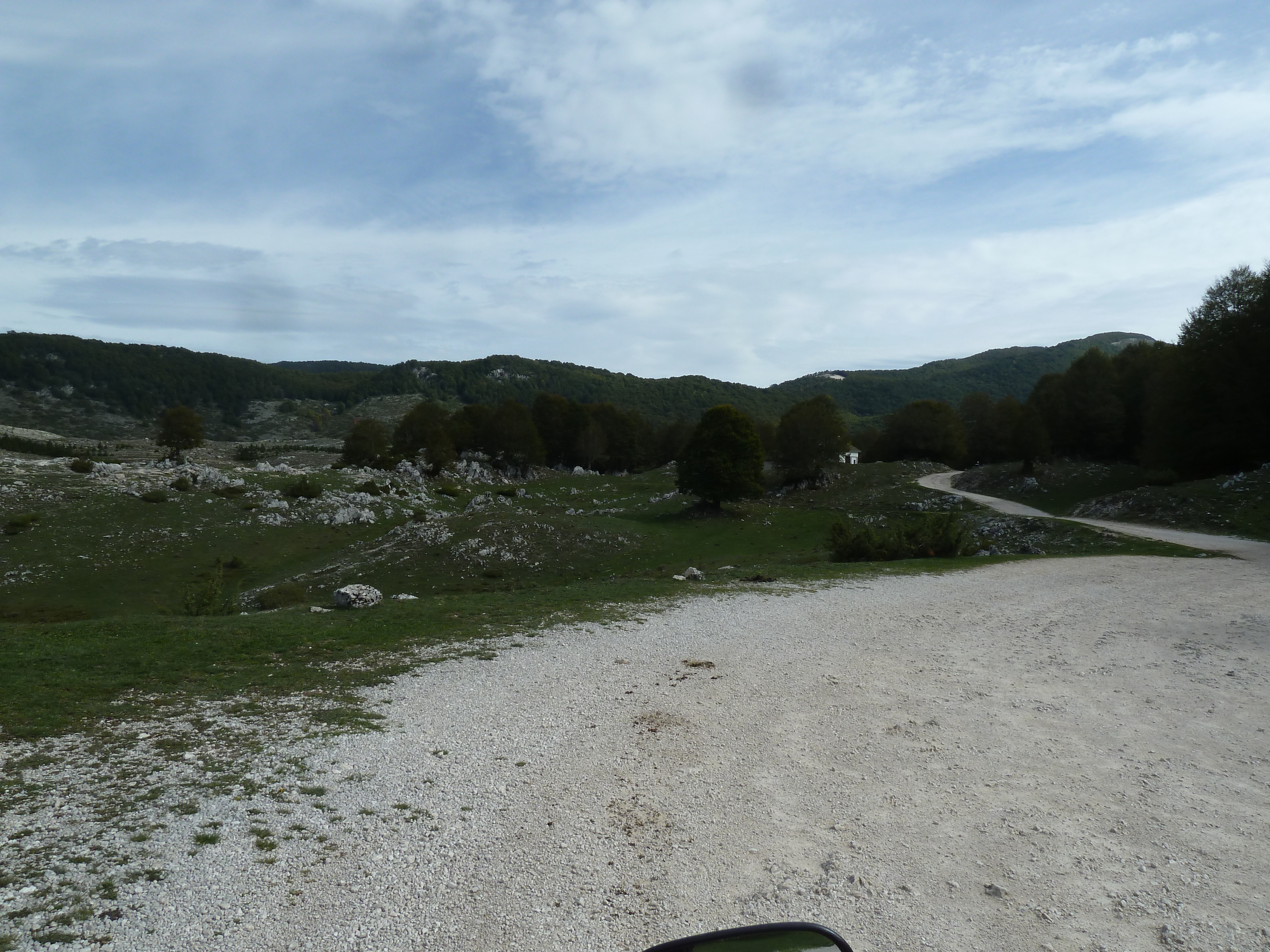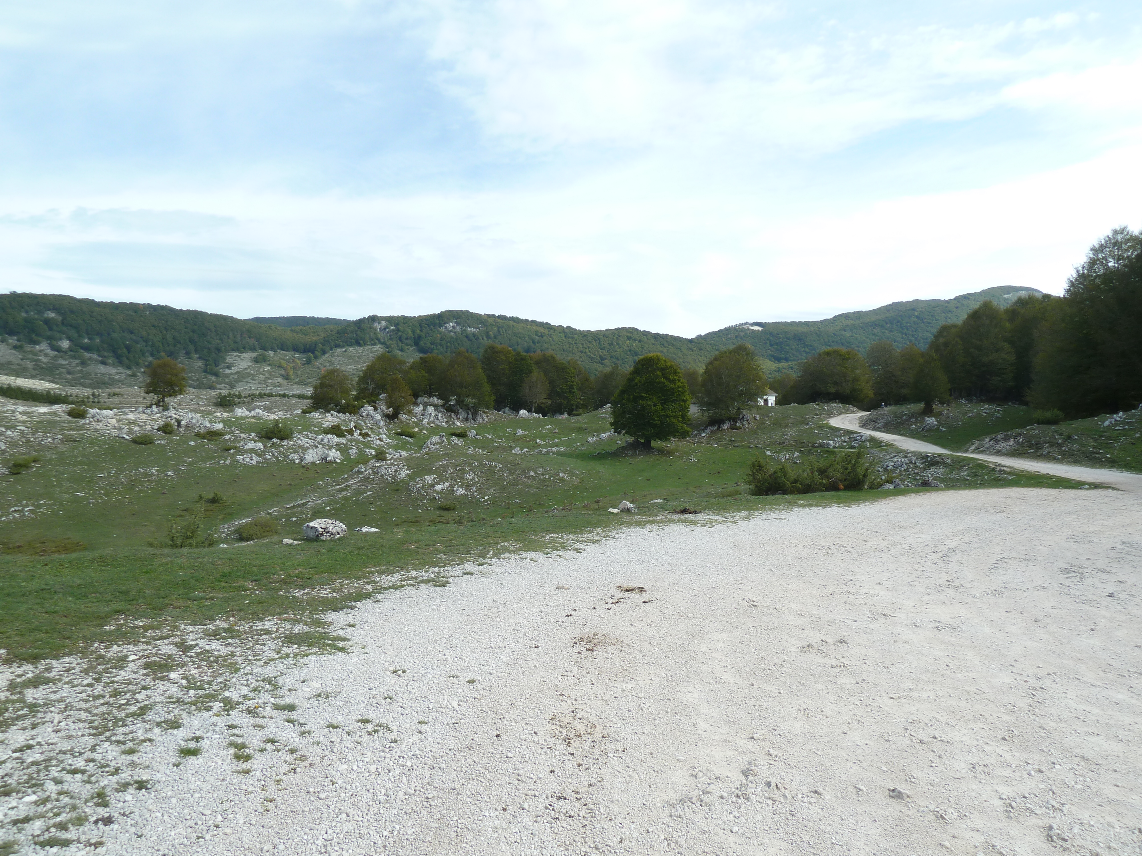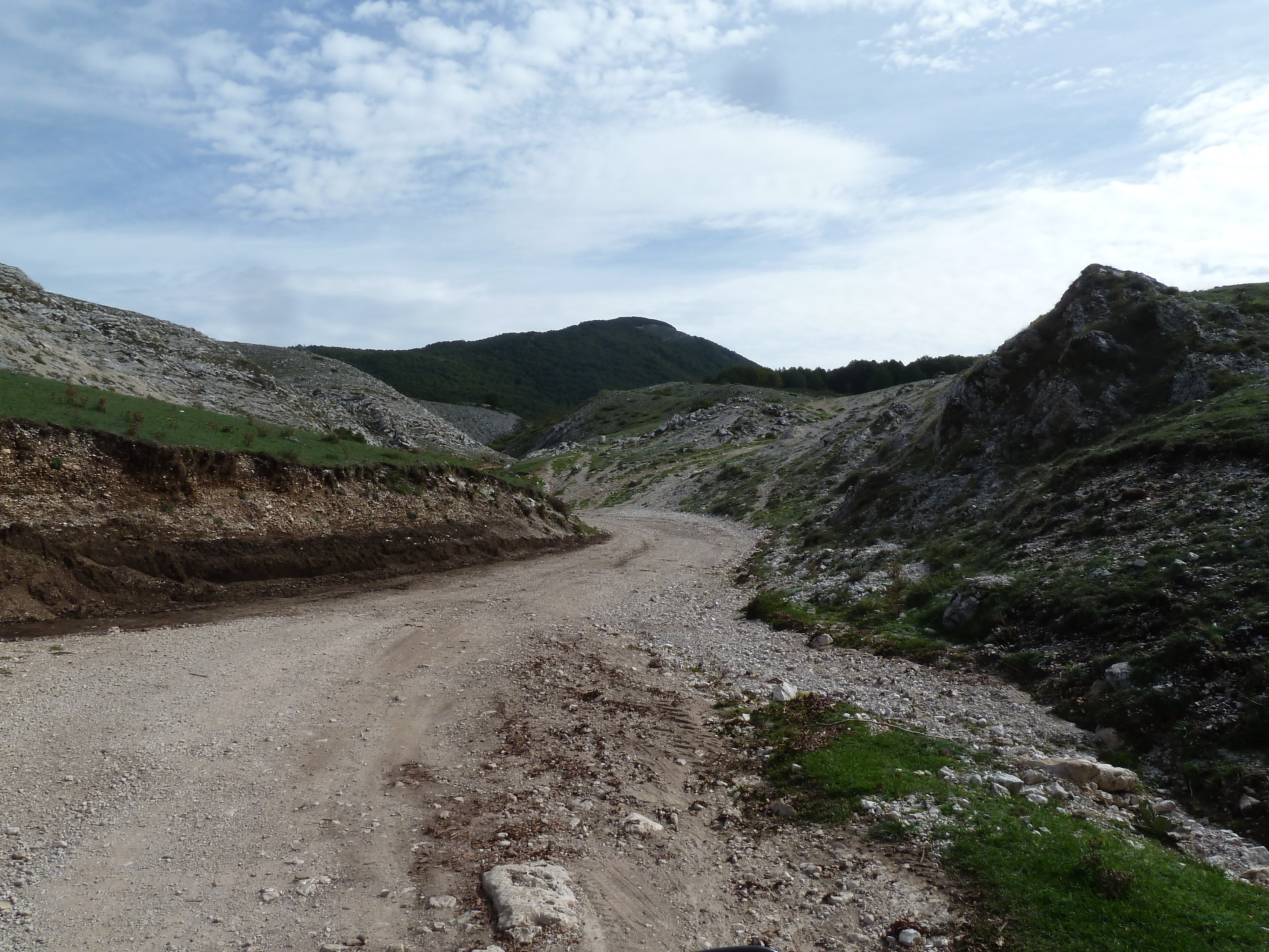 Il tratto iniziale della strada passa in quota ed offre scorci molto belli verso i Simbruini e dopo aver superato un santuario (oggi c’era una ressa di persone e macchine che inizialmente c’ha fatto temere che la strada fosse chiusa!) inizia la strada bianca. Classico paesaggio appenninico d’altopiano molto bello ed il gusto di percorrere la strada bianca a tratti parecchio dissestata è comunque sempre interessante a provarsi!