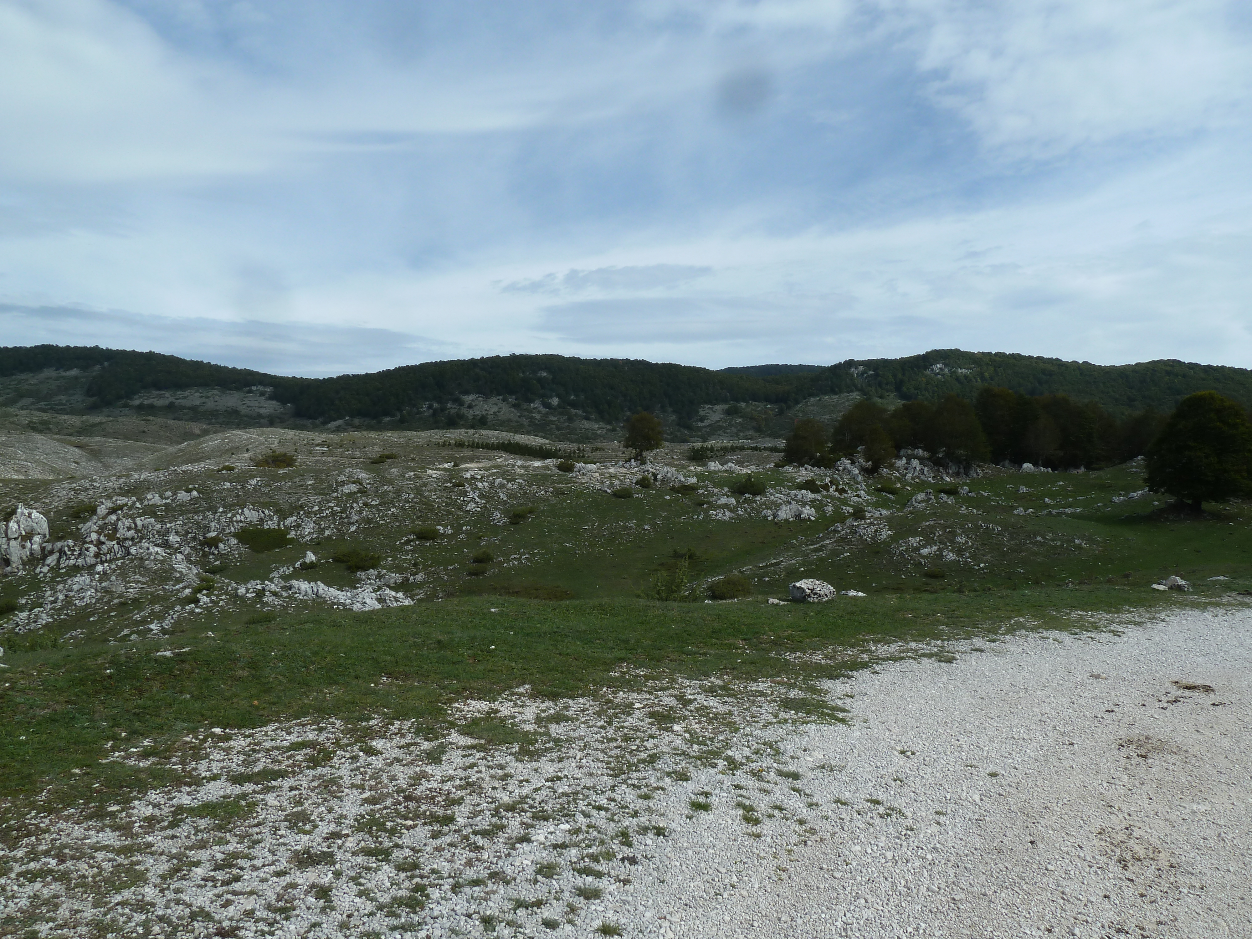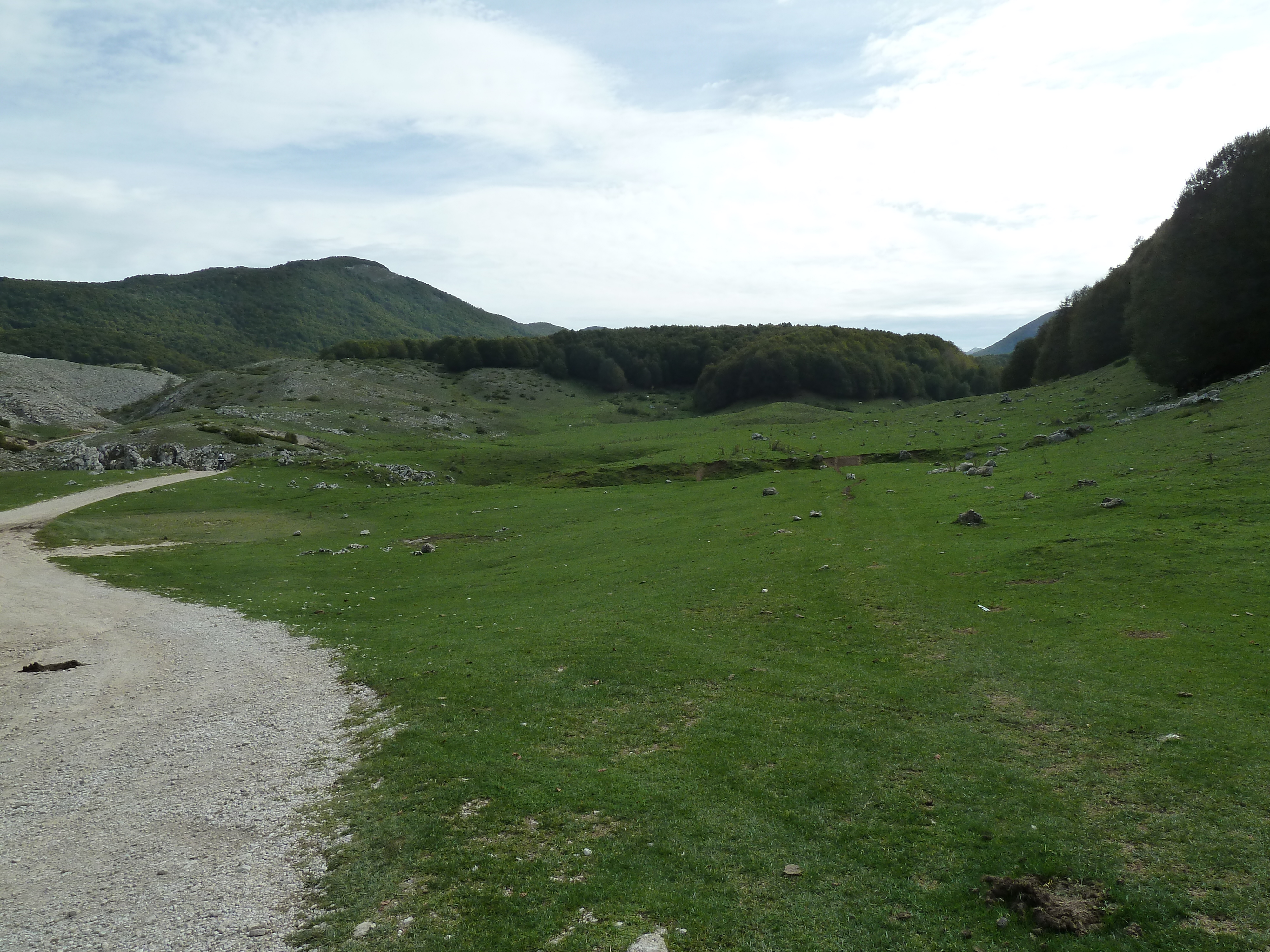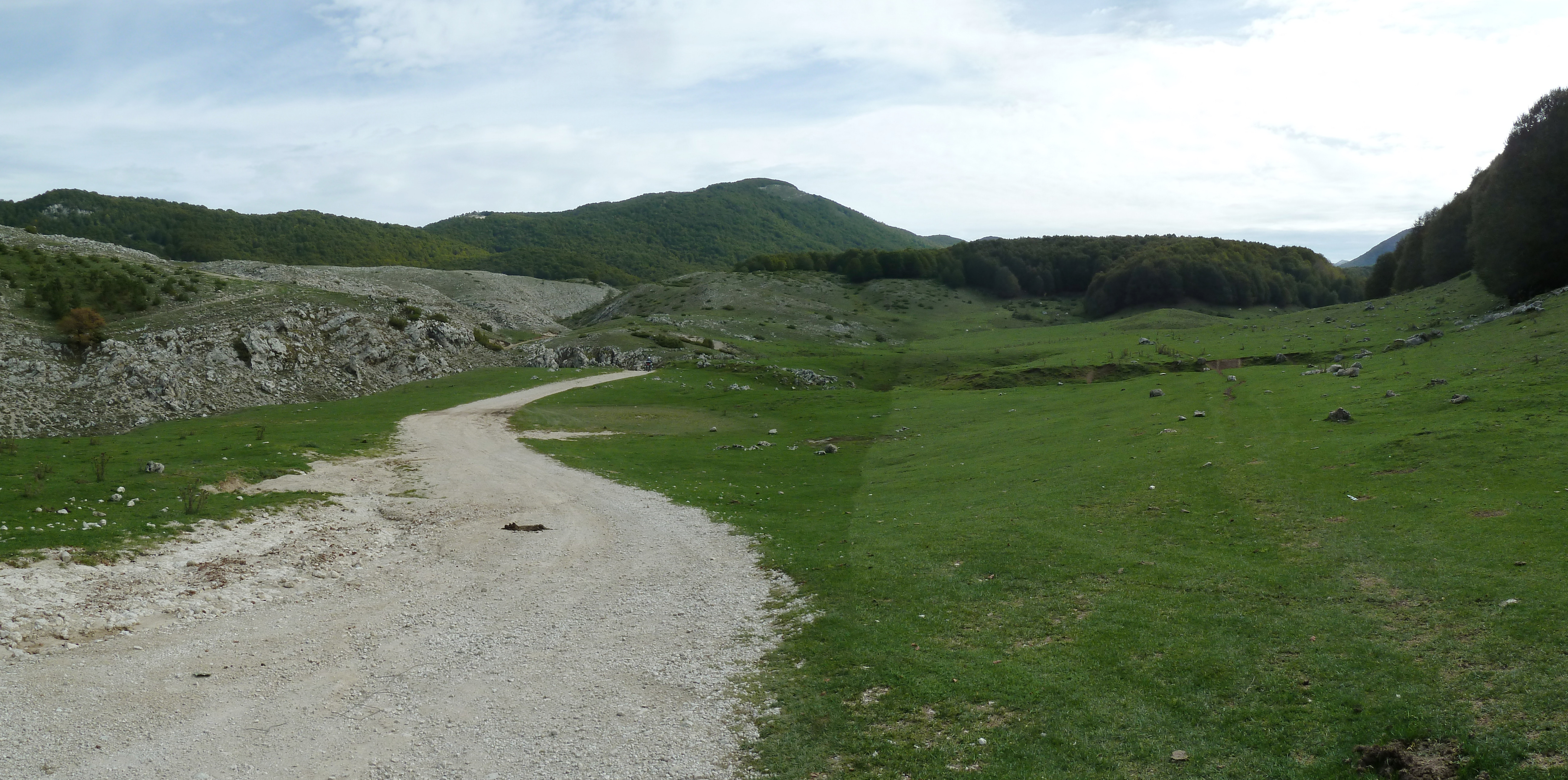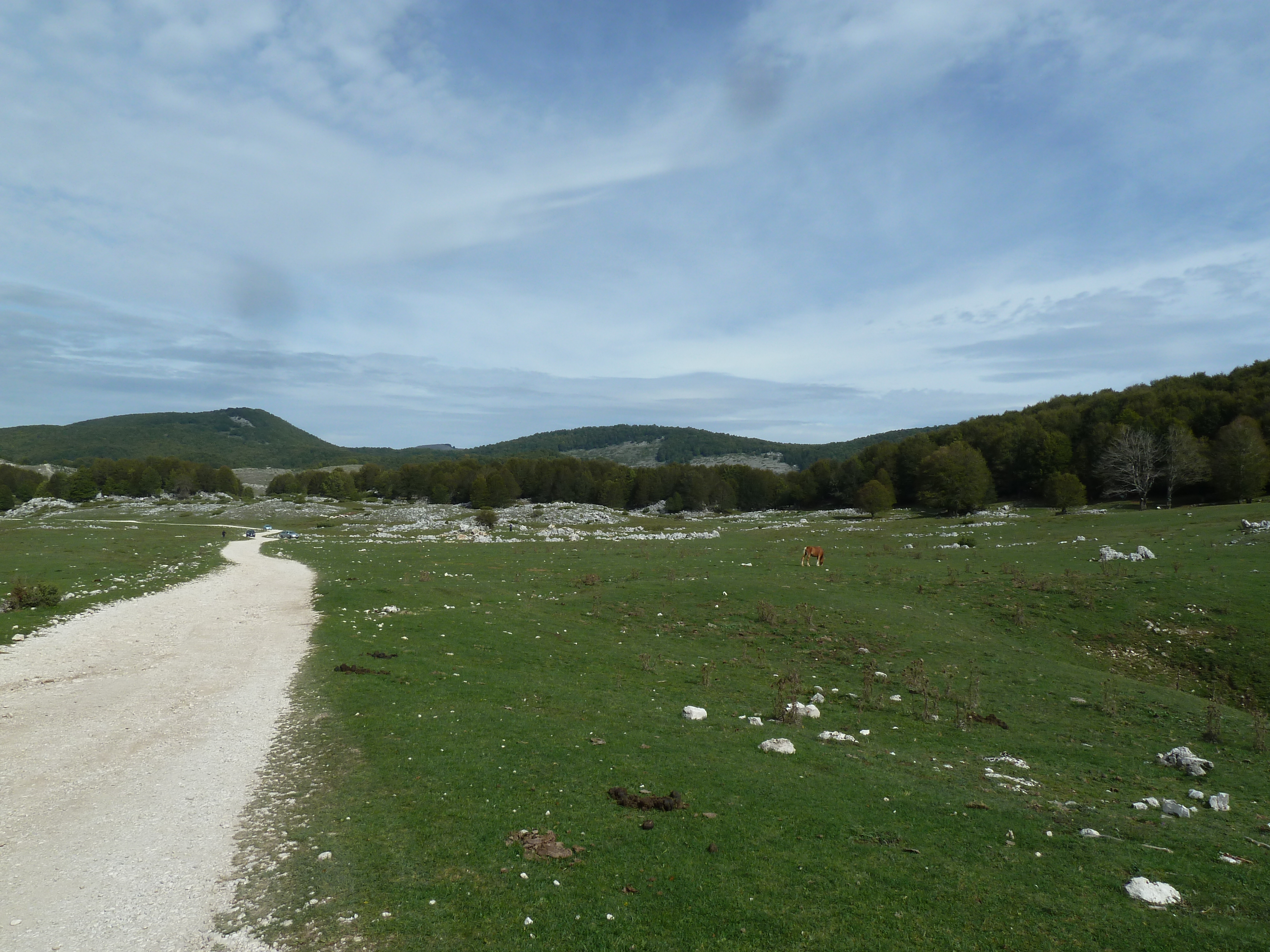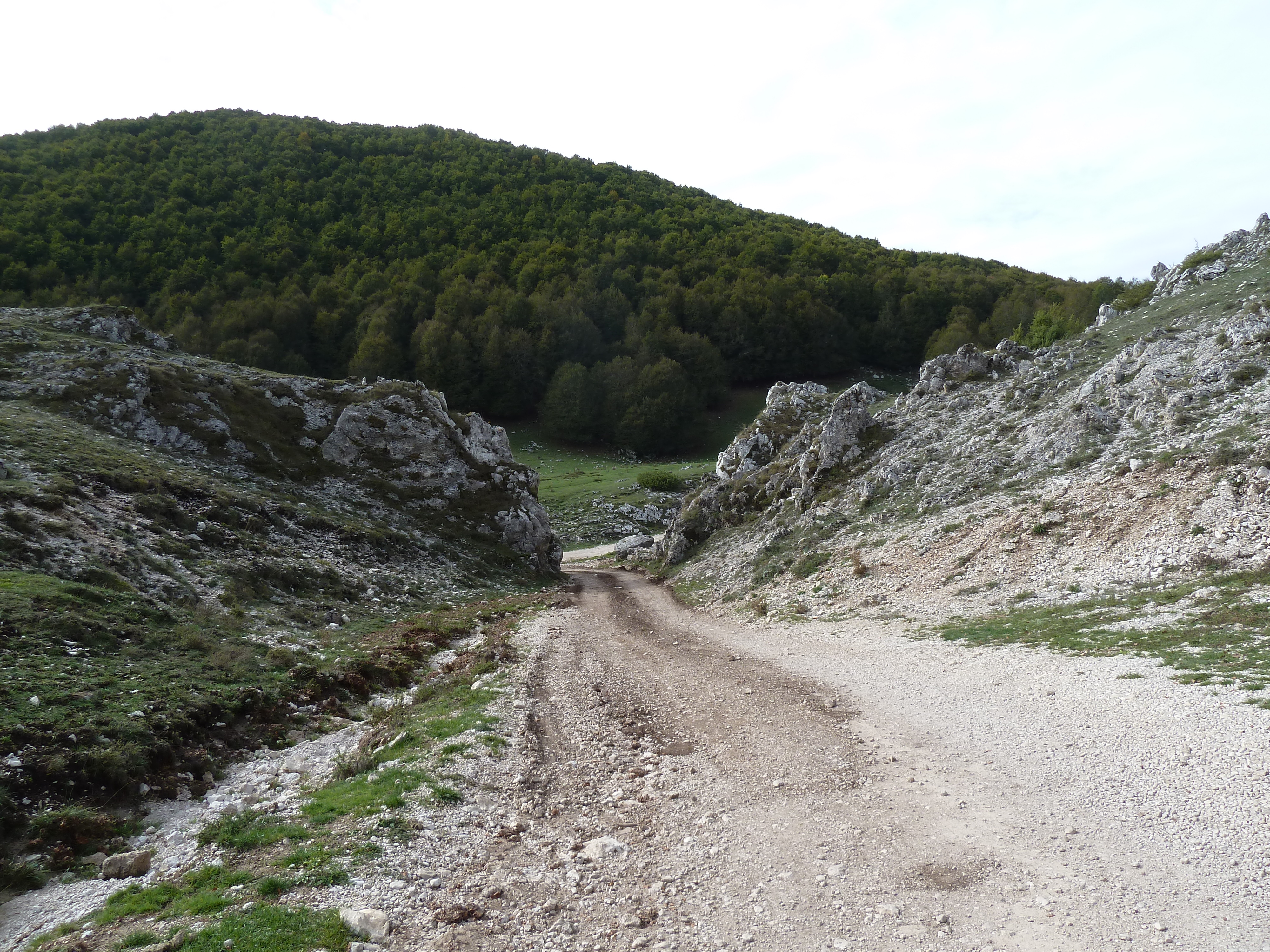 Il tratto iniziale della strada passa in quota ed offre scorci molto belli verso i Simbruini e dopo aver superato un santuario (oggi c’era una ressa di persone e macchine che inizialmente c’ha fatto temere che la strada fosse chiusa!) inizia la strada bianca. Classico paesaggio appenninico d’altopiano molto bello ed il gusto di percorrere la strada bianca a tratti parecchio dissestata è comunque sempre interessante a provarsi!