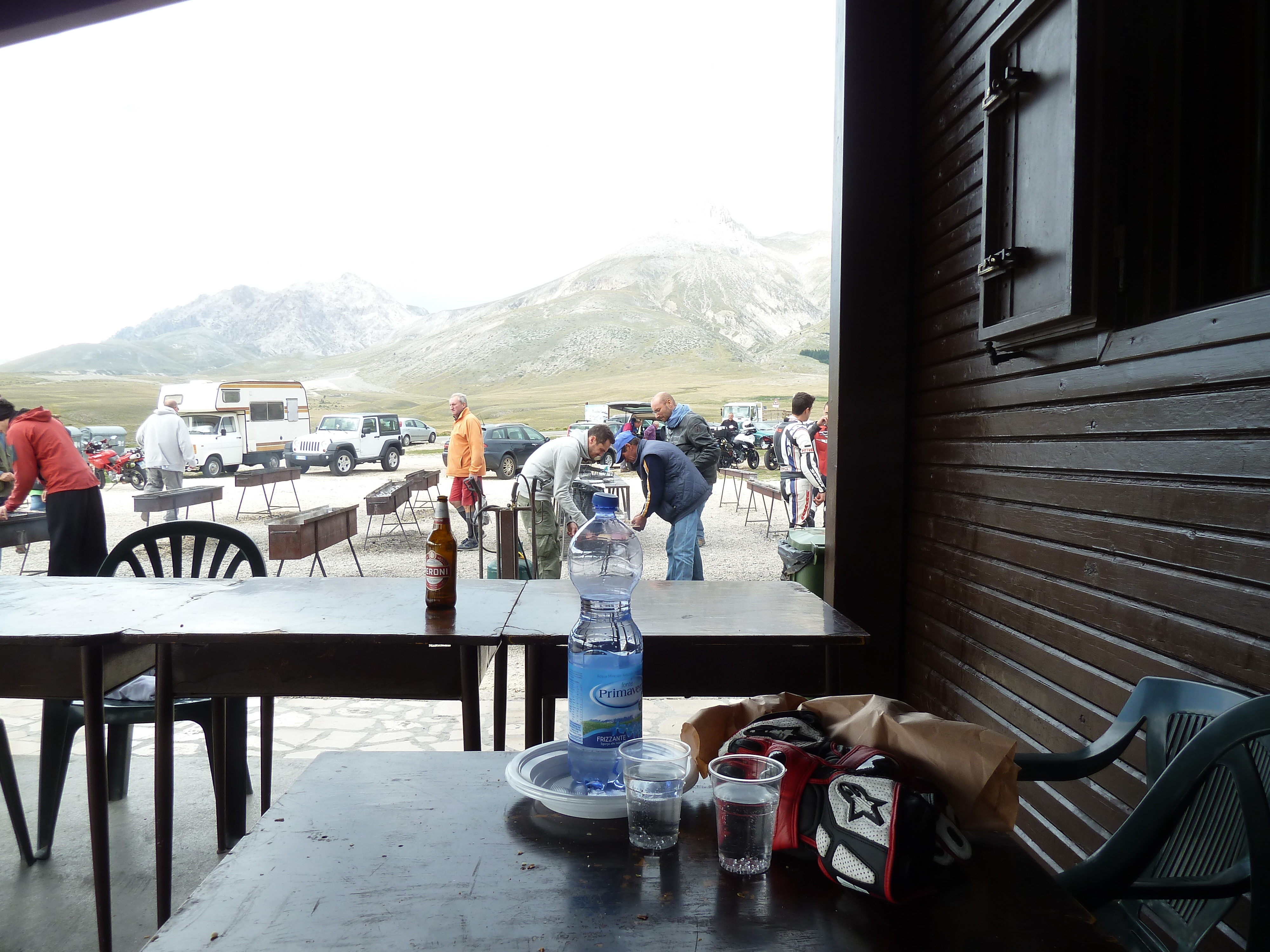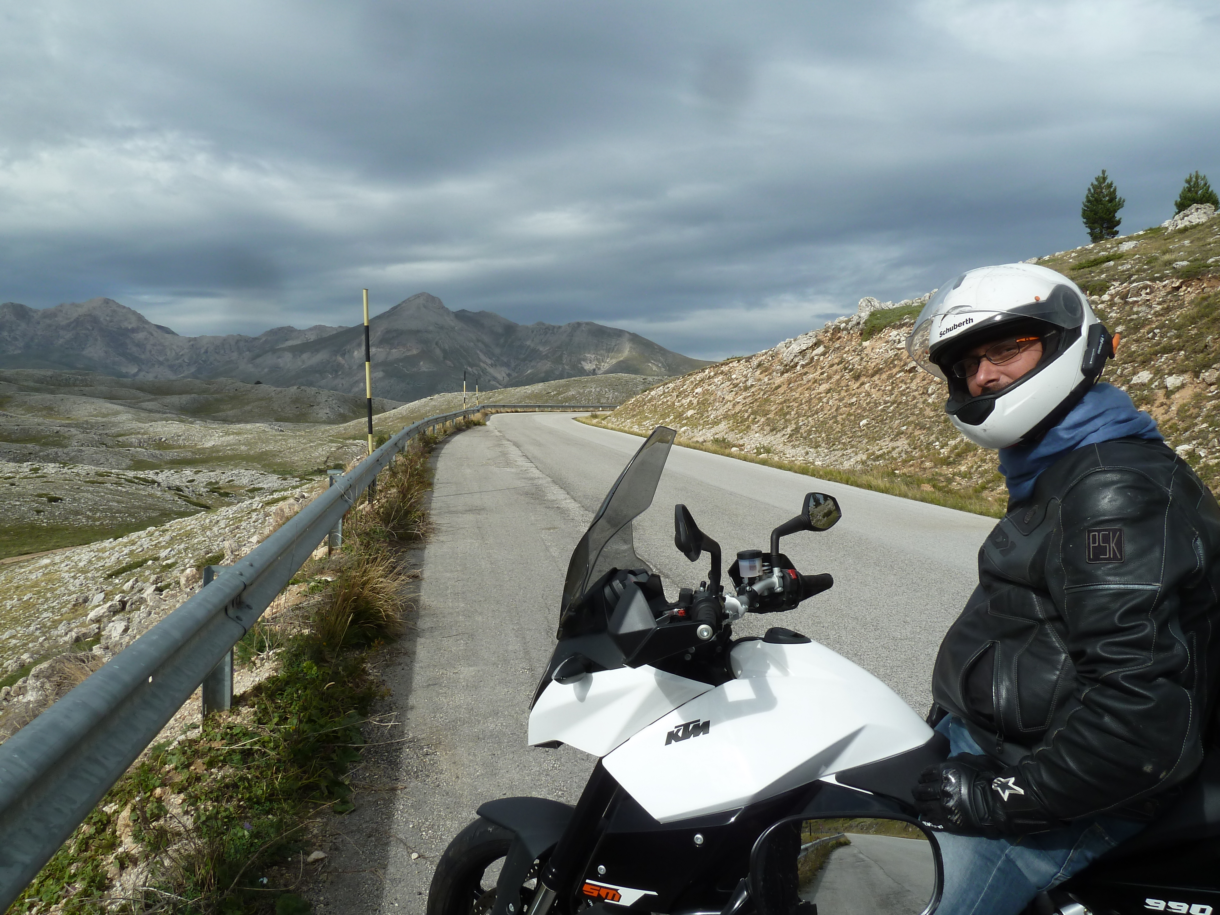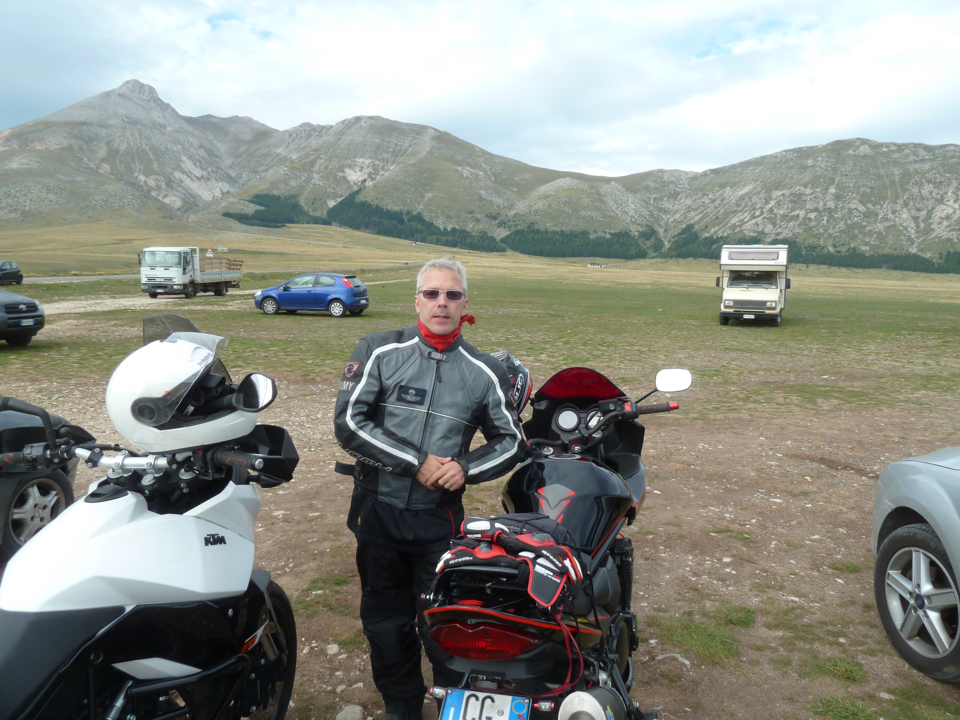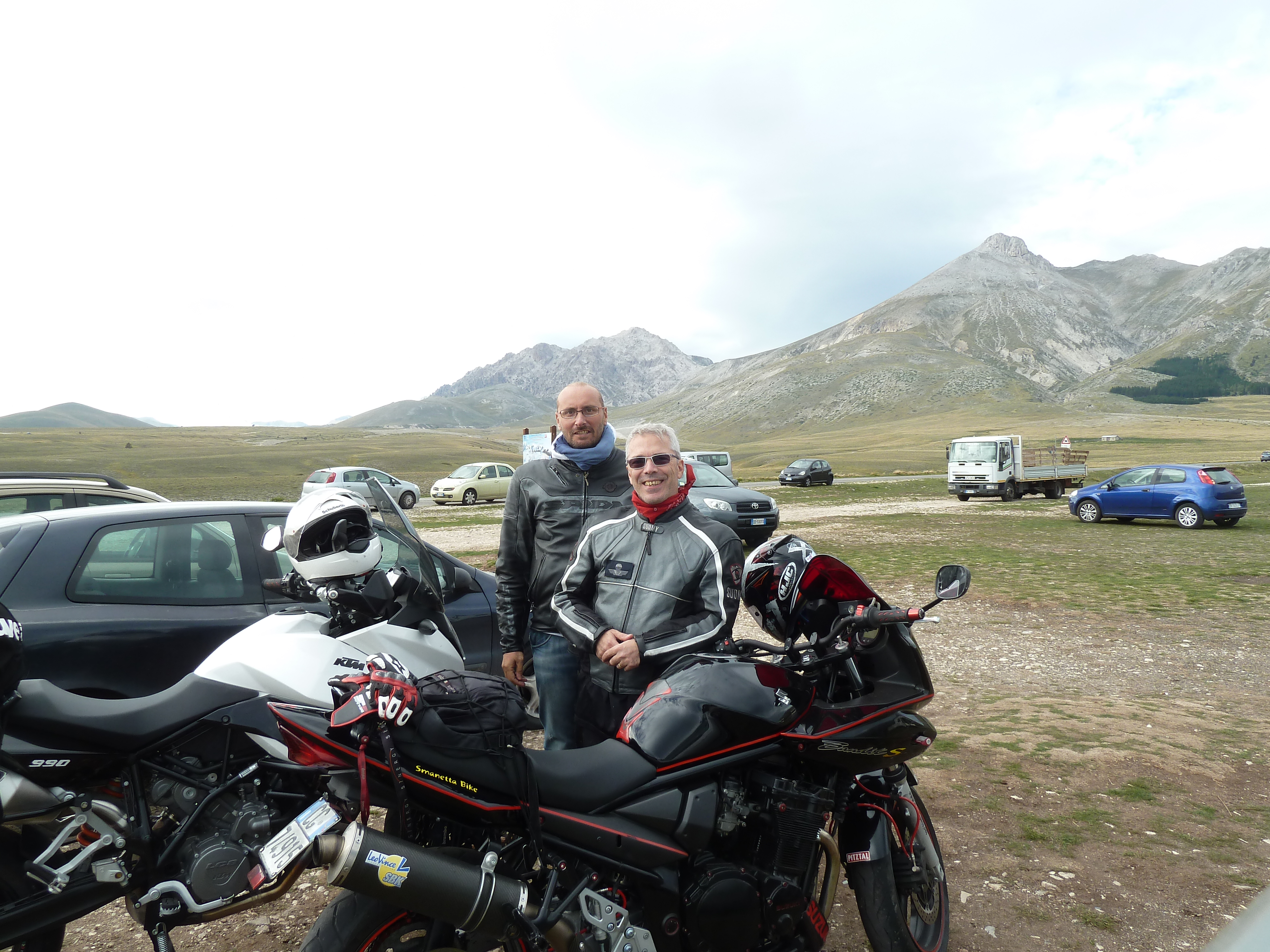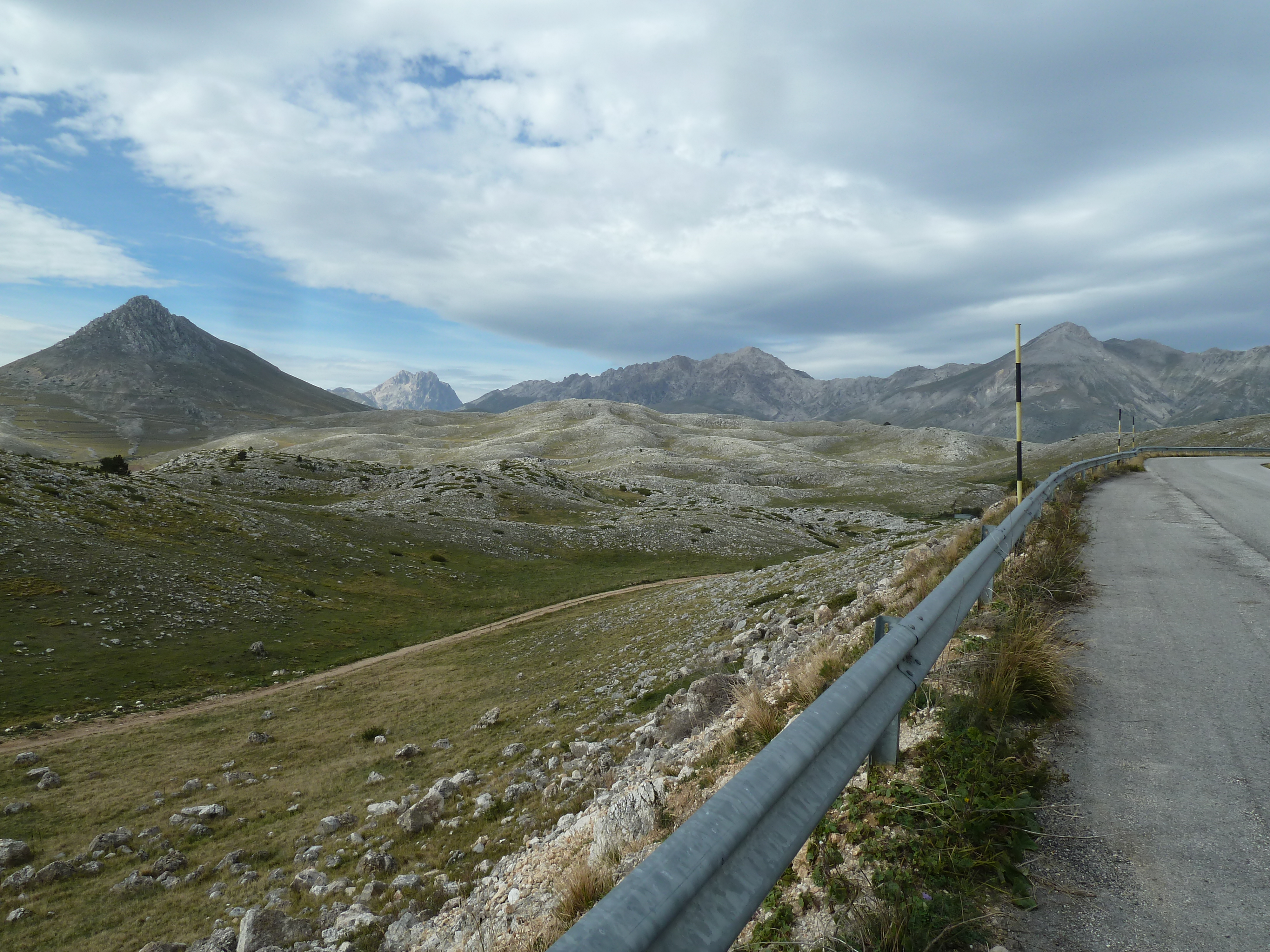 Discesa la Val Roveto fino a Capistrello da lì per guadagnare tempo con la superstrada ed un breve tratto di A25 abbiamo raggiunto Celano per salire sulla notissima SS 696 dell’Altopiano delle Rocche: sempre una gran bella salita fino ad Ovindoli. Discesi nella valle aquilana ancora verso est sulla SS 17 che abbiamo lasciato per raggiungere Barisciano e da lì Calascio e Castel del Monte. Superato questo paese su strade per me molto note ma percorse da Alberto per la prima volta abbiamo raggiunto il valico di Capo Serra sul bordo orientale della piana di Campo Imperatore.