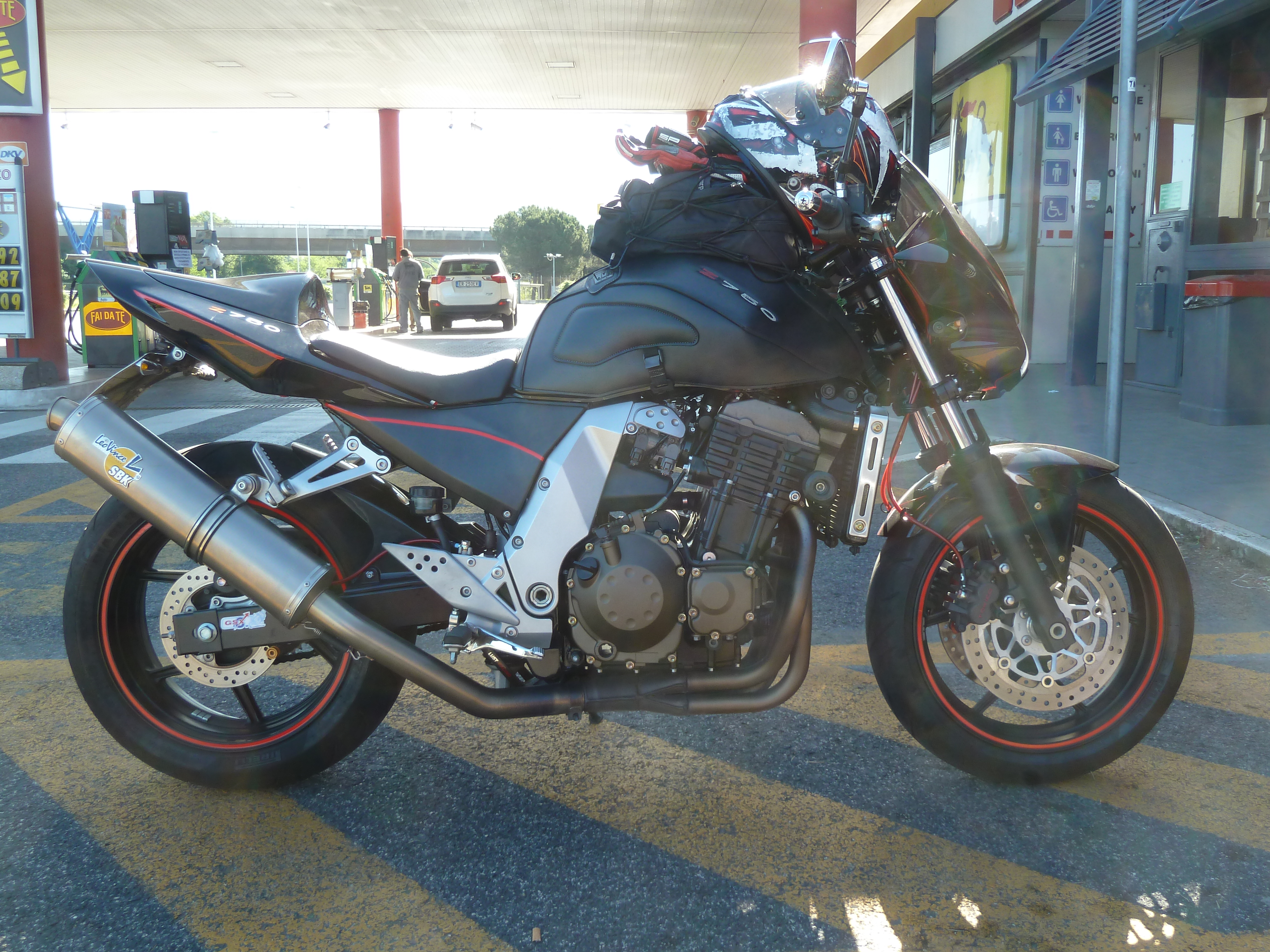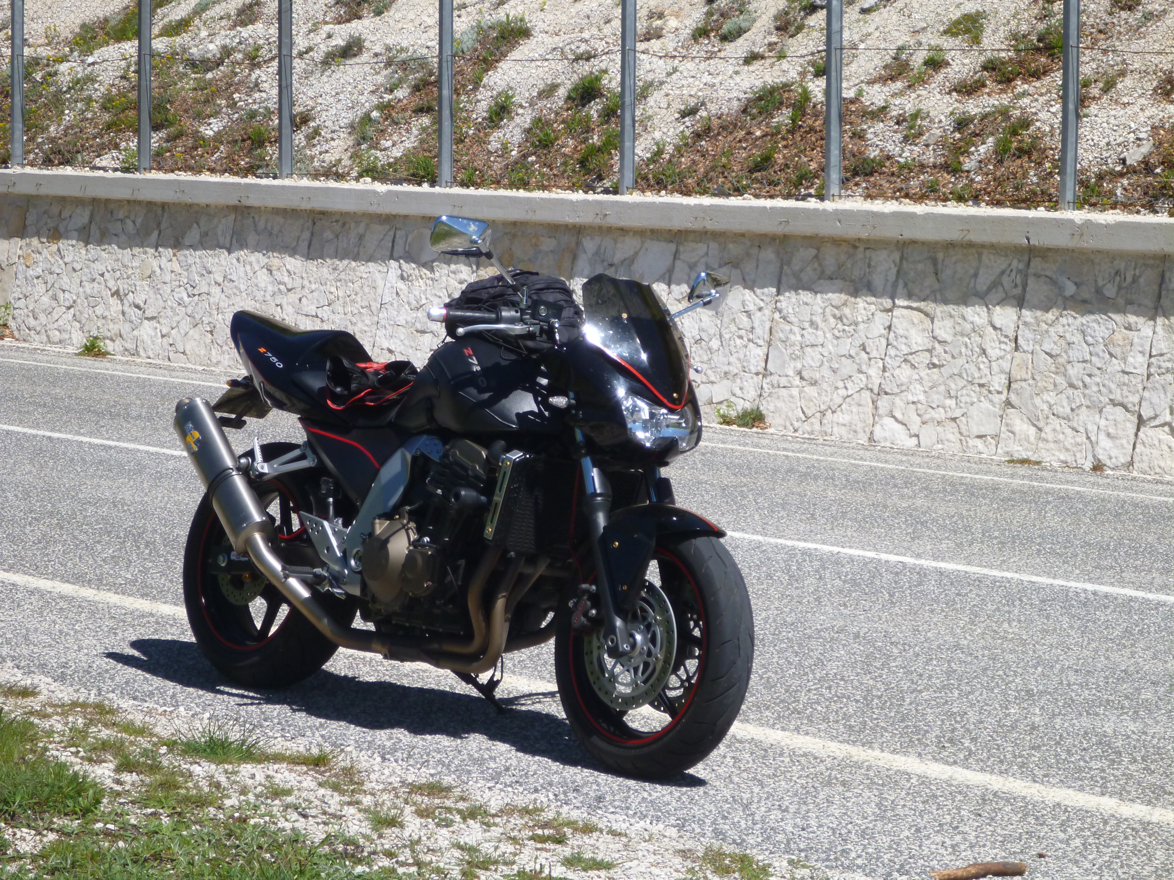 Il secondo episodio è stato davvero strano e della serie non si finisce mai di stupirsi…accaduto proprio durante la suddetta pausa caffè a San Sebastiano. La sosta, strategicamente voluta per capire se i goccioloni stavano aumentando ed a questo punto provvidenziale mi ha fatto scoprire che lo scarico era completamente staccato dal telaio perché i due perni che tengono la pedana passeggero che fa anche da supporto allo scarico mancavano! Anche se praticamente impossibile perderne uno che ciò accada a due lo è del tutto tenendo conto che sono perni con tanto di ferma filetto! E quindi l’unica spiegazione possibile è che durante la sosta al ristorante di Castelvecchio qualcuno abbia tentato di fregarmi lo scarico, dopo tutto un LeoVince Titanium come nuovo può far gola! A pranzo nello stesso locale c’era infatti un nutrito gruppo di motociclisti pescaresi a giudicare dall’accento e fuori ricordo d’aver notato una Z750 della stessa serie della mia.
