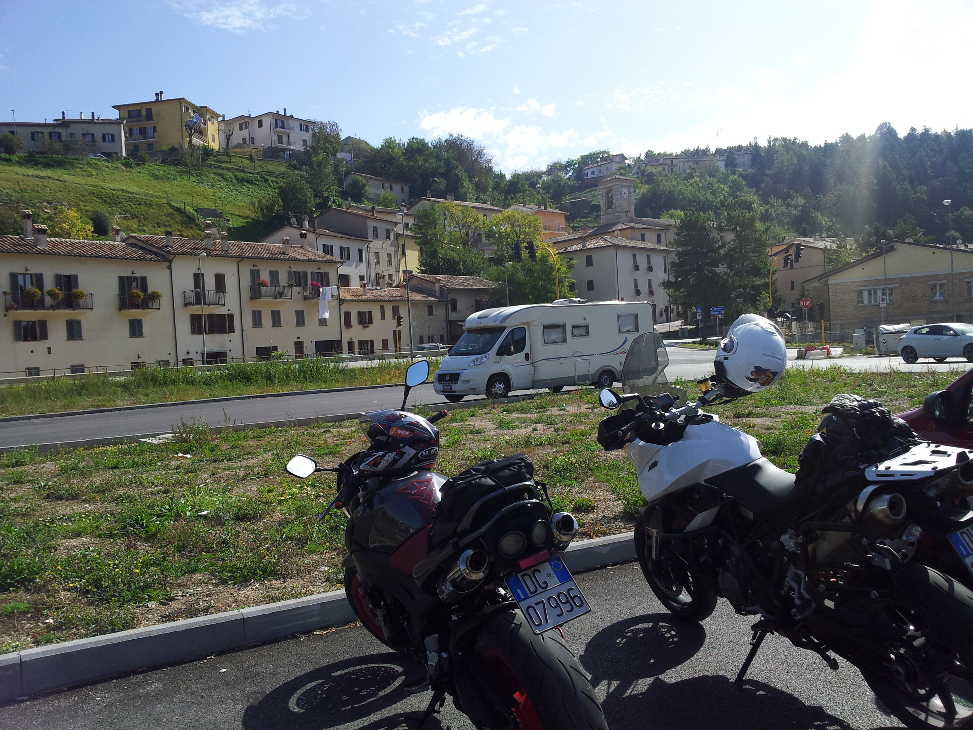 Tanto per cambiare ci siamo un po’ persi intorno e dentro Rieti per arrivare a prendere la SS 79 che velocemente sul fondo valle del Velino ci porta sulla SS 521 verso Morro Reatino: questa strada è veramente una goduria. Tutta in piano è un zigazagare continuo ed è stato divertente anche effettuare sorpassi di piccole code di macchine con la solita “lumaca” in testa! Strano incontro con un paio di Carabinieri che sulle prime sembrava volessero fermarci ed invece erano lì insieme ad un gruppetto di persone in cerca di non si sa bene cosa!