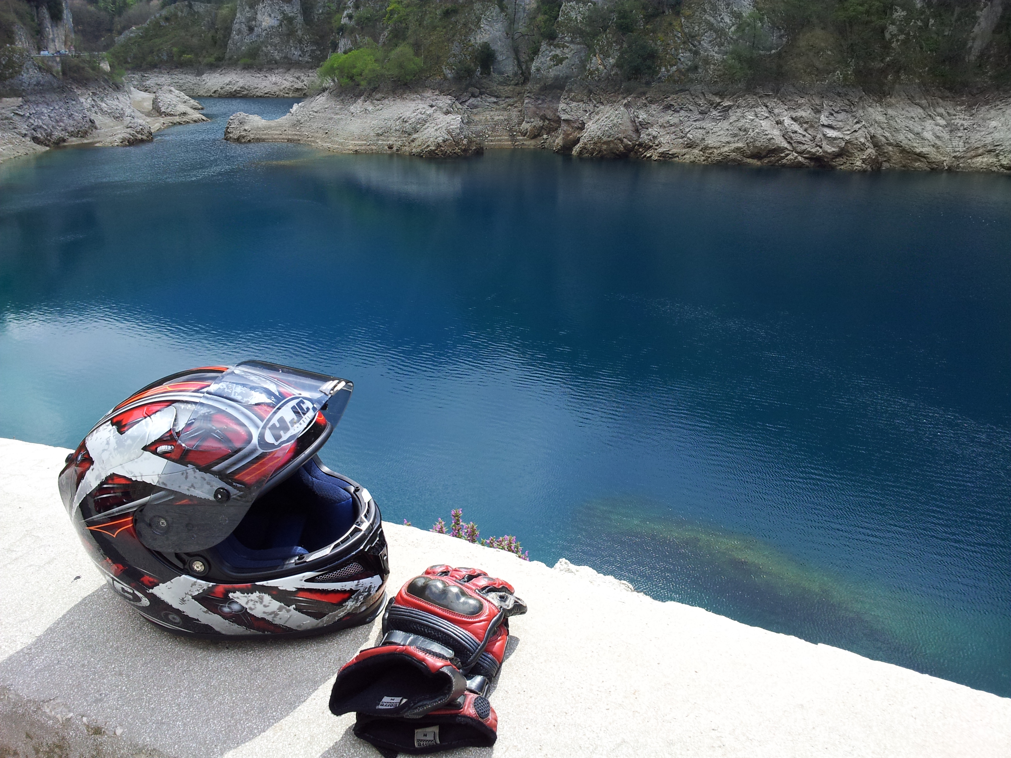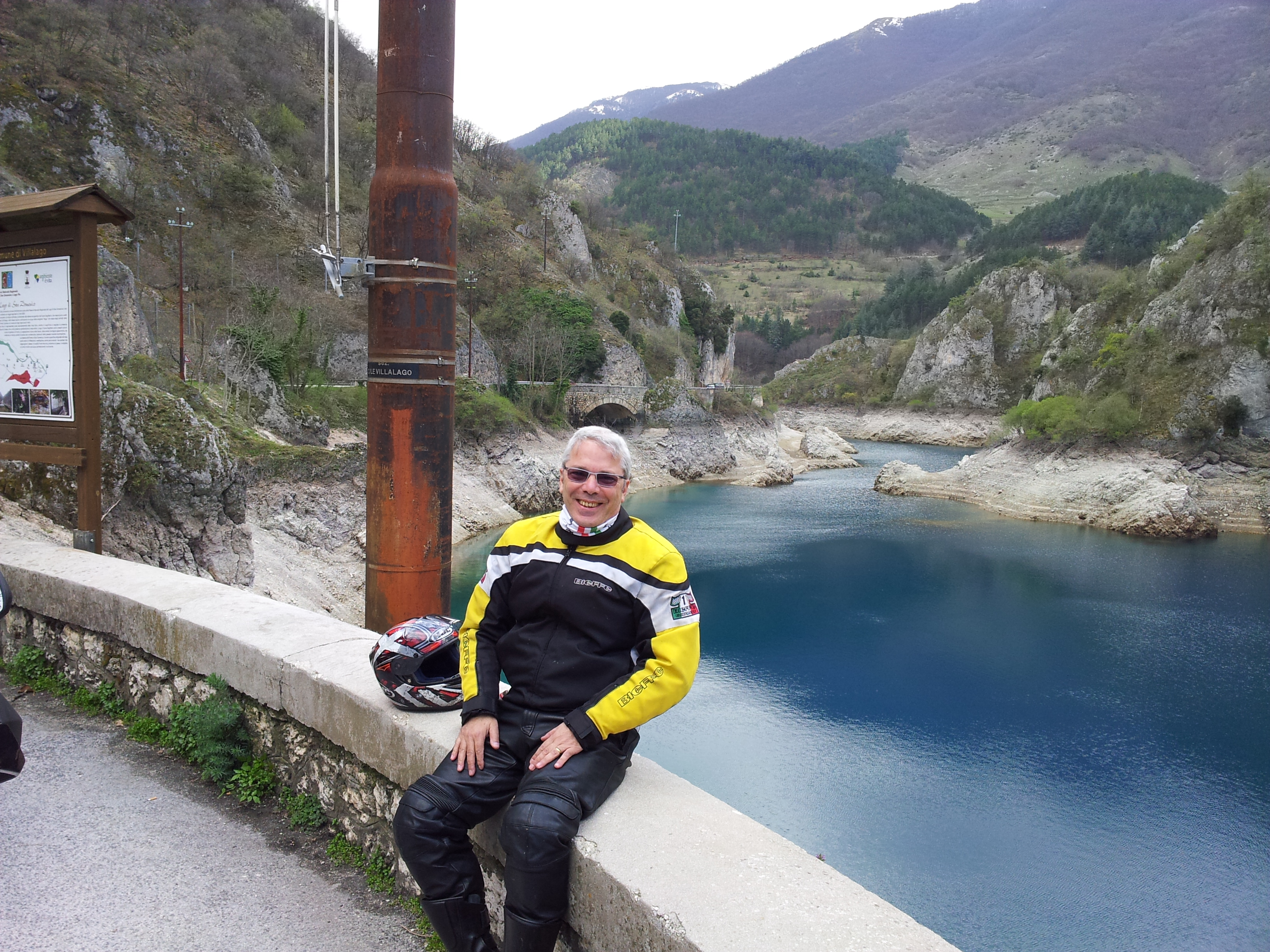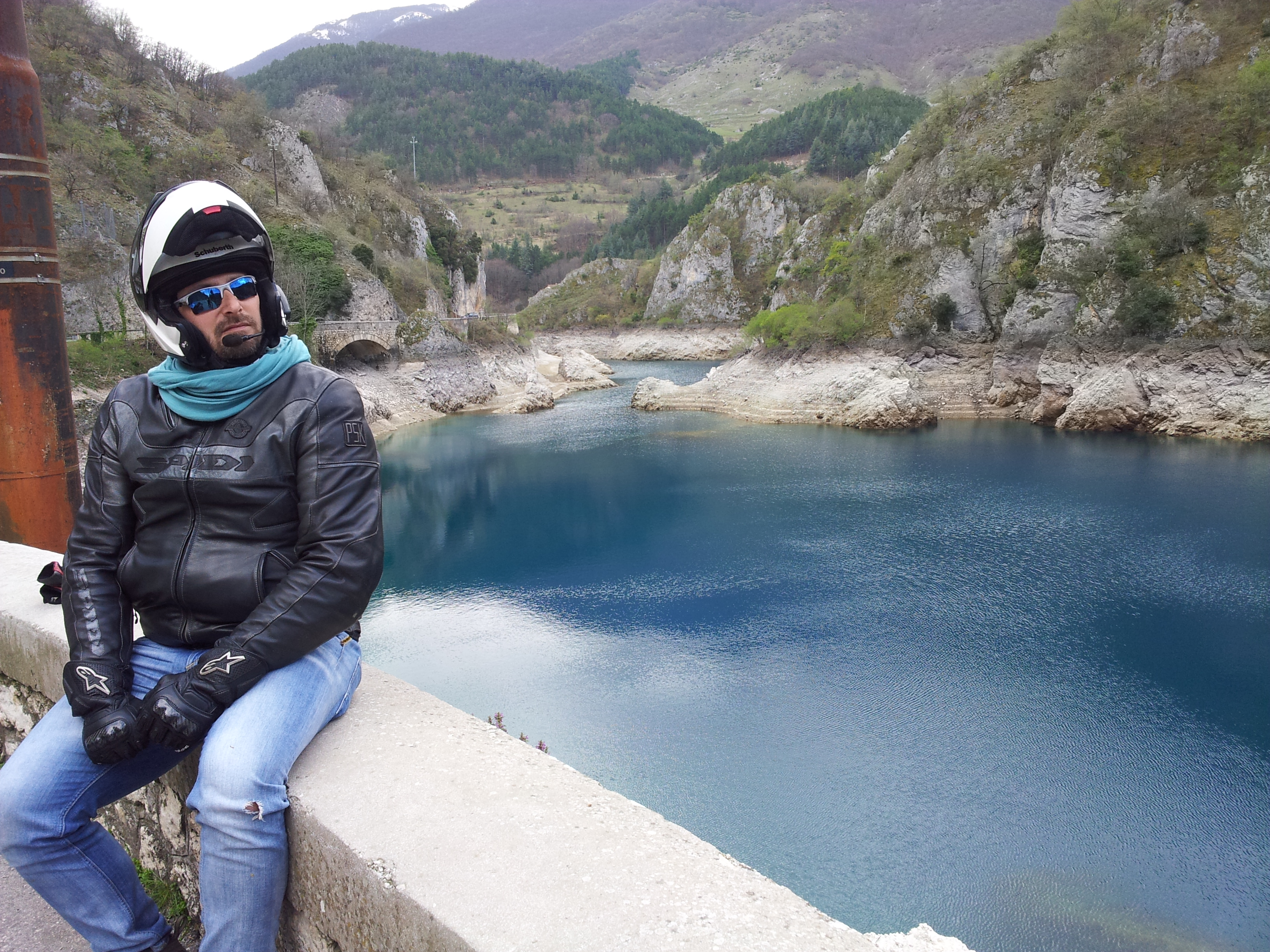 Pausa pranzo al sole a Tagliacozzo e dopo aver tagliato con l’autostrada il tratto noiosissimo di Tiburtina tra Scurcola Marsicana e Pescina decidiamo di abbandonare l’idea di fare Forca Caruso e poi da lì salire sull’altopiano delle Rocche a causa di nuvoloni neri verso nord che promettevano temporali sicuri. E così da Pescina con un pieno ai serbatoi ed un caffè ci inoltriamo per la val Giovenco, saliamo al valico dell’Olmo e poi giù per Cocullo, Anversa degli Abruzzi e le gole del Sagittario. La sosta al laghetto color topazio (o zaffiro come piace ad Alberto!) è obbligatoria!