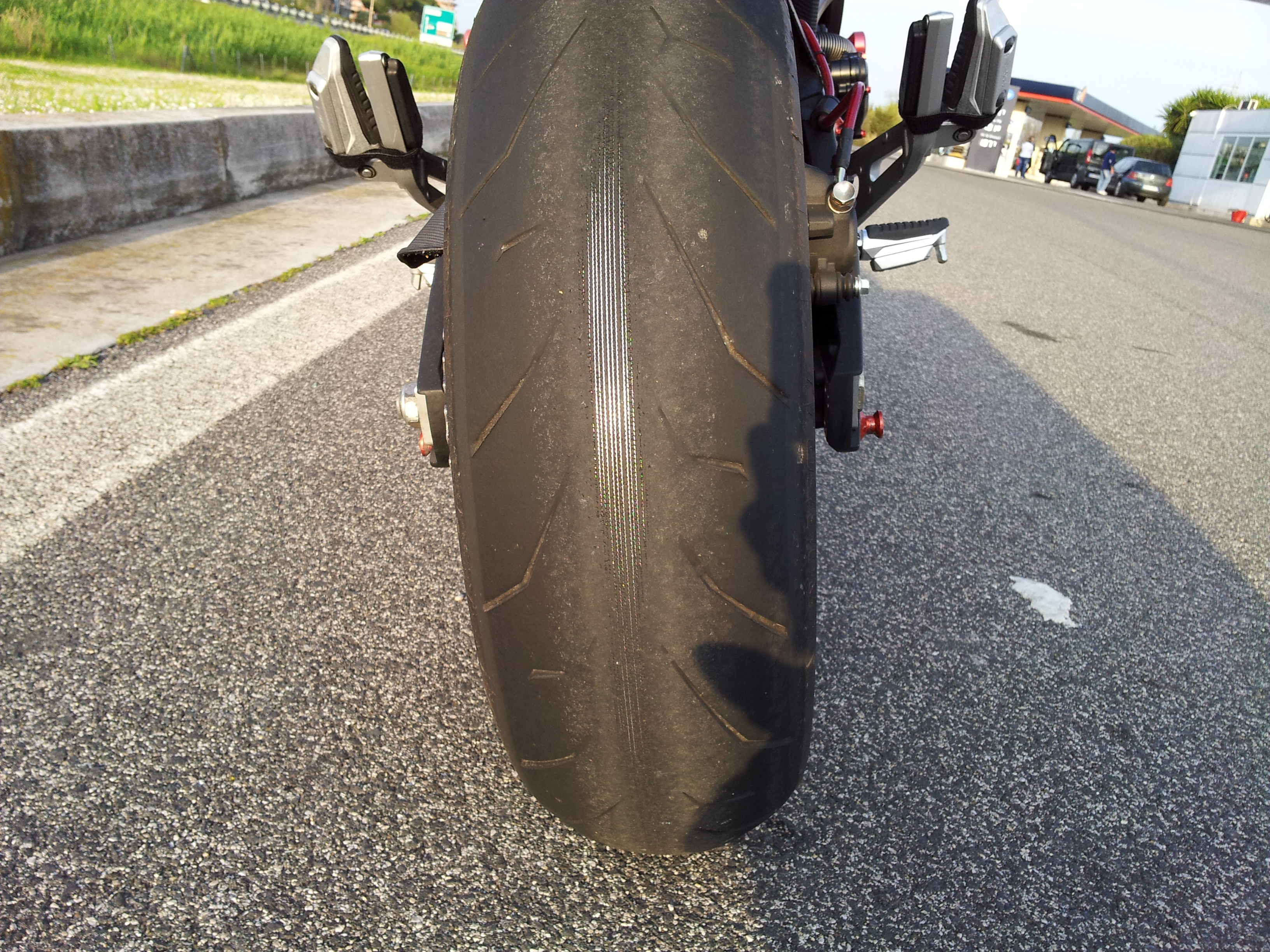 Che dovevo cambiare le gomme lo sapevo ma non avrei mai immaginato di percorrere gli ultimi 70 km fino a casa con la posteriore che in un tratto di almeno 50 cm aveva la tela esposta!!! Sul ritorno infatti, appena entrati in A1 a Ferentino mi vedo sorpassare da Alberto pochi km dopo che fa cenno di fermarsi all’area di servizio La Macchia. Sulle prima pensavo che avesse lui qualche noia ed invece una volta fermi mi dice che aveva visto qualcosa di strano sulla mia gomma posteriore. E ti credo! La strisciata bianca intermittente che vedeva non era qualcosa appiccicato ma la tela esposta!