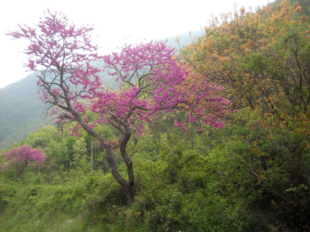 In questo periodo dell’anno è in piena fioritura il siliquastro (detto “albero di Giuda” che grazie ad Alberto ora so che è detto così perché fa un sacco di fiori ma non frutti). I suoi fiori viola ci hanno accompagnato per buona parte del tragitto visto che è un albero piuttosto comune in Appennino. Ed è un albero che a me piace molto!