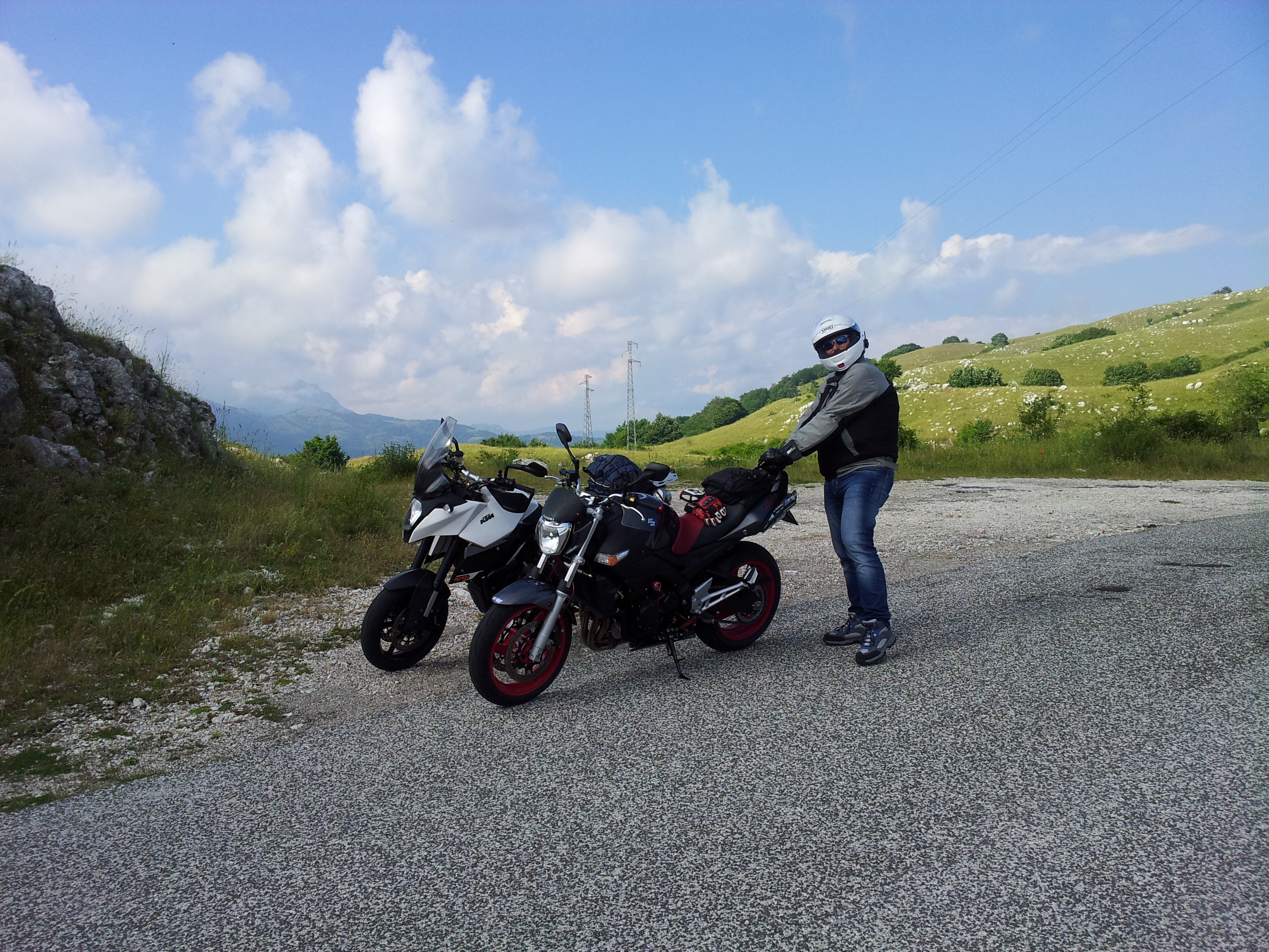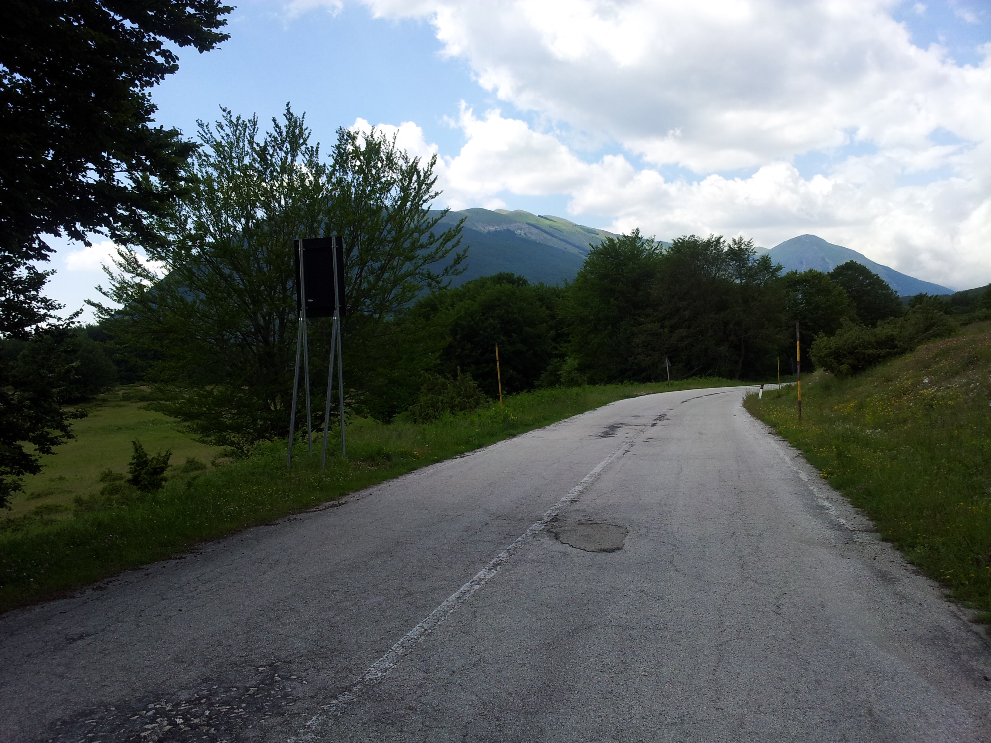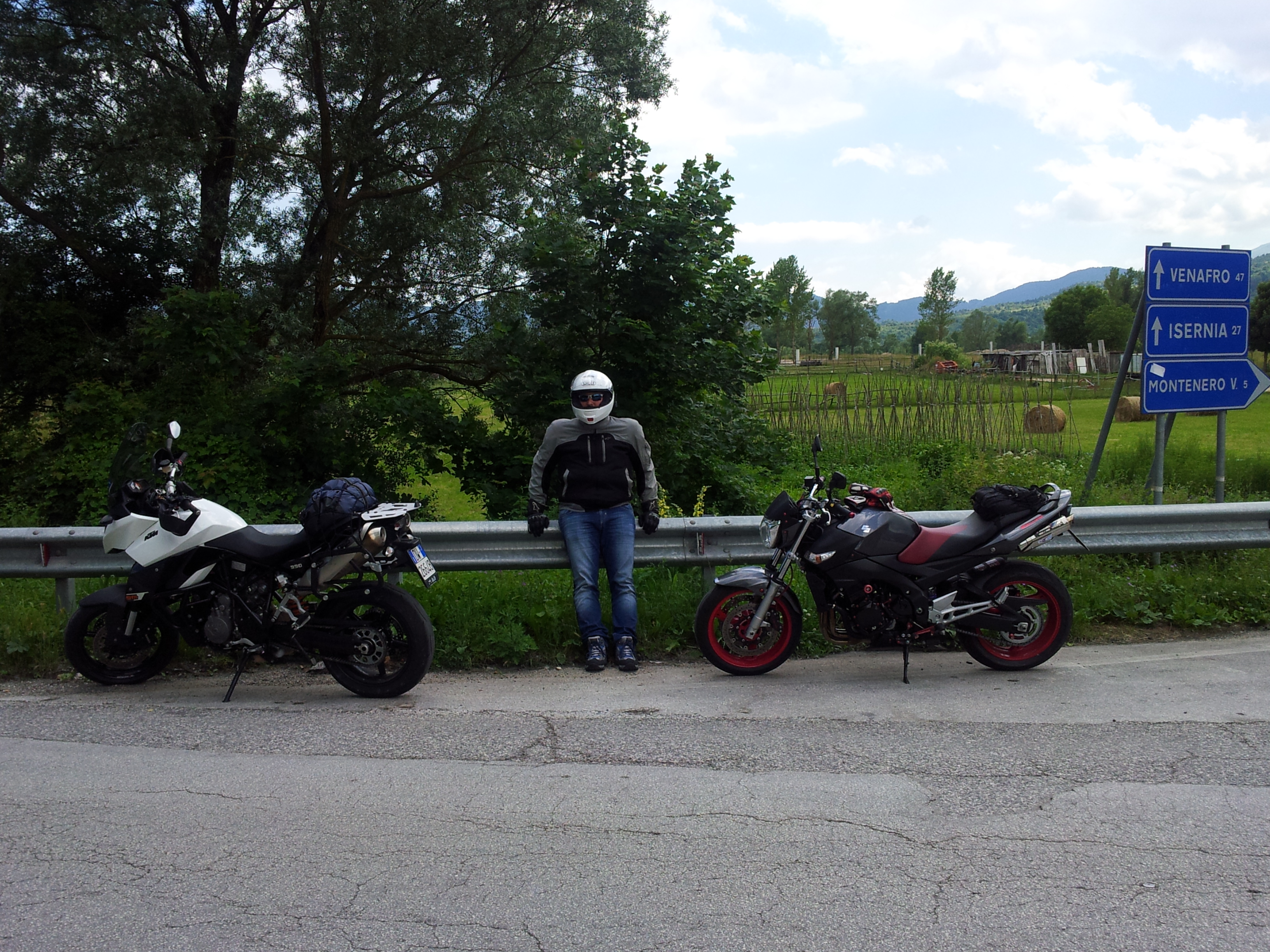 Altro obiettivo Viticuso ed il Valico di Cervaro. E qui inizia la comica. Non so per quale motivo avevo in testa Filignano, paesino dal quale ero passato in altri giri dalle parti delle Mainarde Molisane. Dopo aver consultato le mappe almeno due volte appare ovvio che il bivio per Viticuso è poco prima di Venafro. Fermo Alberto perché ha passato due strade che indicavano…Filignano! E lui ovviamente ribatte che stiamo cercando la strada per Viticuso! Fermi ad un incrocio riguardiamo la mappa, chiedo ad un locale che mi indica al volo la strada: la chiesa, la “s”, c’è tutto, il bivio…per Filignano! Alberto, ironico: “Ma gli hai chiesto per Viticuso?”. No, ovviamente, gli avevo chiesto indicazioni per…Filignano! Alberto prende decisamente l’iniziativa e finalmente, ultimo consulto alle mappe, imbocchiamo la strada giusta. Dopo pochi km scopriremo perché non era indicata la via per Viticuso da lì! Perché la strada si trasforma in una sorta di viottolo largo un paio di metri e sommariamente asfaltato…ma come ho detto proprio in quel frangente: “a noi ci fermano solo le bucature!”…Ne è valsa la pena perché il paesaggio è molto bello con la vista che a tratti si apre verso nord ed il Monte Morrone. La cosa interessante? Finché corre in provincia di Isernia è discretamente asfaltata ma appena passa in quella di Frosinone si stringe e diventa praticamente bianca!
