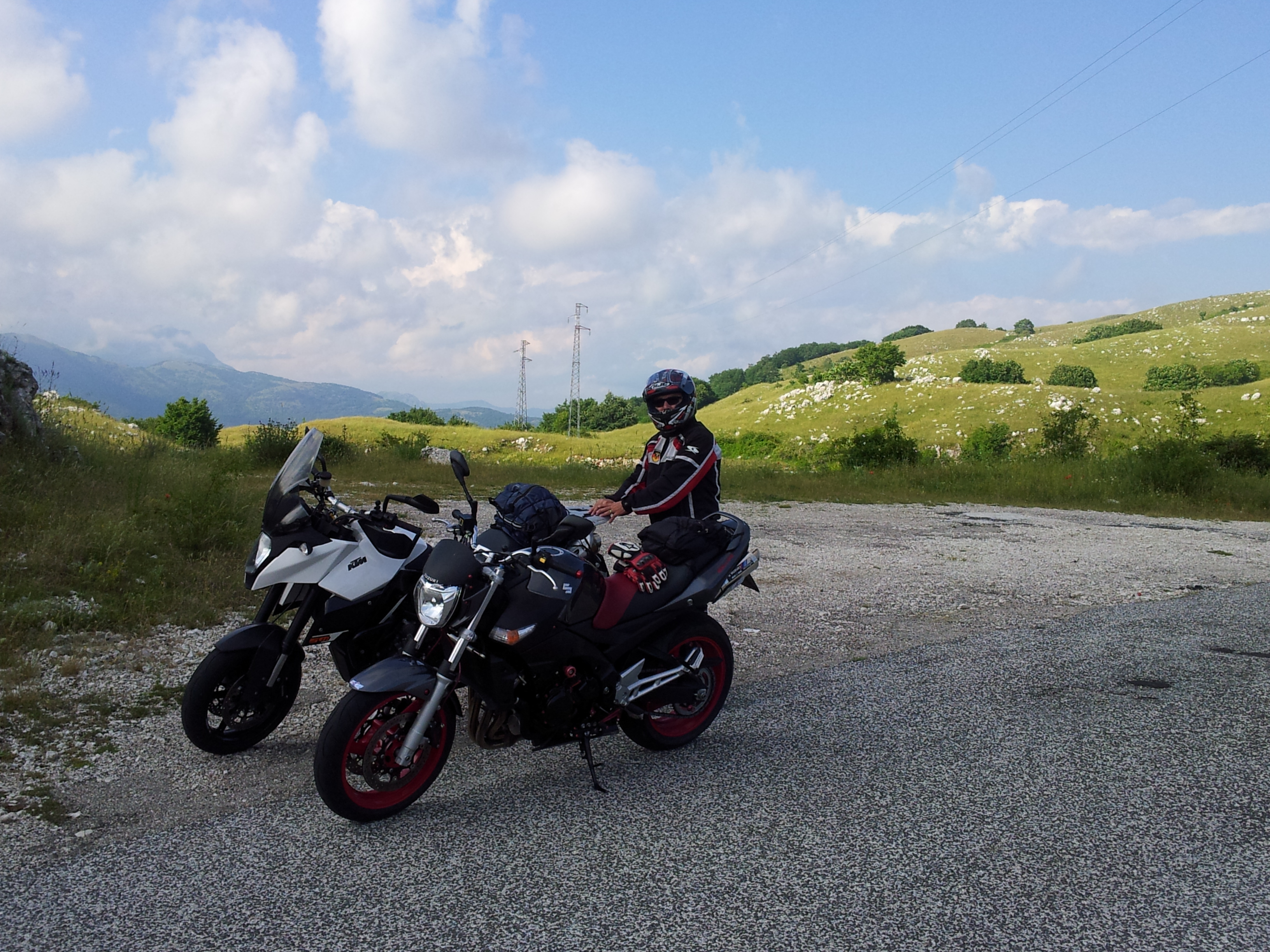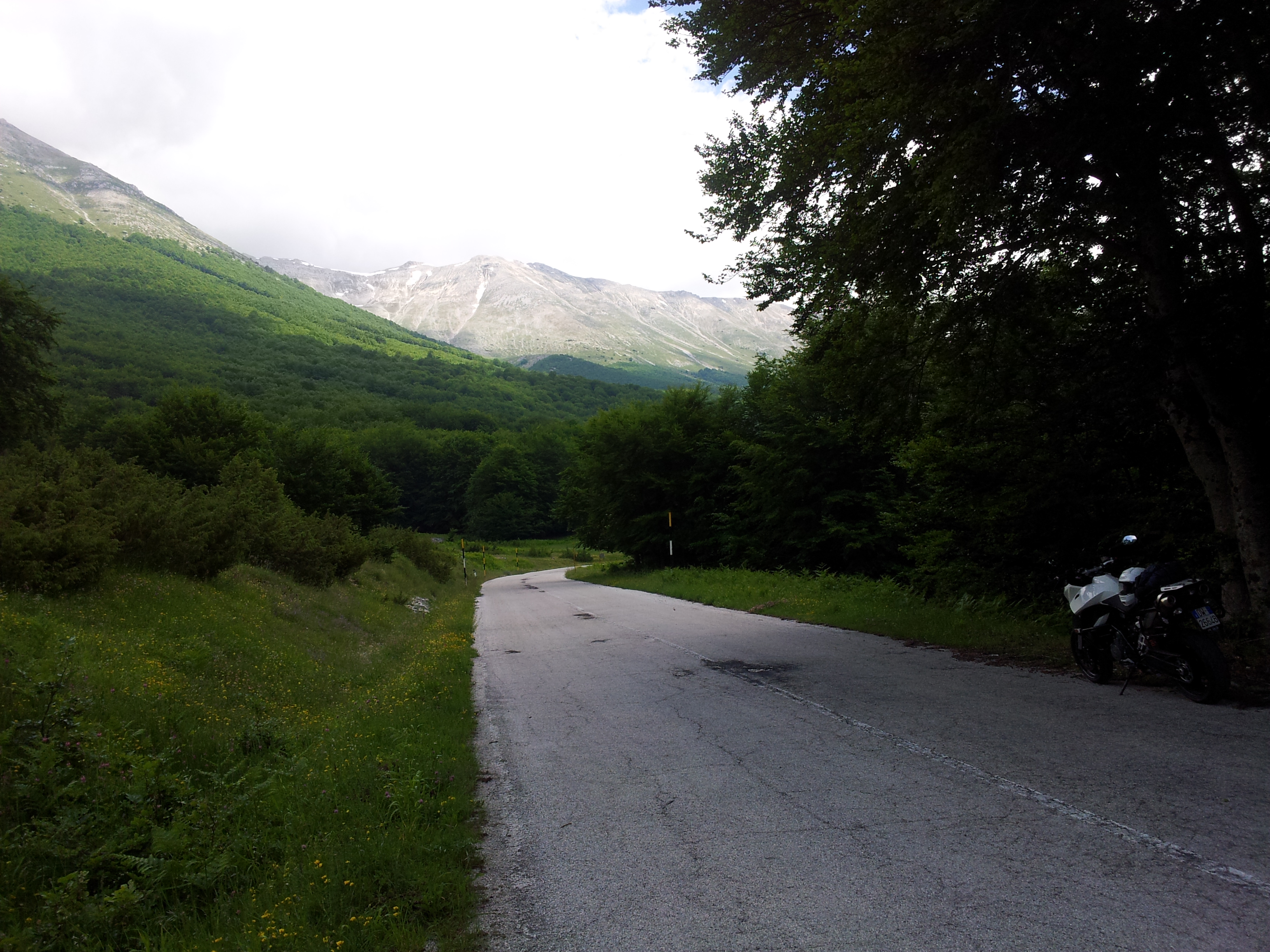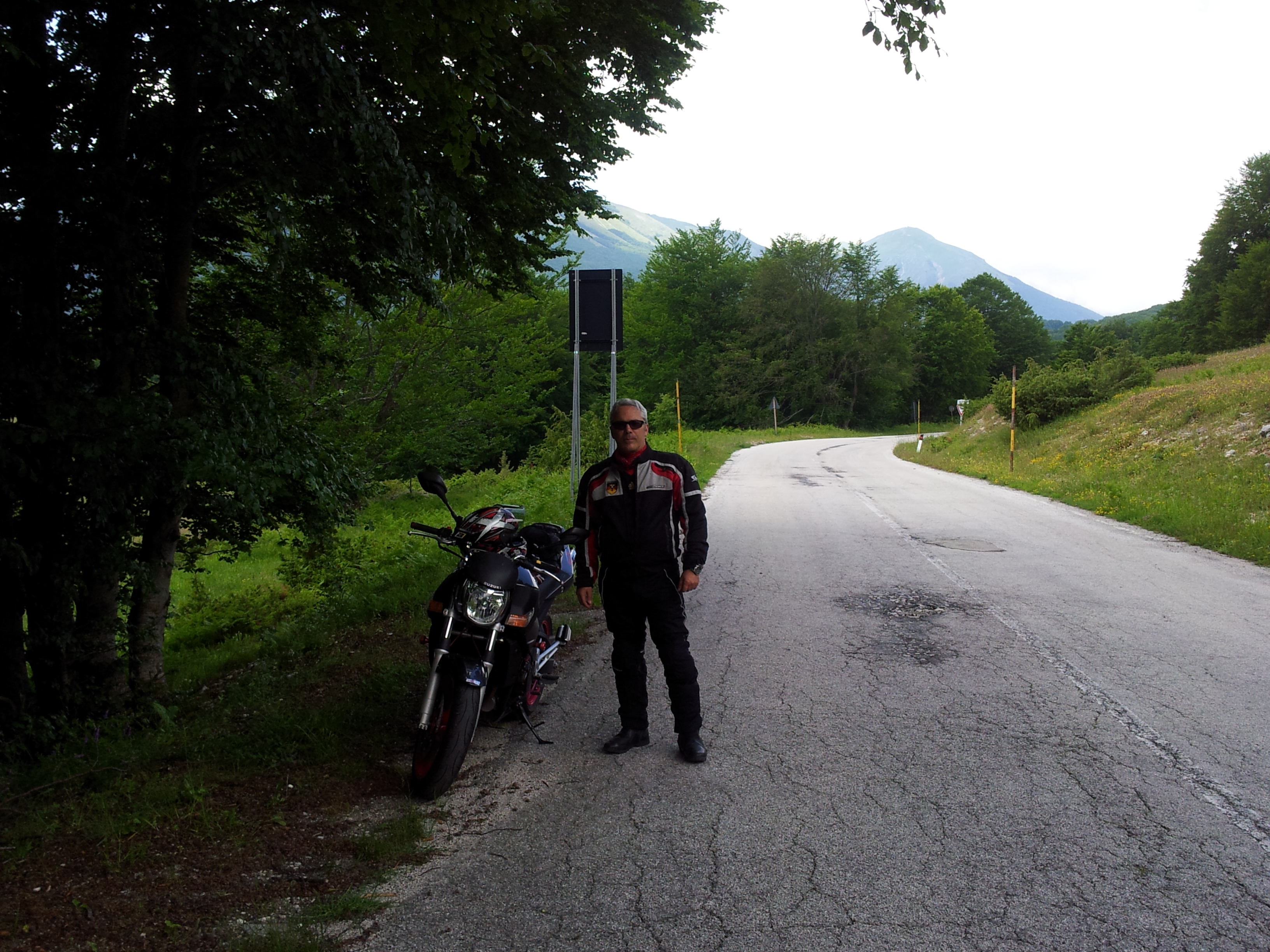 Tutto sommato la deviazione è stata una gradita sorpresa e mi ha fatto tornare su strade che non percorrevo da parecchio con un bel panorama finale sulla piana di Sulmona e lo sfondo del massiccio della Maiella. Diretti a Pacentro tanto per cambiare sbaglio la strada che arriva al paese ed imbocco una stradaccia perennemente sottoposta a lavori! Poco male, è ora di pranzo e ci fermiamo nella piazzetta della chiesa del paese gustando degli ottimi panini con ricotta e mortadella e prosciutto crudo! Due chiacchiere in simpatia, caffè e si parte, con calma vista la raccomandazione di Alberto: “Sto in piena digestione!”La salita da Pacentro verso la SS 487 (che arriva puntando a nord fino a Scafa attraverso il valico di San Leonardo) inizia subito con un’altra sorpresa: un bel cartello ci avvisa che dal km 45 al km 49 è chiusa…per frana! Stavolta ci avventuriamo lo stesso. La strada è gustosissima e la ricordavo bene per averla percorsa anni fa. Ogni 2 o 300 metri un tornante in uno zigzagare continuo che ti fa prendere rapidamente quota, percorsa lentamente e con calma mi sono divertito a pennellare i tornanti mantenendo la velocità costante. Arrivati allo sbarramento e constatato che con la moto si passava ci avventuriamo: ma quale frana? Percorriamo senza problemi il tratto fino allo sbarramento successivo e passiamo lo stesso senza problemi. Altro blocco stradale in atto chissà da quanto senza apparenti motivi!