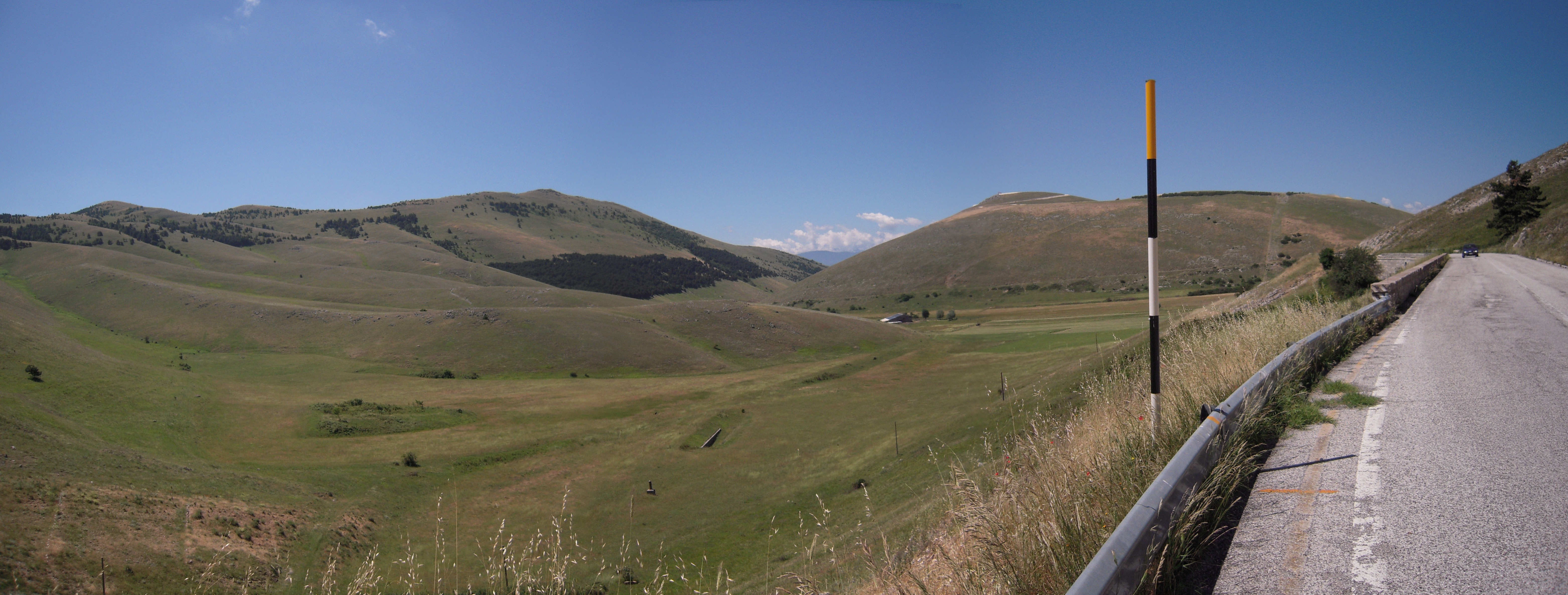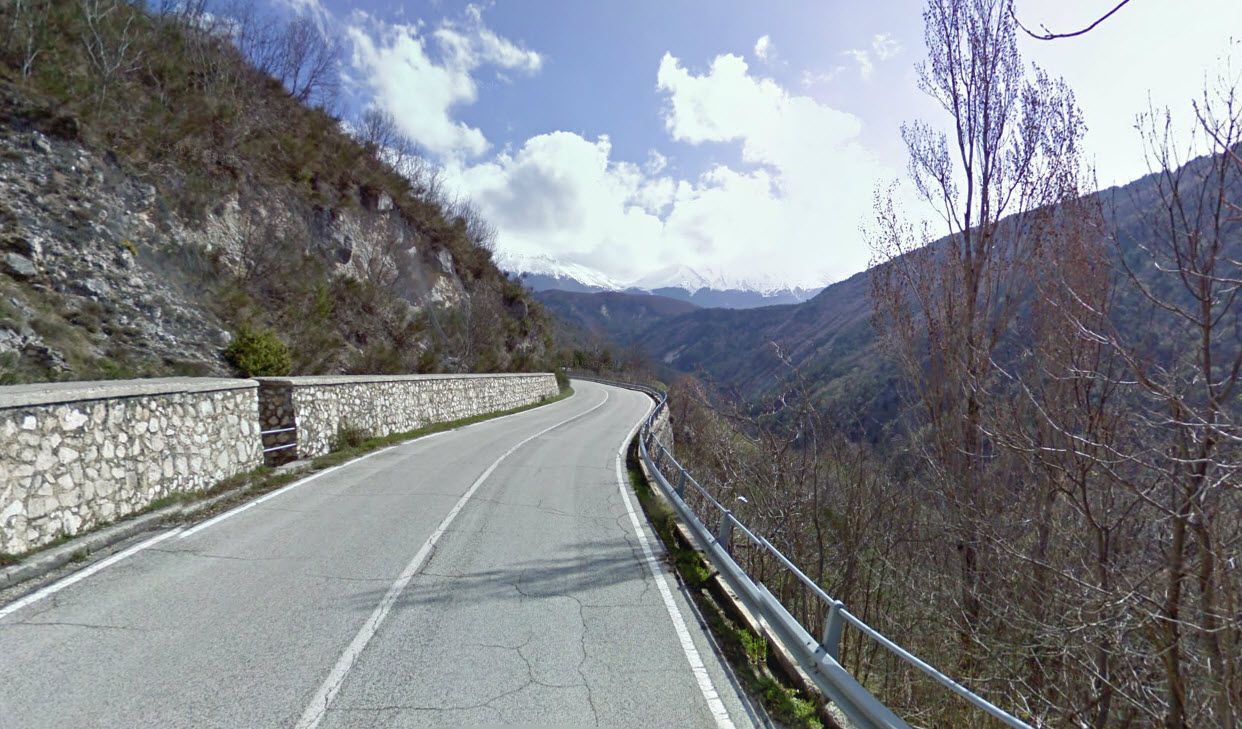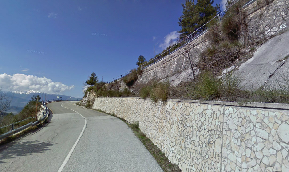 Tutto sommato la deviazione è stata una gradita sorpresa e mi ha fatto tornare su strade che non percorrevo da parecchio con un bel panorama finale sulla piana di Sulmona e lo sfondo del massiccio della Maiella. Diretti a Pacentro tanto per cambiare sbaglio la strada che arriva al paese ed imbocco una stradaccia perennemente sottoposta a lavori! Poco male, è ora di pranzo e ci fermiamo nella piazzetta della chiesa del paese gustando degli ottimi panini con ricotta e mortadella e prosciutto crudo! Due chiacchiere in simpatia, caffè e si parte, con calma vista la raccomandazione di Alberto: “Sto in piena digestione!”La salita da Pacentro verso la SS 487 (che arriva puntando a nord fino a Scafa attraverso il valico di San Leonardo) inizia subito con un’altra sorpresa: un bel cartello ci avvisa che dal km 45 al km 49 è chiusa…per frana! Stavolta ci avventuriamo lo stesso. La strada è gustosissima e la ricordavo bene per averla percorsa anni fa. Ogni 2 o 300 metri un tornante in uno zigzagare continuo che ti fa prendere rapidamente quota, percorsa lentamente e con calma mi sono divertito a pennellare i tornanti mantenendo la velocità costante. Arrivati allo sbarramento e constatato che con la moto si passava ci avventuriamo: ma quale frana? Percorriamo senza problemi il tratto fino allo sbarramento successivo e passiamo lo stesso senza problemi. Altro blocco stradale in atto chissà da quanto senza apparenti motivi!