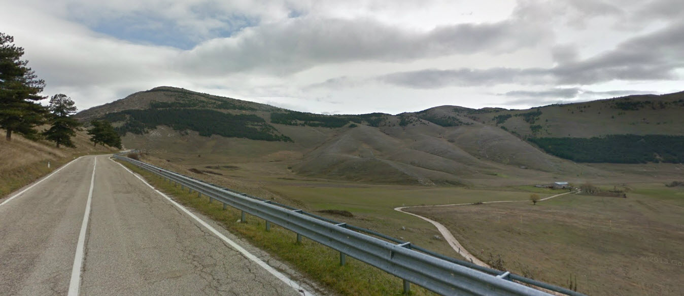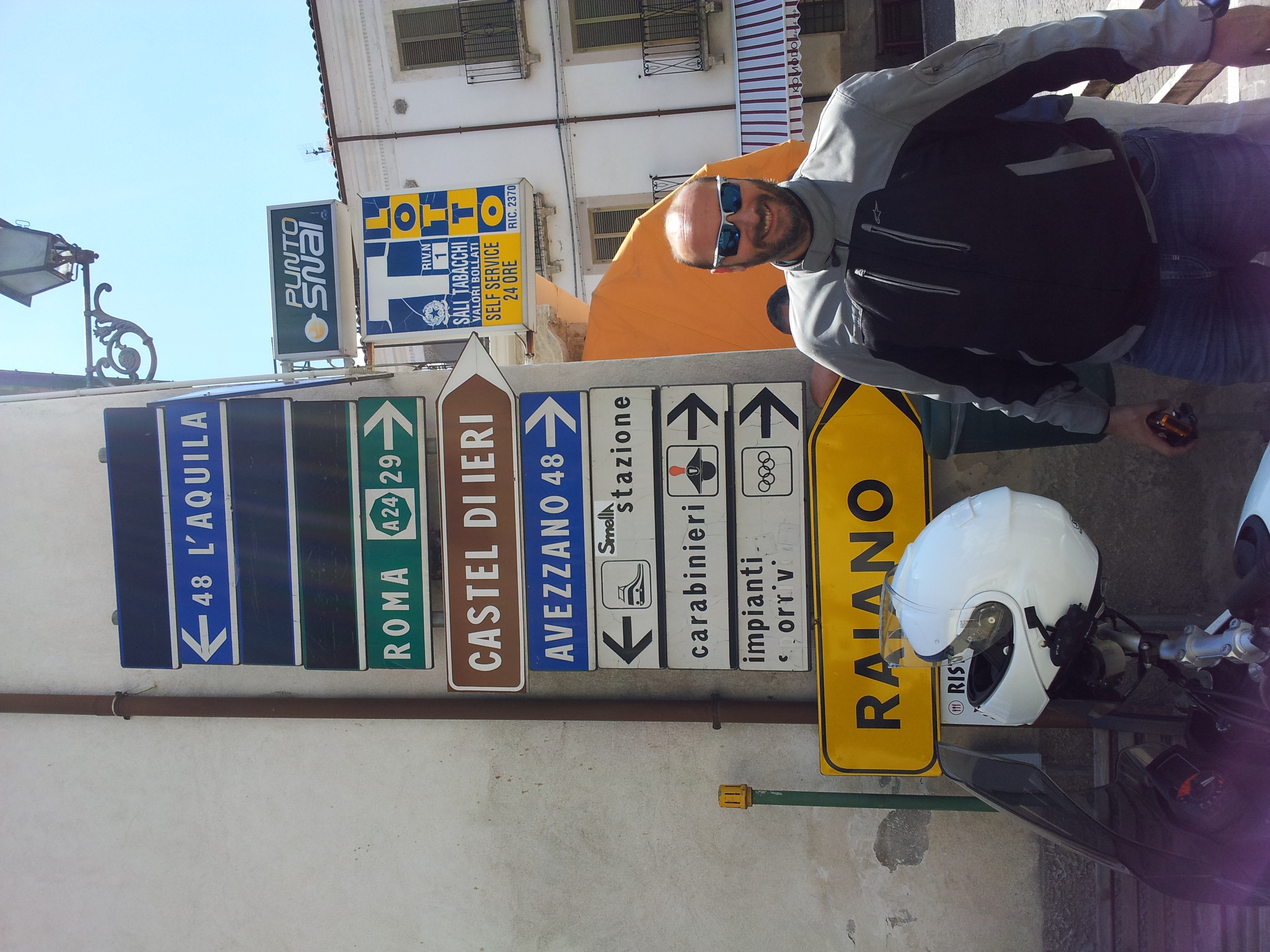 Tagliata la noiosissima tratta tra Tagliacozzo e Celano con un breve tratto di autostrada dall’uscita di Celano torniamo dopo tanto tempo ed in direzione nord sulla SS5 Tiburtina verso il valico di Forca Caruso: bellissima tratta, meritevole di un filmato. A Castelvecchio Subequo altra sosta tranquilla per un gustoso aperitivo: la nostra meta era Raiano attraverso le Gole di San Venanzio. Peccato che arrivati al bivio con l’Amiternina che risale a nord verso l’Aquila troviamo la strada sbarrata e dopo aver chiesto informazioni ad un locale appuriamo che è proprio impossibile passare: Alberto si è ricordato che oltre un anno fa, a maggio 2013, venendo da nord, trovammo la strada già chiusa: questa non sarà la prima interruzione per frana che troveremo oggi e la cosa assurda è che le strade vengono chiuse ma di cantieri di ripristino neanche l’ombra! Col senno di poi, magari osservando il cartello di fronte al quale è stata fatta questa foto avremmo anche potuto accorgercene visto che indica Raiano con tanto di cartello giallo da deviazione!